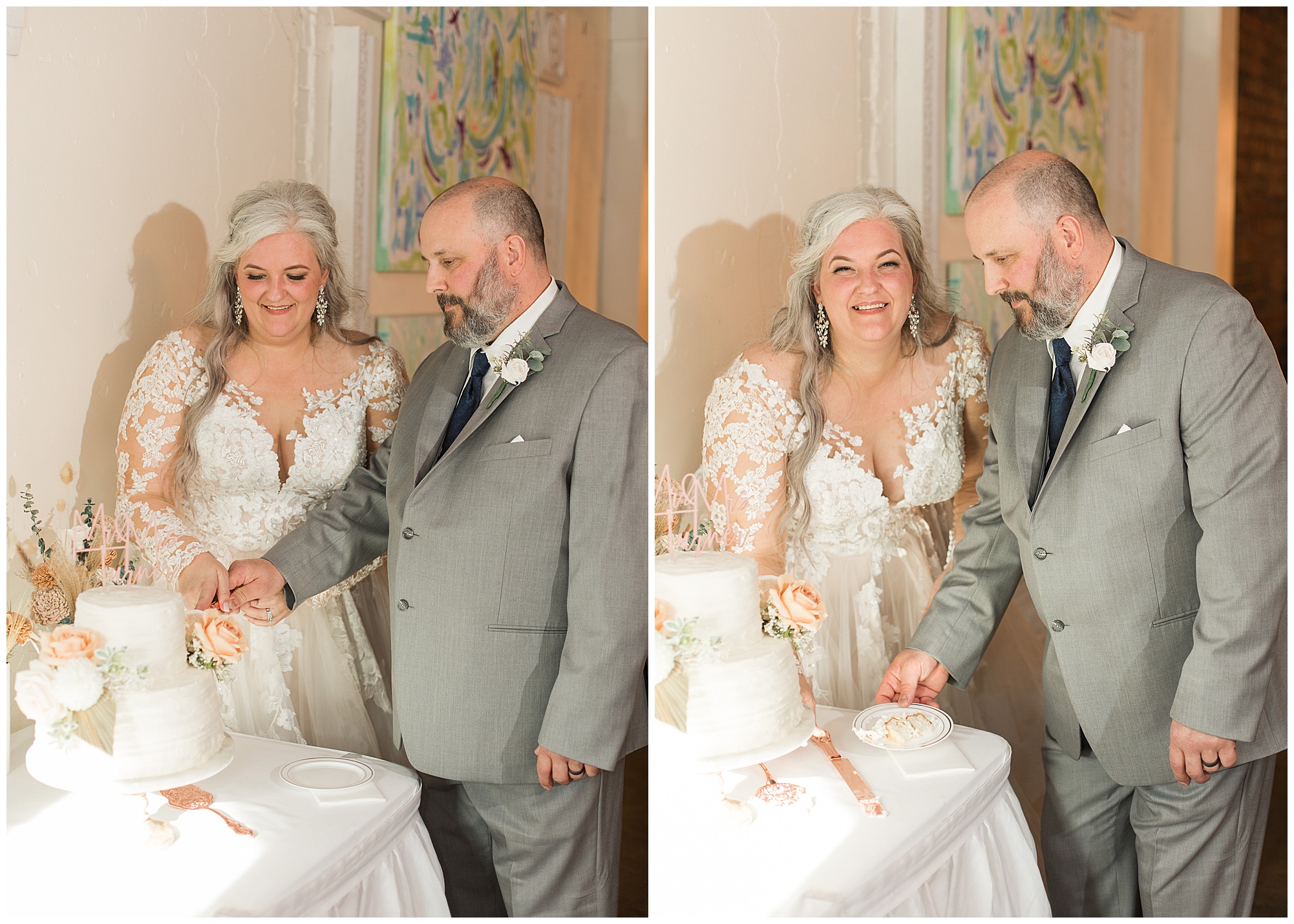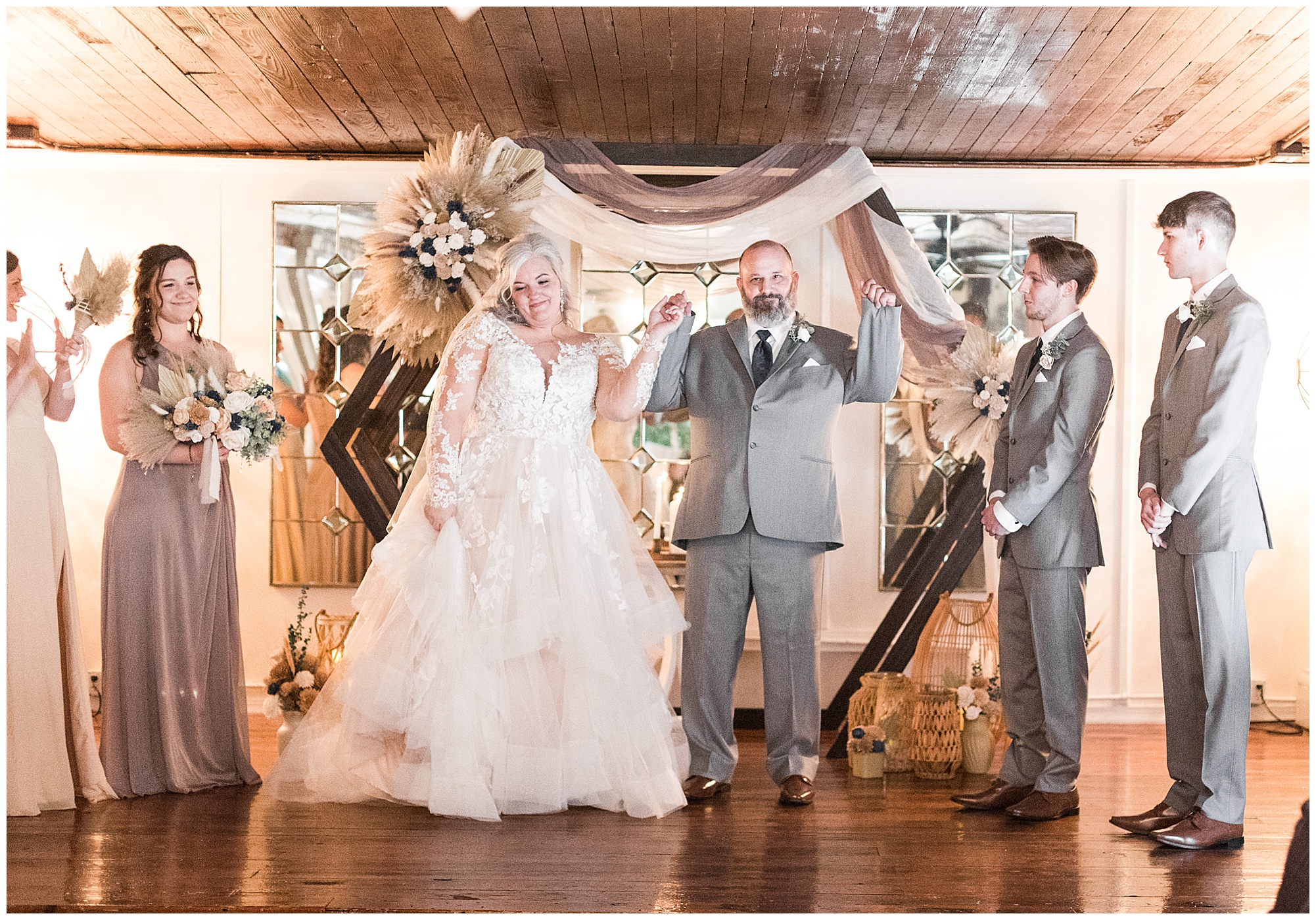 I figured out really quickly the morning of the wedding, Jessica and her girls were going to be a blast! As labor & delivery nurses you have to go with the flow and that’s exactly what these ladies did. And rounding out the bridesmaids was Merrill’s daughter, Emma, standing up with Jessica. Merrill got ready in the morning with both his son, Matthew, and Jessica’s son, Kaden, who stood up as his groomsmen. So sweet to have their children in their bridal party. Jessica also took it upon herself to hand make her own bouquet, her bridesmaids bouquets, and all of the ceremony and reception decor at the venue! Ummmm…WOW! She dyed the wooden flowers and added her own flair to her florals and it all looked incredible! When it came time for Jessica and Merrill to see one another at their first look, Merrill’s mouth dropped when he saw his soon-to-be wife and Jessica’s tears began flowing. They are seriously adorable together and I feel so thankful I could capture all of their lovely moments on their big day!