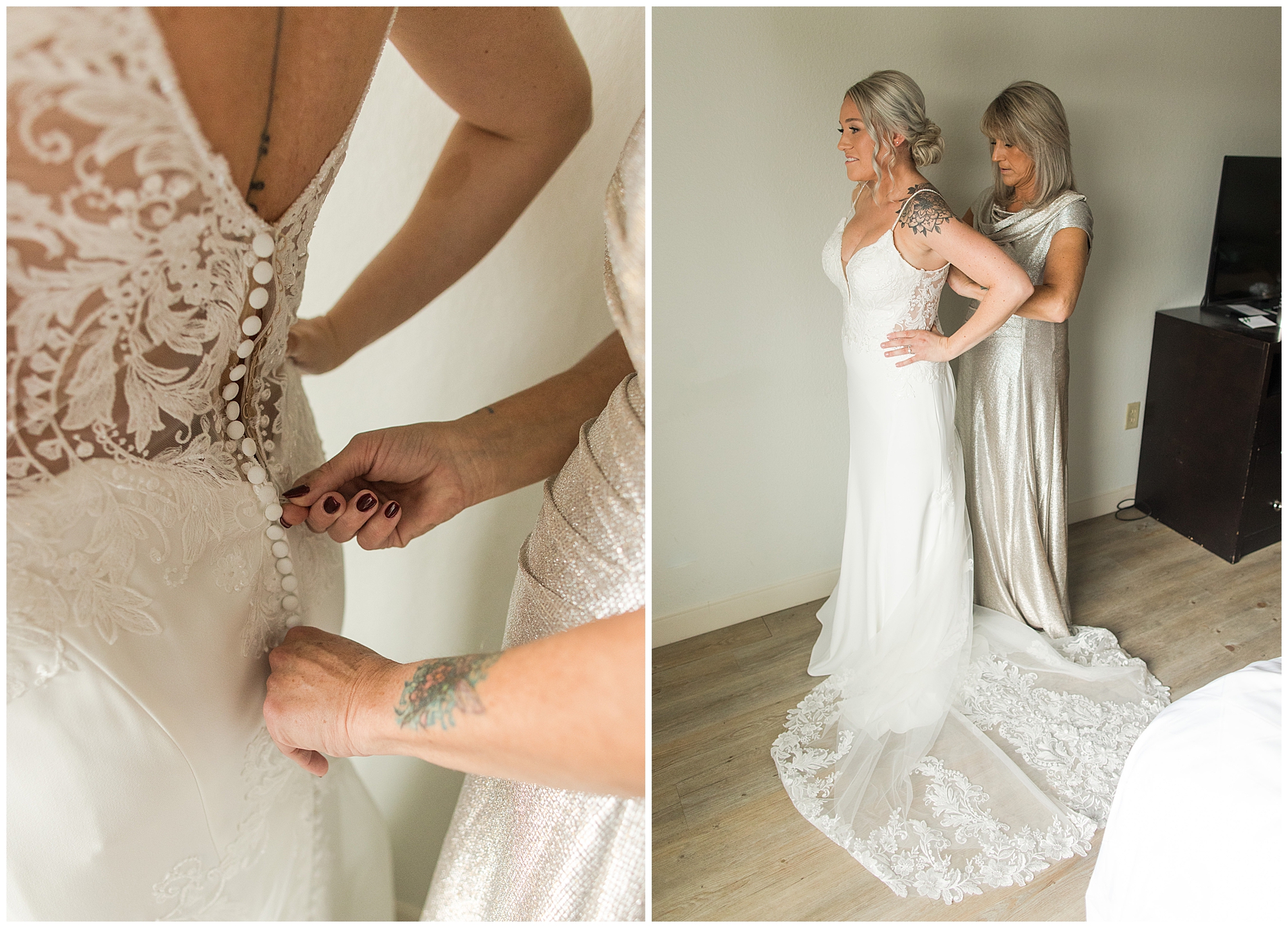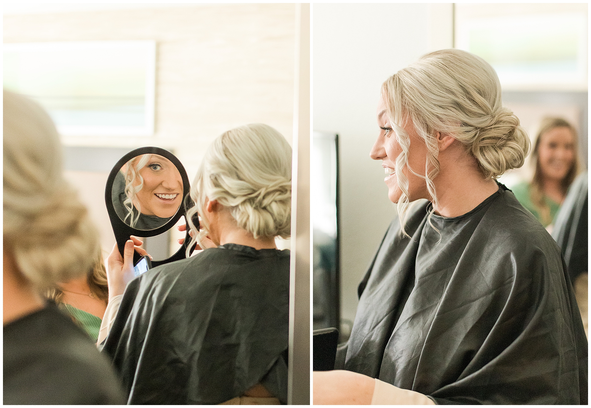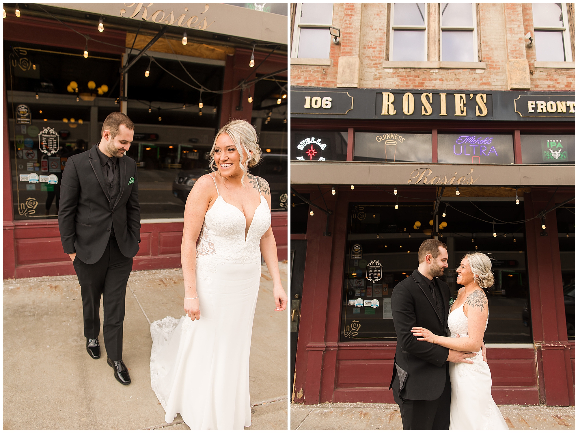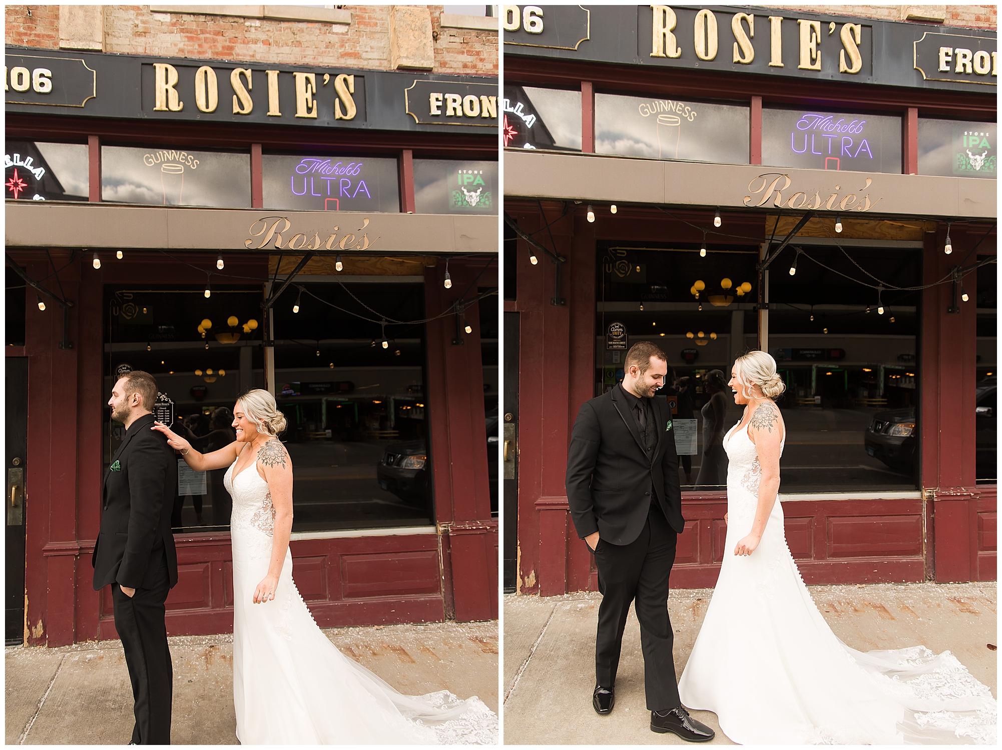 Bethany and her ladies were all getting ready when I arrived and spirits were relaxed and laid back. Bethany was the quintessential bride as soon as she stepped into her lace gown and she was surrounded by her mama, sisters, and friends. The bridesmaids were in classic black dresses in various styles, which is a trend I hope never goes away. Before all of the formalities of the day started, Bethany and Hayden planned to meet up where their love story all began, Rosie’s! This little bar was where these two had their first official date! Hayden was waiting inside when we arrived and we did a quick, yet sweet first look where he could see his bride to be. Hayden looked awesome in his all black attire and he couldn’t take his eyes off Bethany if he tried! It was such a lovely moment of their day!