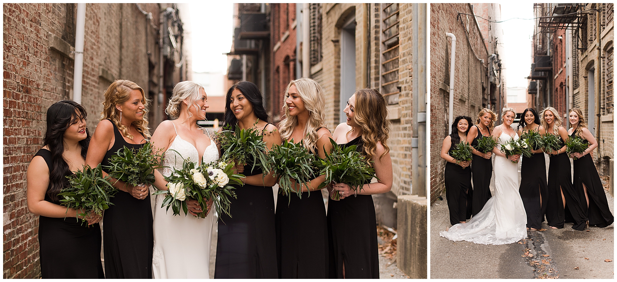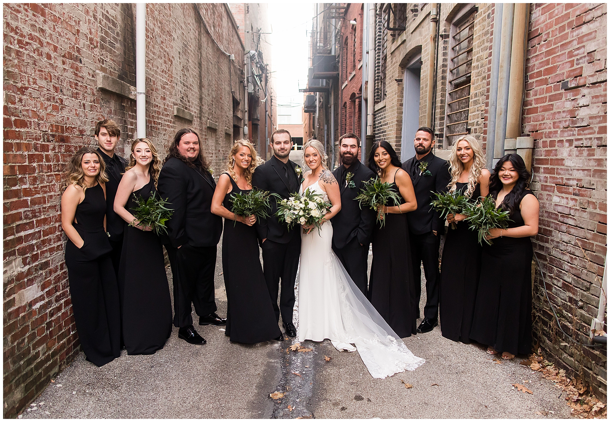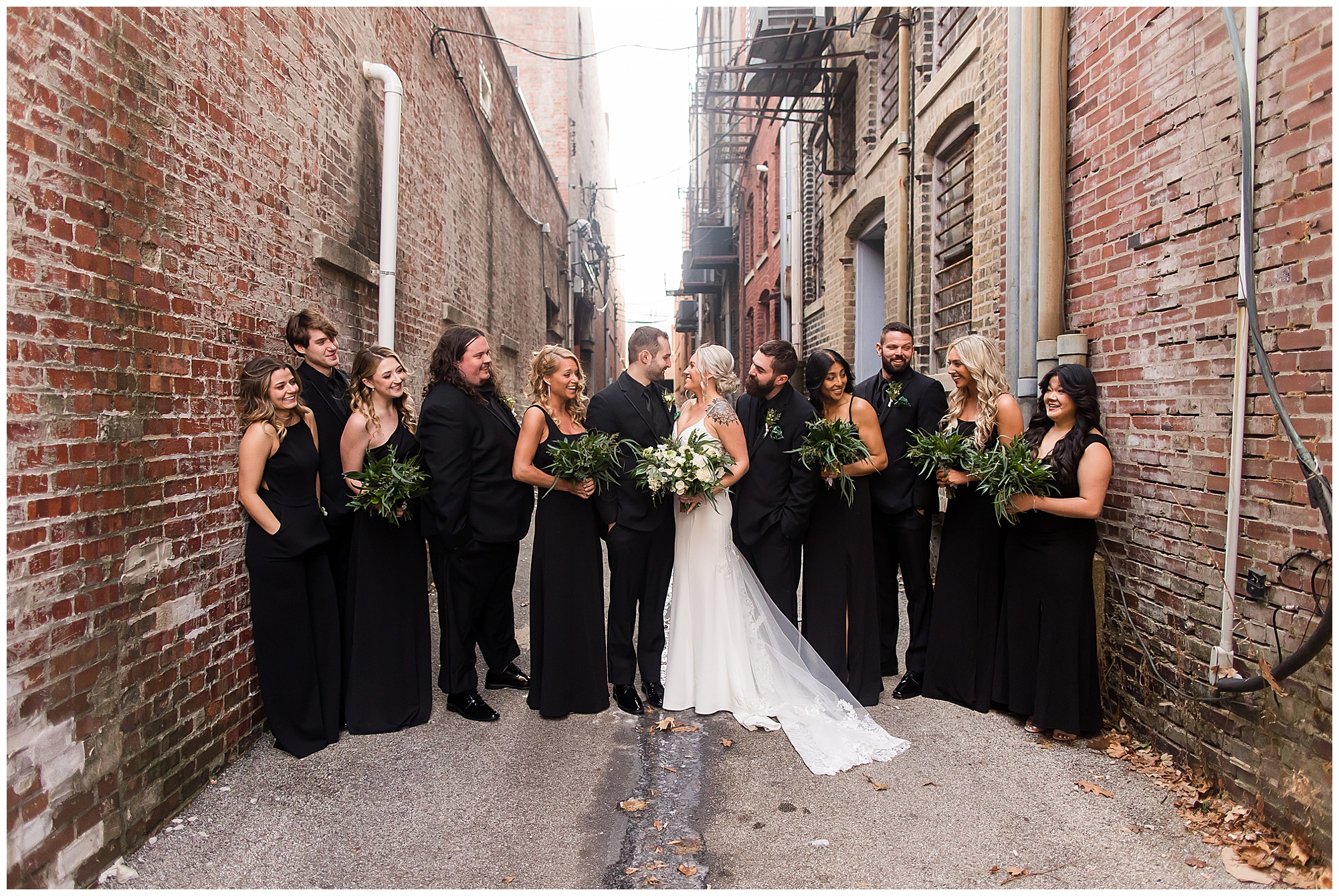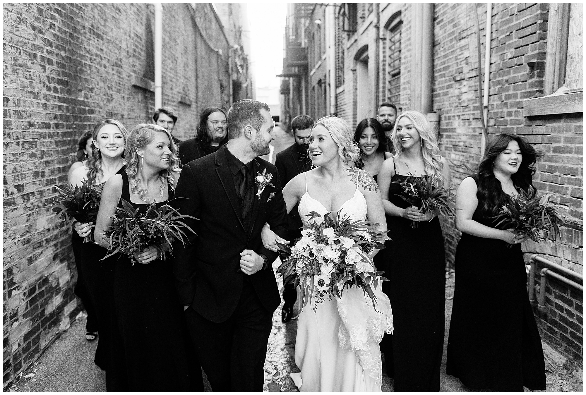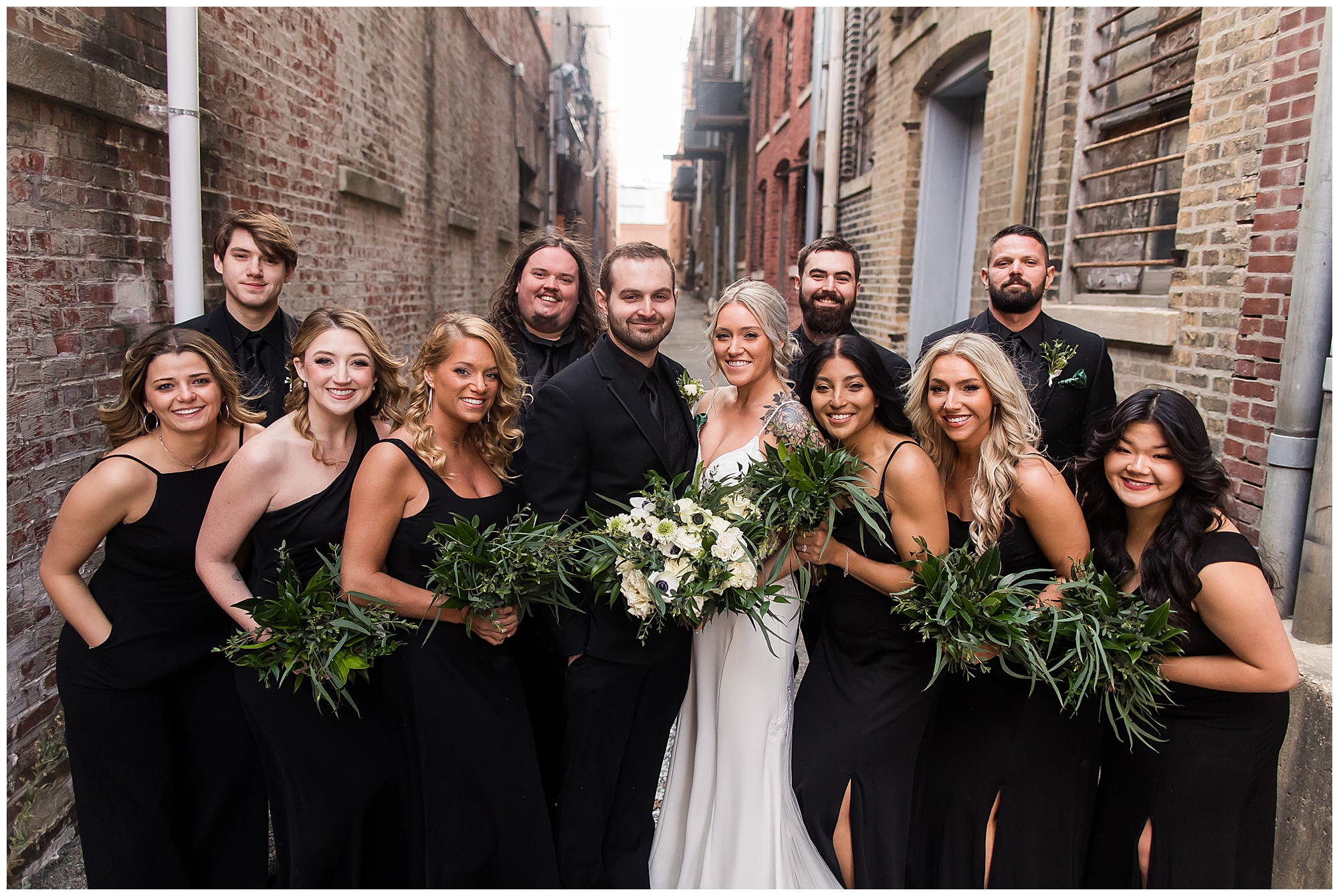 We all then headed to the amazing Reality On Monroe venue for bridal party and couple photos both inside and outside. This venue was perfect not only for the ceremony and reception space with it’s intimate industrial style, but it also gave us shelter from the cold. Because the winds were hitting this bridal party, who were incredible troopers throughout the day dealing with the cold temps, we found the alley right outside of the venue shielded us a bit. With the black theme of attire I would say it made for some pretty modern and amazing portraits! And when it was time for Bethany and Hayden’s photos these two stuck it out with me in the elements and kept warm by snuggling in close. How adorable are these two together?