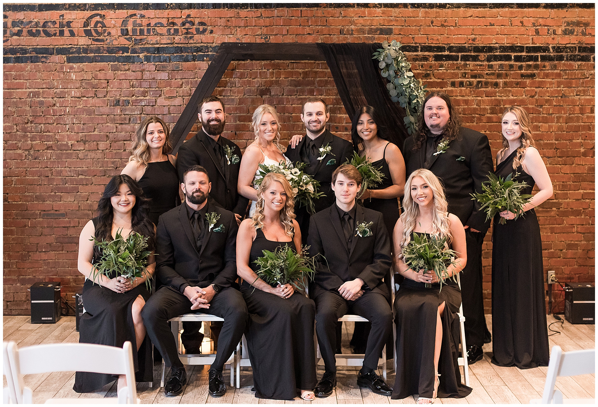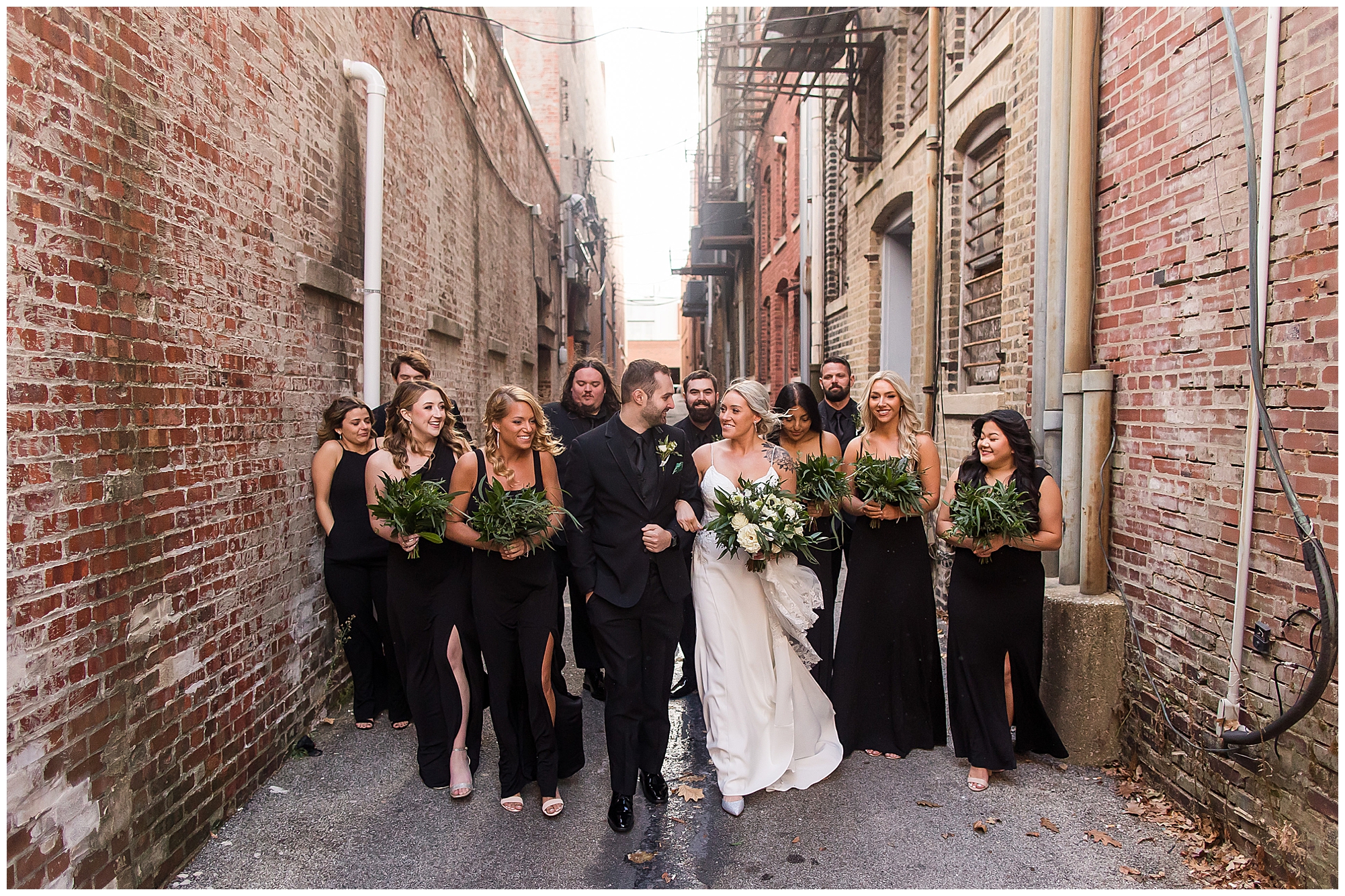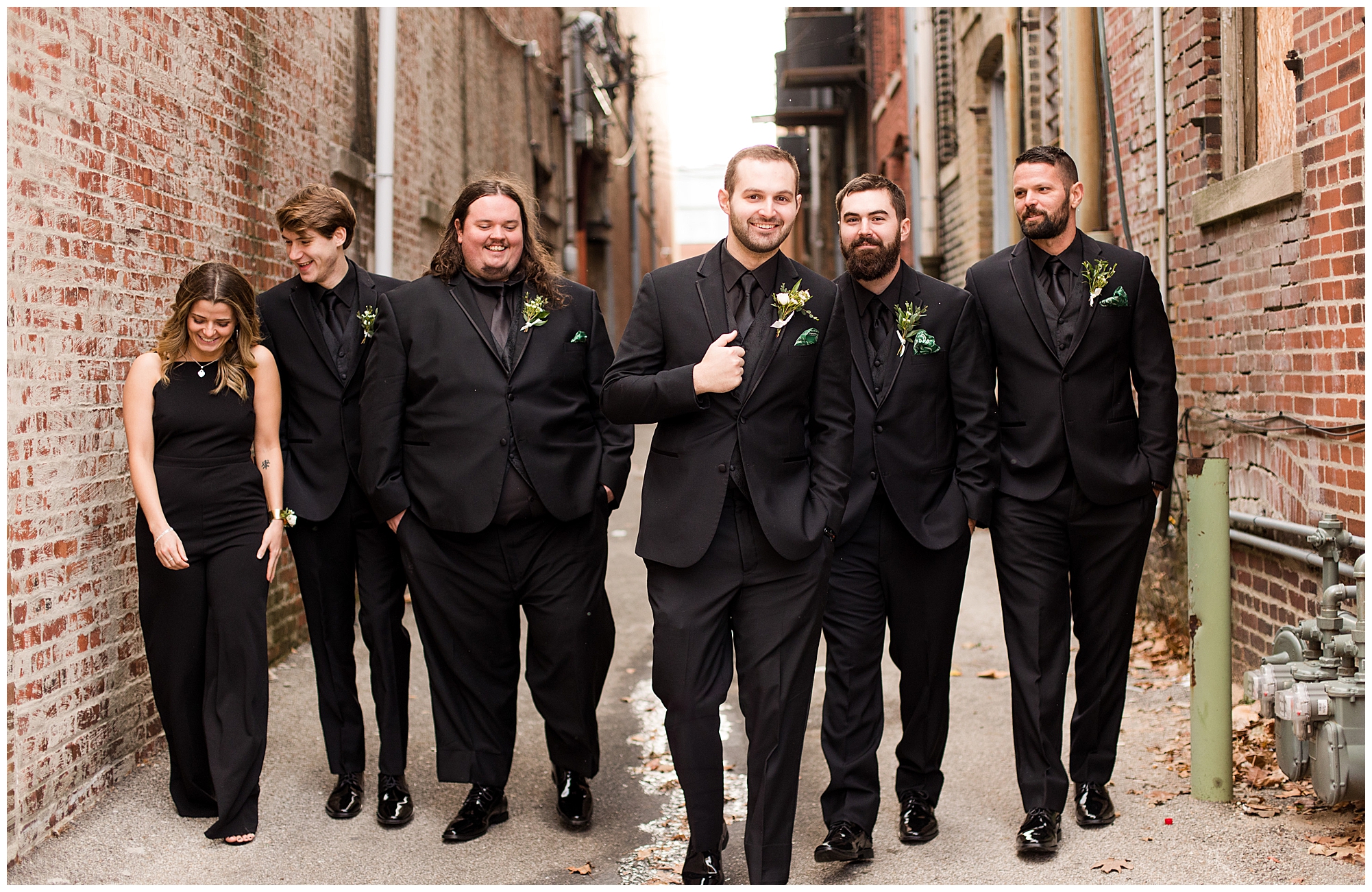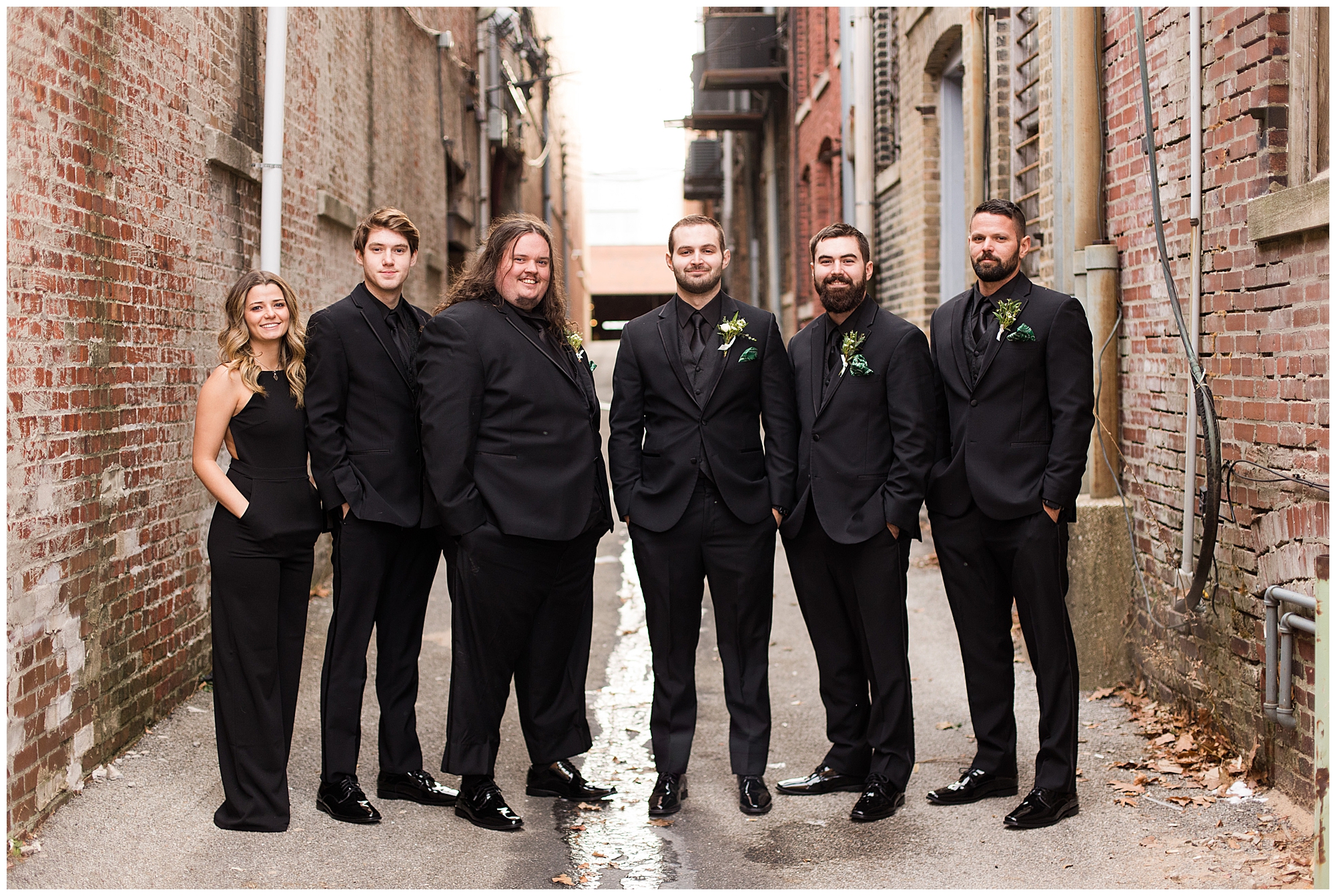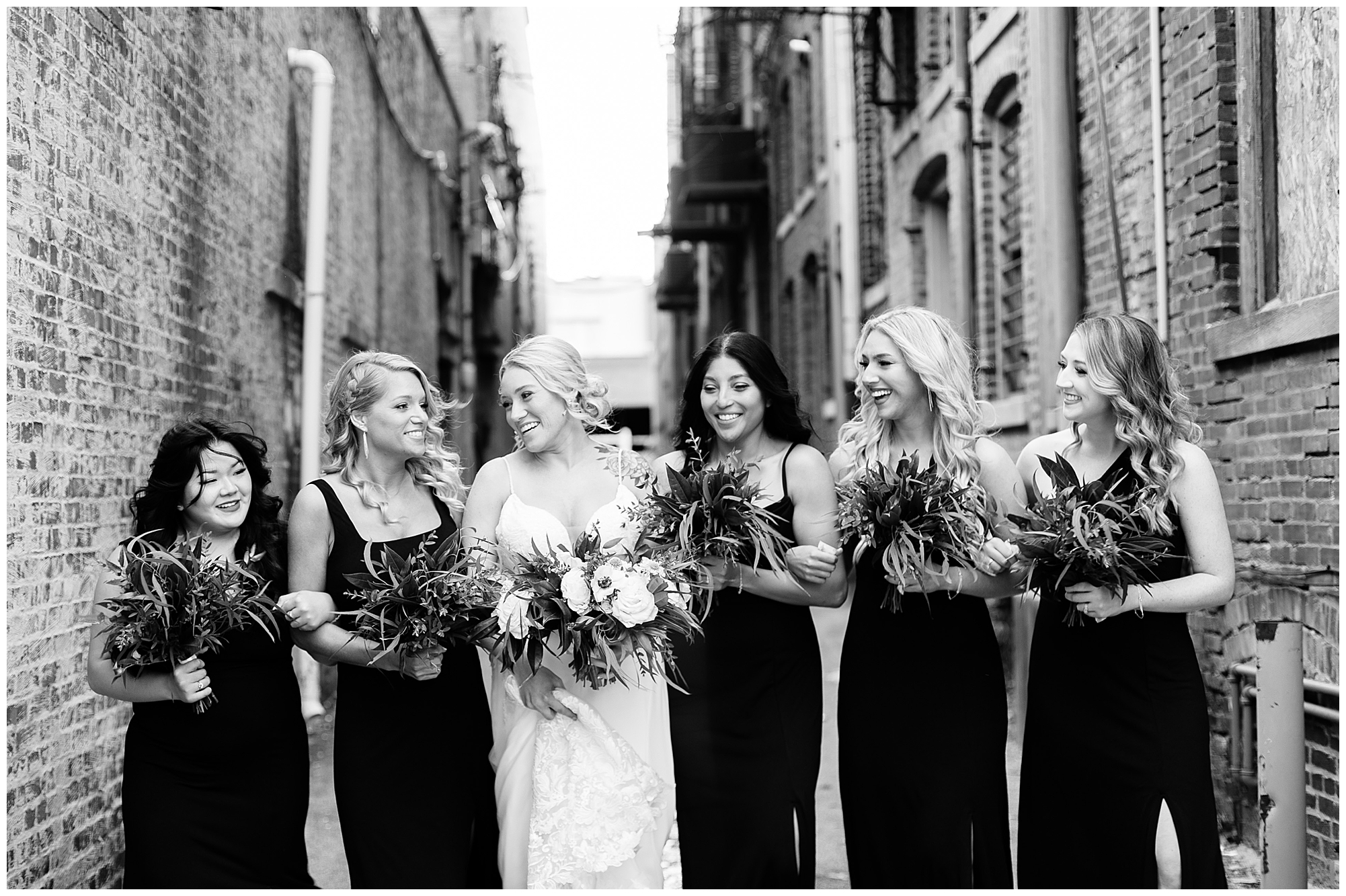 We all then headed to the amazing Reality On Monroe venue for bridal party and couple photos both inside and outside. This venue was perfect not only for the ceremony and reception space with it’s intimate industrial style, but it also gave us shelter from the cold. Because the winds were hitting this bridal party, who were incredible troopers throughout the day dealing with the cold temps, we found the alley right outside of the venue shielded us a bit. With the black theme of attire I would say it made for some pretty modern and amazing portraits! And when it was time for Bethany and Hayden’s photos these two stuck it out with me in the elements and kept warm by snuggling in close. How adorable are these two together?