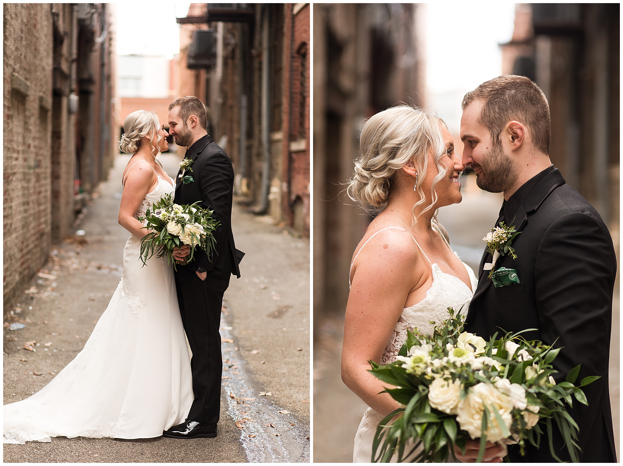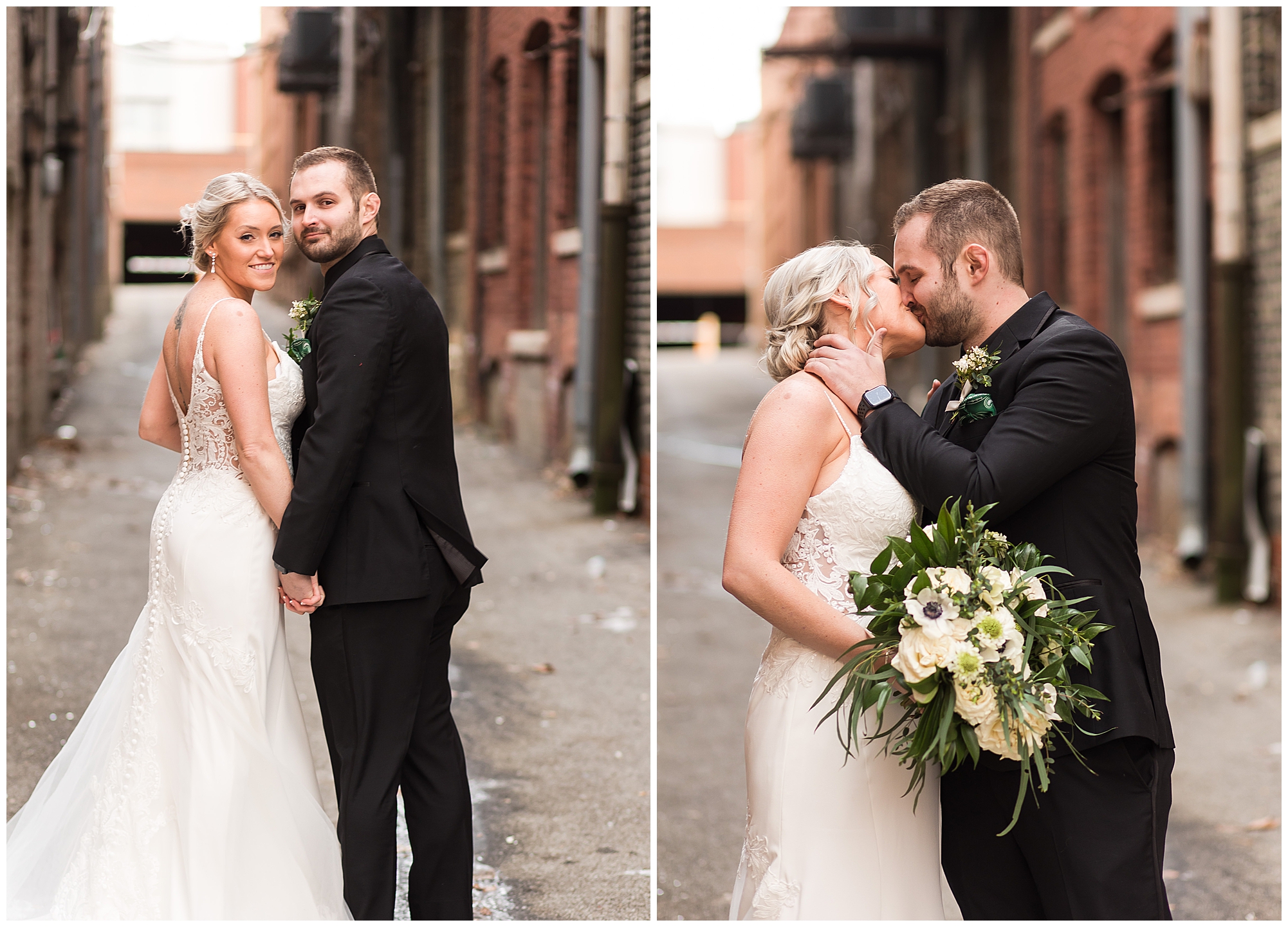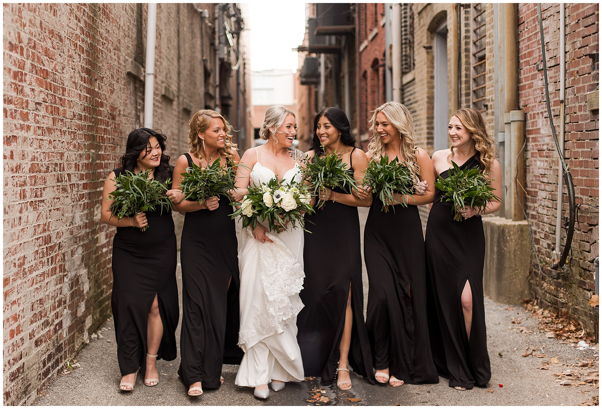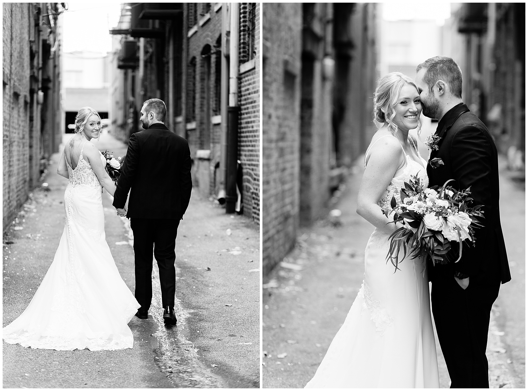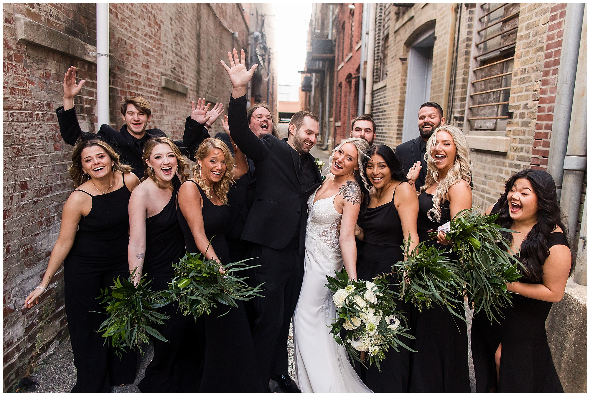 We all then headed to the amazing Reality On Monroe venue for bridal party and couple photos both inside and outside. This venue was perfect not only for the ceremony and reception space with it’s intimate industrial style, but it also gave us shelter from the cold. Because the winds were hitting this bridal party, who were incredible troopers throughout the day dealing with the cold temps, we found the alley right outside of the venue shielded us a bit. With the black theme of attire I would say it made for some pretty modern and amazing portraits! And when it was time for Bethany and Hayden’s photos these two stuck it out with me in the elements and kept warm by snuggling in close. How adorable are these two together?