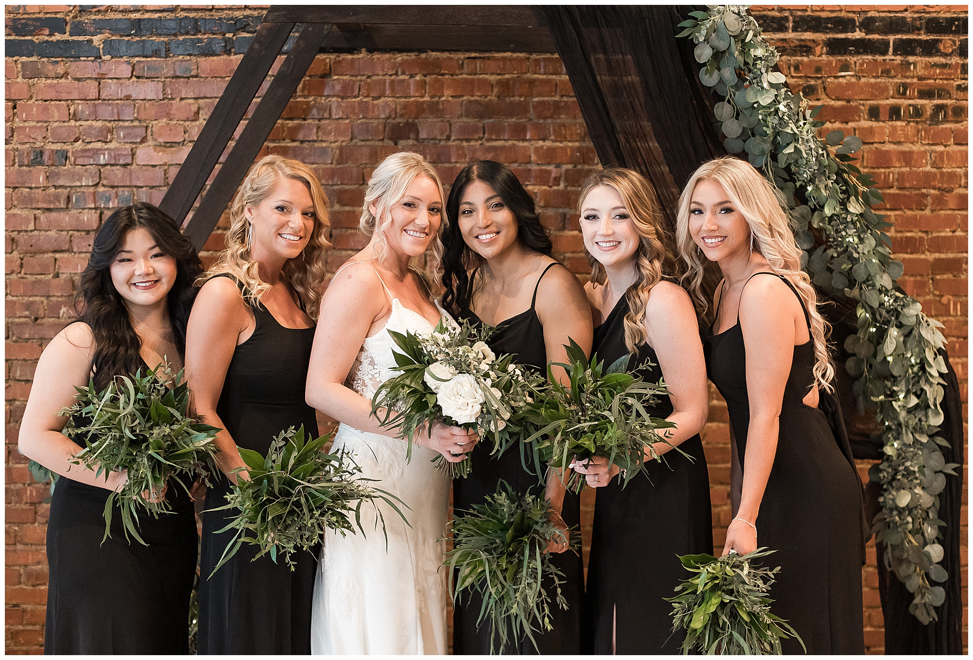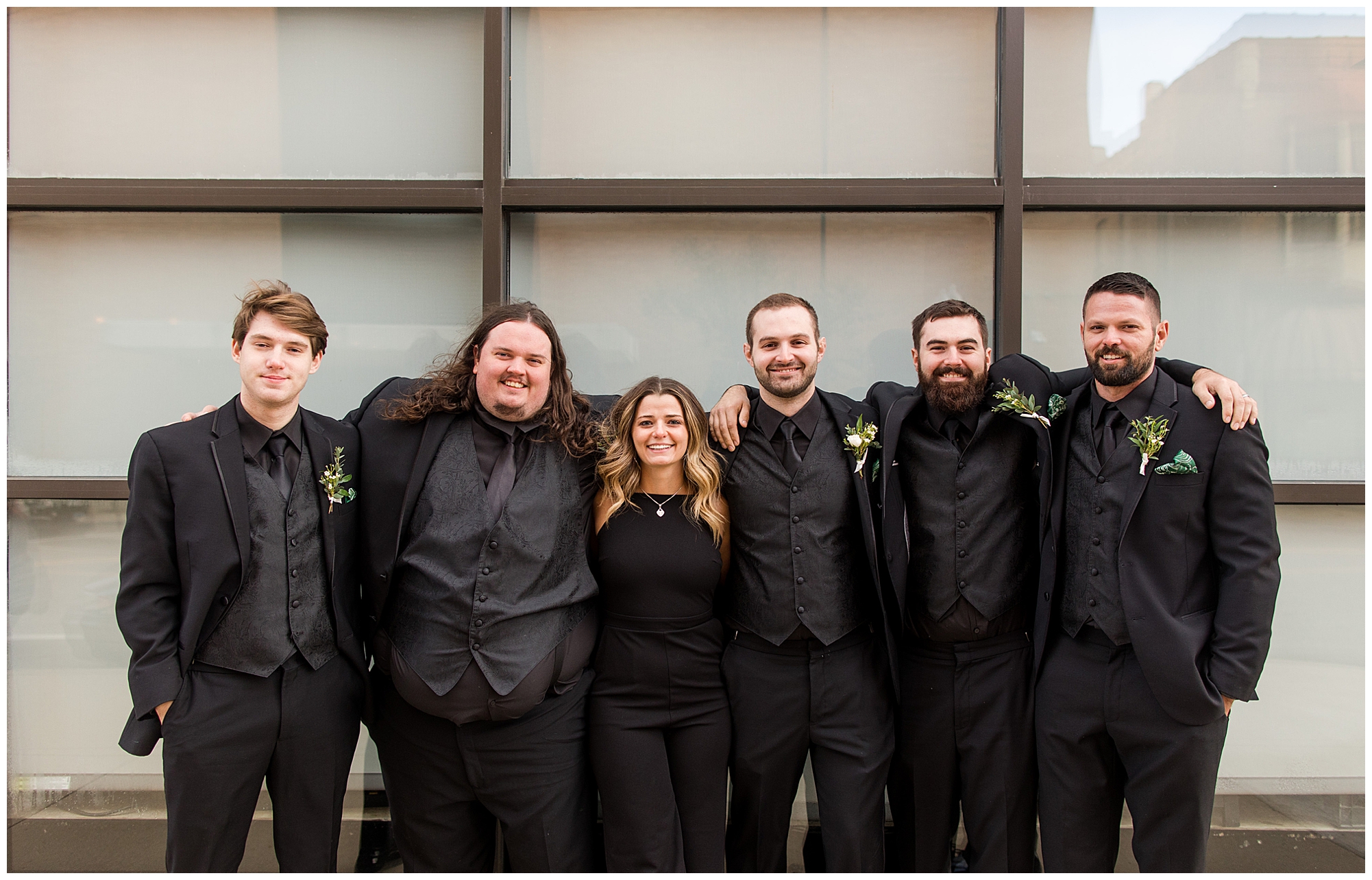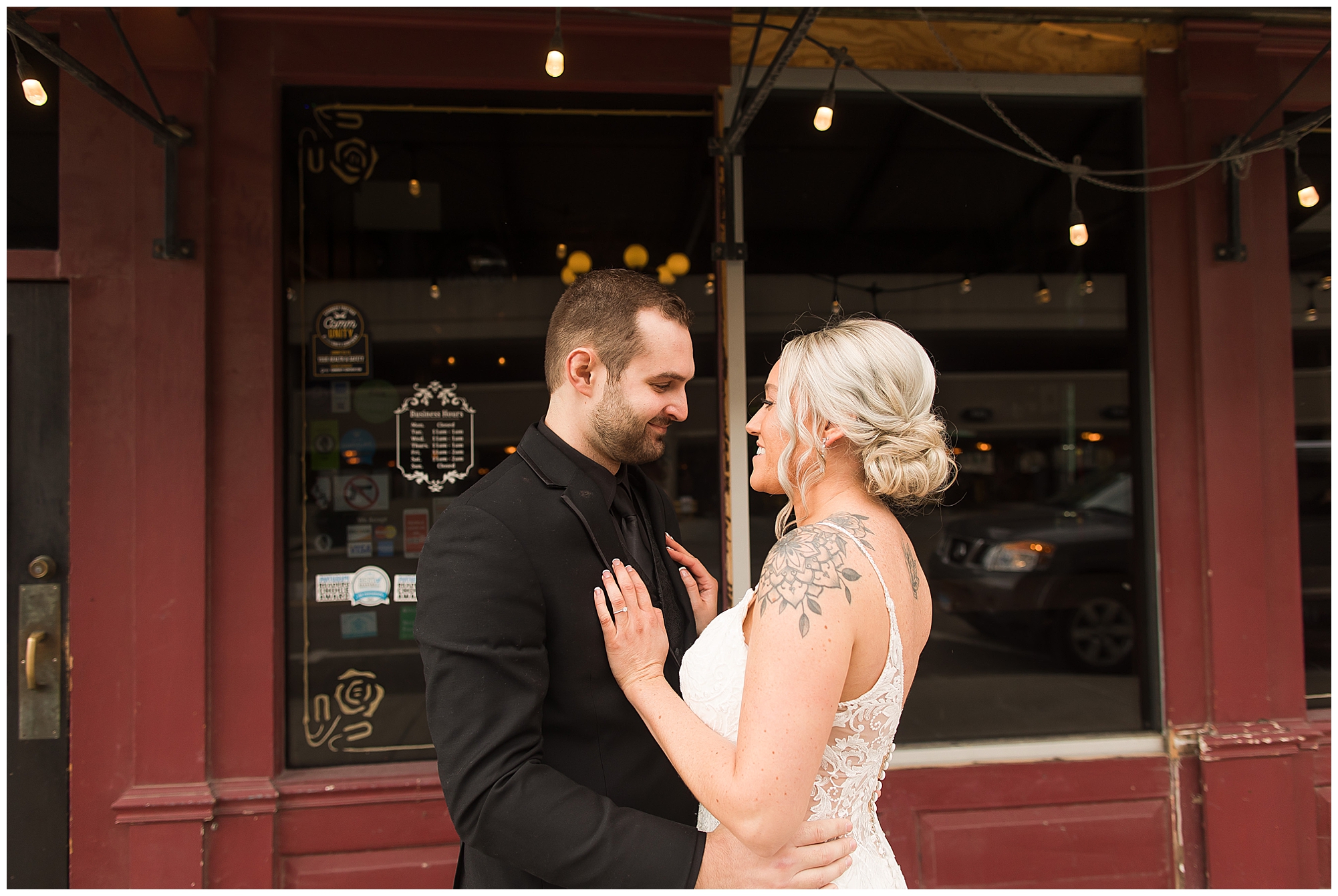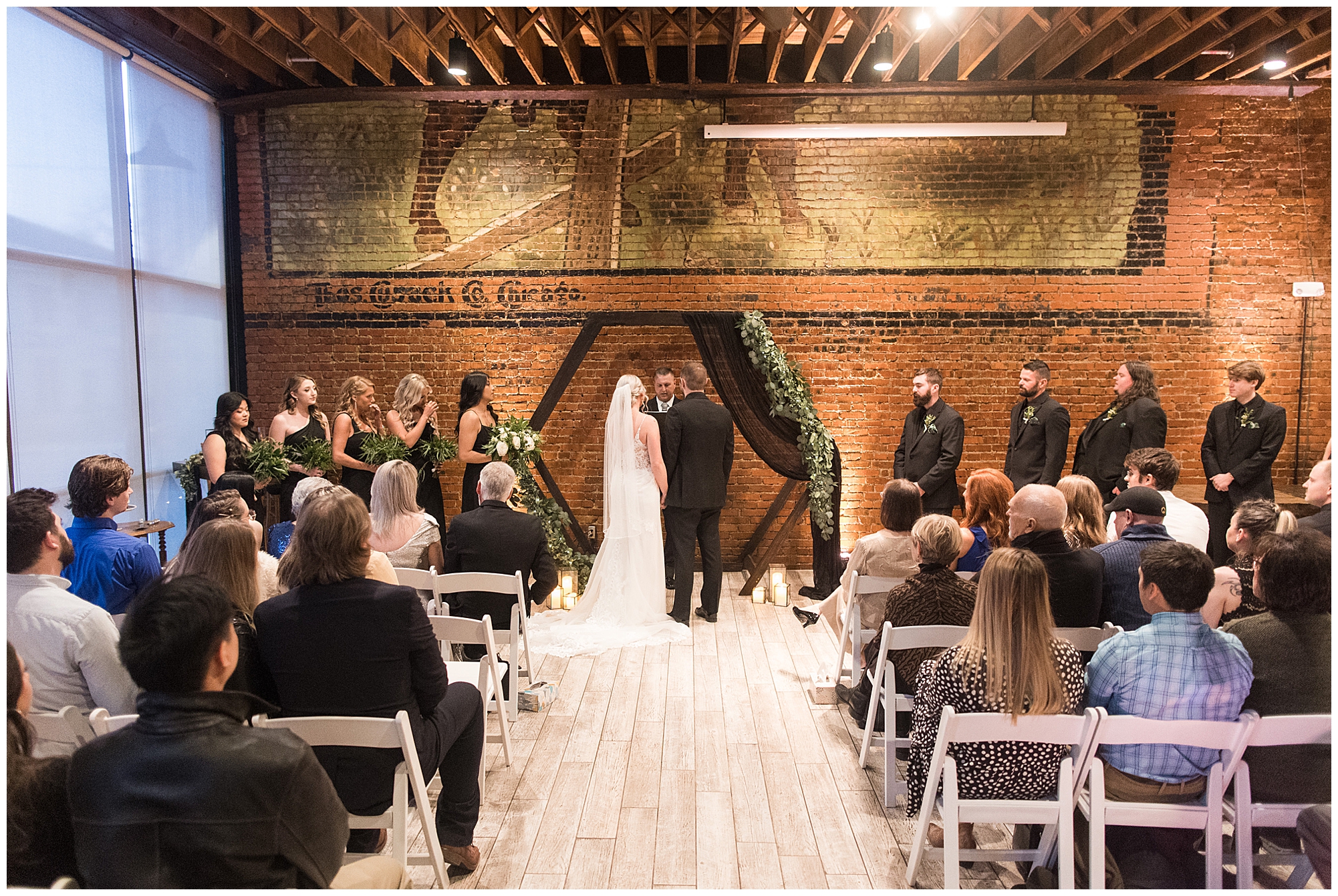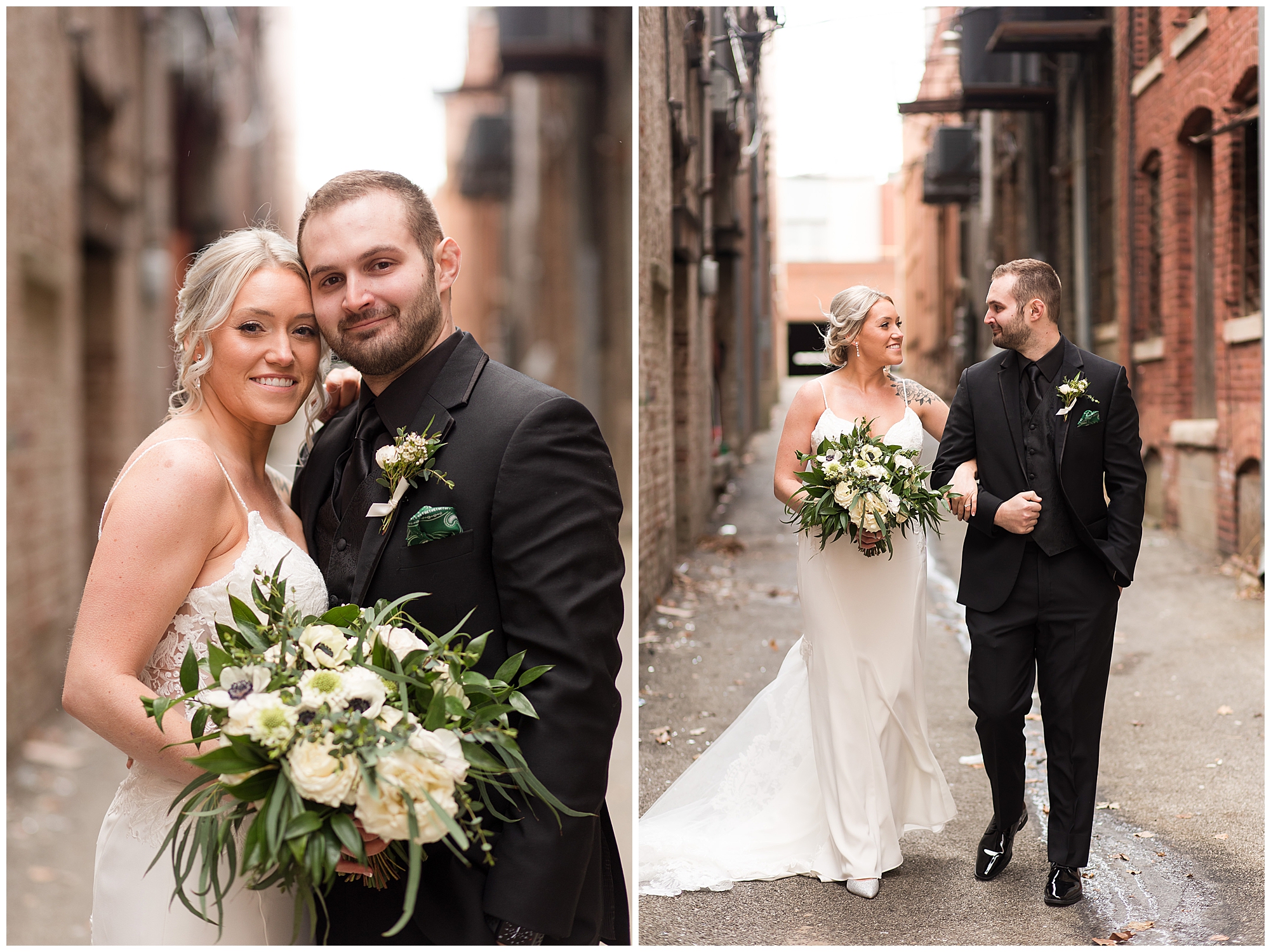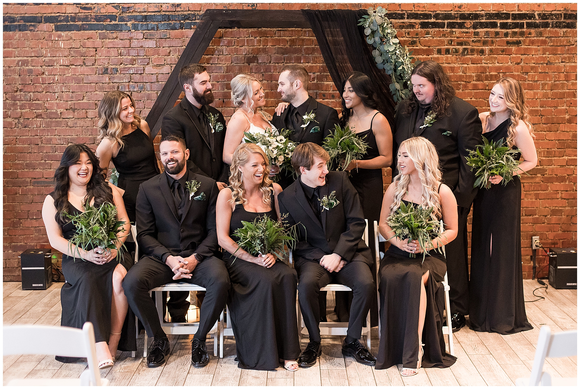 We all then headed to the amazing Reality On Monroe venue for bridal party and couple photos both inside and outside. This venue was perfect not only for the ceremony and reception space with it’s intimate industrial style, but it also gave us shelter from the cold. Because the winds were hitting this bridal party, who were incredible troopers throughout the day dealing with the cold temps, we found the alley right outside of the venue shielded us a bit. With the black theme of attire I would say it made for some pretty modern and amazing portraits! And when it was time for Bethany and Hayden’s photos these two stuck it out with me in the elements and kept warm by snuggling in close. How adorable are these two together?