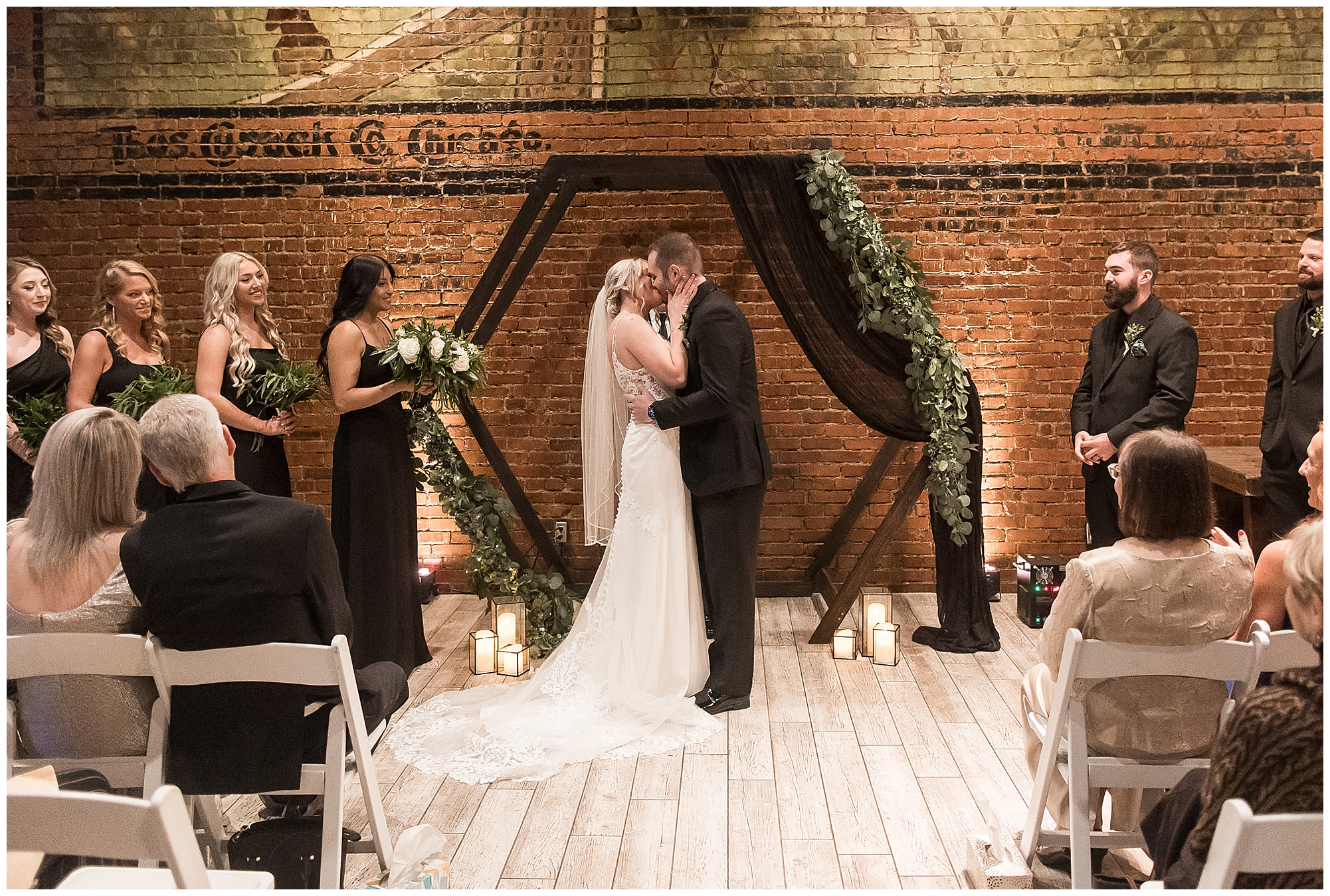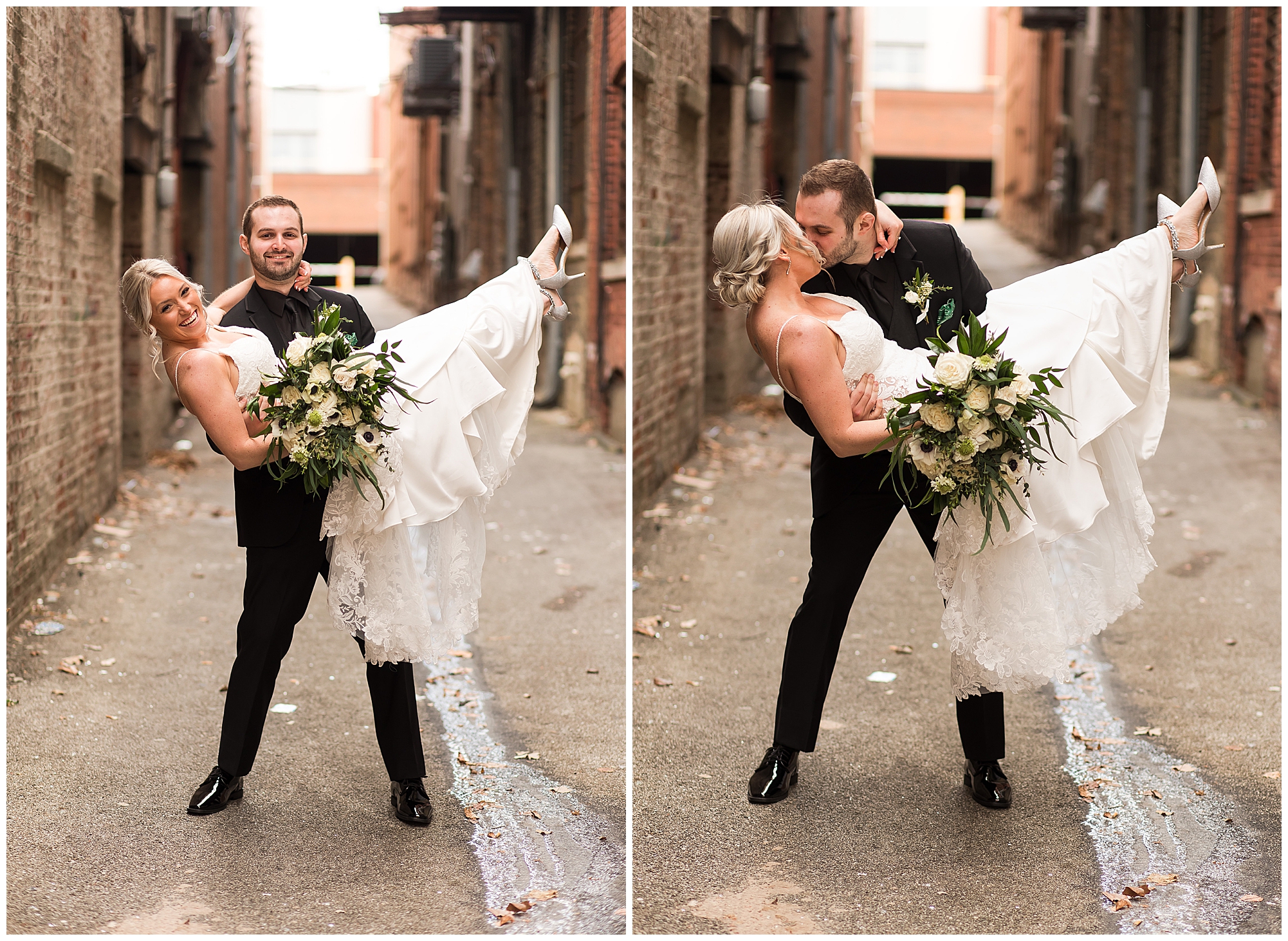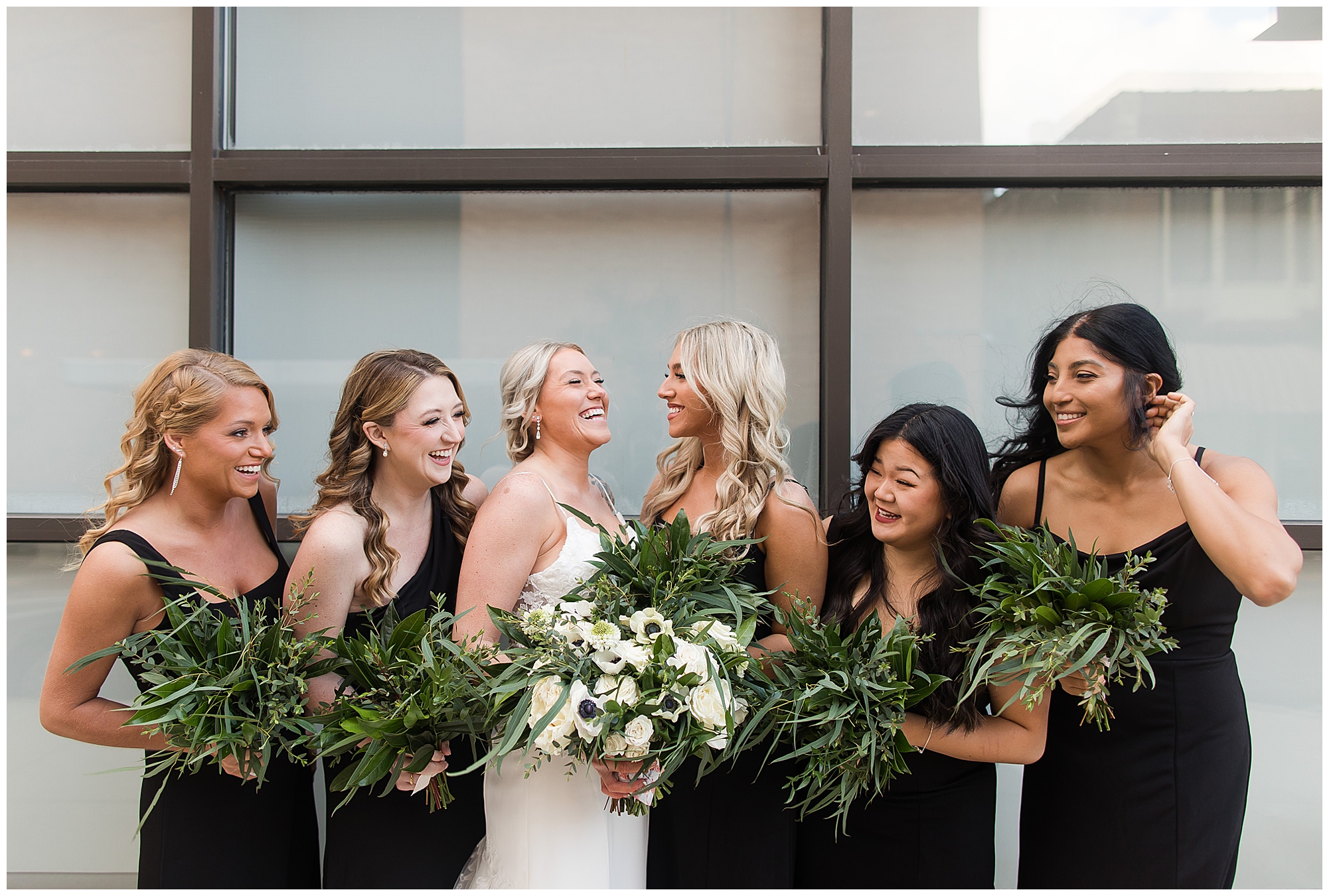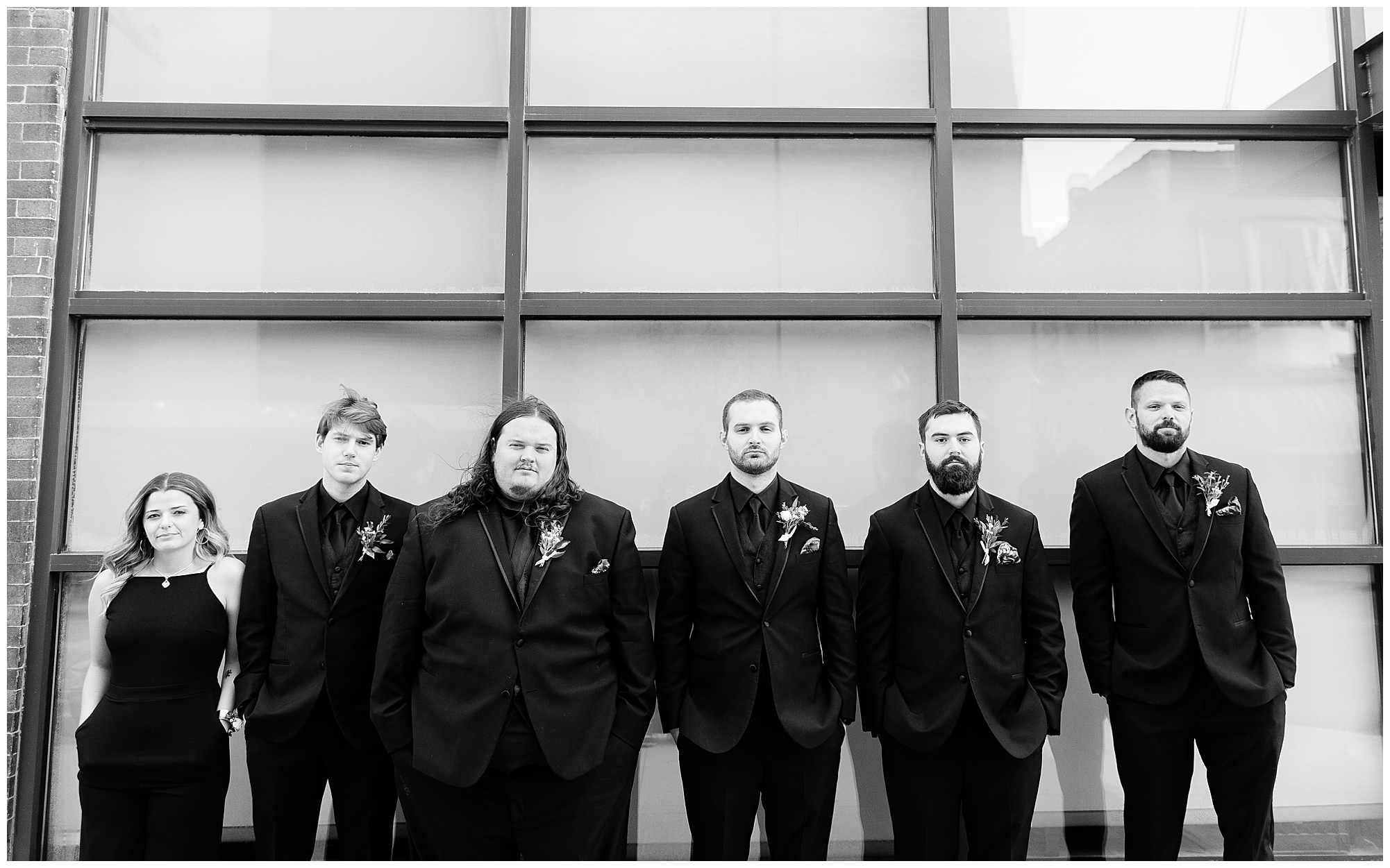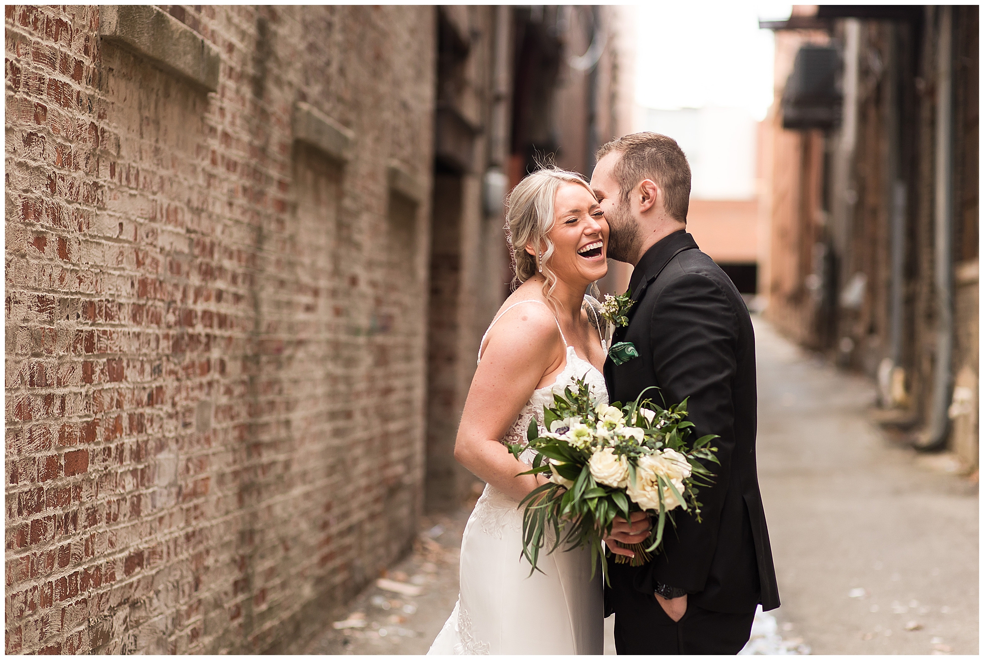 We all then headed to the amazing Reality On Monroe venue for bridal party and couple photos both inside and outside. This venue was perfect not only for the ceremony and reception space with it’s intimate industrial style, but it also gave us shelter from the cold. Because the winds were hitting this bridal party, who were incredible troopers throughout the day dealing with the cold temps, we found the alley right outside of the venue shielded us a bit. With the black theme of attire I would say it made for some pretty modern and amazing portraits! And when it was time for Bethany and Hayden’s photos these two stuck it out with me in the elements and kept warm by snuggling in close. How adorable are these two together?