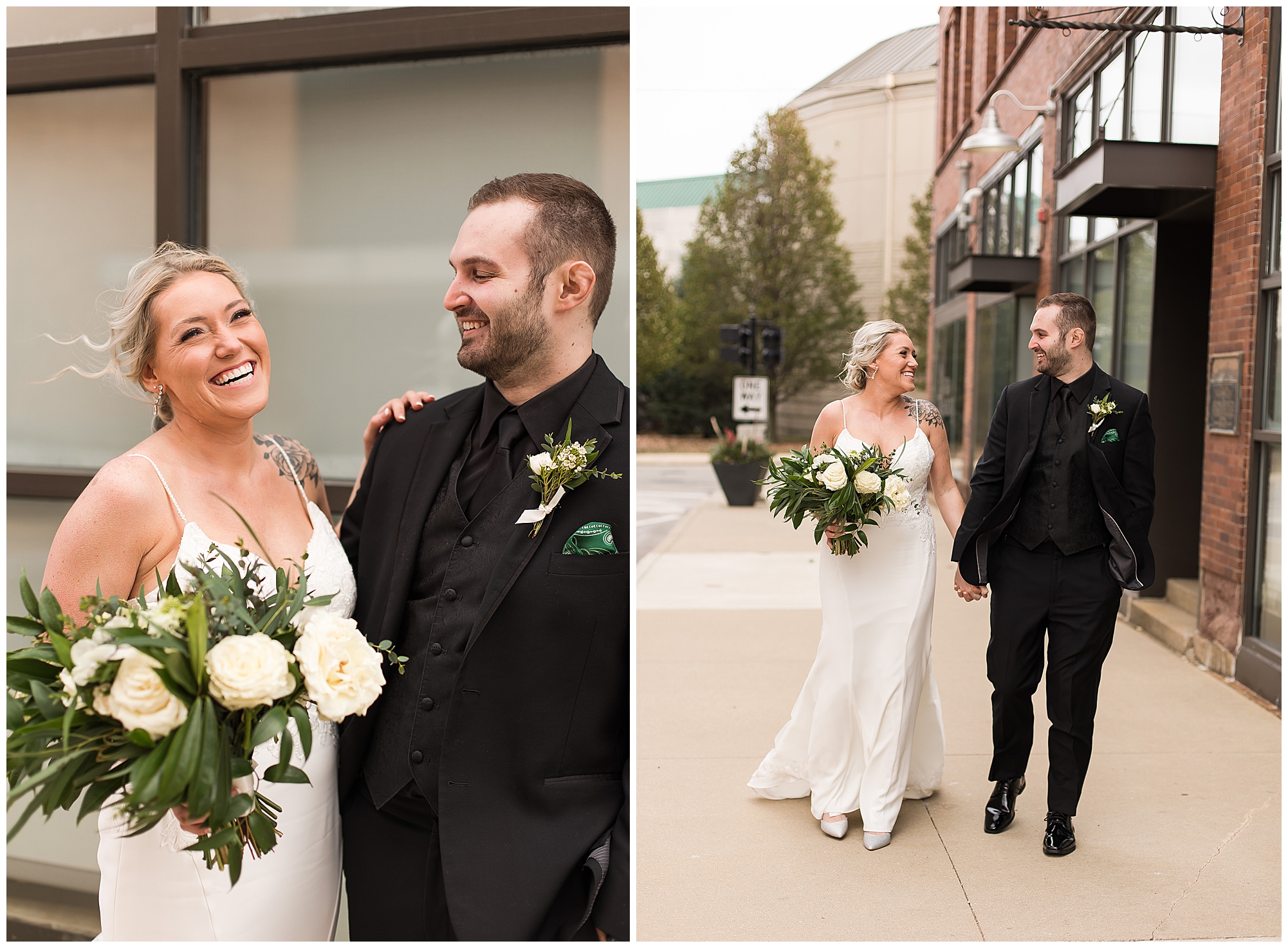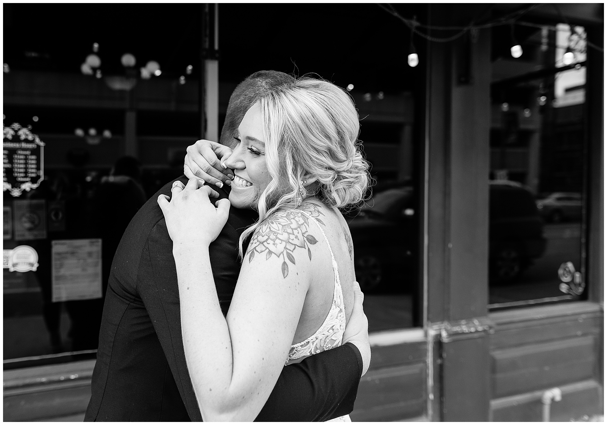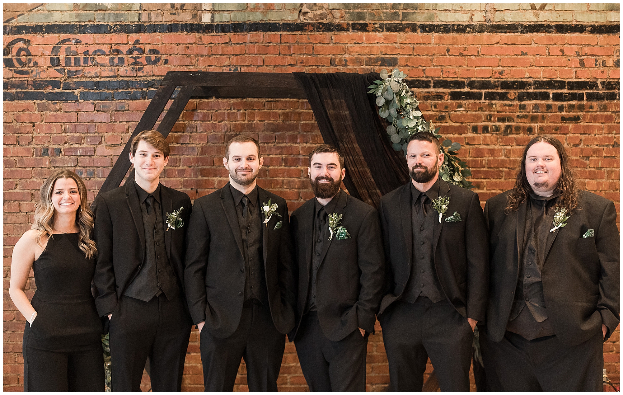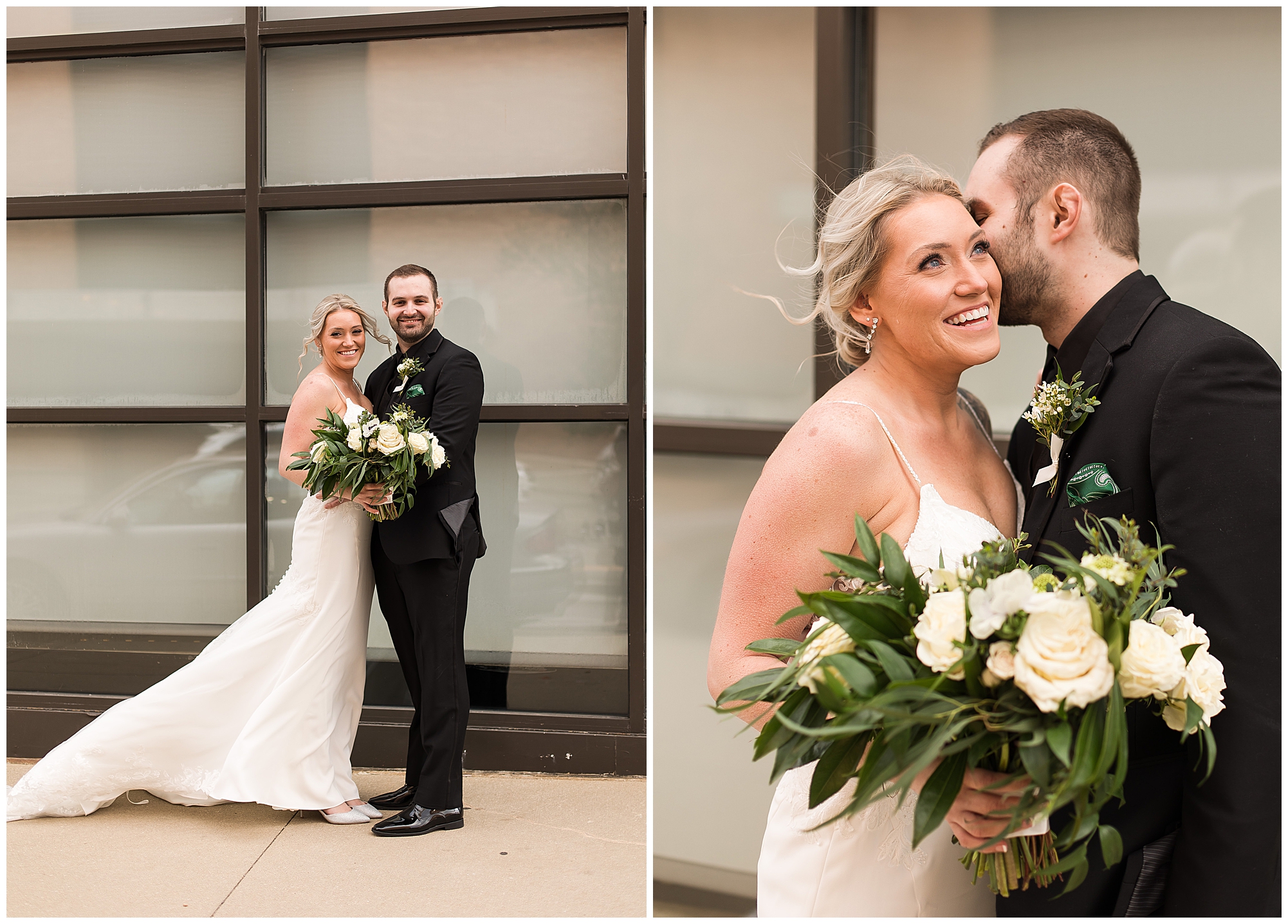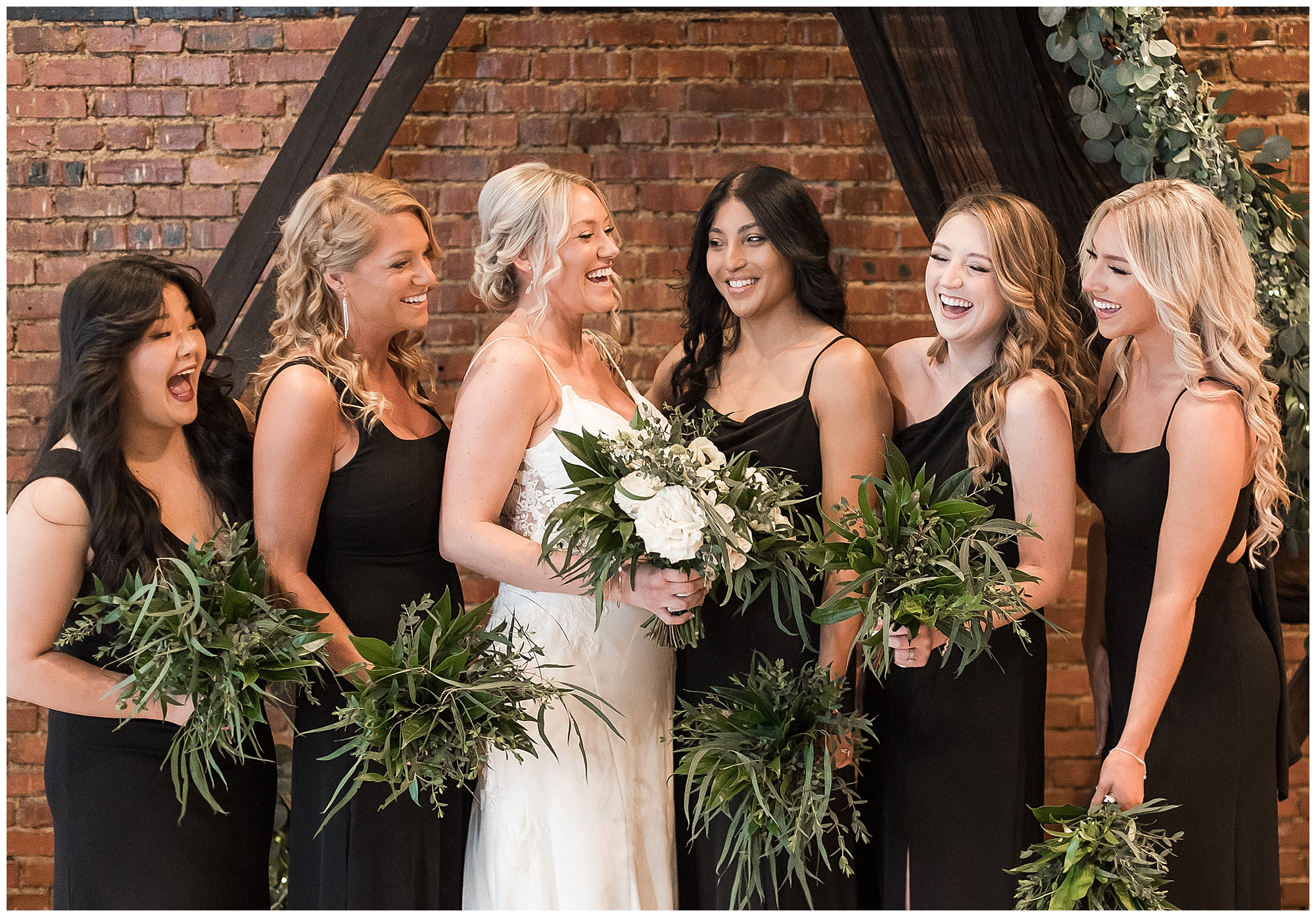 We all then headed to the amazing Reality On Monroe venue for bridal party and couple photos both inside and outside. This venue was perfect not only for the ceremony and reception space with it’s intimate industrial style, but it also gave us shelter from the cold. Because the winds were hitting this bridal party, who were incredible troopers throughout the day dealing with the cold temps, we found the alley right outside of the venue shielded us a bit. With the black theme of attire I would say it made for some pretty modern and amazing portraits! And when it was time for Bethany and Hayden’s photos these two stuck it out with me in the elements and kept warm by snuggling in close. How adorable are these two together?