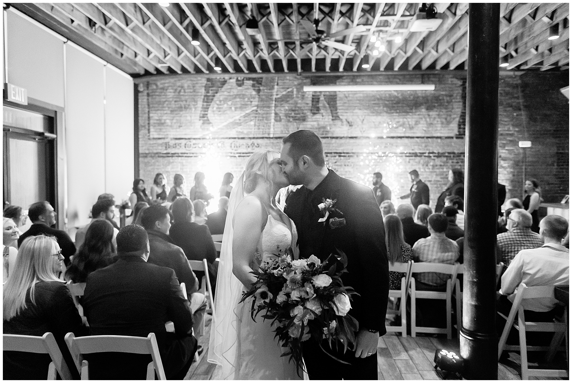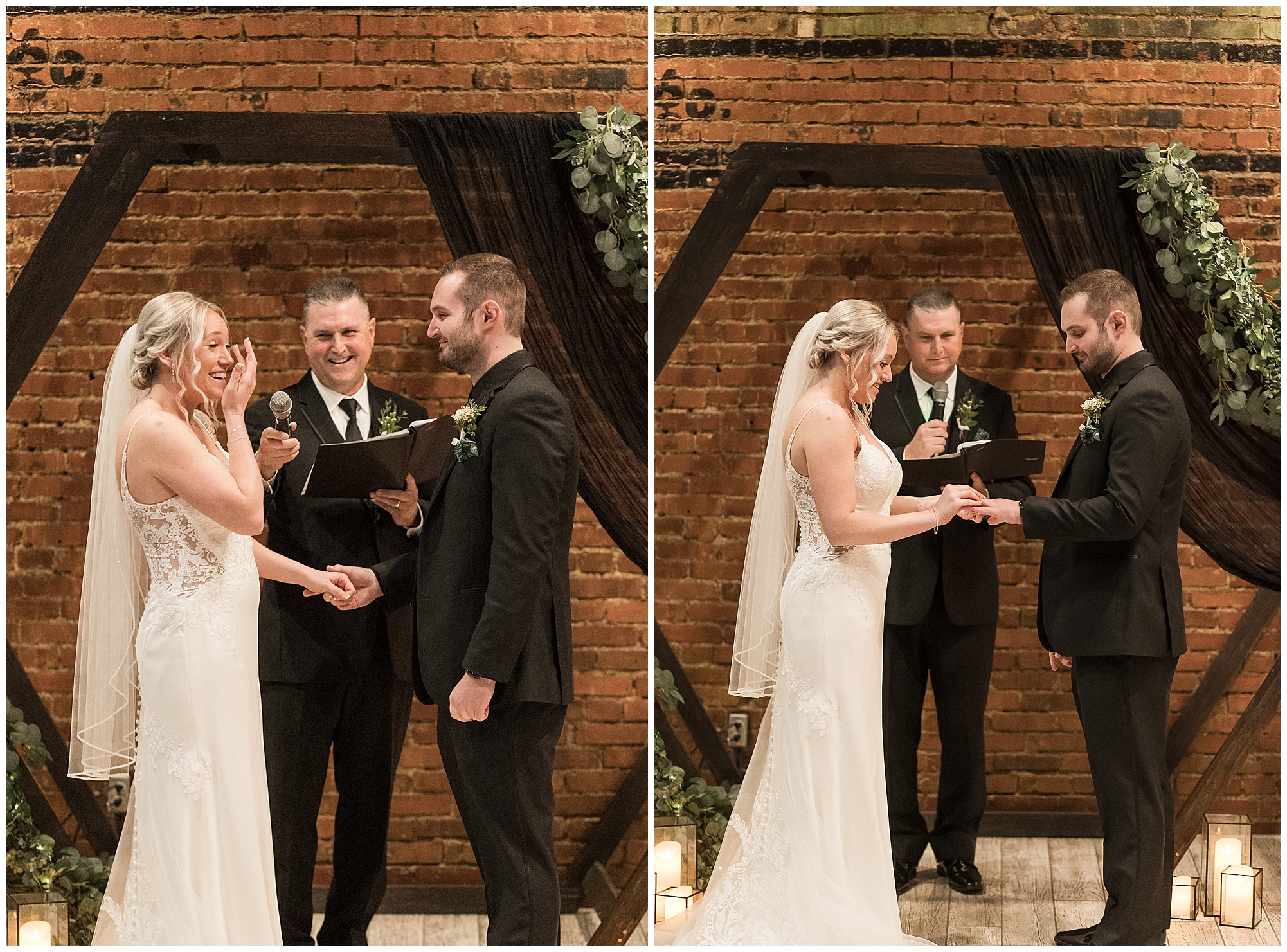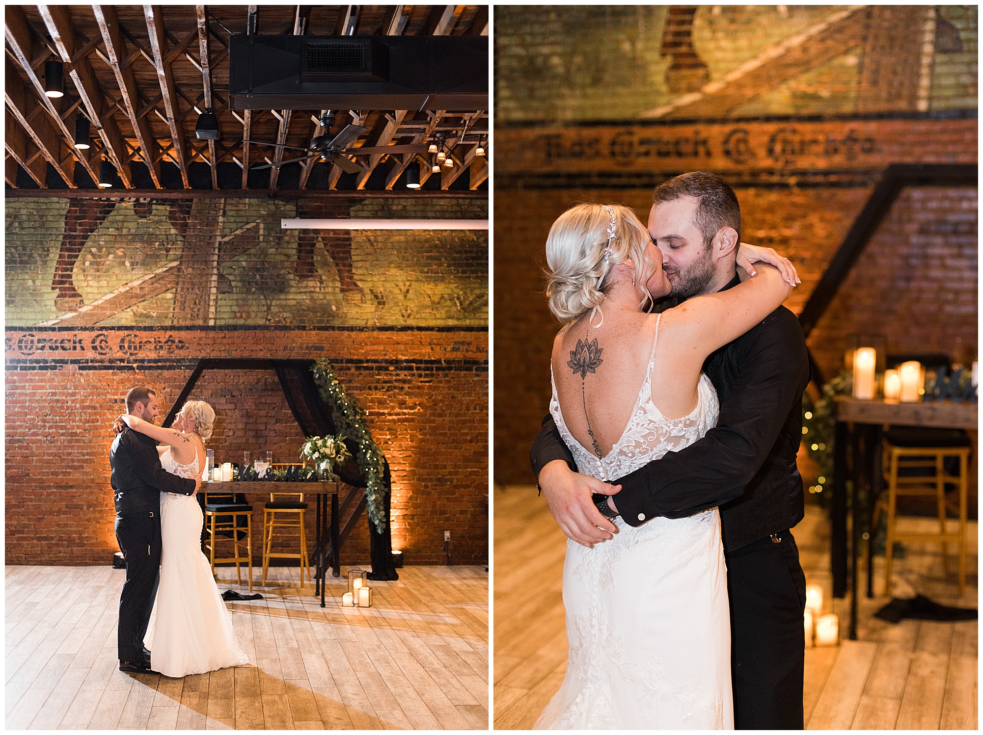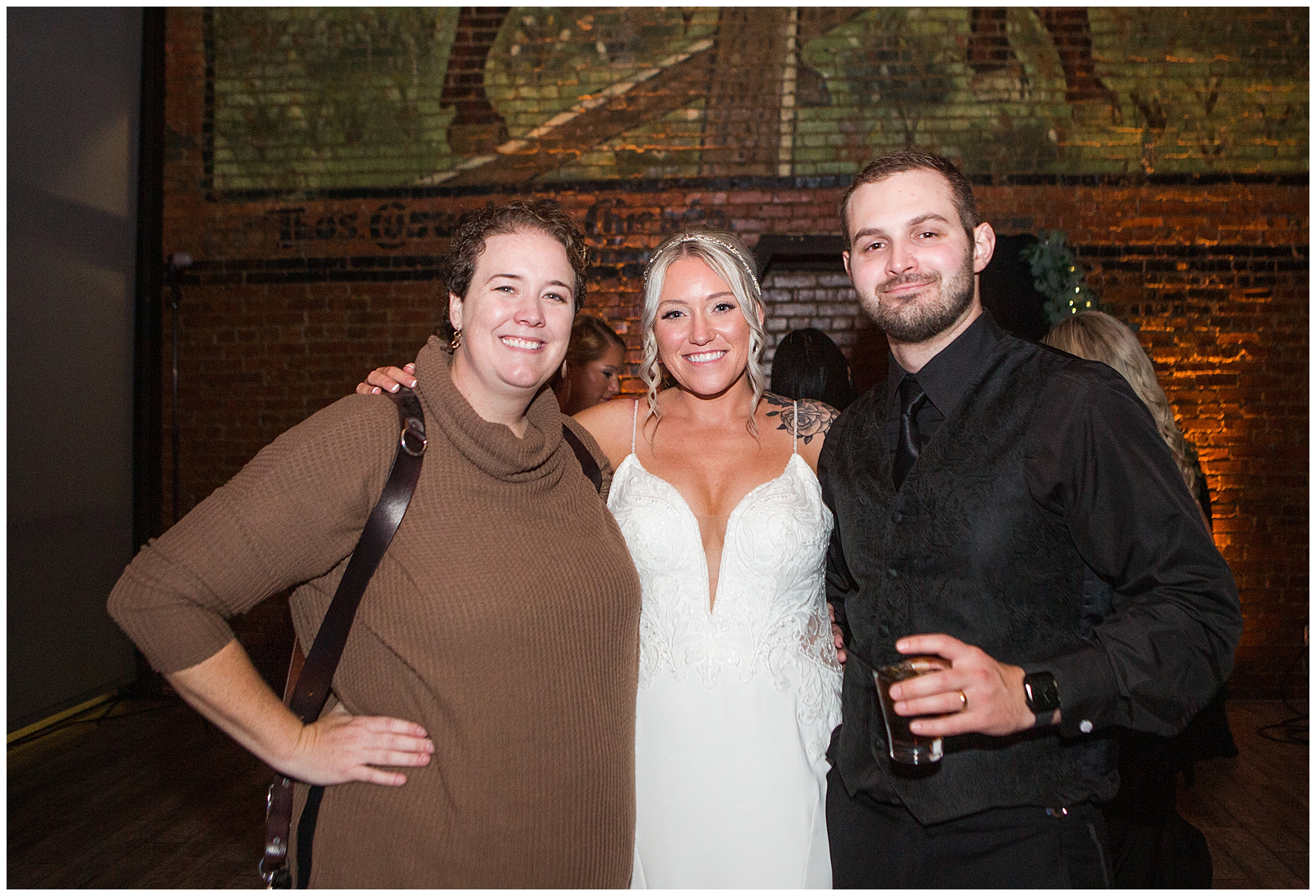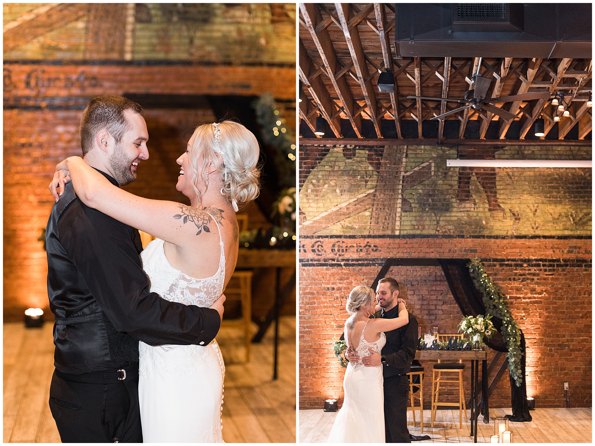 We all then headed to the amazing Reality On Monroe venue for bridal party and couple photos both inside and outside. This venue was perfect not only for the ceremony and reception space with it’s intimate industrial style, but it also gave us shelter from the cold. Because the winds were hitting this bridal party, who were incredible troopers throughout the day dealing with the cold temps, we found the alley right outside of the venue shielded us a bit. With the black theme of attire I would say it made for some pretty modern and amazing portraits! And when it was time for Bethany and Hayden’s photos these two stuck it out with me in the elements and kept warm by snuggling in close. How adorable are these two together?