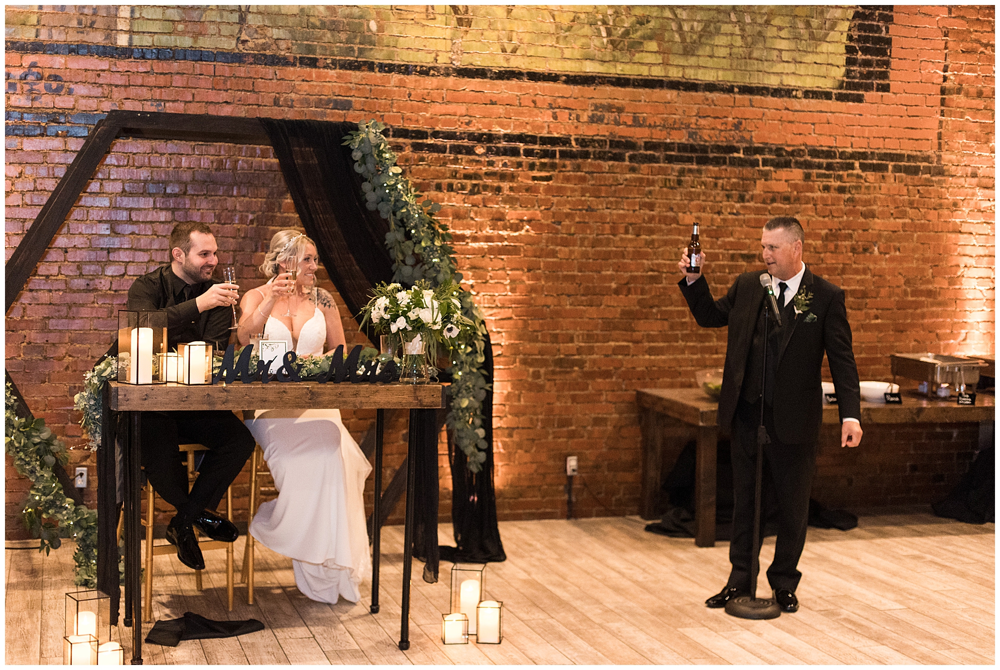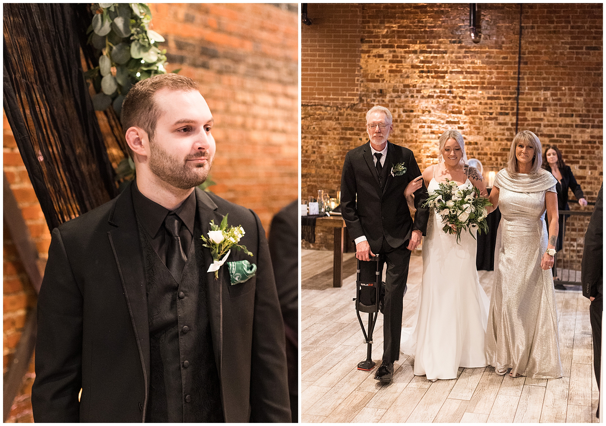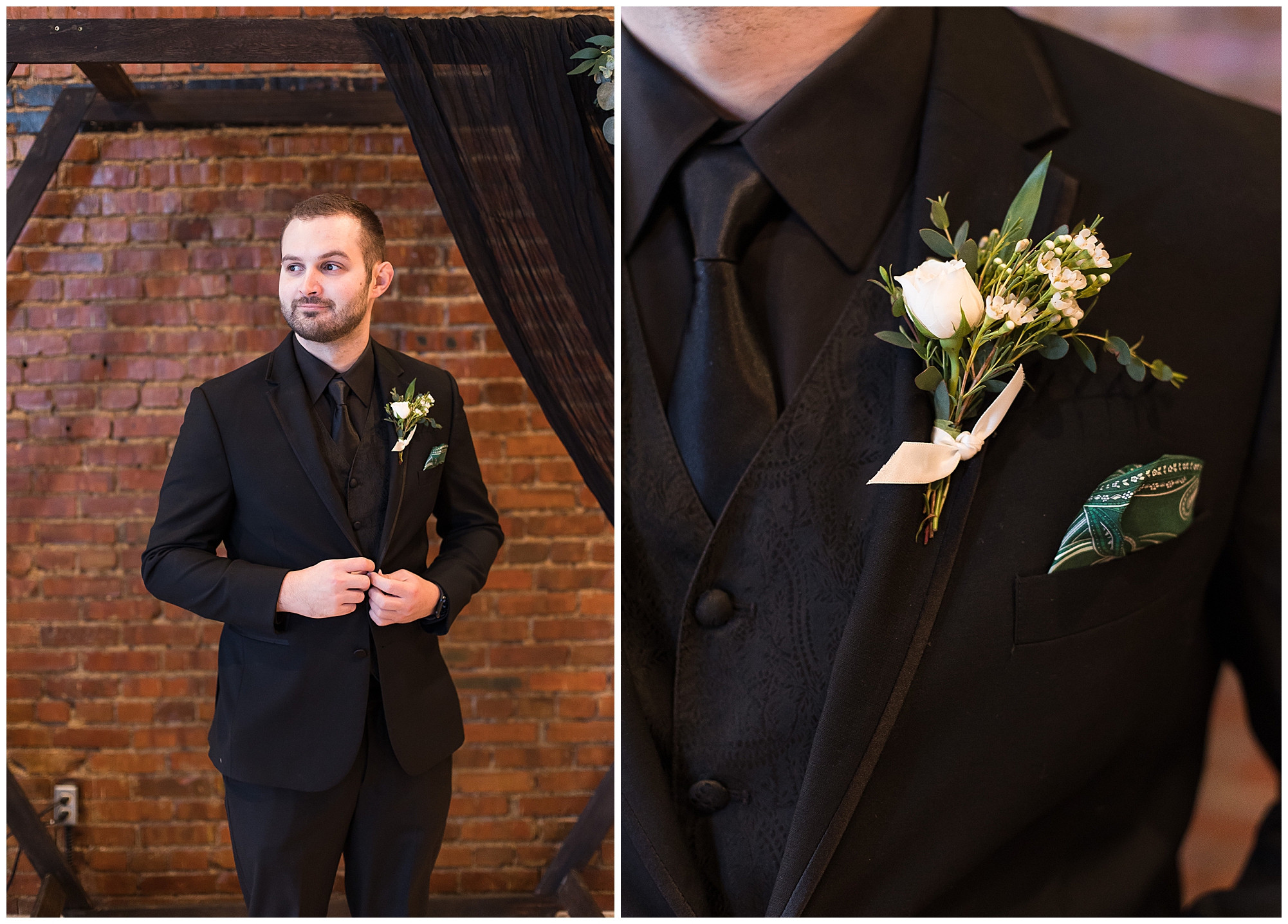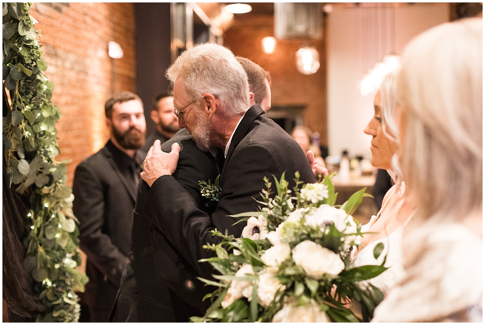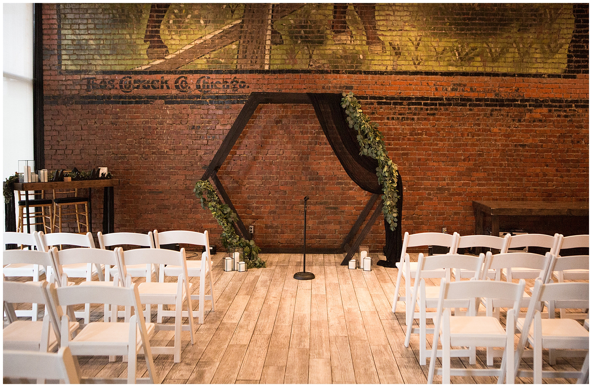 We all then headed to the amazing Reality On Monroe venue for bridal party and couple photos both inside and outside. This venue was perfect not only for the ceremony and reception space with it’s intimate industrial style, but it also gave us shelter from the cold. Because the winds were hitting this bridal party, who were incredible troopers throughout the day dealing with the cold temps, we found the alley right outside of the venue shielded us a bit. With the black theme of attire I would say it made for some pretty modern and amazing portraits! And when it was time for Bethany and Hayden’s photos these two stuck it out with me in the elements and kept warm by snuggling in close. How adorable are these two together?