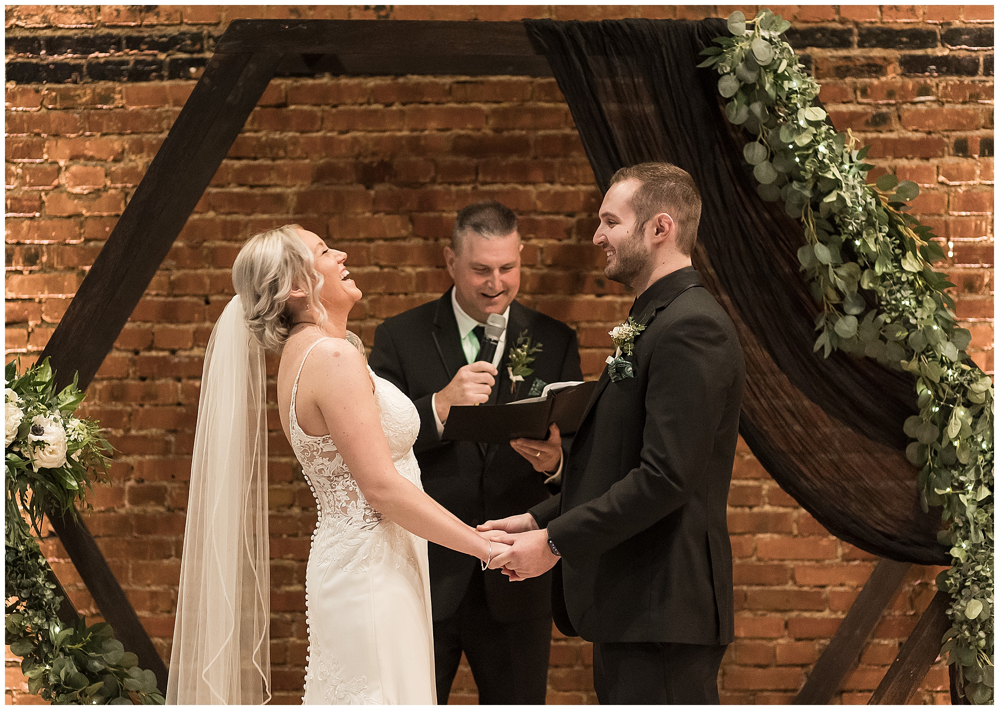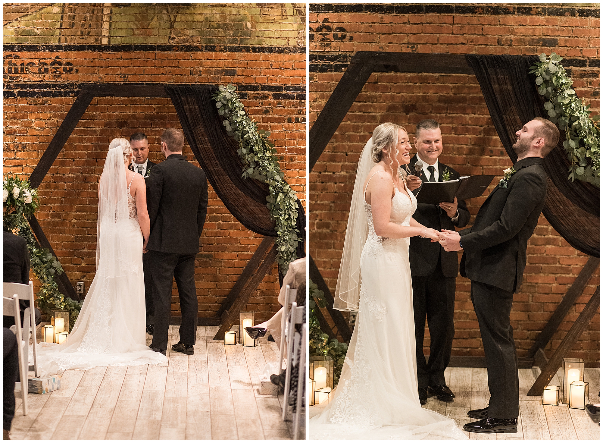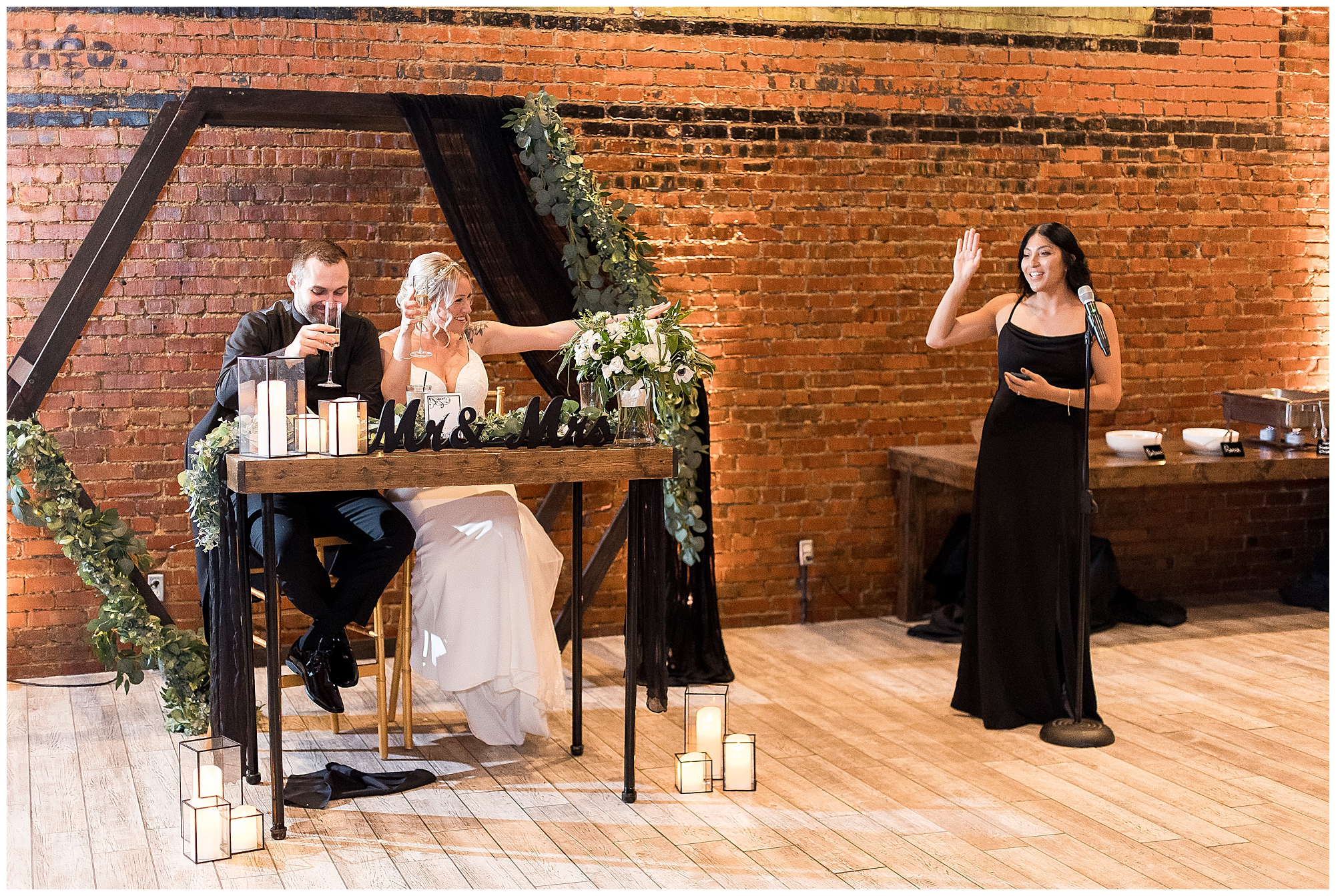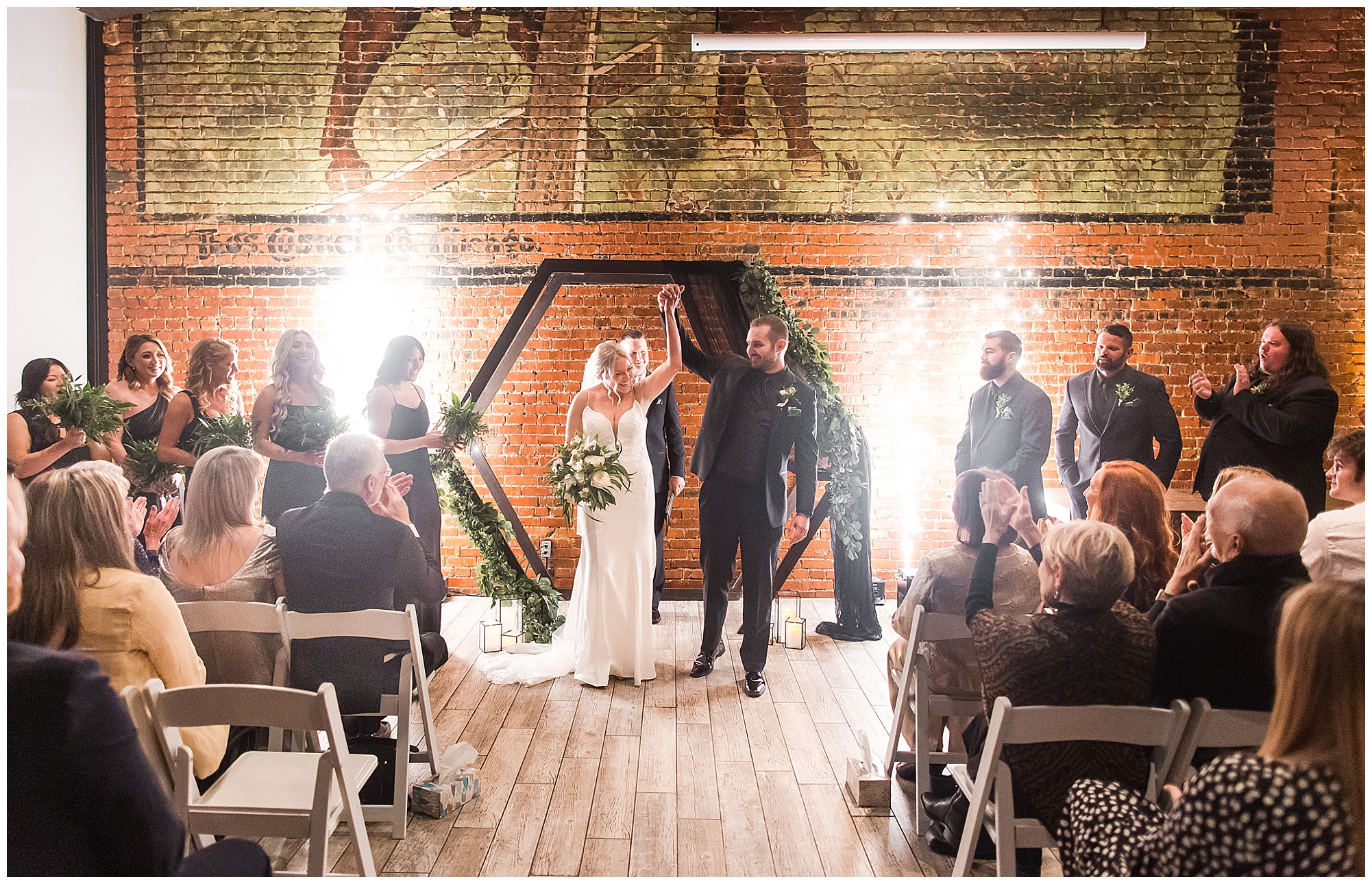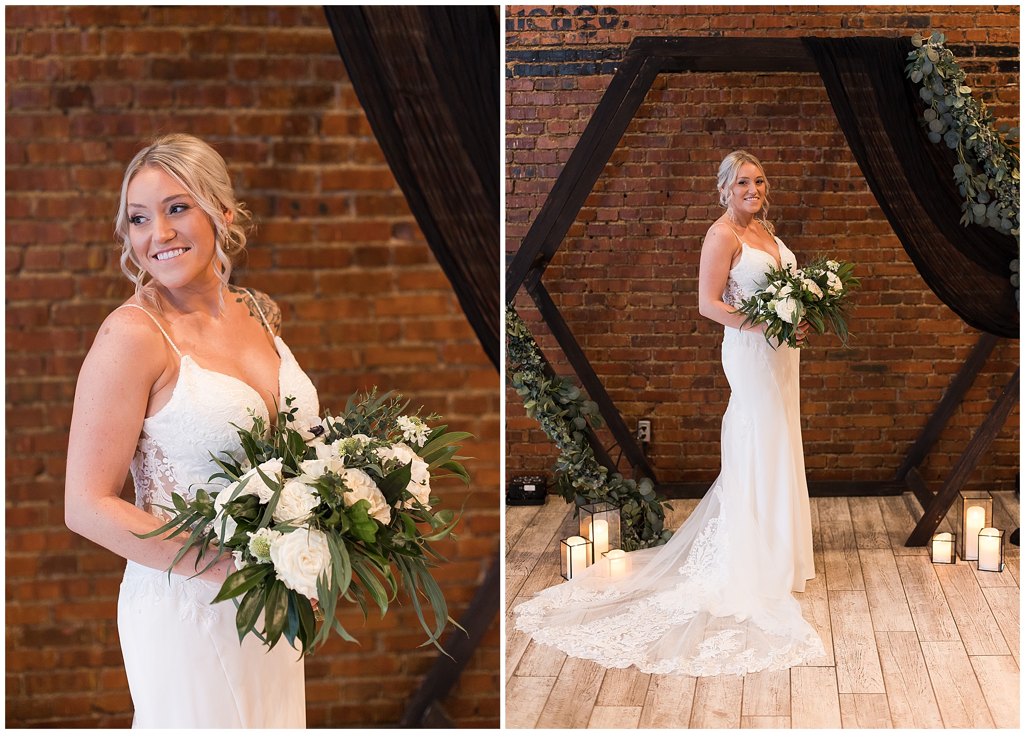 We all then headed to the amazing Reality On Monroe venue for bridal party and couple photos both inside and outside. This venue was perfect not only for the ceremony and reception space with it’s intimate industrial style, but it also gave us shelter from the cold. Because the winds were hitting this bridal party, who were incredible troopers throughout the day dealing with the cold temps, we found the alley right outside of the venue shielded us a bit. With the black theme of attire I would say it made for some pretty modern and amazing portraits! And when it was time for Bethany and Hayden’s photos these two stuck it out with me in the elements and kept warm by snuggling in close. How adorable are these two together?