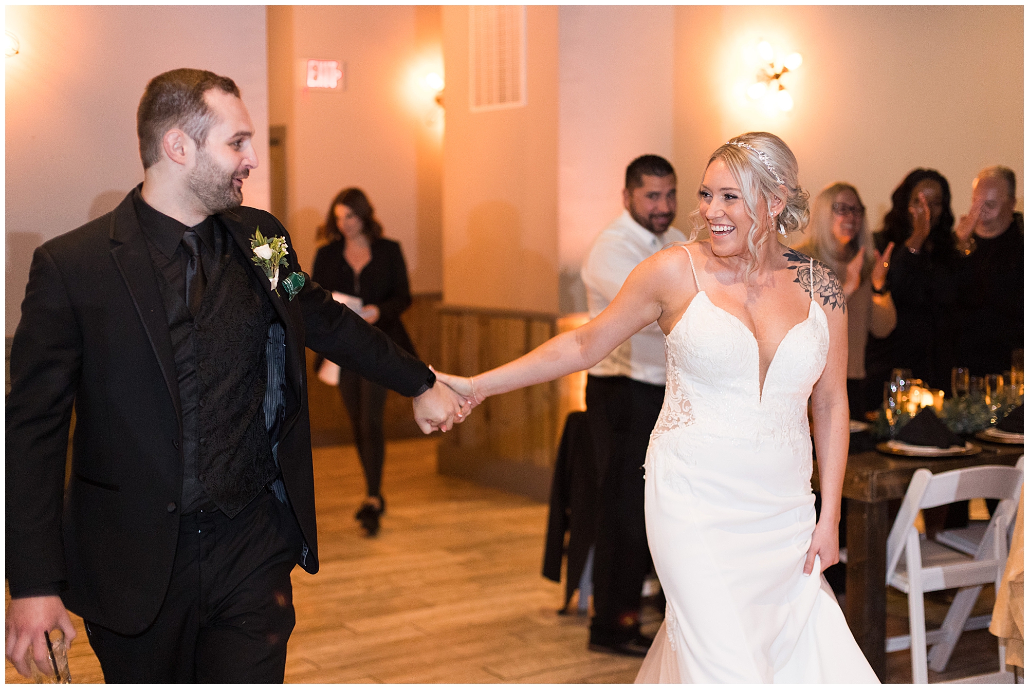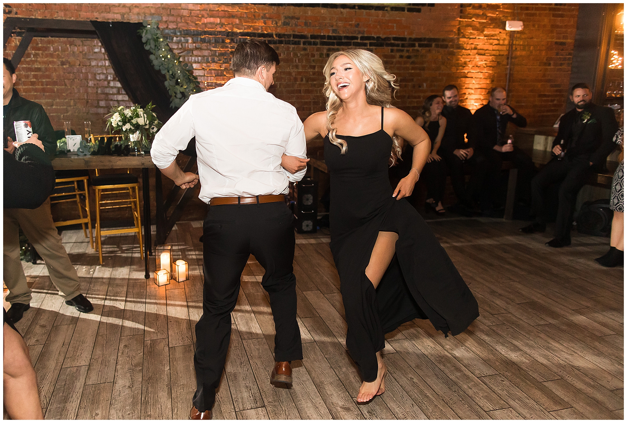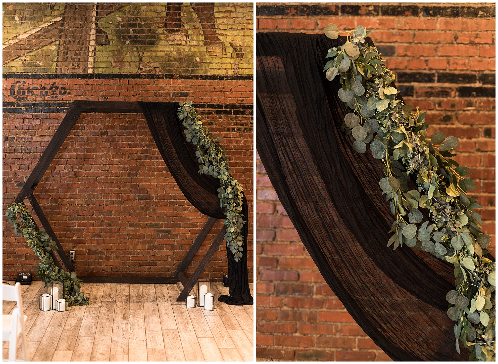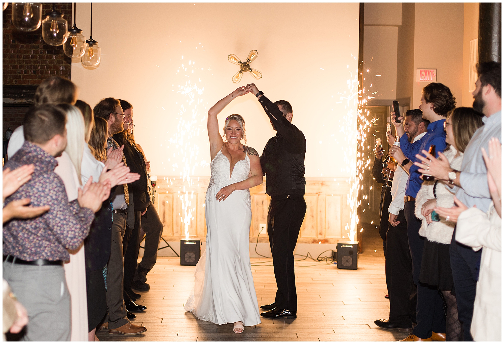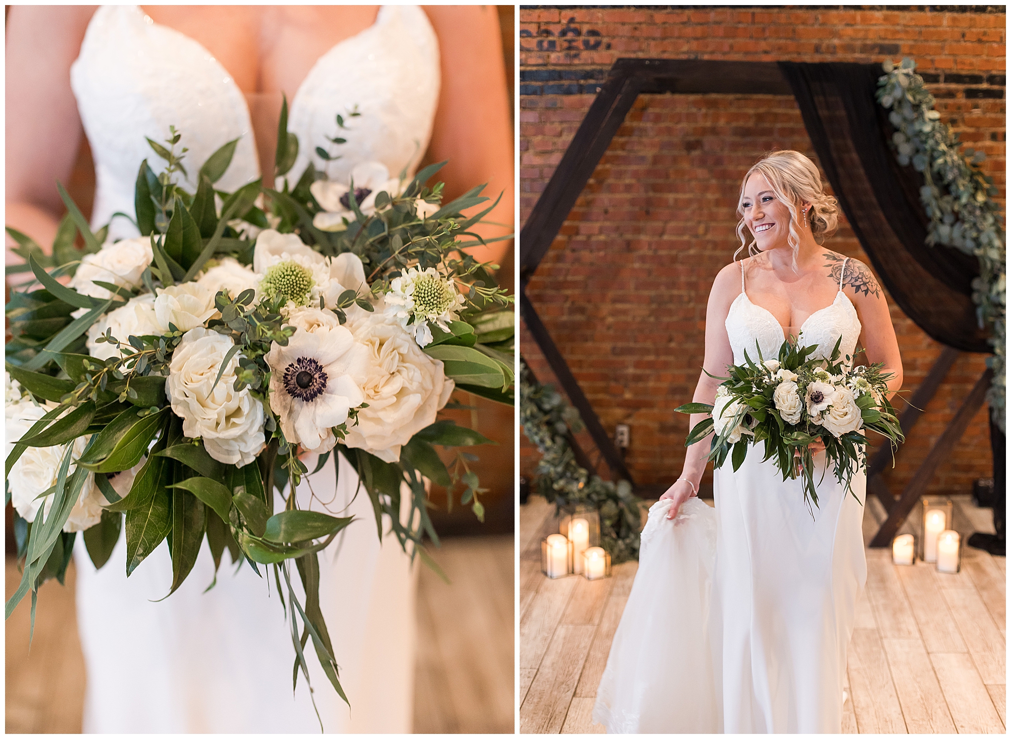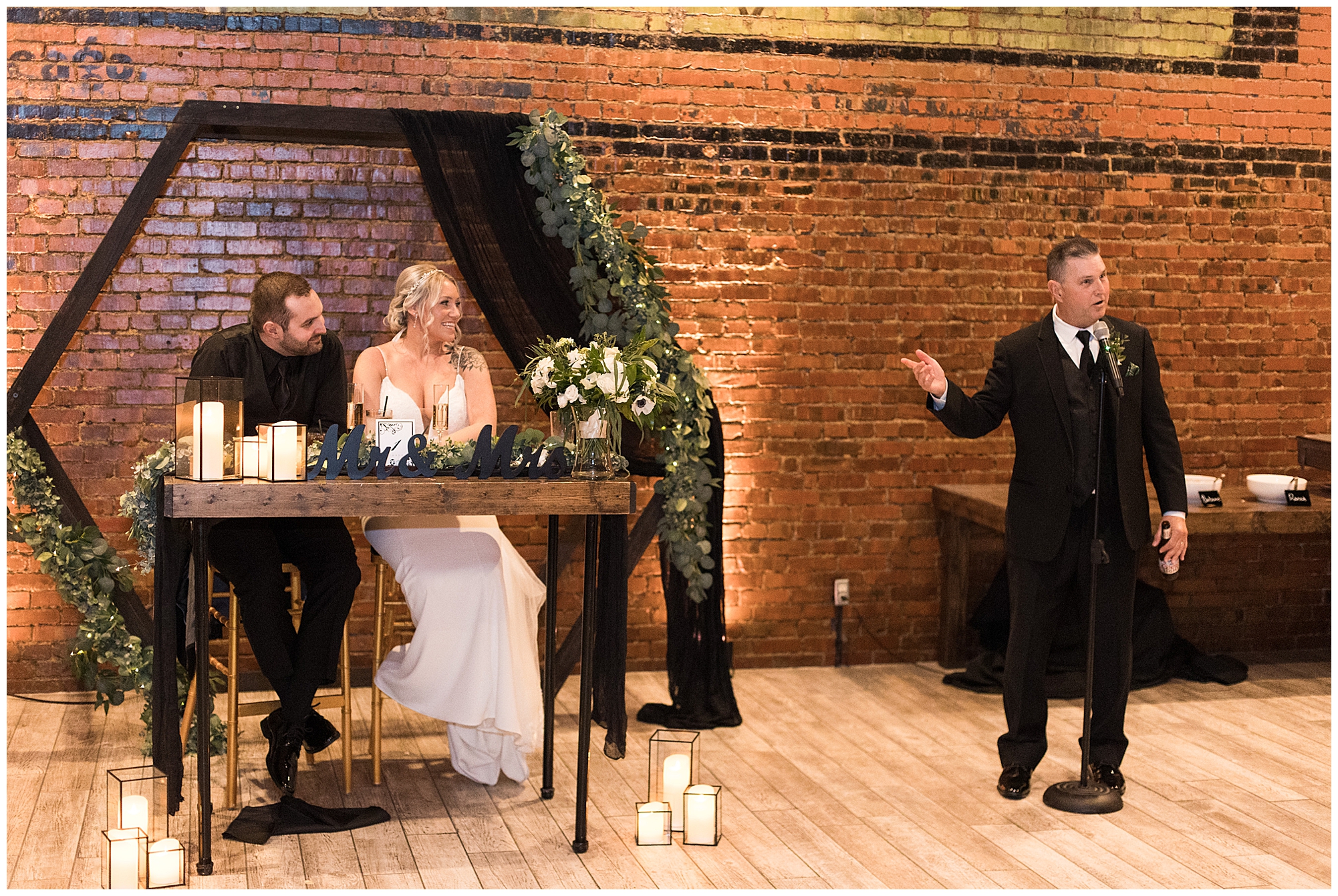 We all then headed to the amazing Reality On Monroe venue for bridal party and couple photos both inside and outside. This venue was perfect not only for the ceremony and reception space with it’s intimate industrial style, but it also gave us shelter from the cold. Because the winds were hitting this bridal party, who were incredible troopers throughout the day dealing with the cold temps, we found the alley right outside of the venue shielded us a bit. With the black theme of attire I would say it made for some pretty modern and amazing portraits! And when it was time for Bethany and Hayden’s photos these two stuck it out with me in the elements and kept warm by snuggling in close. How adorable are these two together?