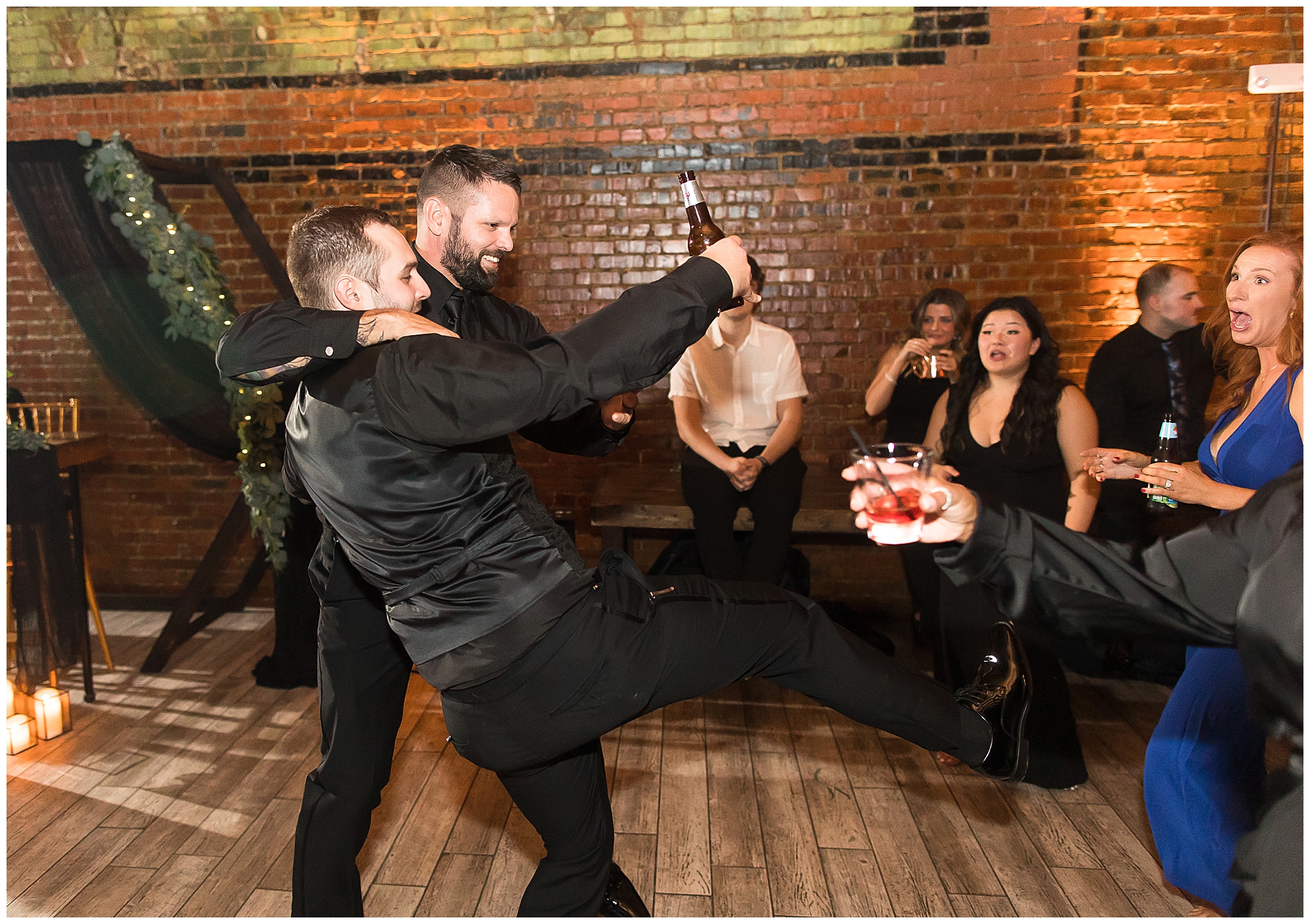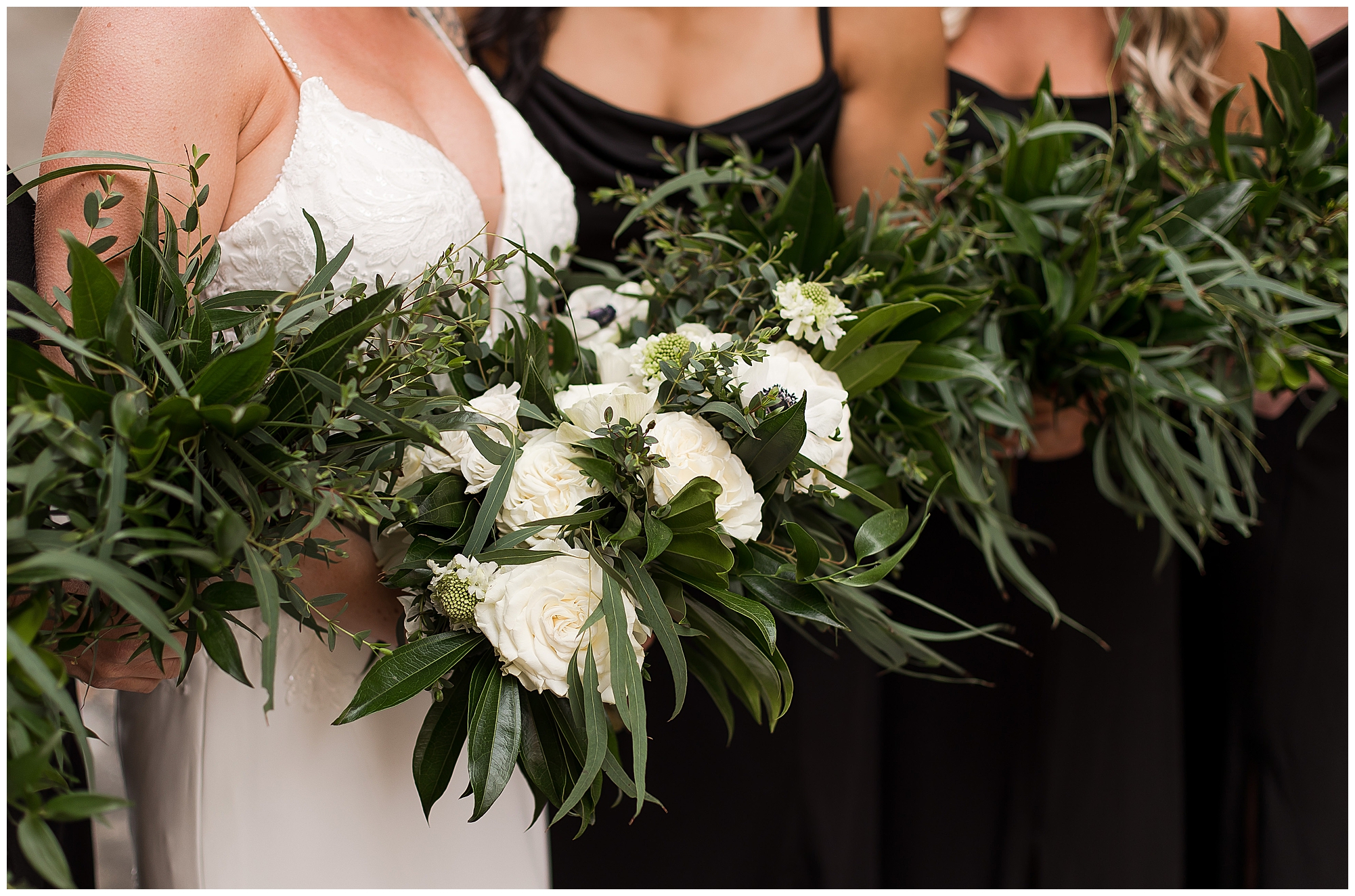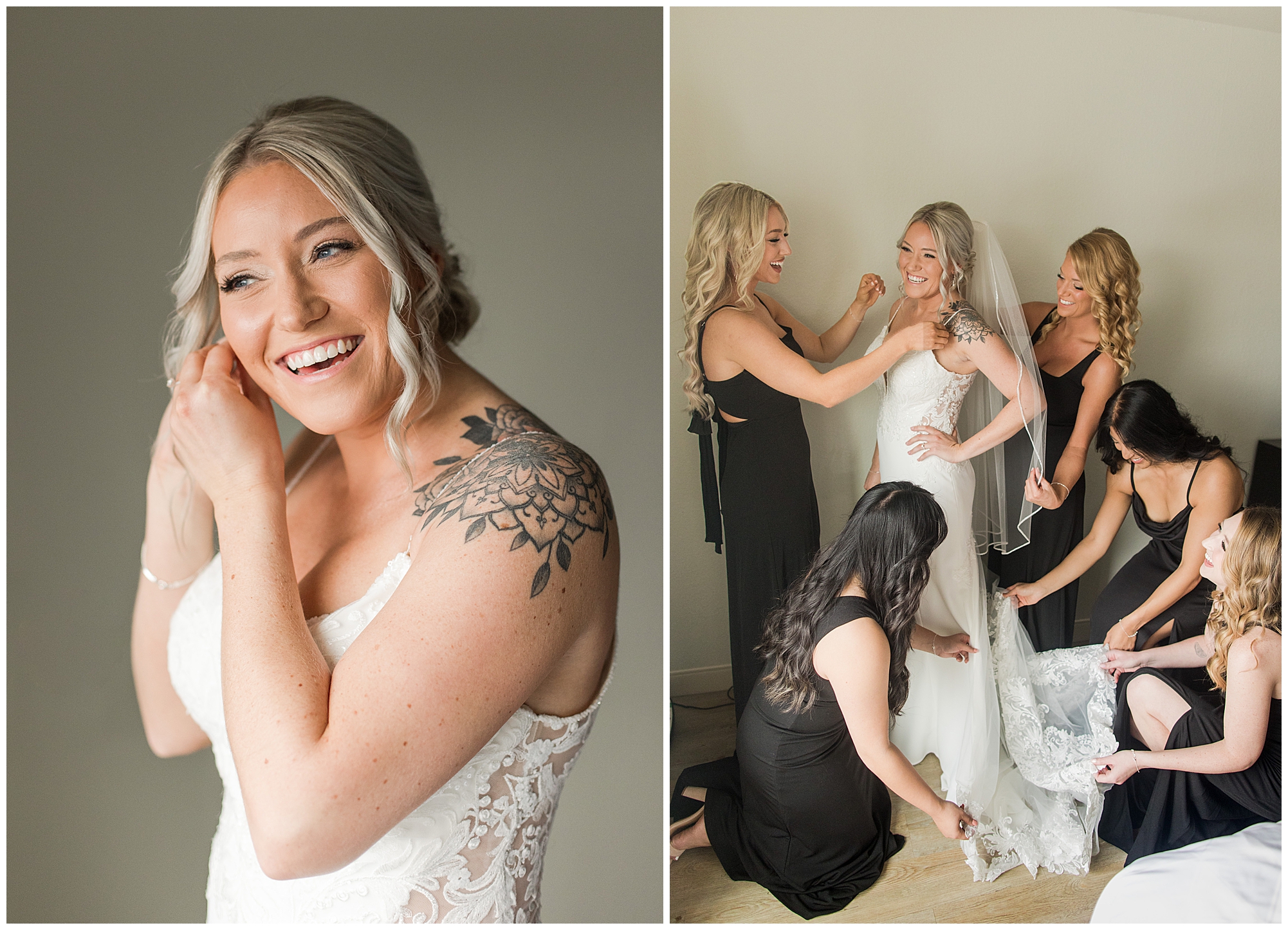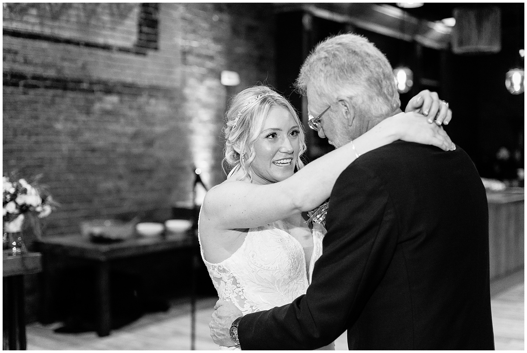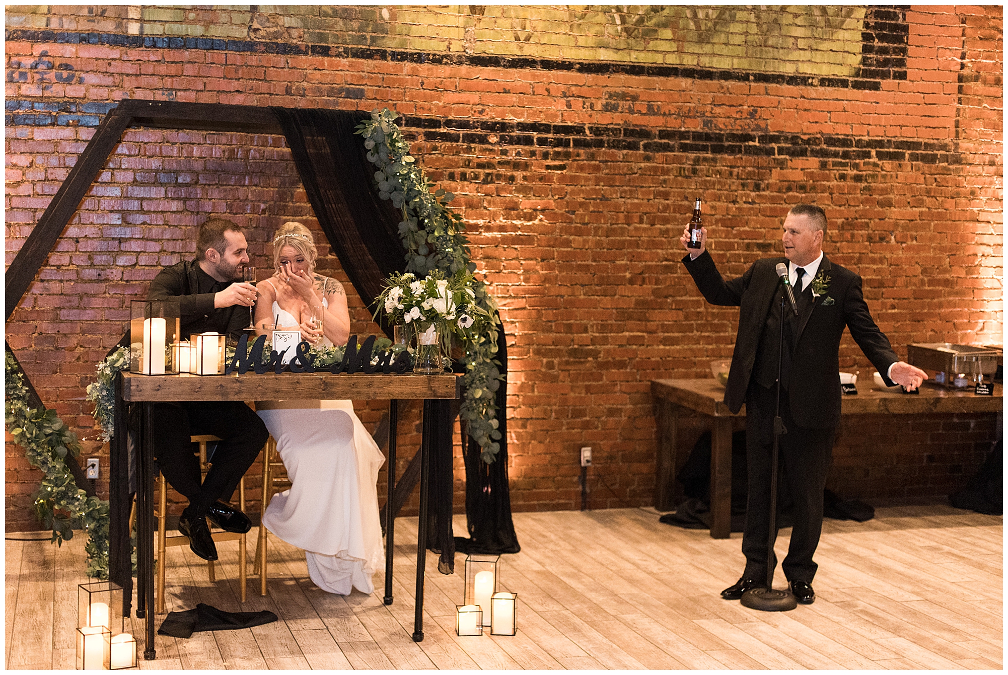 We all then headed to the amazing Reality On Monroe venue for bridal party and couple photos both inside and outside. This venue was perfect not only for the ceremony and reception space with it’s intimate industrial style, but it also gave us shelter from the cold. Because the winds were hitting this bridal party, who were incredible troopers throughout the day dealing with the cold temps, we found the alley right outside of the venue shielded us a bit. With the black theme of attire I would say it made for some pretty modern and amazing portraits! And when it was time for Bethany and Hayden’s photos these two stuck it out with me in the elements and kept warm by snuggling in close. How adorable are these two together?