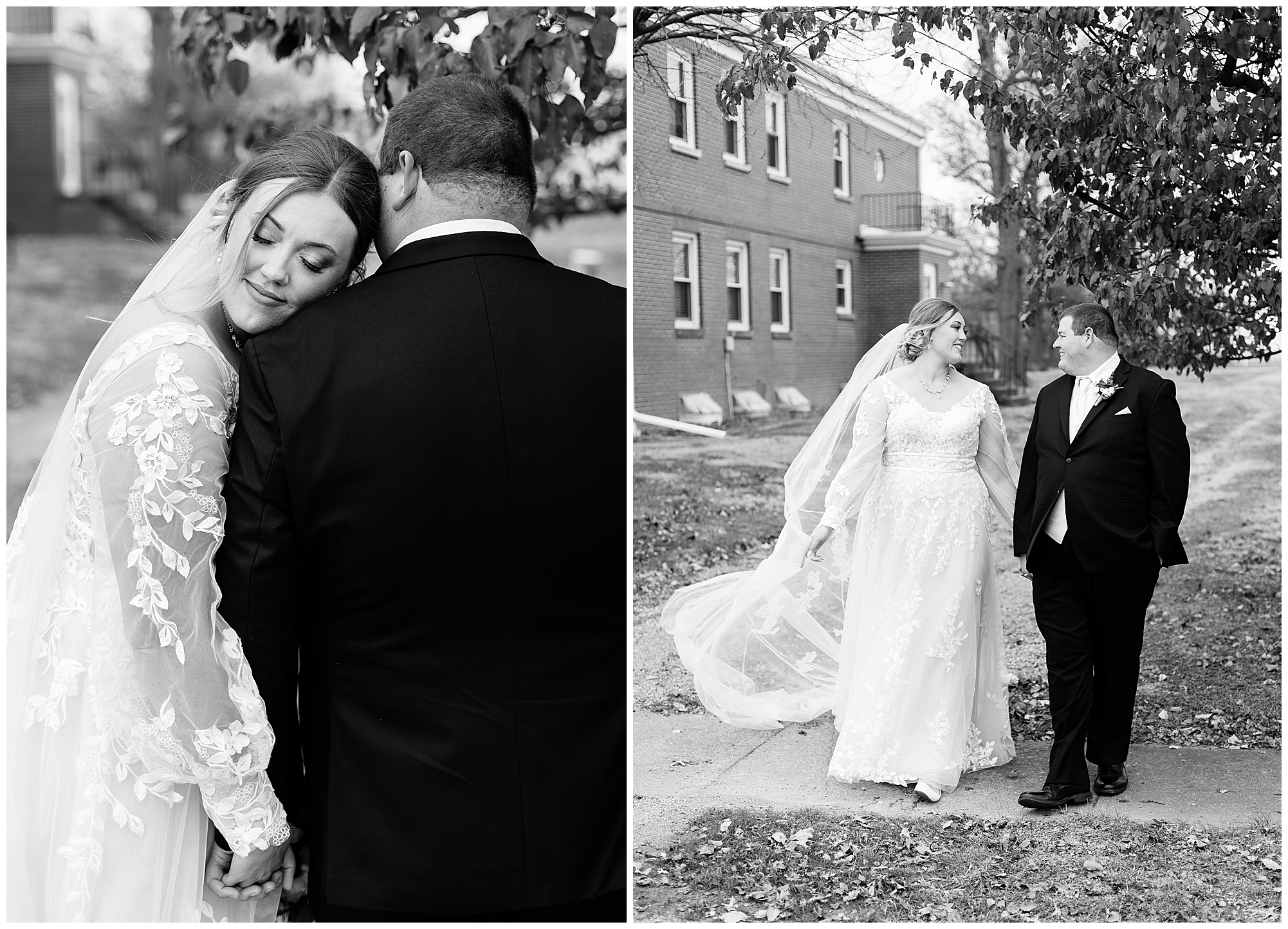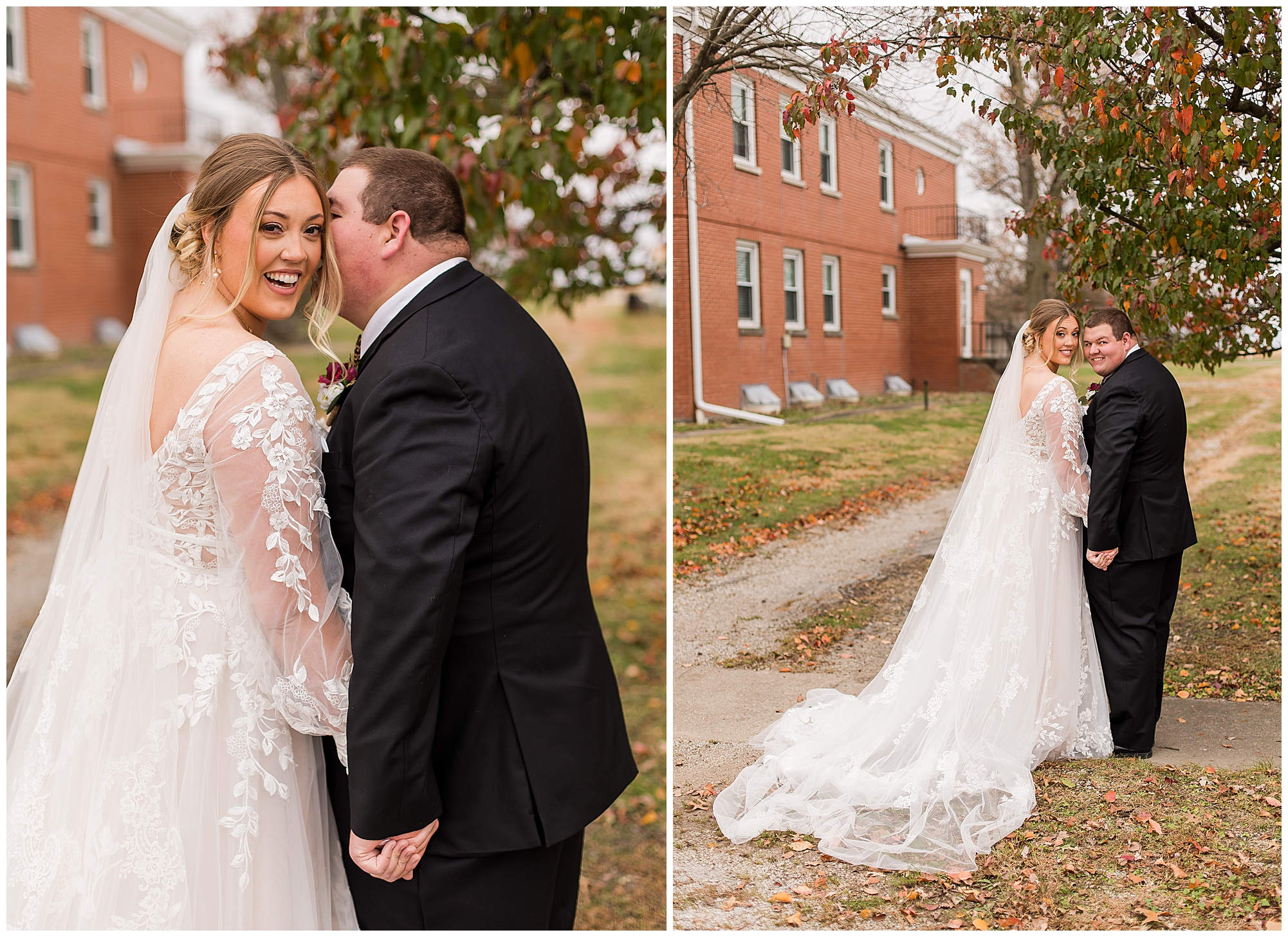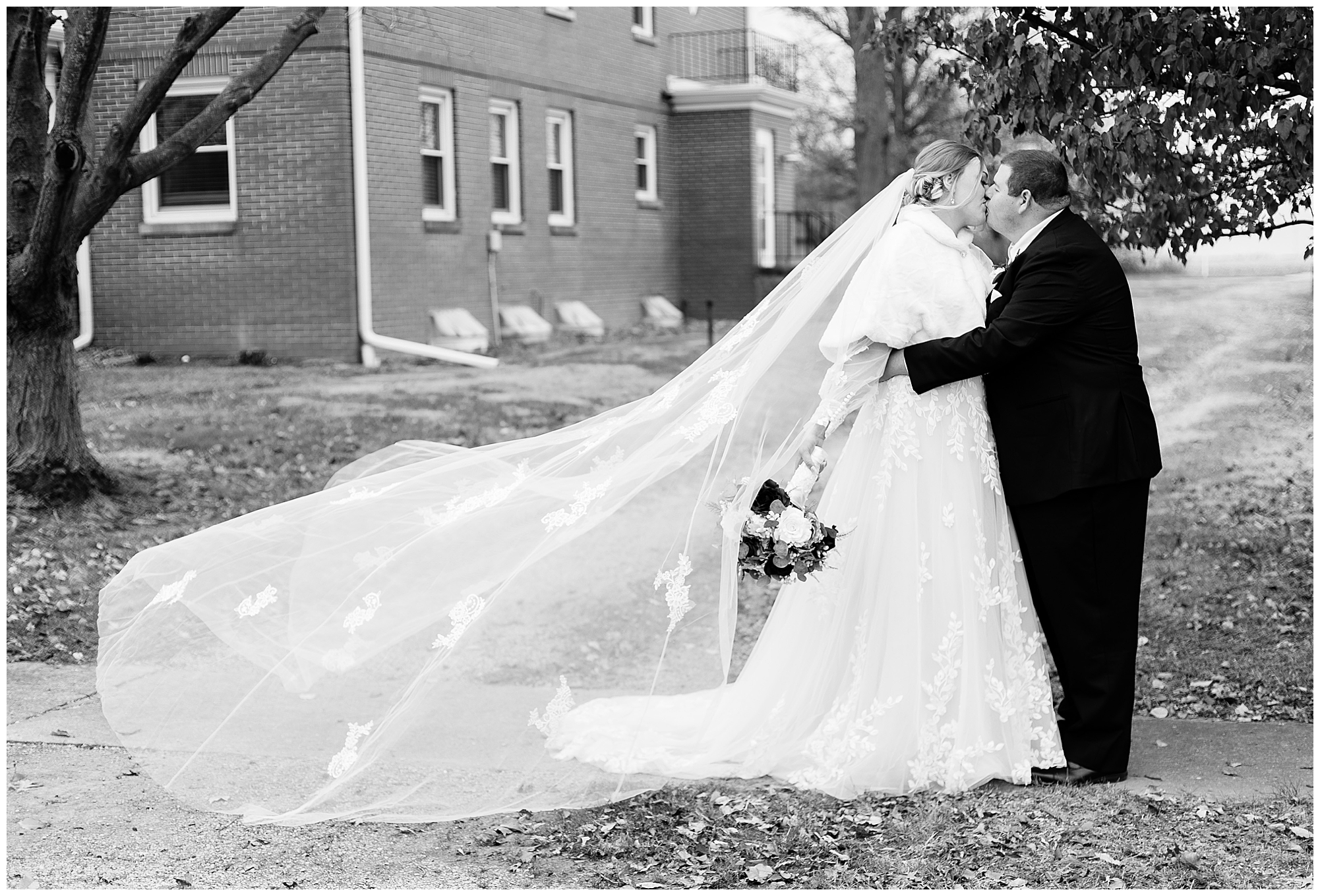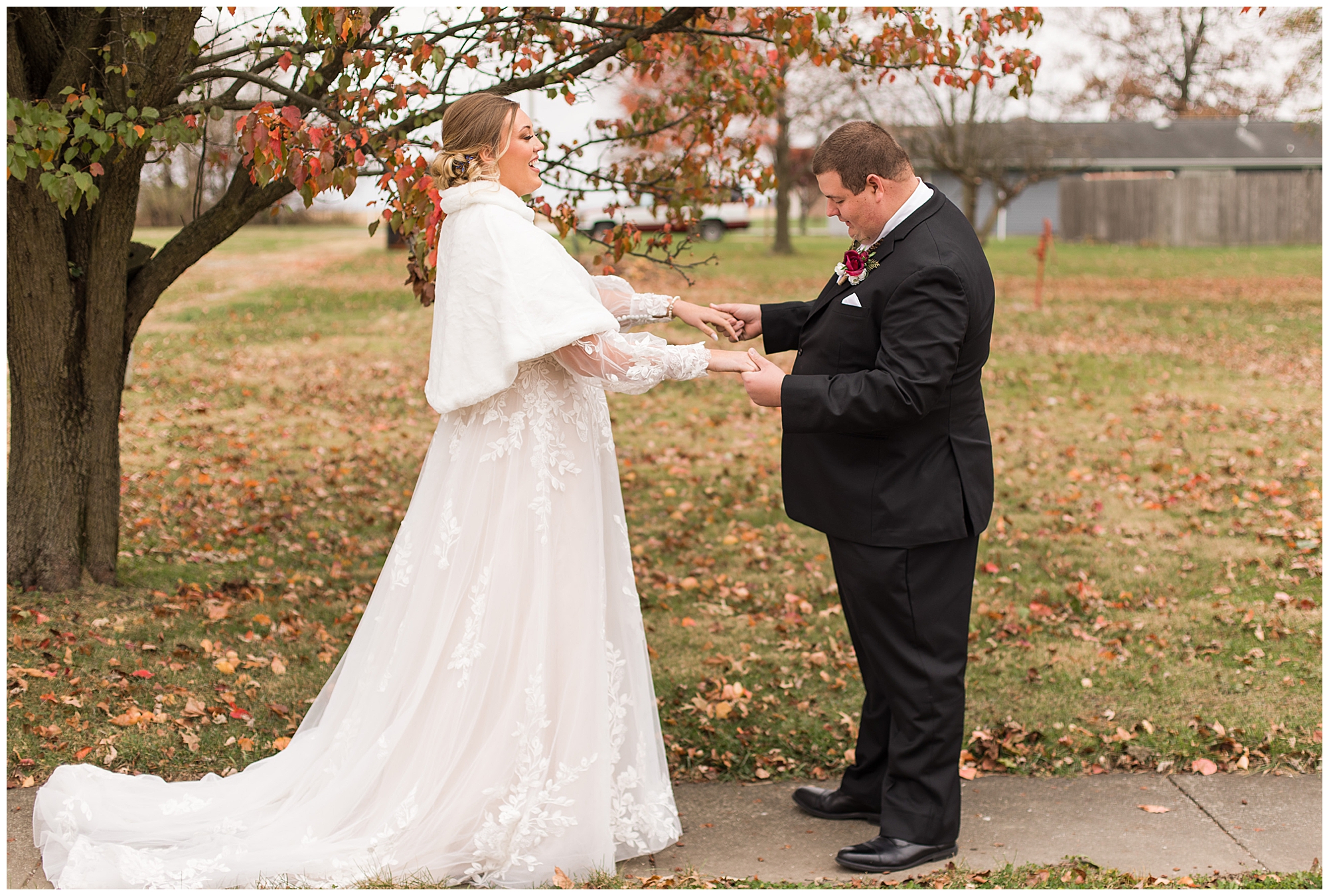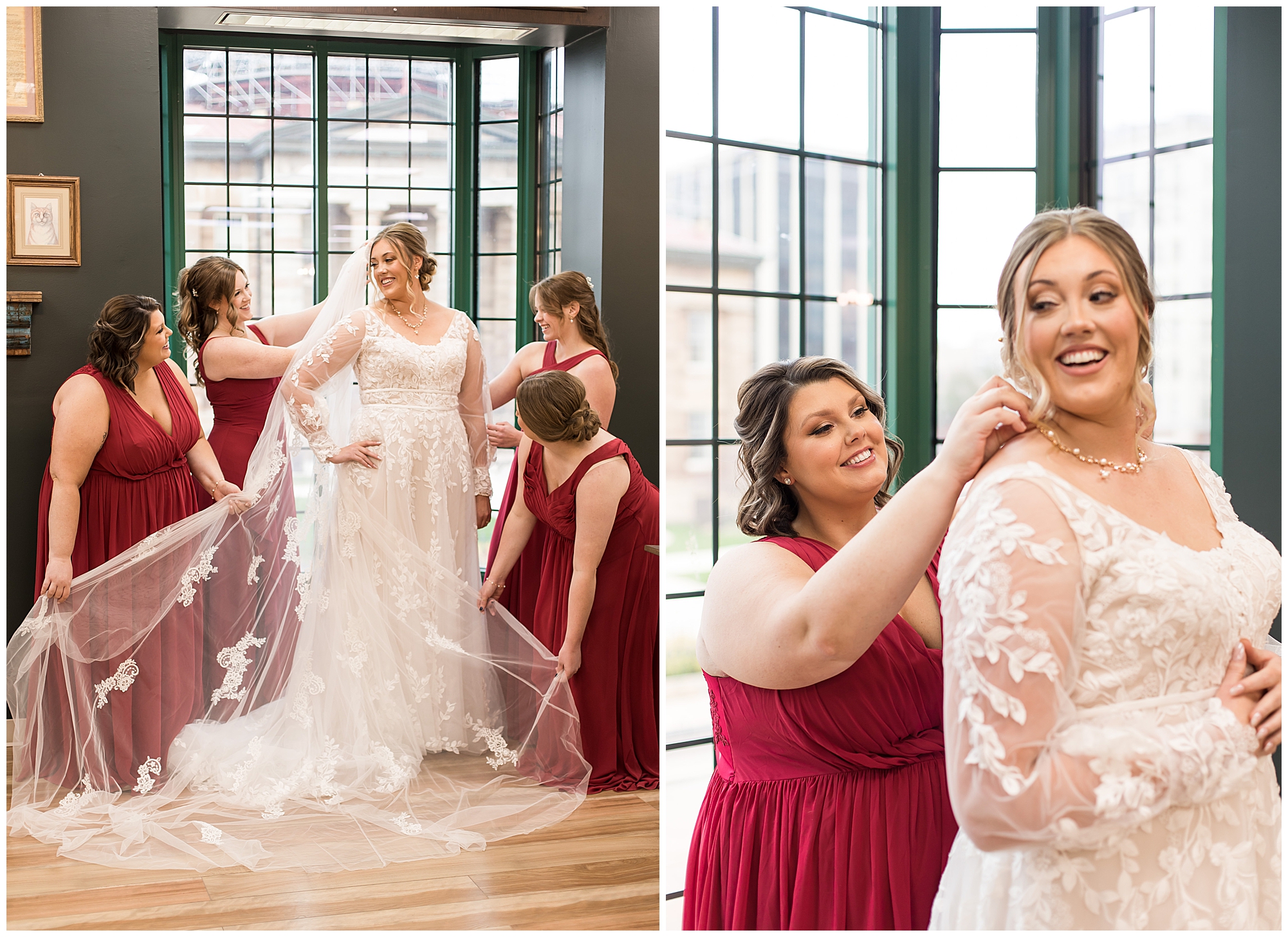 Meg and Clark’s late fall wedding in Morrisonville, Illinois was an incredible day of love, laughter, and beauty! Although the weather made for a chilly day, nothing could stop these two from having a good time with their loved ones as they tied the knot! The day started out with Meg and her ladies at the salon where they each were getting glammed up. This bride was all smiles and so exciting her and Clark’s day had finally arrived. And when I saw Meg step into her gown she was truly a vision! From the lovely lace floral touches, to the delicate ribbon waist, to the sheer sleeves Meg was absolutely stunning! And to top her look off, Meg wore her sister’s gorgeous cathedral length veil. Boy were we going to have fun with that!