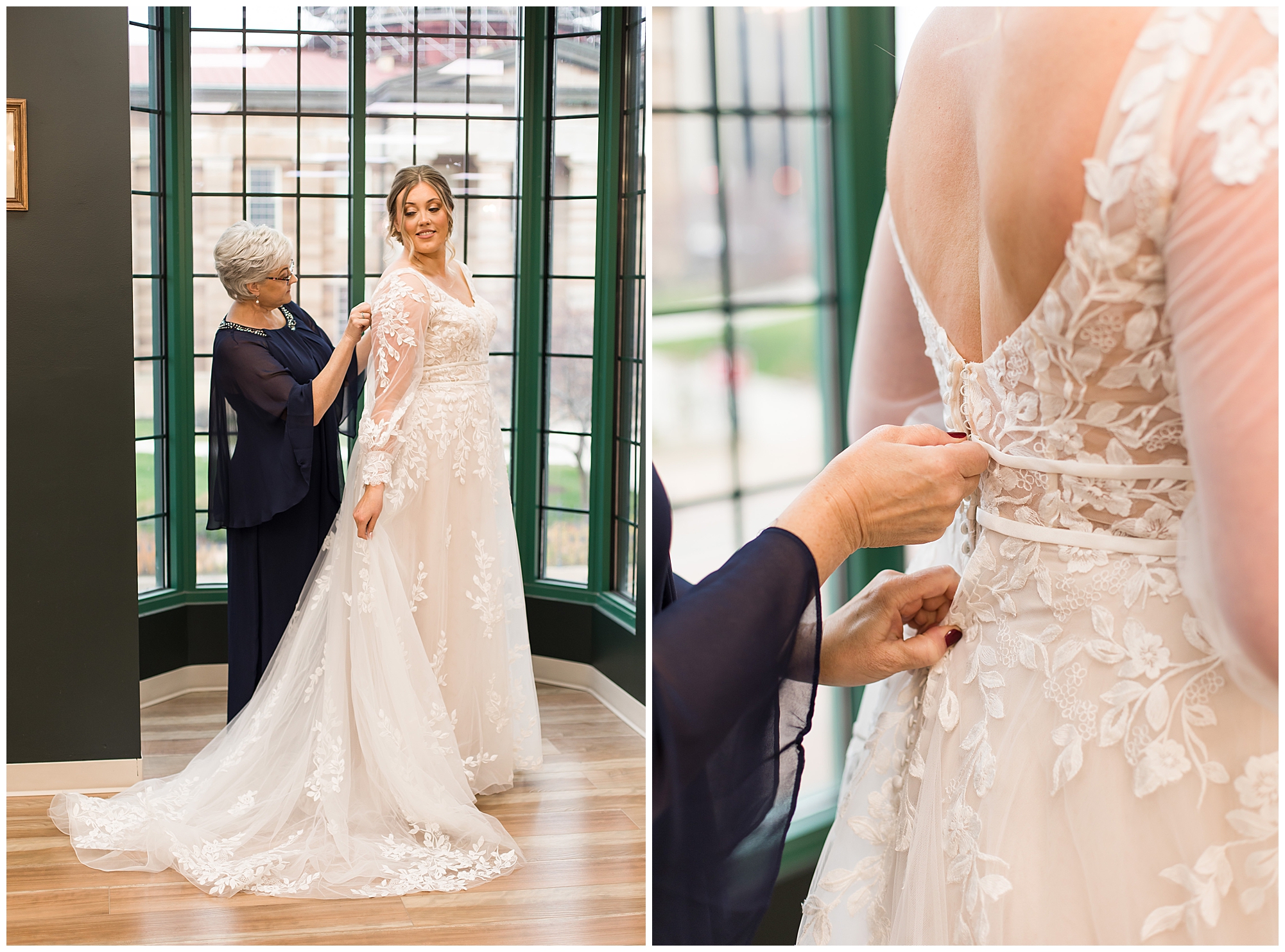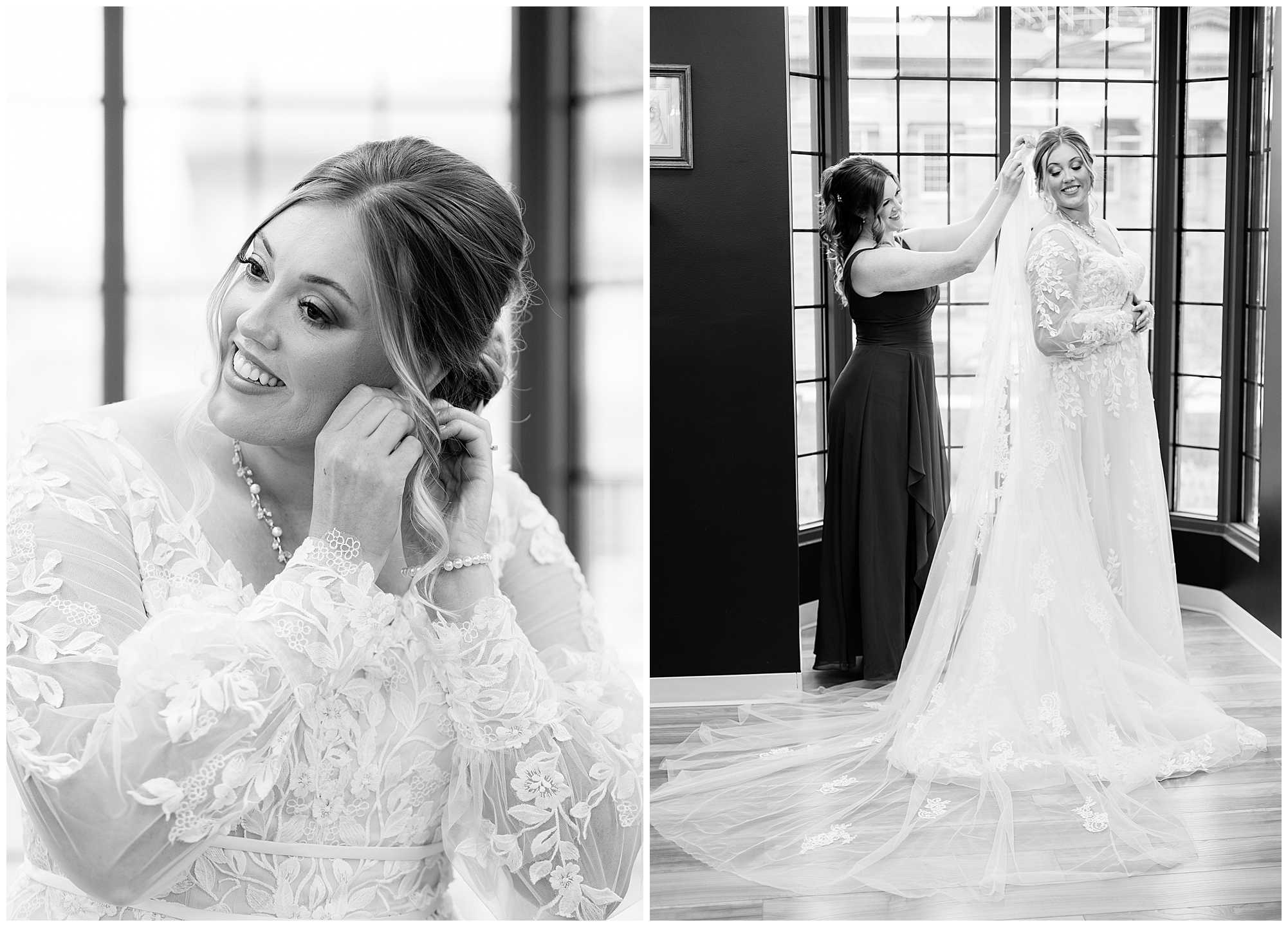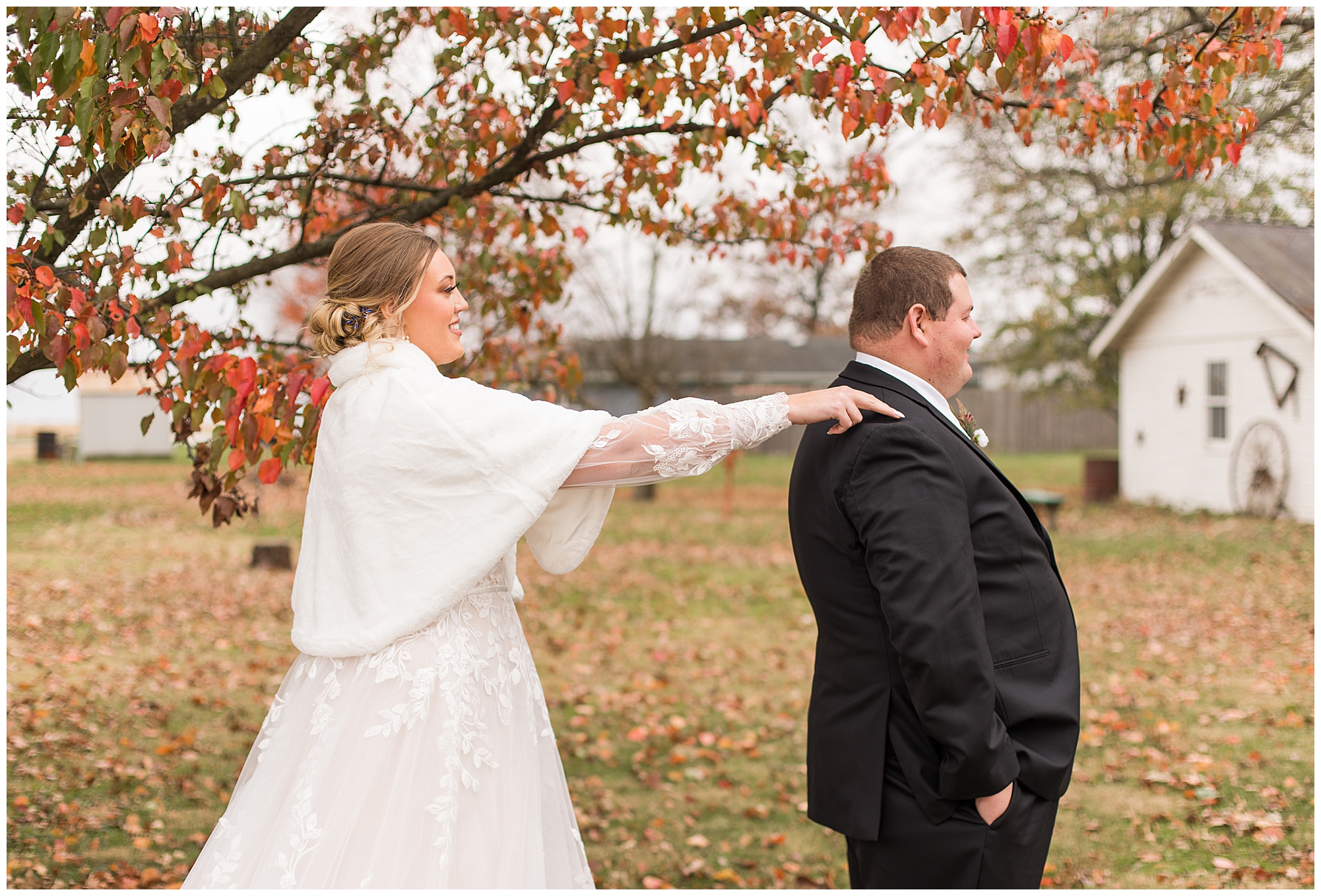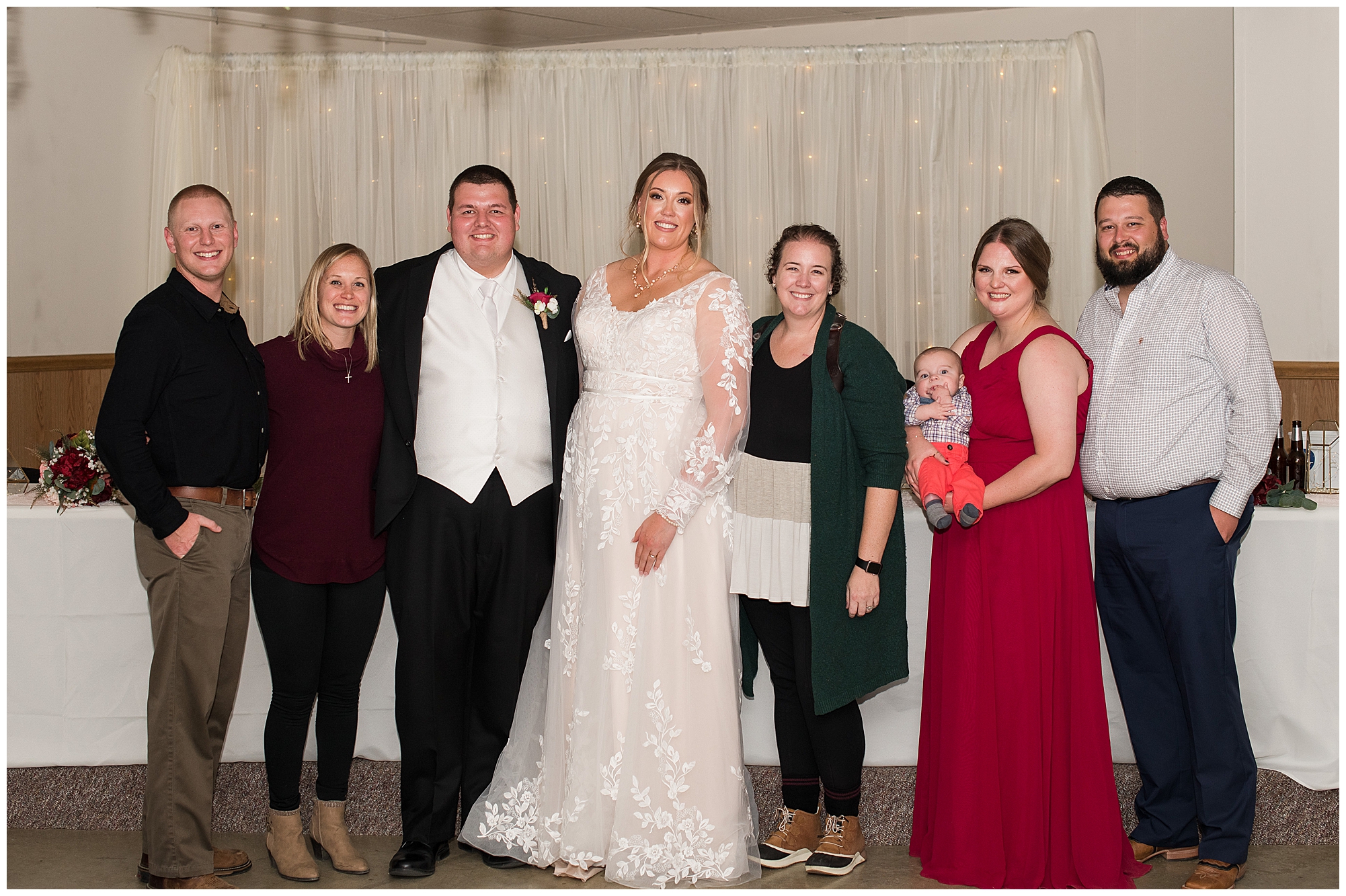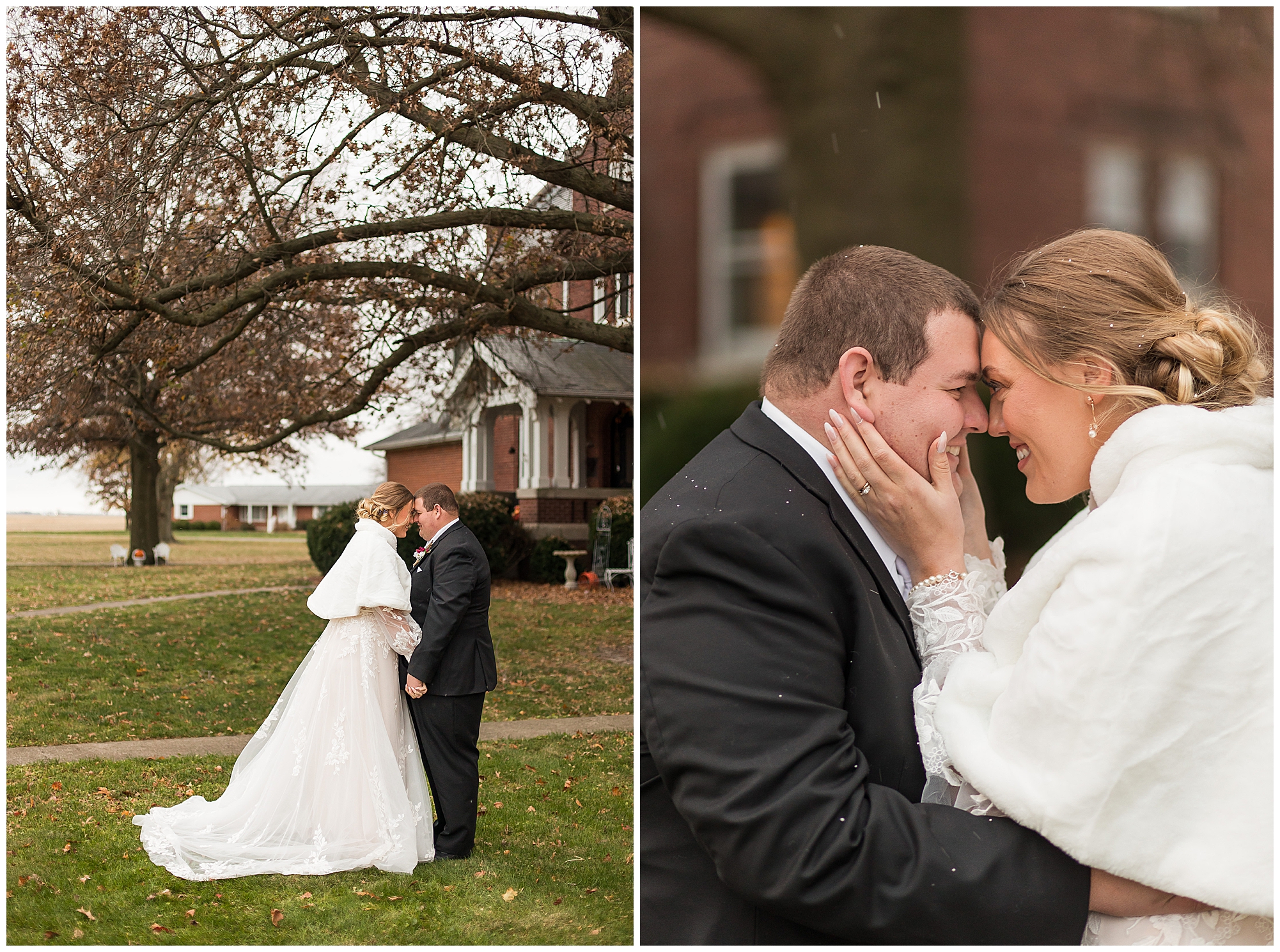 Meg and Clark’s late fall wedding in Morrisonville, Illinois was an incredible day of love, laughter, and beauty! Although the weather made for a chilly day, nothing could stop these two from having a good time with their loved ones as they tied the knot! The day started out with Meg and her ladies at the salon where they each were getting glammed up. This bride was all smiles and so exciting her and Clark’s day had finally arrived. And when I saw Meg step into her gown she was truly a vision! From the lovely lace floral touches, to the delicate ribbon waist, to the sheer sleeves Meg was absolutely stunning! And to top her look off, Meg wore her sister’s gorgeous cathedral length veil. Boy were we going to have fun with that!