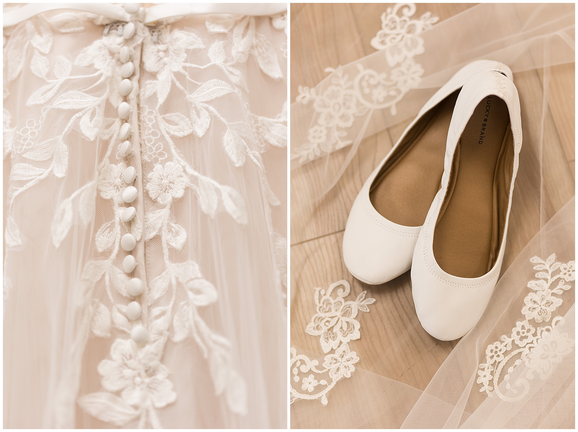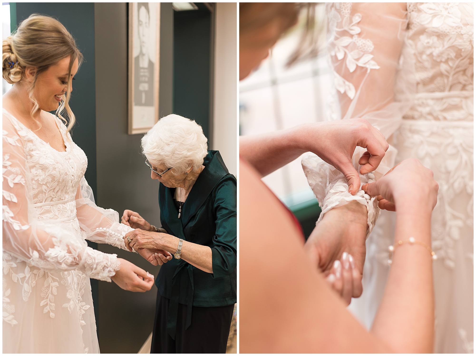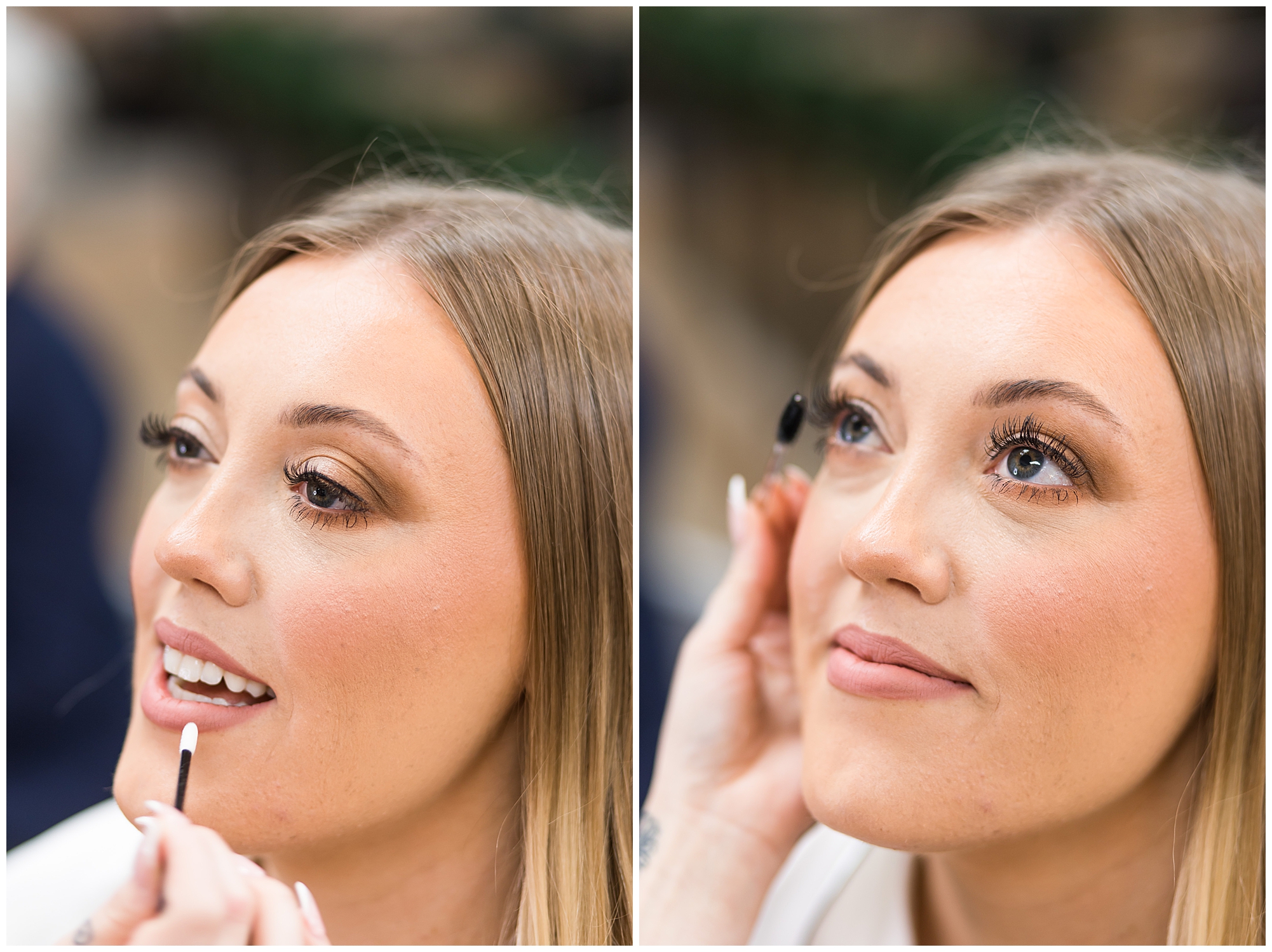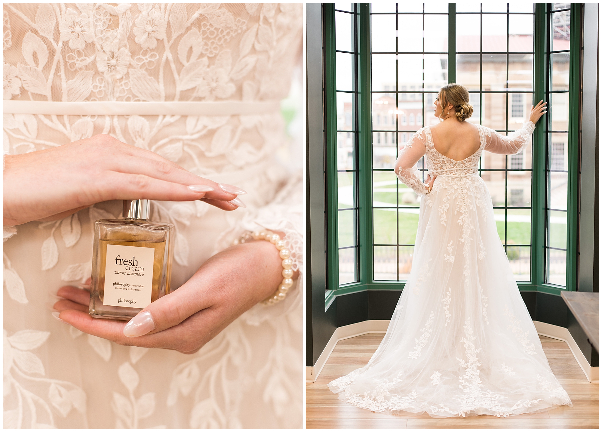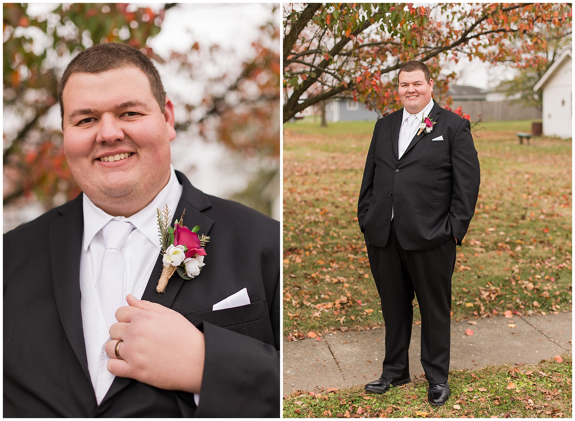 Meg and Clark’s late fall wedding in Morrisonville, Illinois was an incredible day of love, laughter, and beauty! Although the weather made for a chilly day, nothing could stop these two from having a good time with their loved ones as they tied the knot! The day started out with Meg and her ladies at the salon where they each were getting glammed up. This bride was all smiles and so exciting her and Clark’s day had finally arrived. And when I saw Meg step into her gown she was truly a vision! From the lovely lace floral touches, to the delicate ribbon waist, to the sheer sleeves Meg was absolutely stunning! And to top her look off, Meg wore her sister’s gorgeous cathedral length veil. Boy were we going to have fun with that!