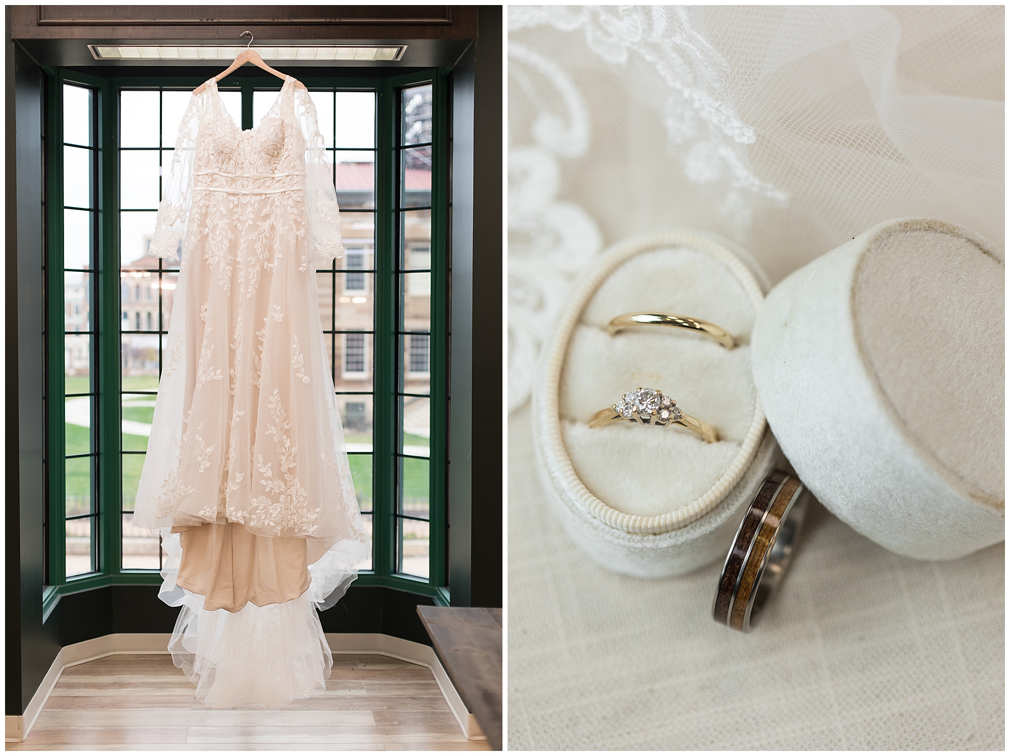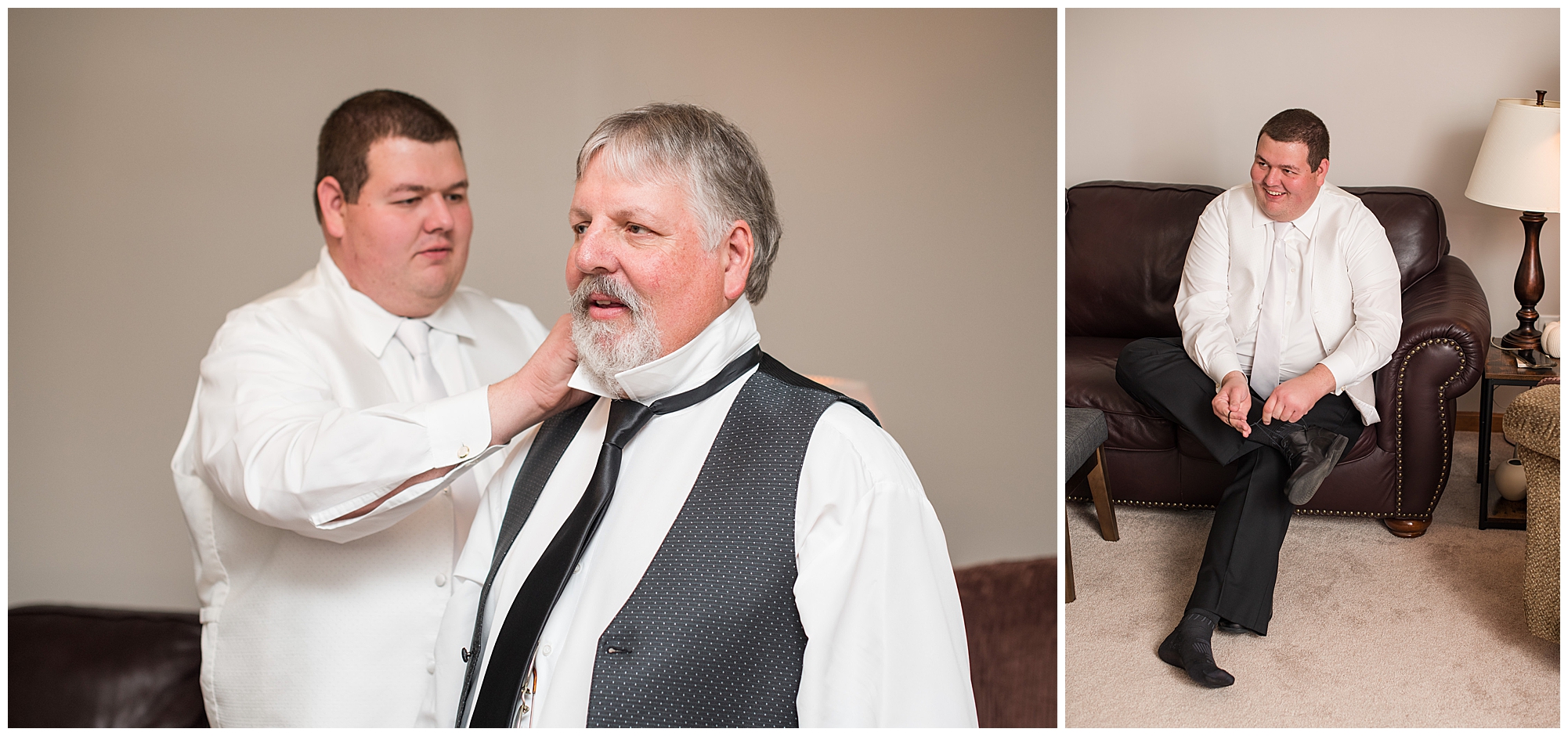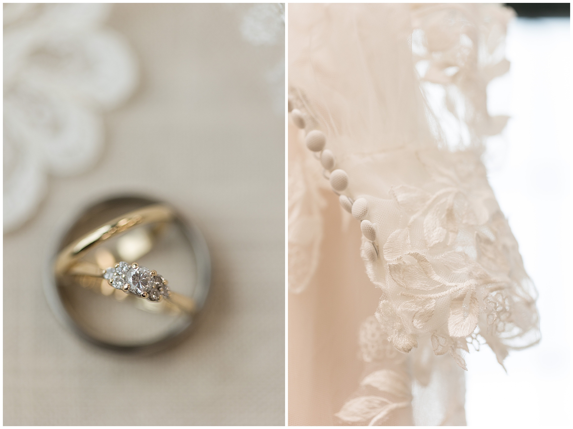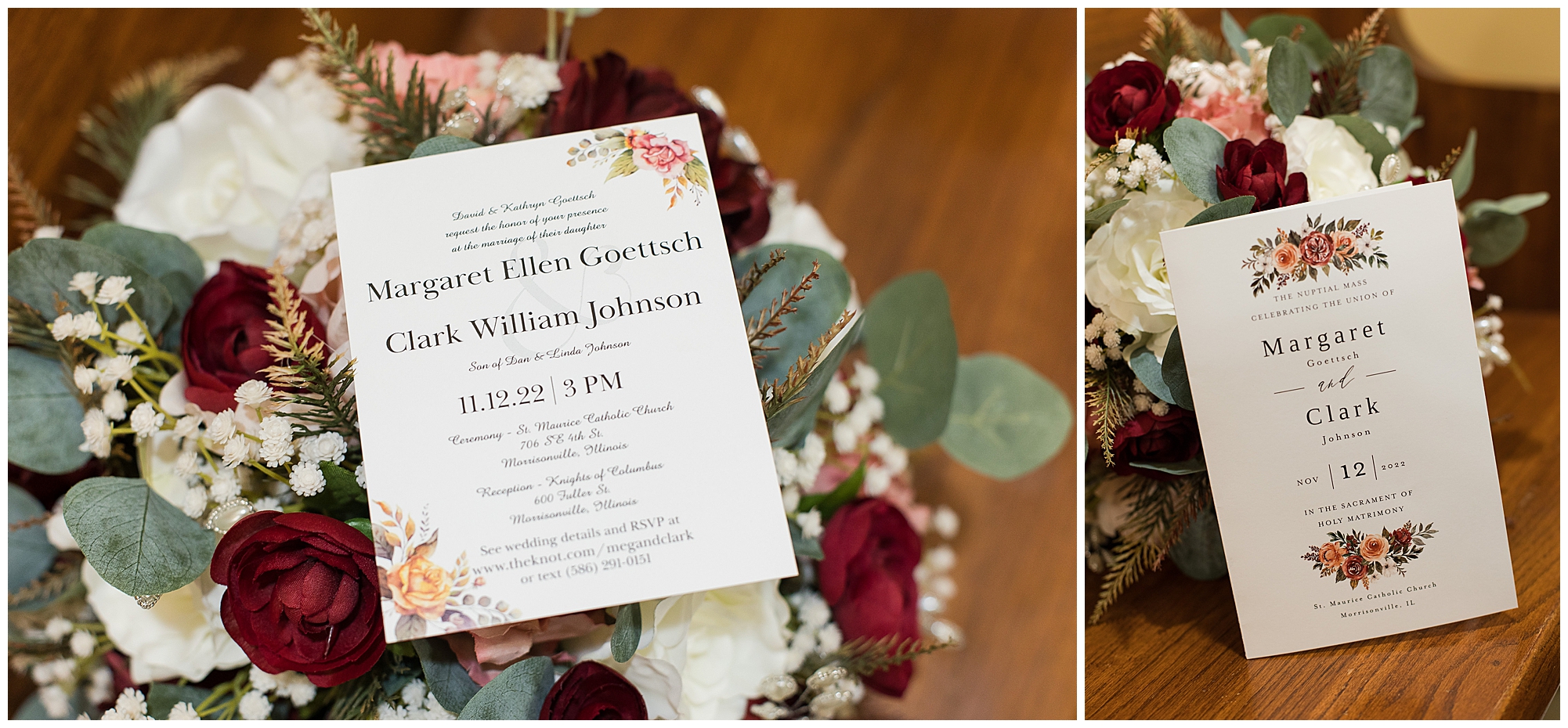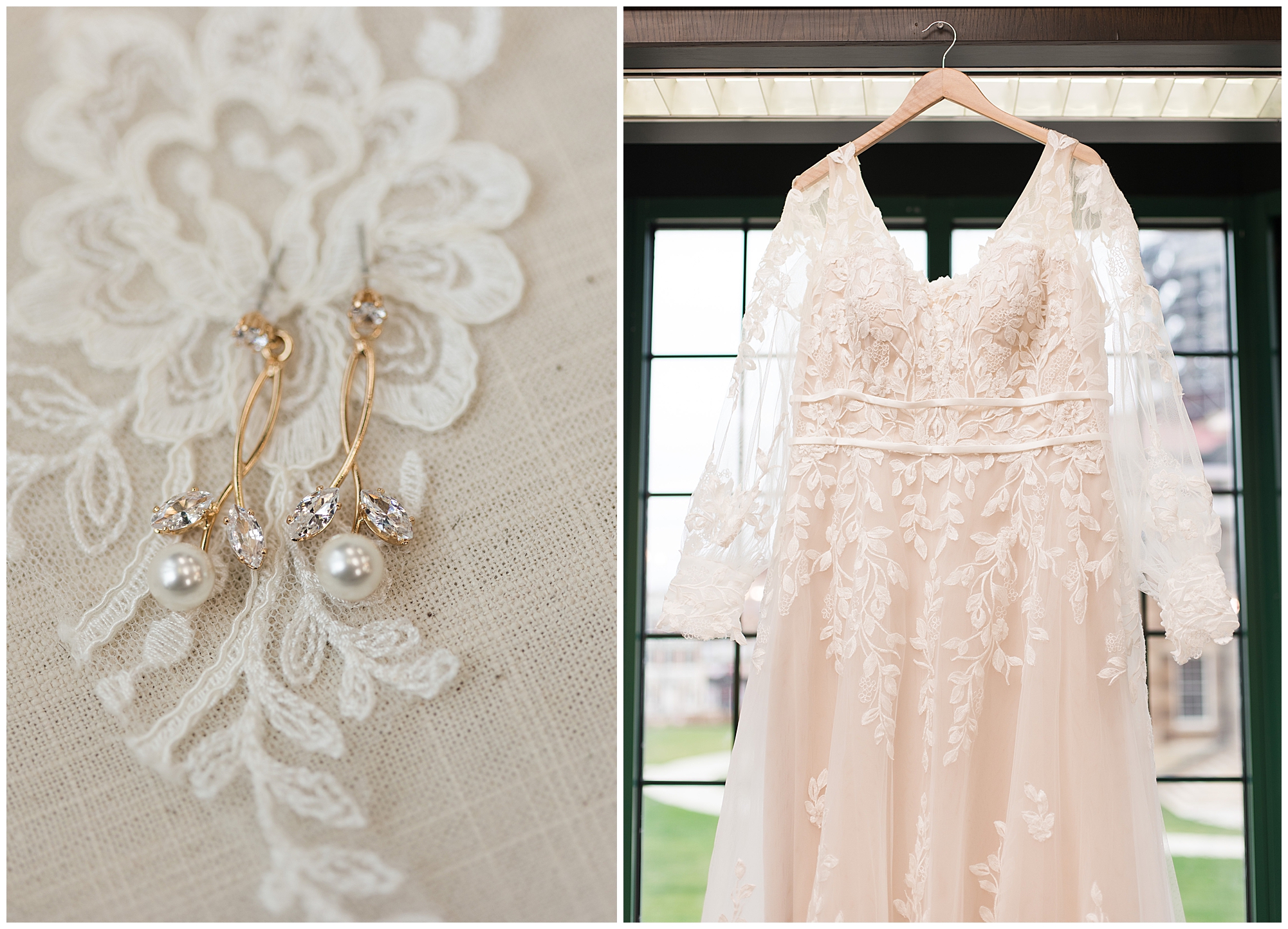 Meg and Clark’s late fall wedding in Morrisonville, Illinois was an incredible day of love, laughter, and beauty! Although the weather made for a chilly day, nothing could stop these two from having a good time with their loved ones as they tied the knot! The day started out with Meg and her ladies at the salon where they each were getting glammed up. This bride was all smiles and so exciting her and Clark’s day had finally arrived. And when I saw Meg step into her gown she was truly a vision! From the lovely lace floral touches, to the delicate ribbon waist, to the sheer sleeves Meg was absolutely stunning! And to top her look off, Meg wore her sister’s gorgeous cathedral length veil. Boy were we going to have fun with that!