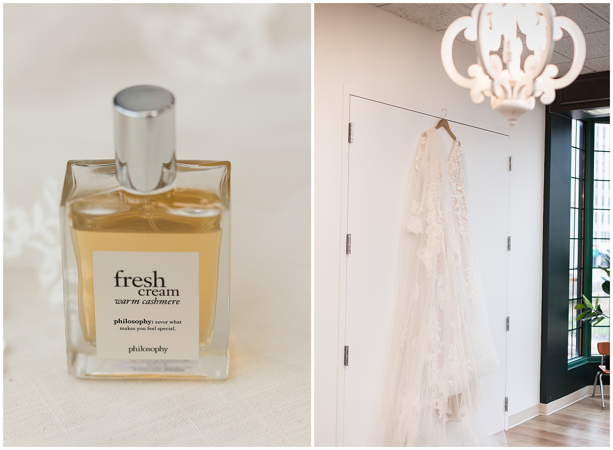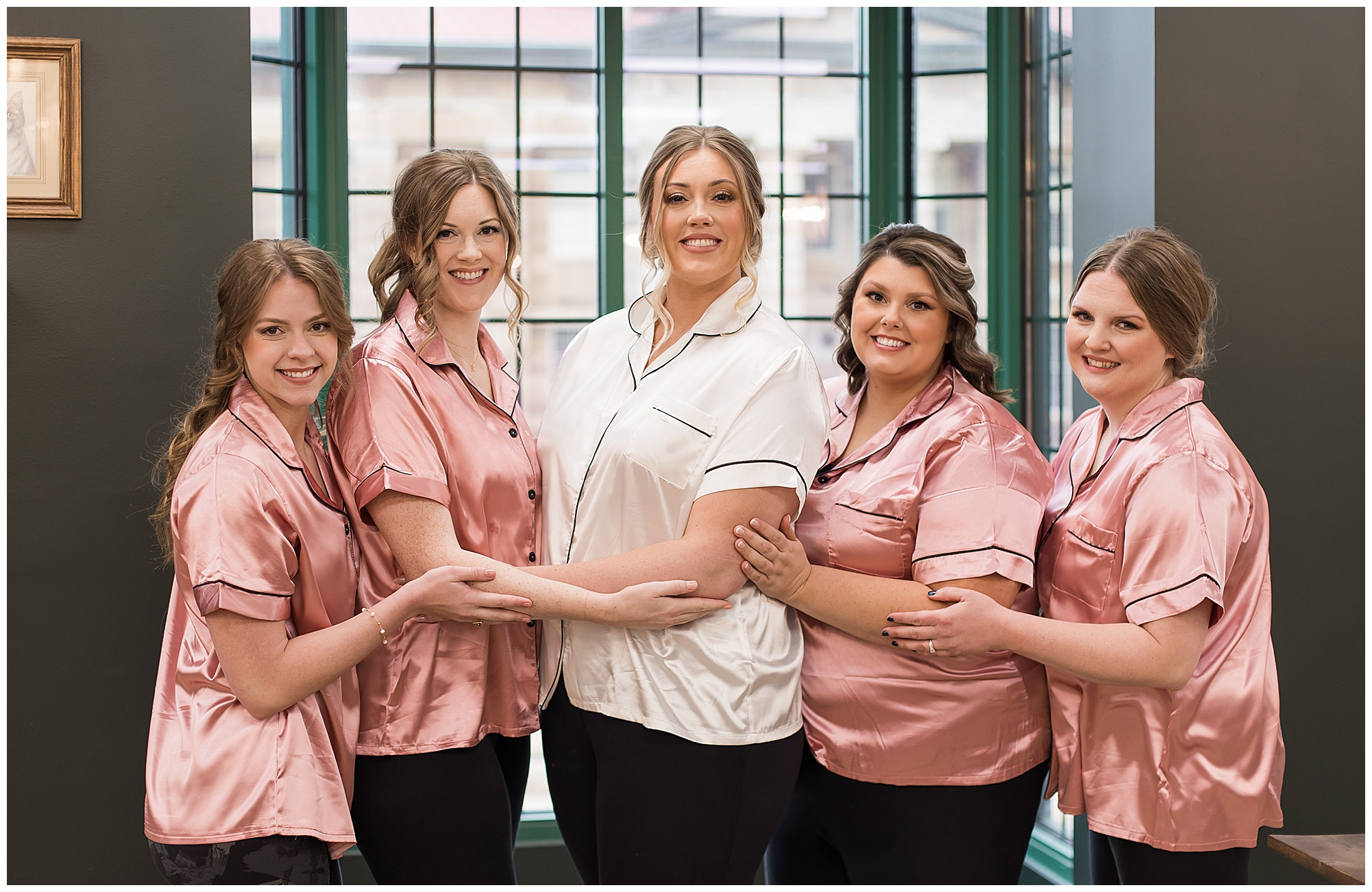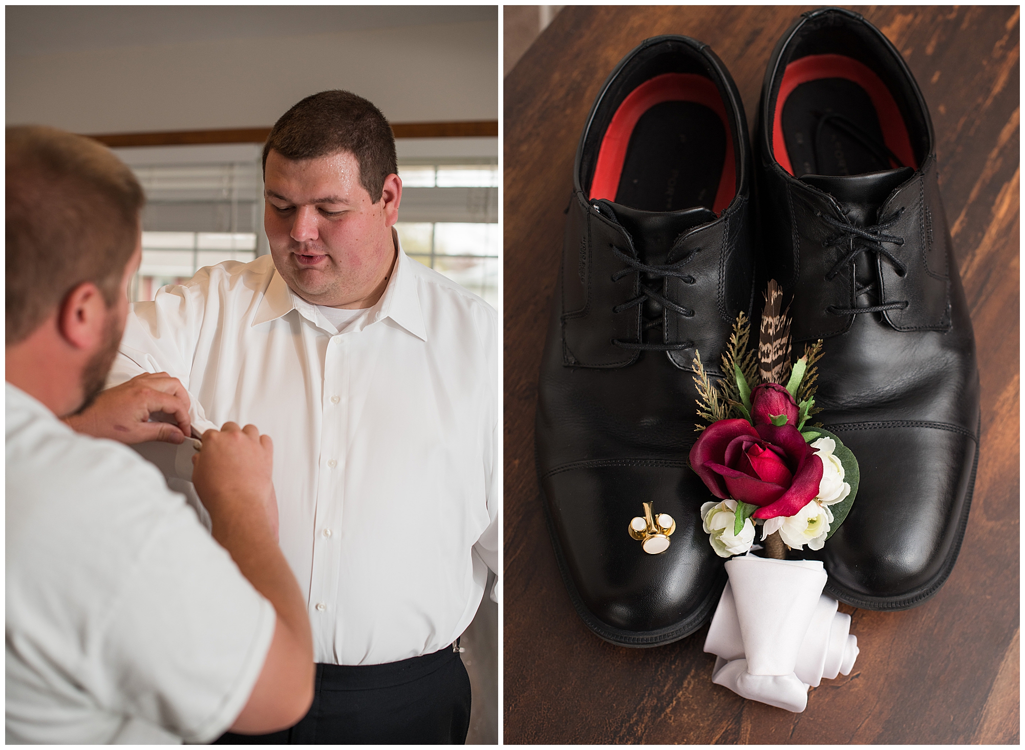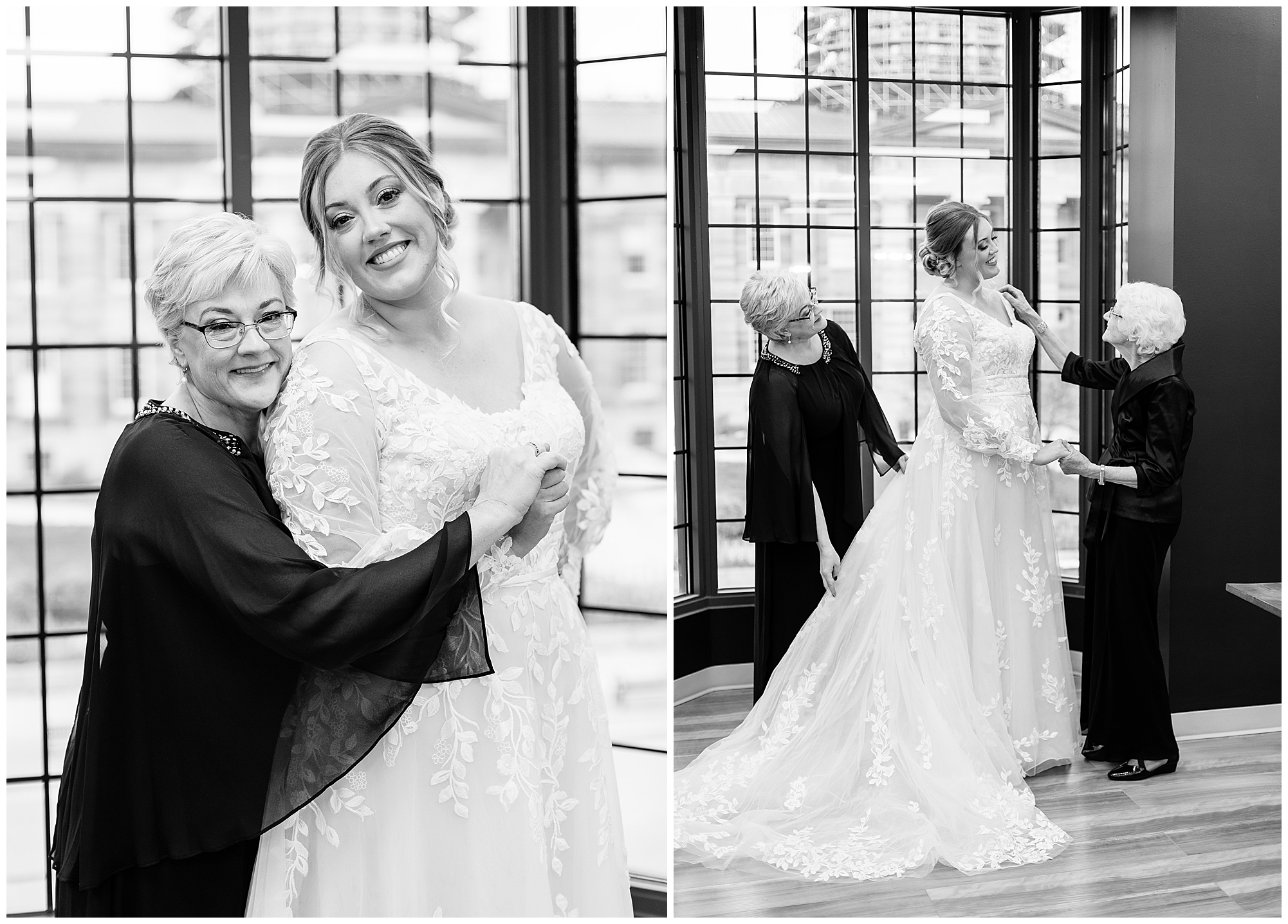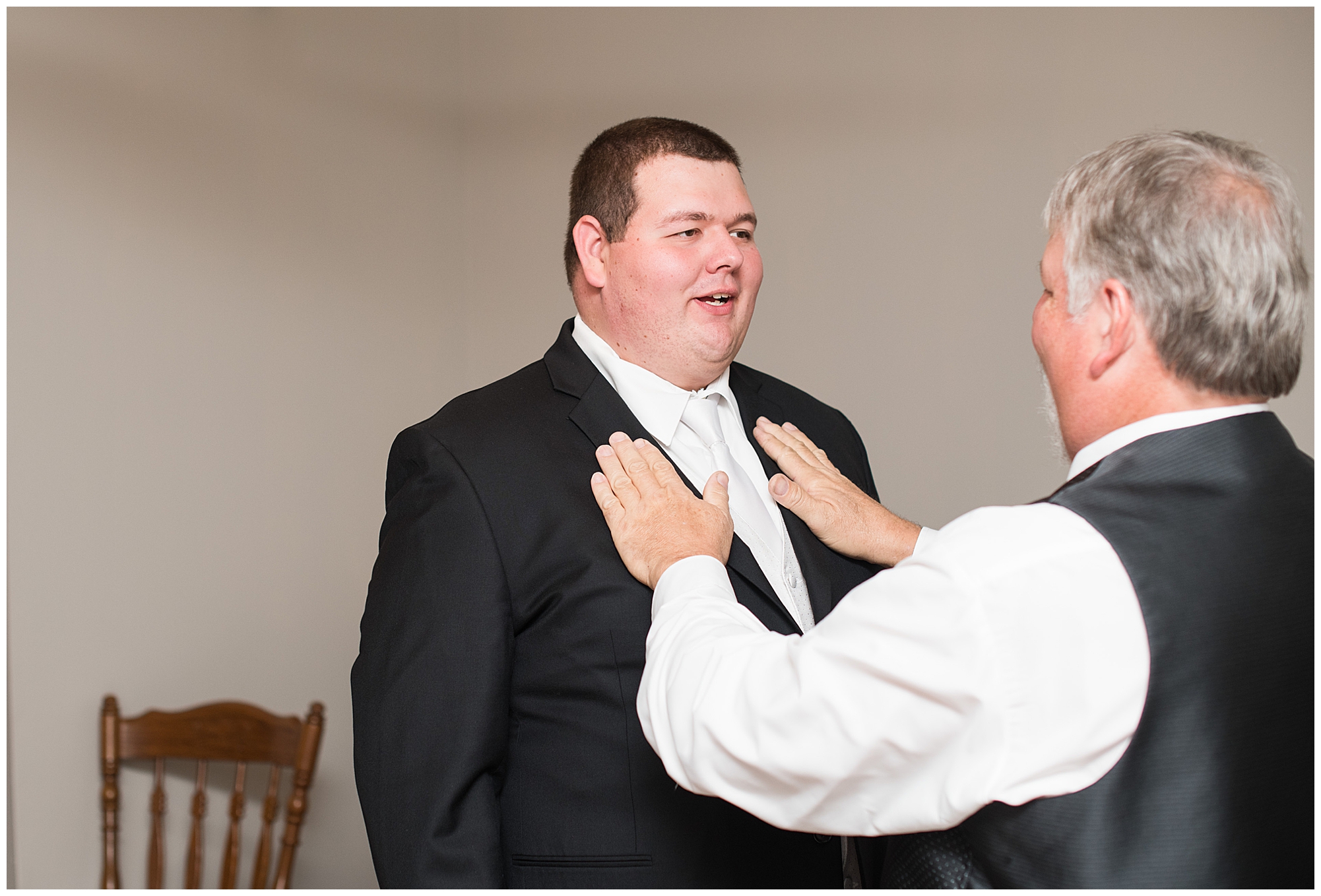 Meg and Clark’s late fall wedding in Morrisonville, Illinois was an incredible day of love, laughter, and beauty! Although the weather made for a chilly day, nothing could stop these two from having a good time with their loved ones as they tied the knot! The day started out with Meg and her ladies at the salon where they each were getting glammed up. This bride was all smiles and so exciting her and Clark’s day had finally arrived. And when I saw Meg step into her gown she was truly a vision! From the lovely lace floral touches, to the delicate ribbon waist, to the sheer sleeves Meg was absolutely stunning! And to top her look off, Meg wore her sister’s gorgeous cathedral length veil. Boy were we going to have fun with that!