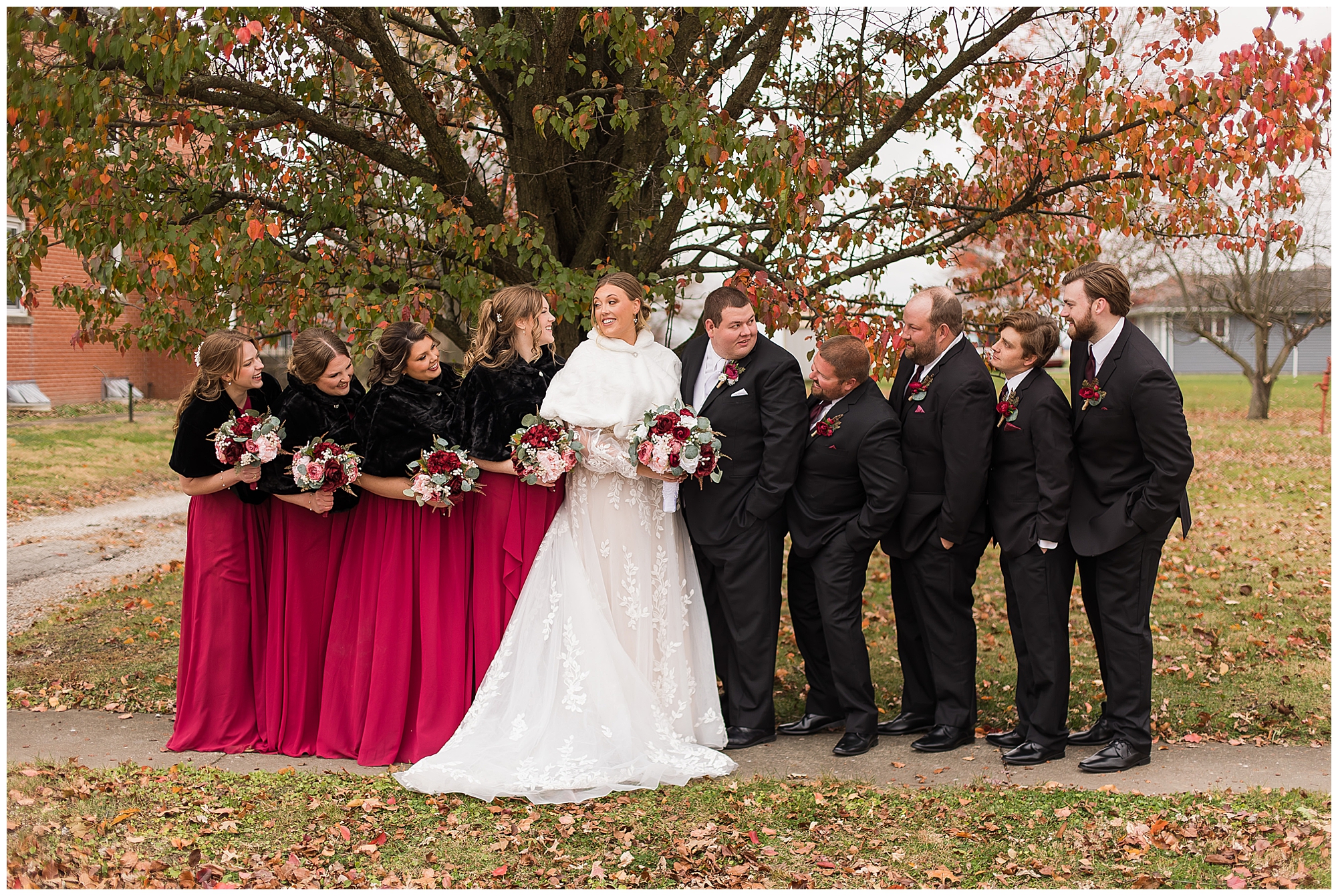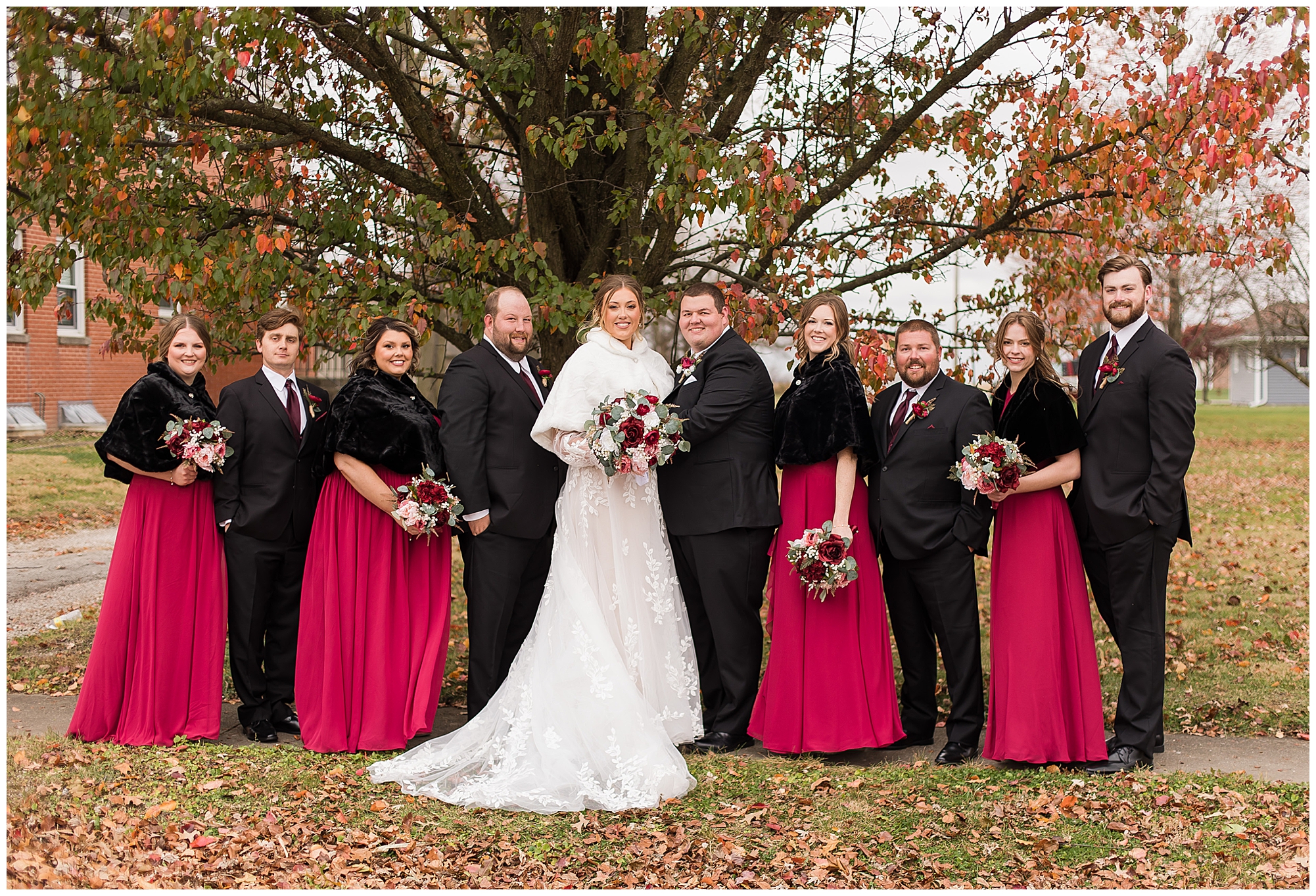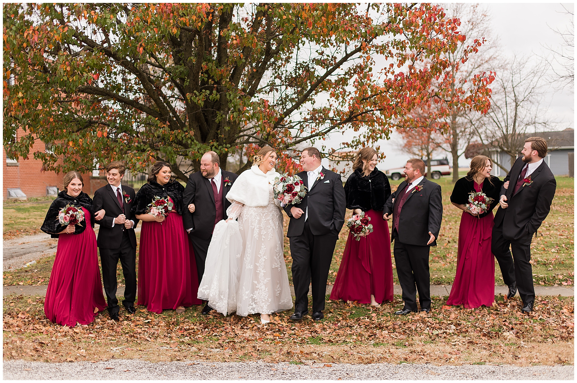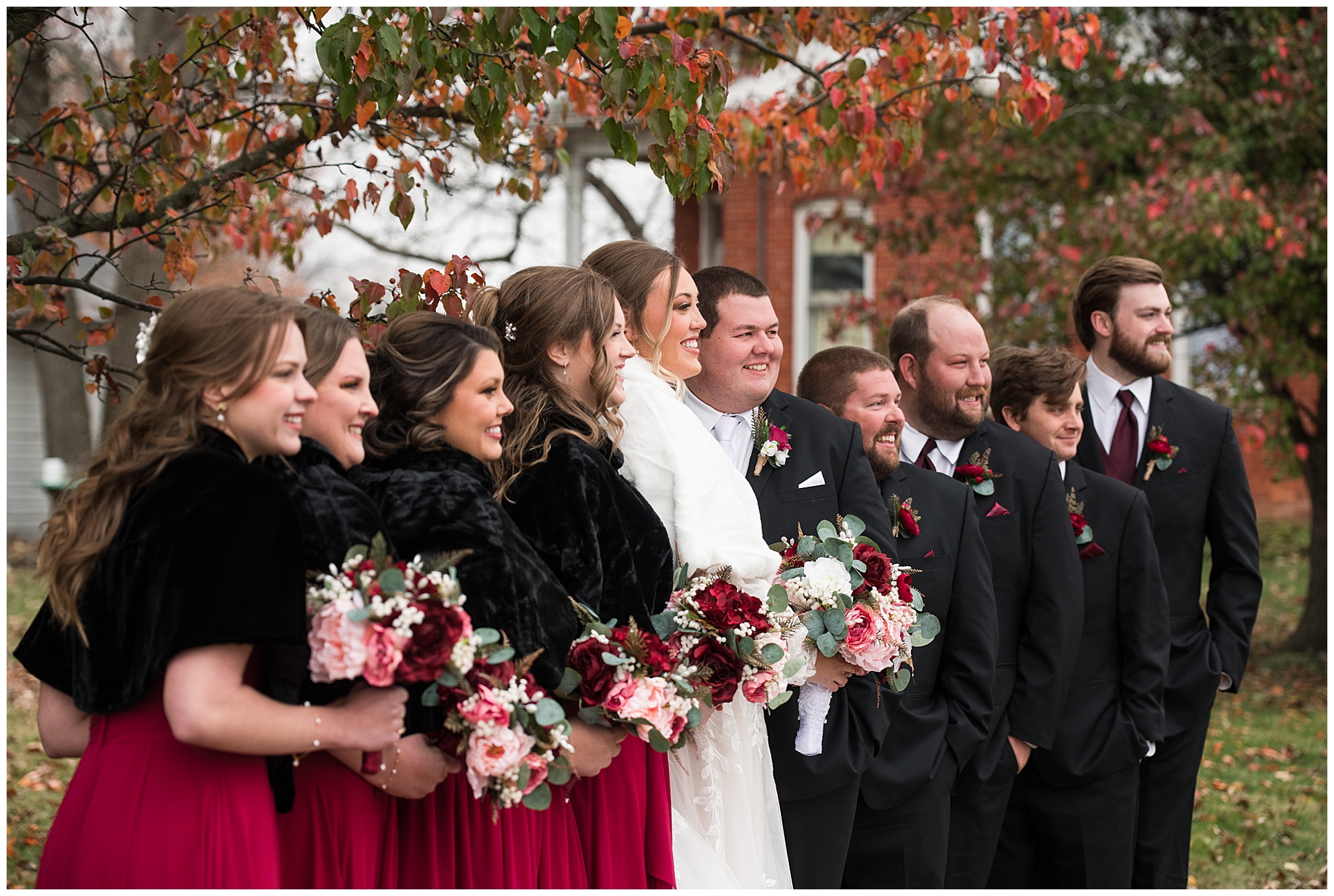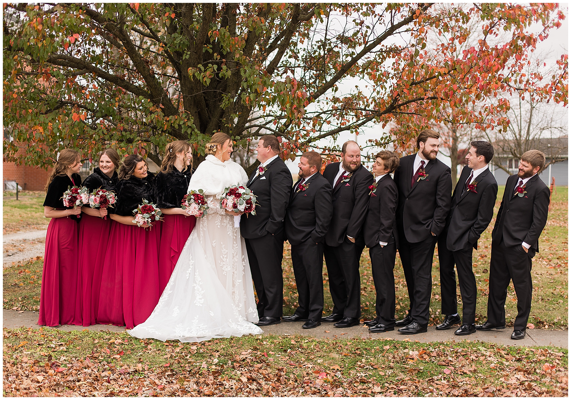 Meg and Clark were joined by their bridal party, who brought the fun despite the cold temps. The bridesmaids were in burgundy and draped with a black fur stole, while Meg had her own white fur to keep her warm. There were nothing but laughs throughout photo time with this crew. Clark had been in a wedding I photograph a couple years ago (Kim’s wedding, who was a beautiful bridesmaid on this day). And many of the groomsmen I recognized from Kim and Logan’s wedding as well as another LWP Couple, Erin and Jake, who made their appearance at the reception. I love getting to see past couples of mine at other weddings! After the bridal party photos were done it was time for Meg and Clark’s portraits. I know they were freezing, but this sweet couple were troopers and pushed through to get amazing photos under the one tree outside of the church that still had some fall colors! Then before we knew it the ceremony time was upon us.