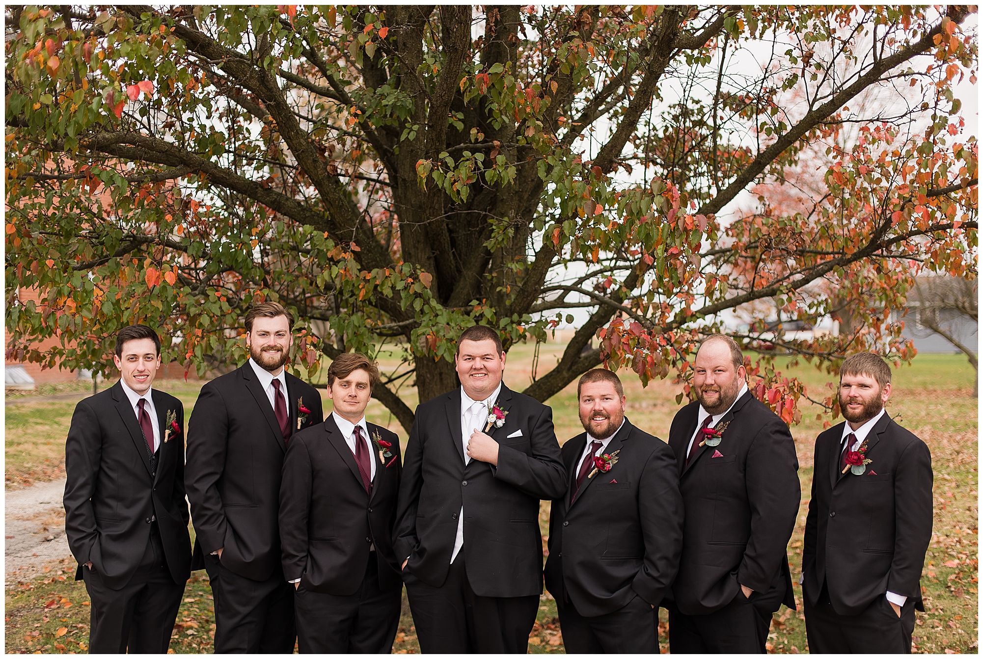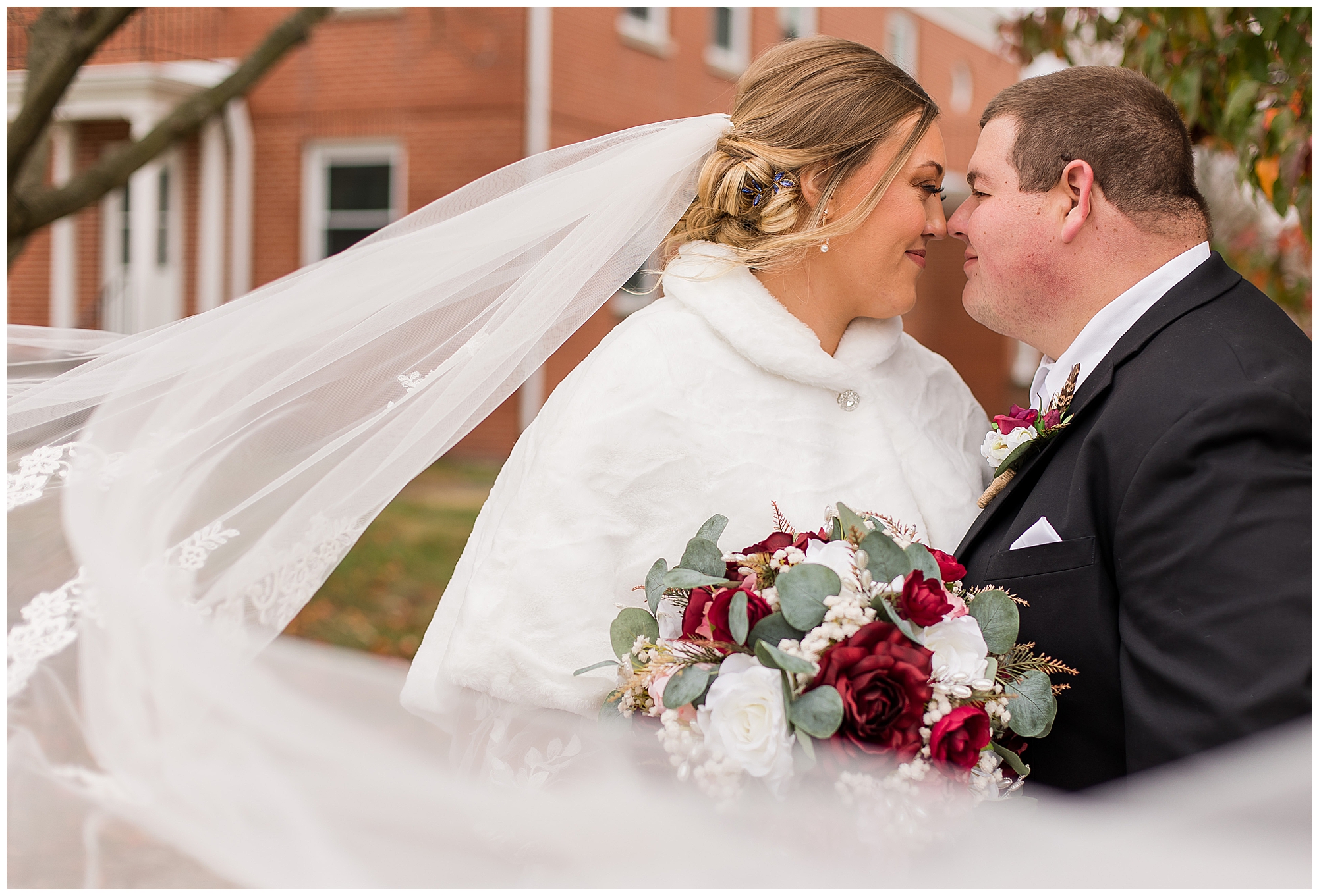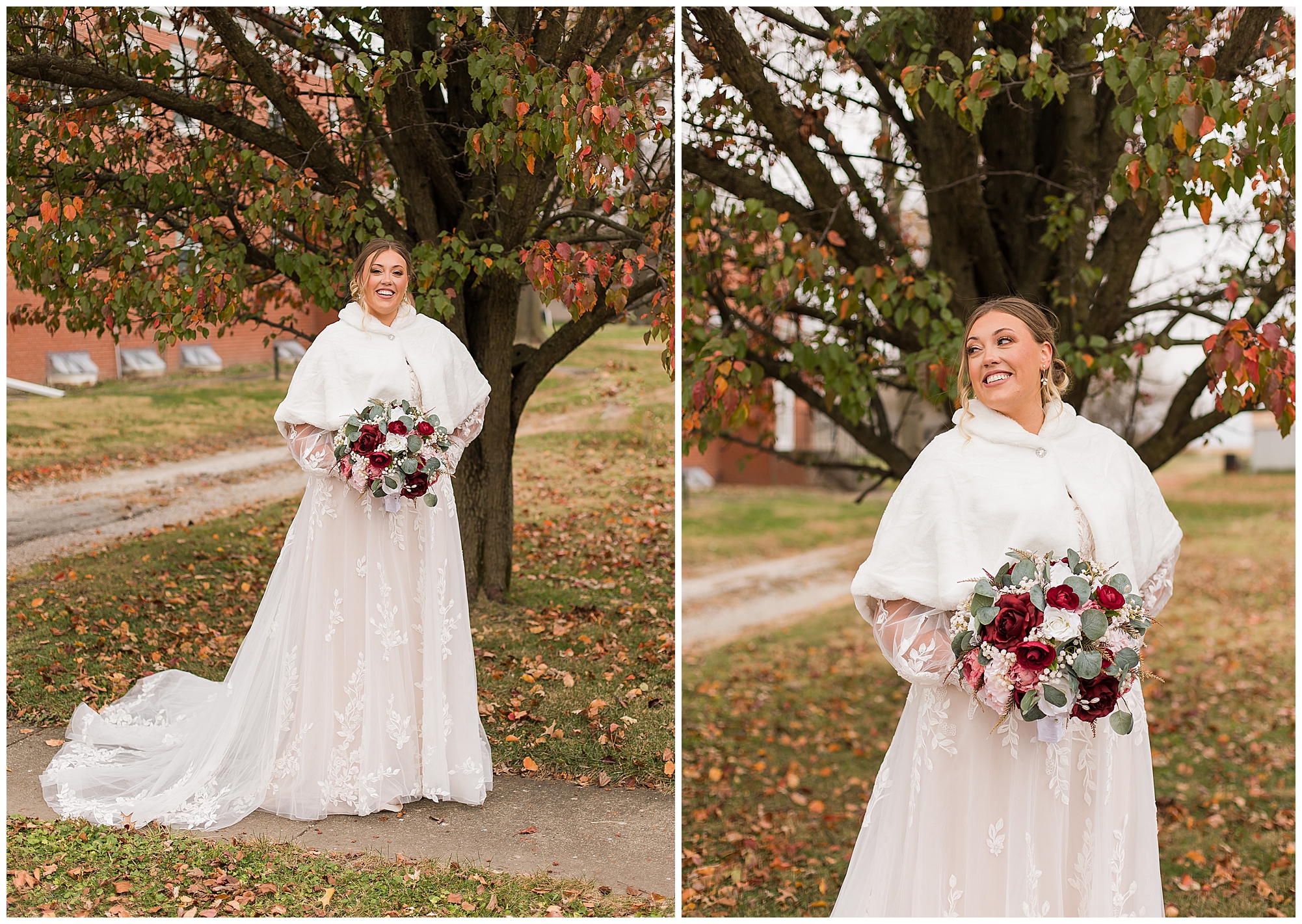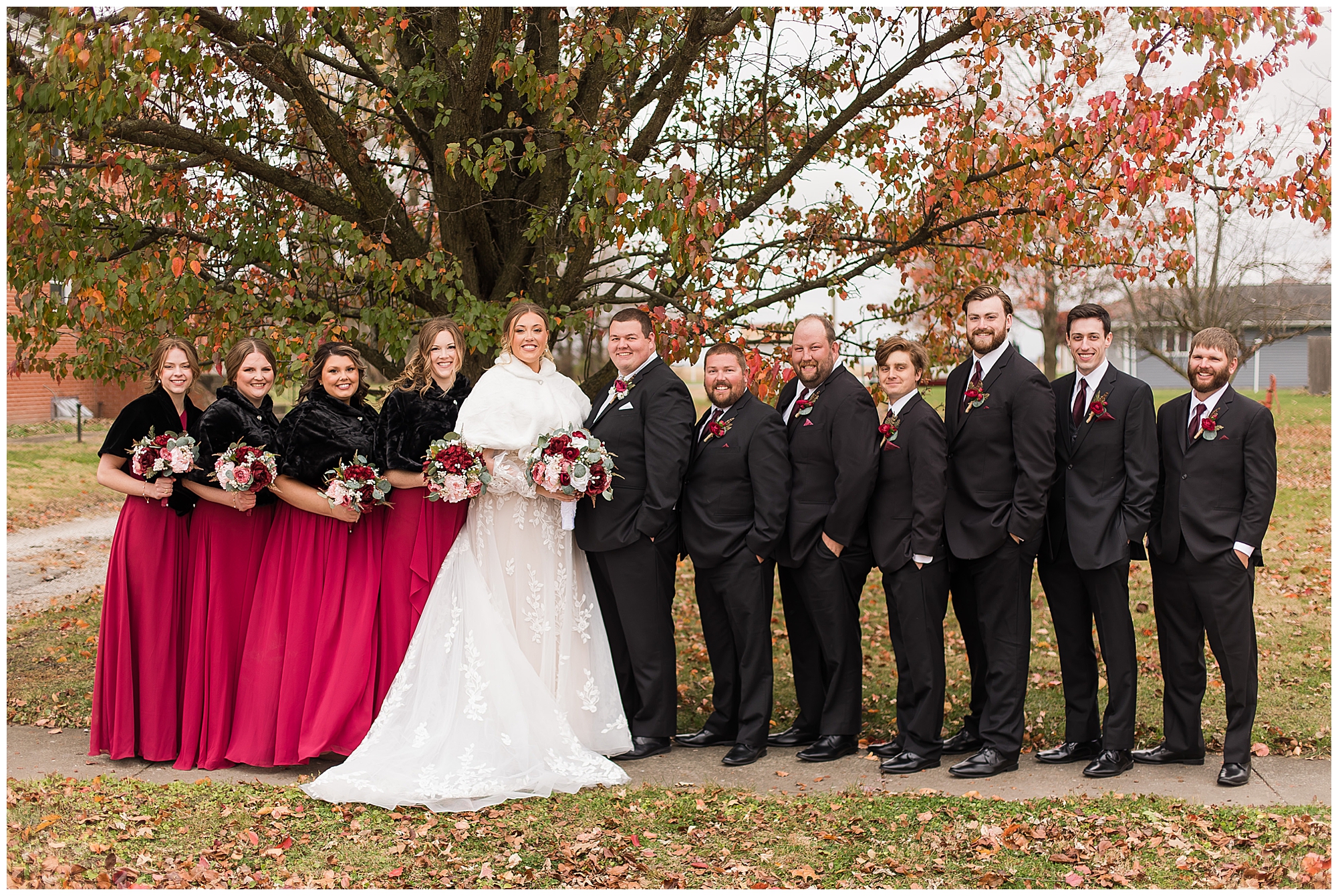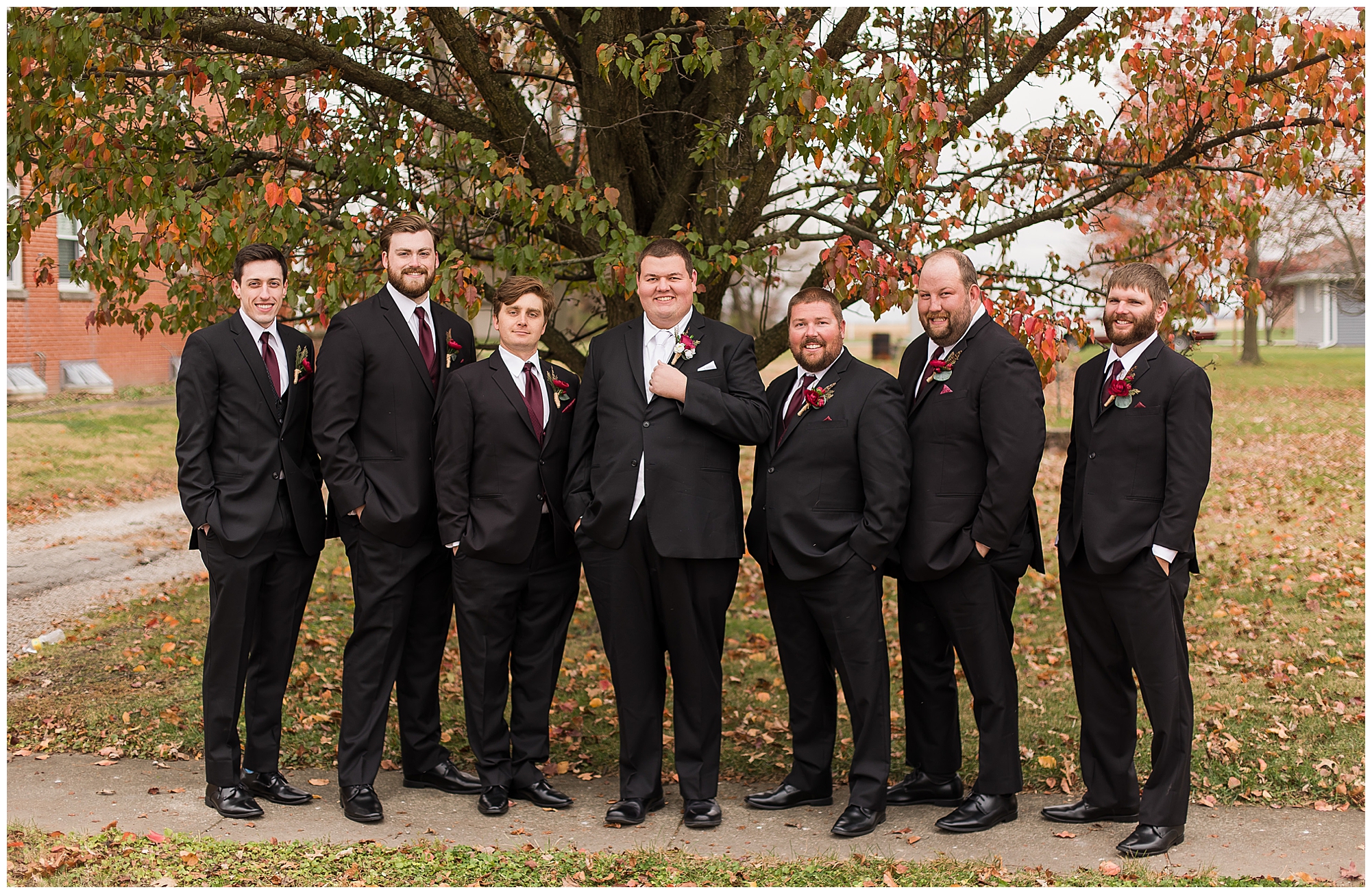 Meg and Clark were joined by their bridal party, who brought the fun despite the cold temps. The bridesmaids were in burgundy and draped with a black fur stole, while Meg had her own white fur to keep her warm. There were nothing but laughs throughout photo time with this crew. Clark had been in a wedding I photograph a couple years ago (Kim’s wedding, who was a beautiful bridesmaid on this day). And many of the groomsmen I recognized from Kim and Logan’s wedding as well as another LWP Couple, Erin and Jake, who made their appearance at the reception. I love getting to see past couples of mine at other weddings! After the bridal party photos were done it was time for Meg and Clark’s portraits. I know they were freezing, but this sweet couple were troopers and pushed through to get amazing photos under the one tree outside of the church that still had some fall colors! Then before we knew it the ceremony time was upon us.
