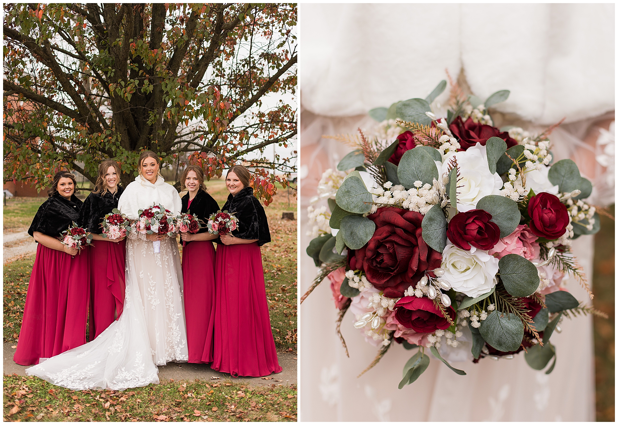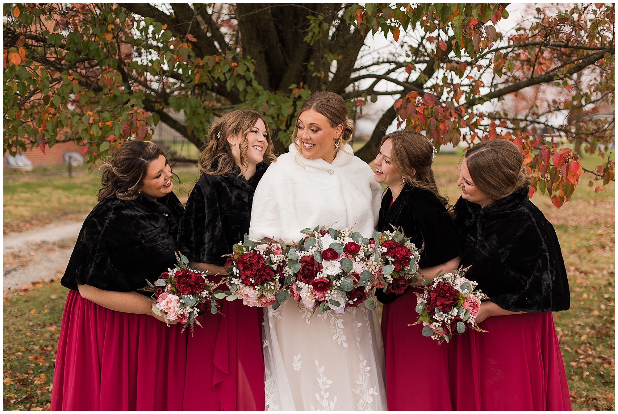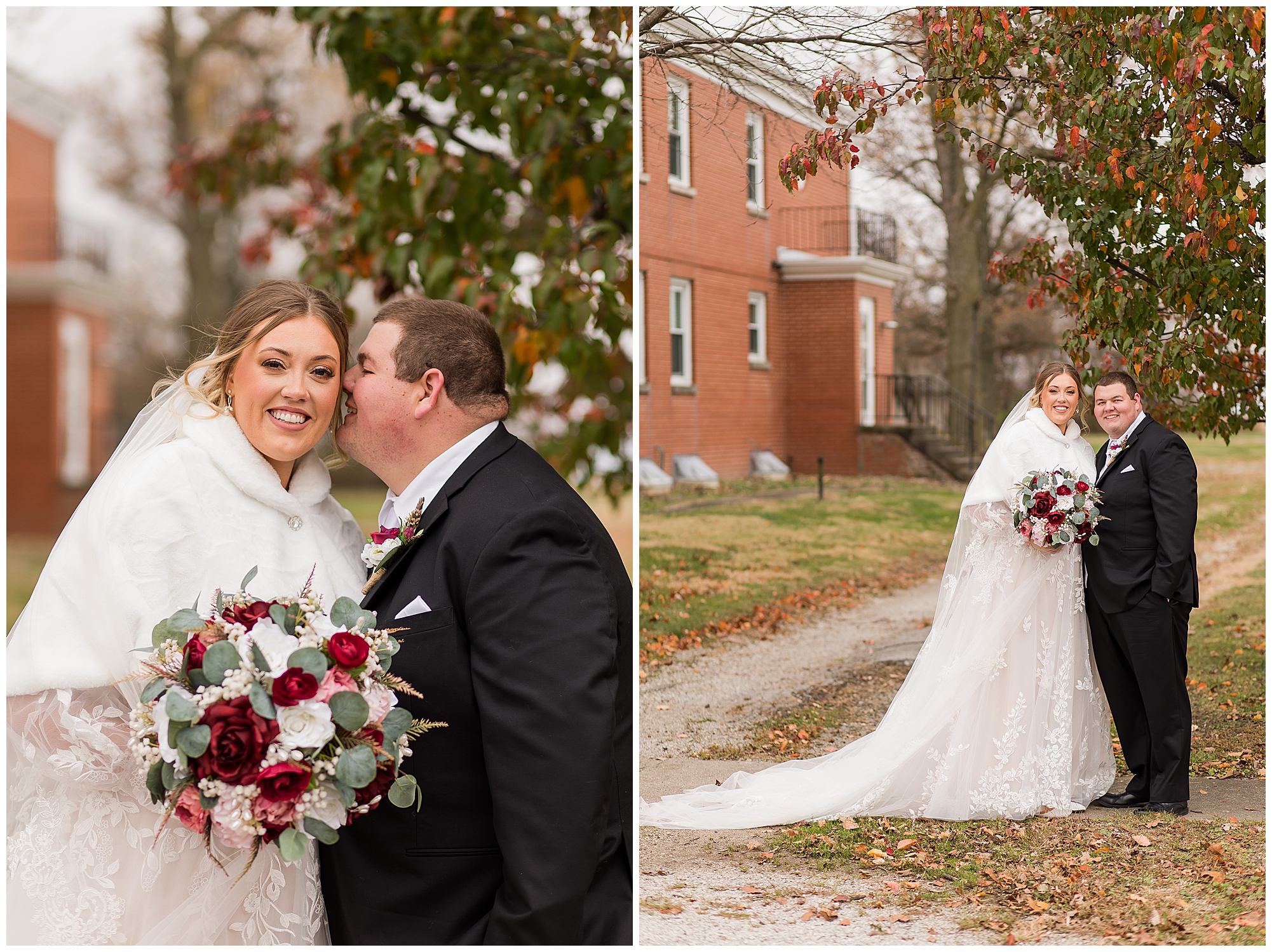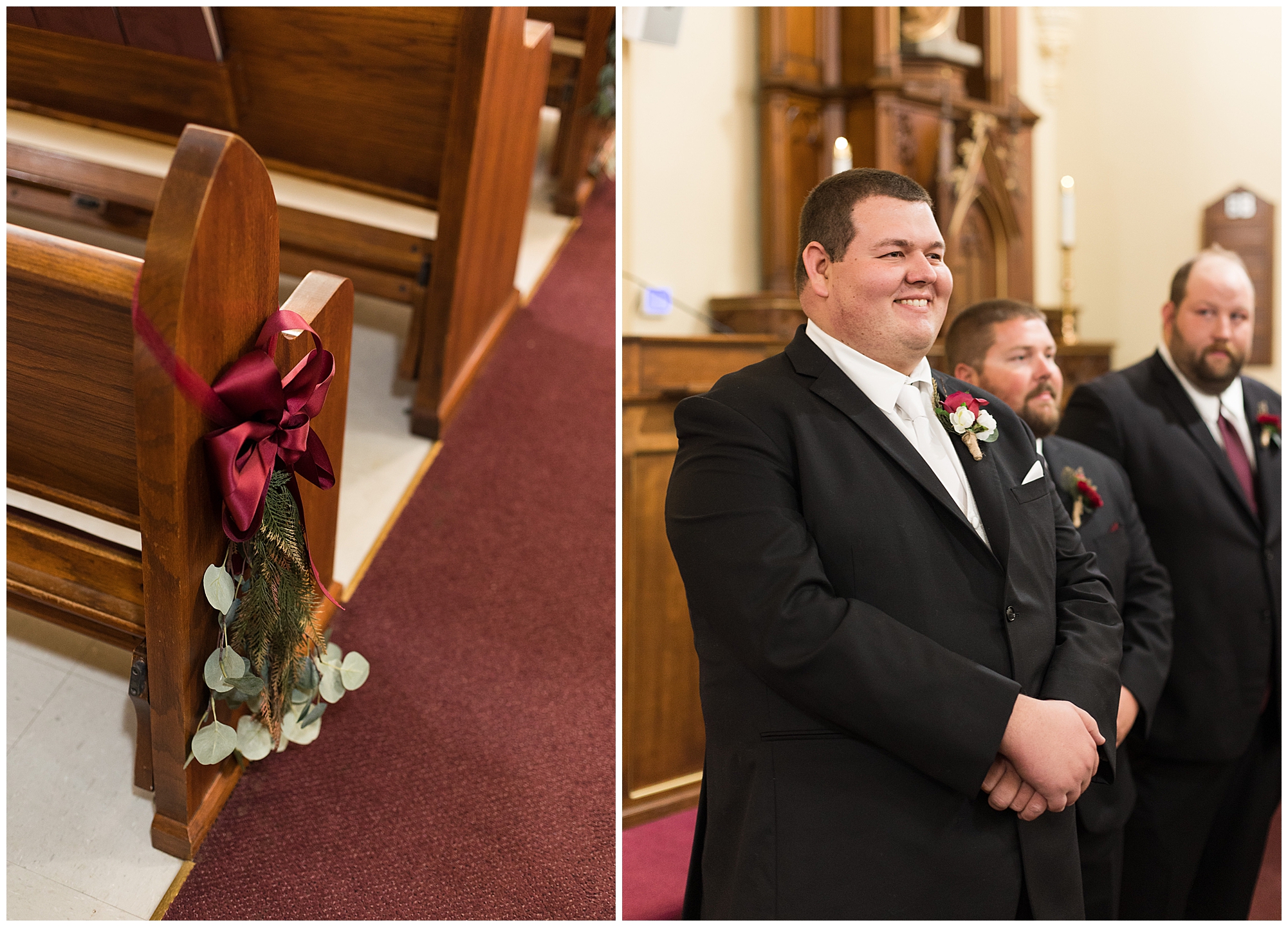 Meg and Clark were joined by their bridal party, who brought the fun despite the cold temps. The bridesmaids were in burgundy and draped with a black fur stole, while Meg had her own white fur to keep her warm. There were nothing but laughs throughout photo time with this crew. Clark had been in a wedding I photograph a couple years ago (Kim’s wedding, who was a beautiful bridesmaid on this day). And many of the groomsmen I recognized from Kim and Logan’s wedding as well as another LWP Couple, Erin and Jake, who made their appearance at the reception. I love getting to see past couples of mine at other weddings! After the bridal party photos were done it was time for Meg and Clark’s portraits. I know they were freezing, but this sweet couple were troopers and pushed through to get amazing photos under the one tree outside of the church that still had some fall colors! Then before we knew it the ceremony time was upon us.