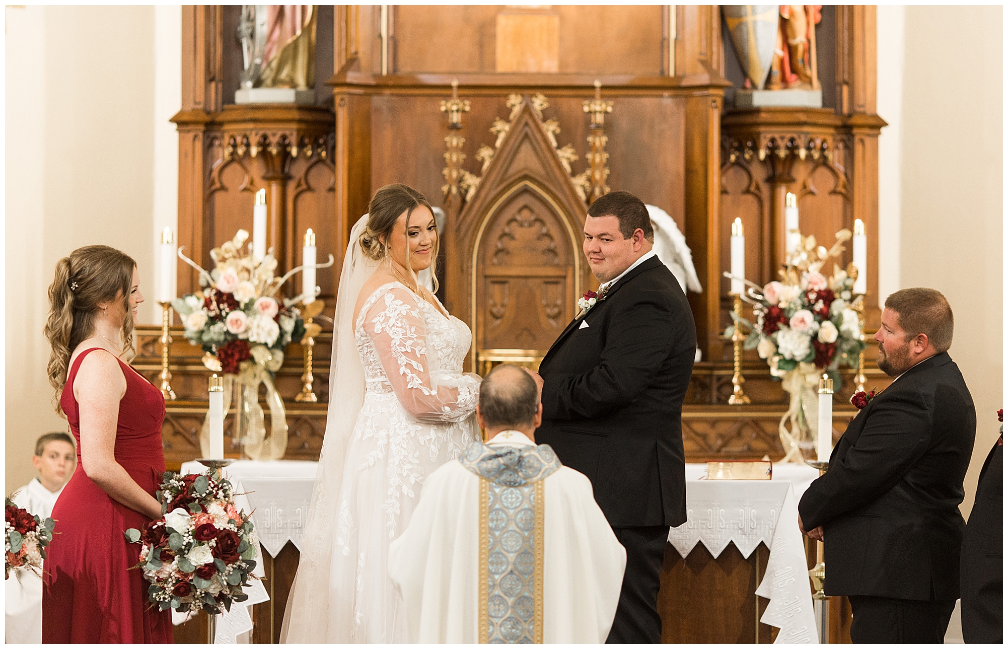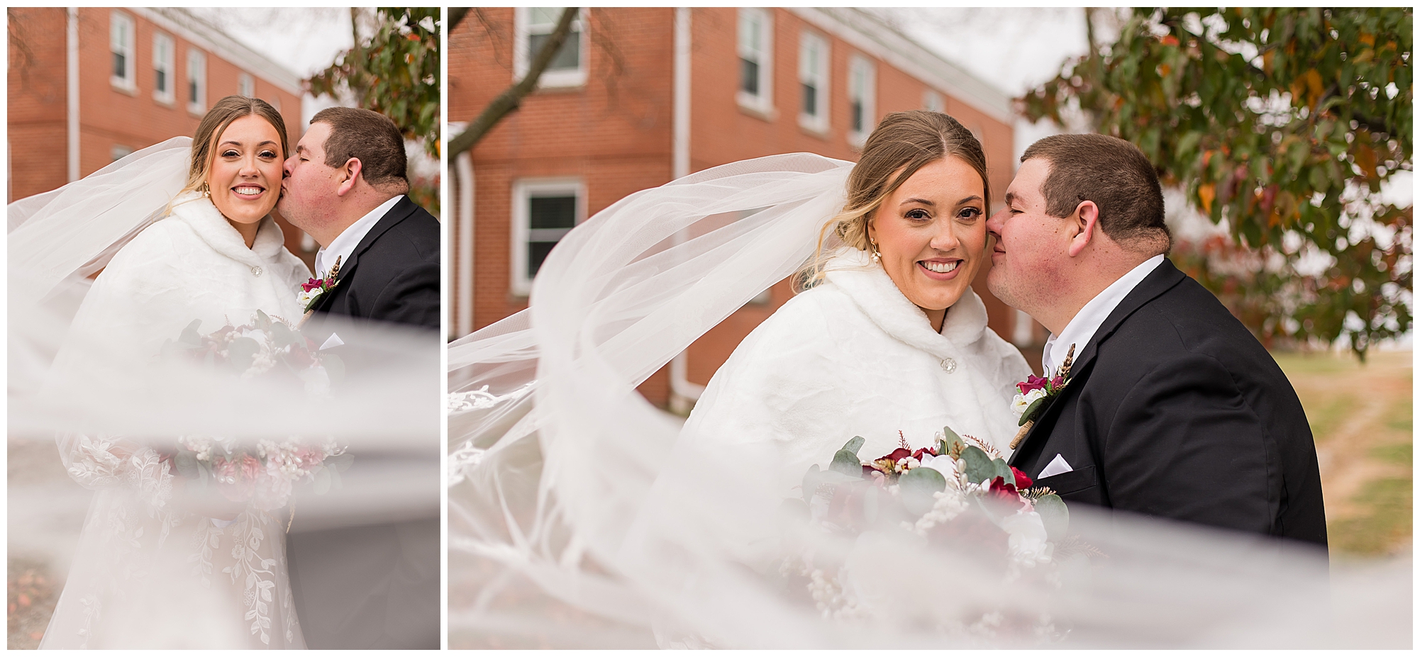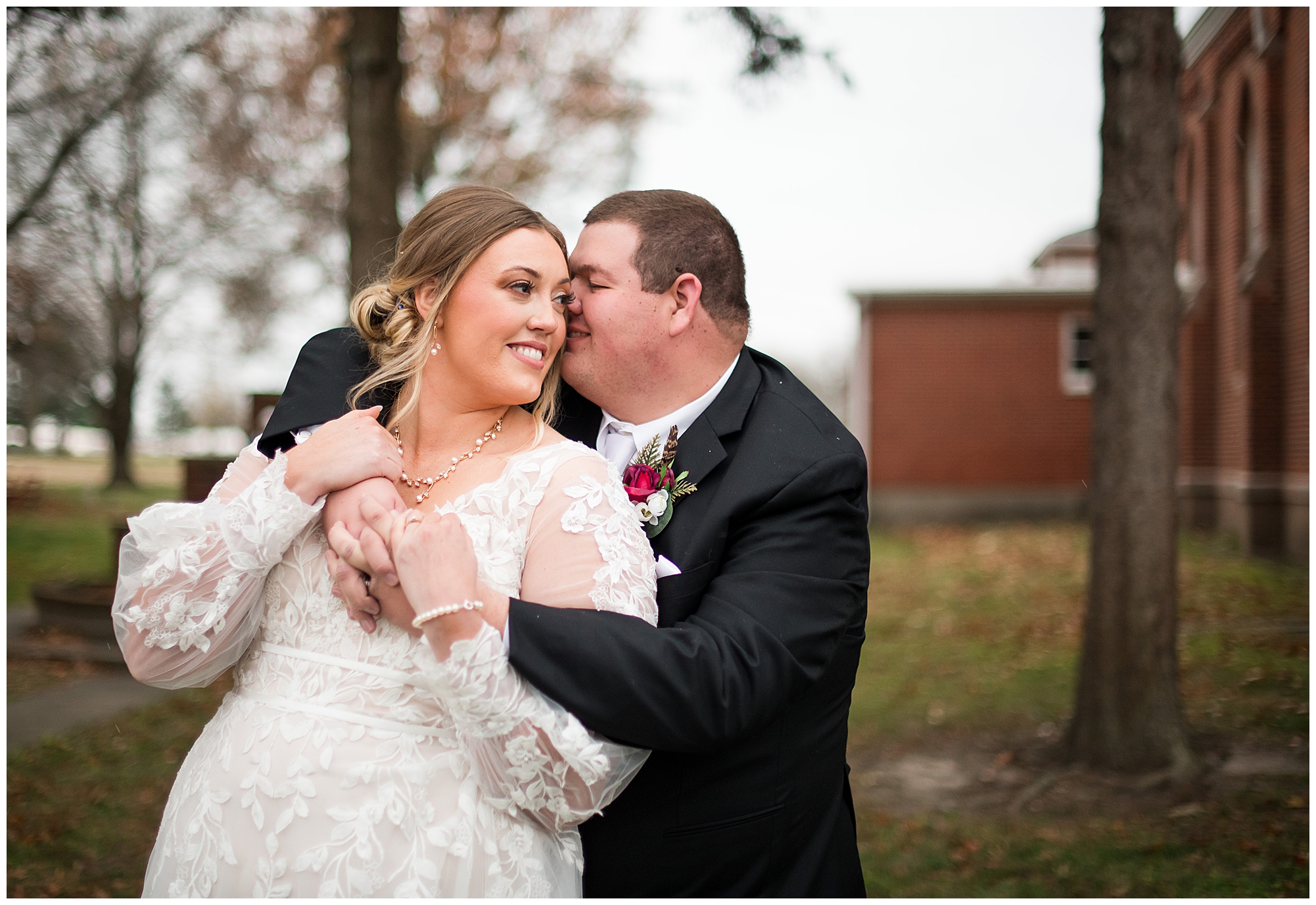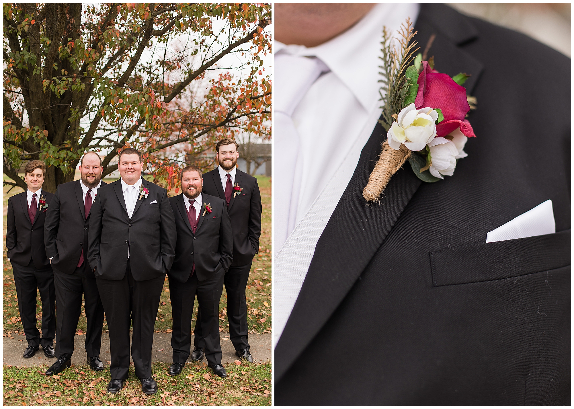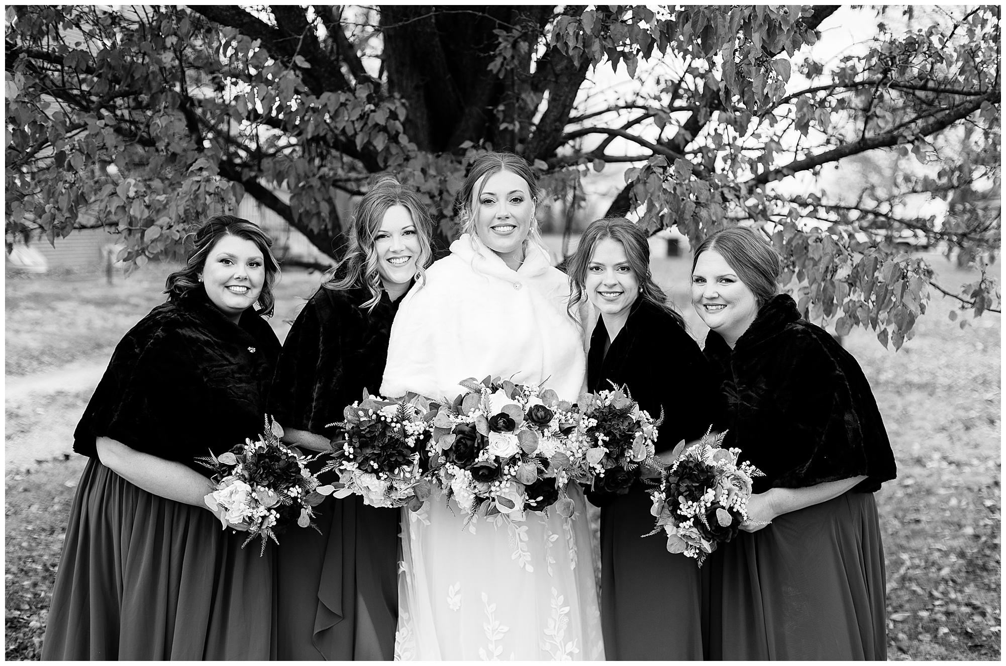 Meg and Clark were joined by their bridal party, who brought the fun despite the cold temps. The bridesmaids were in burgundy and draped with a black fur stole, while Meg had her own white fur to keep her warm. There were nothing but laughs throughout photo time with this crew. Clark had been in a wedding I photograph a couple years ago (Kim’s wedding, who was a beautiful bridesmaid on this day). And many of the groomsmen I recognized from Kim and Logan’s wedding as well as another LWP Couple, Erin and Jake, who made their appearance at the reception. I love getting to see past couples of mine at other weddings! After the bridal party photos were done it was time for Meg and Clark’s portraits. I know they were freezing, but this sweet couple were troopers and pushed through to get amazing photos under the one tree outside of the church that still had some fall colors! Then before we knew it the ceremony time was upon us.