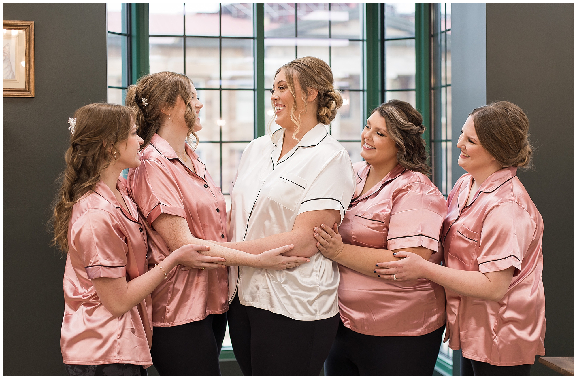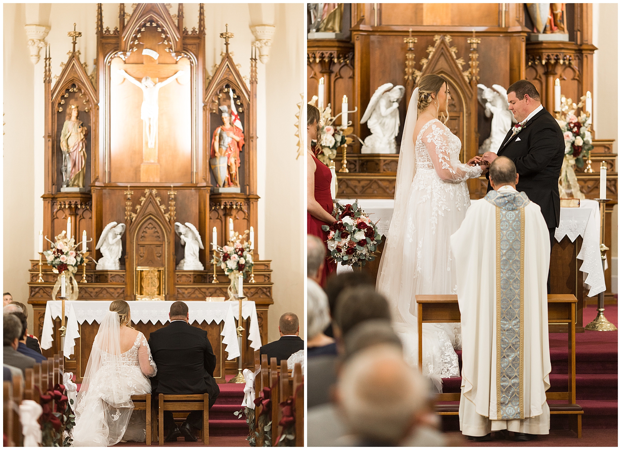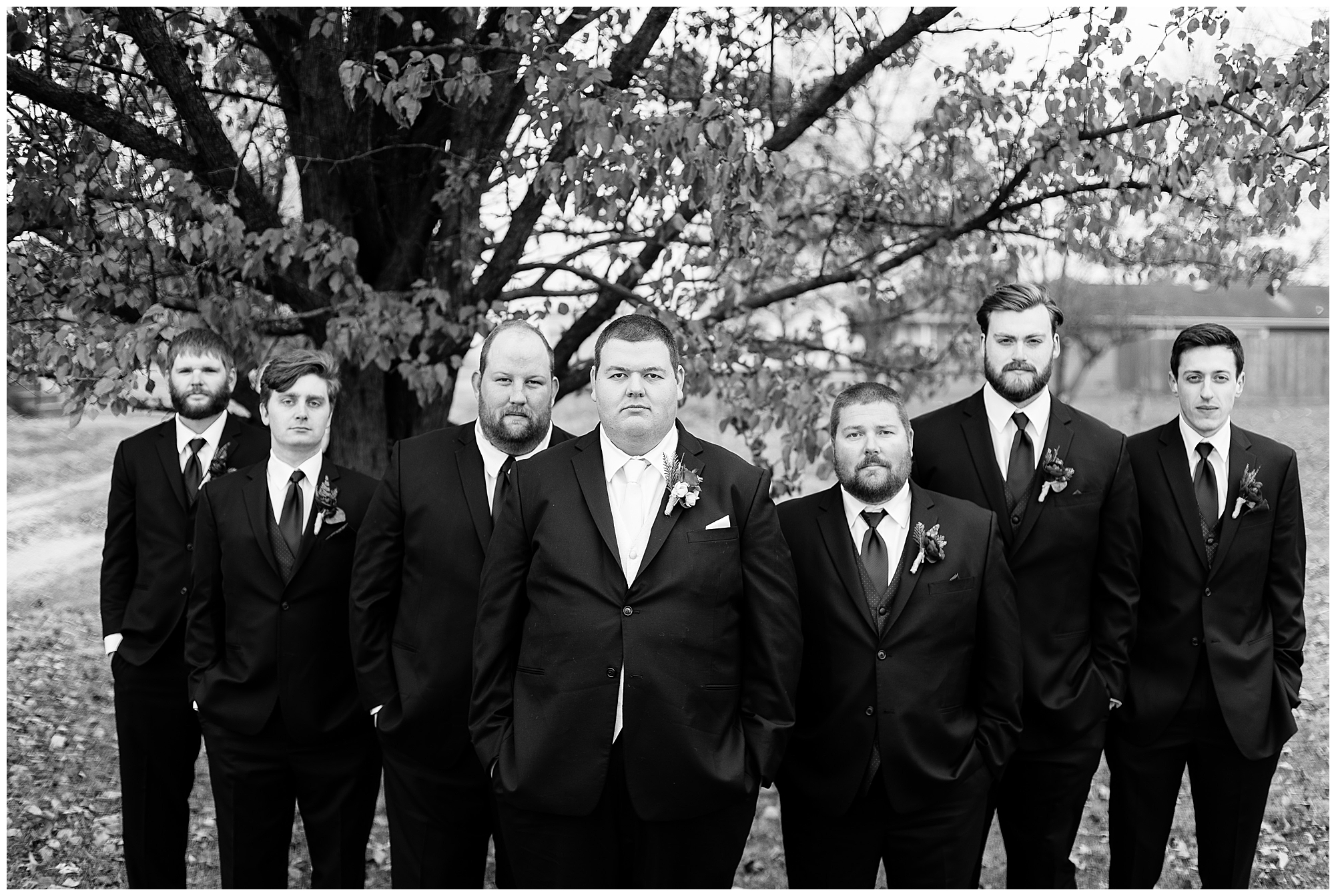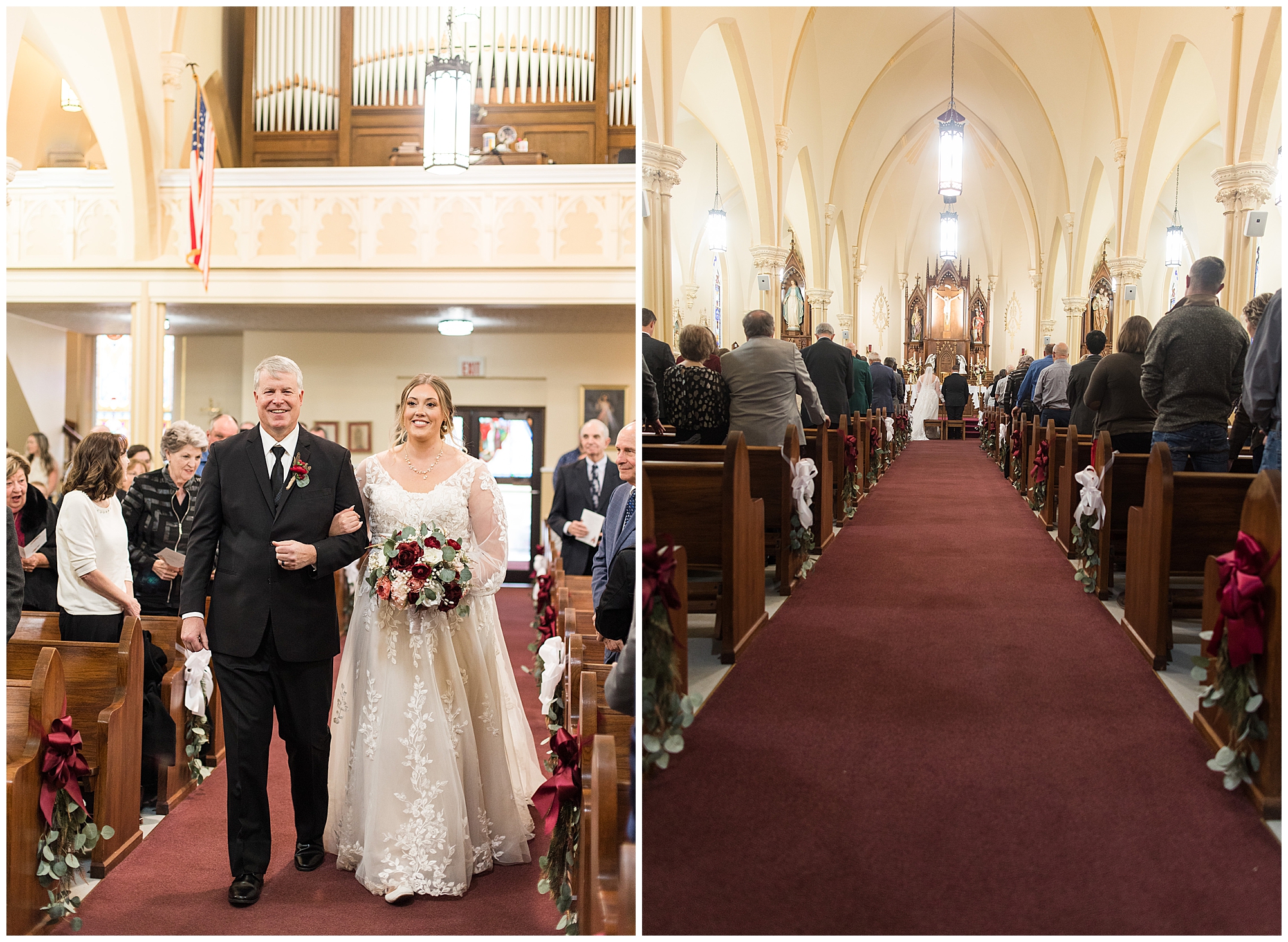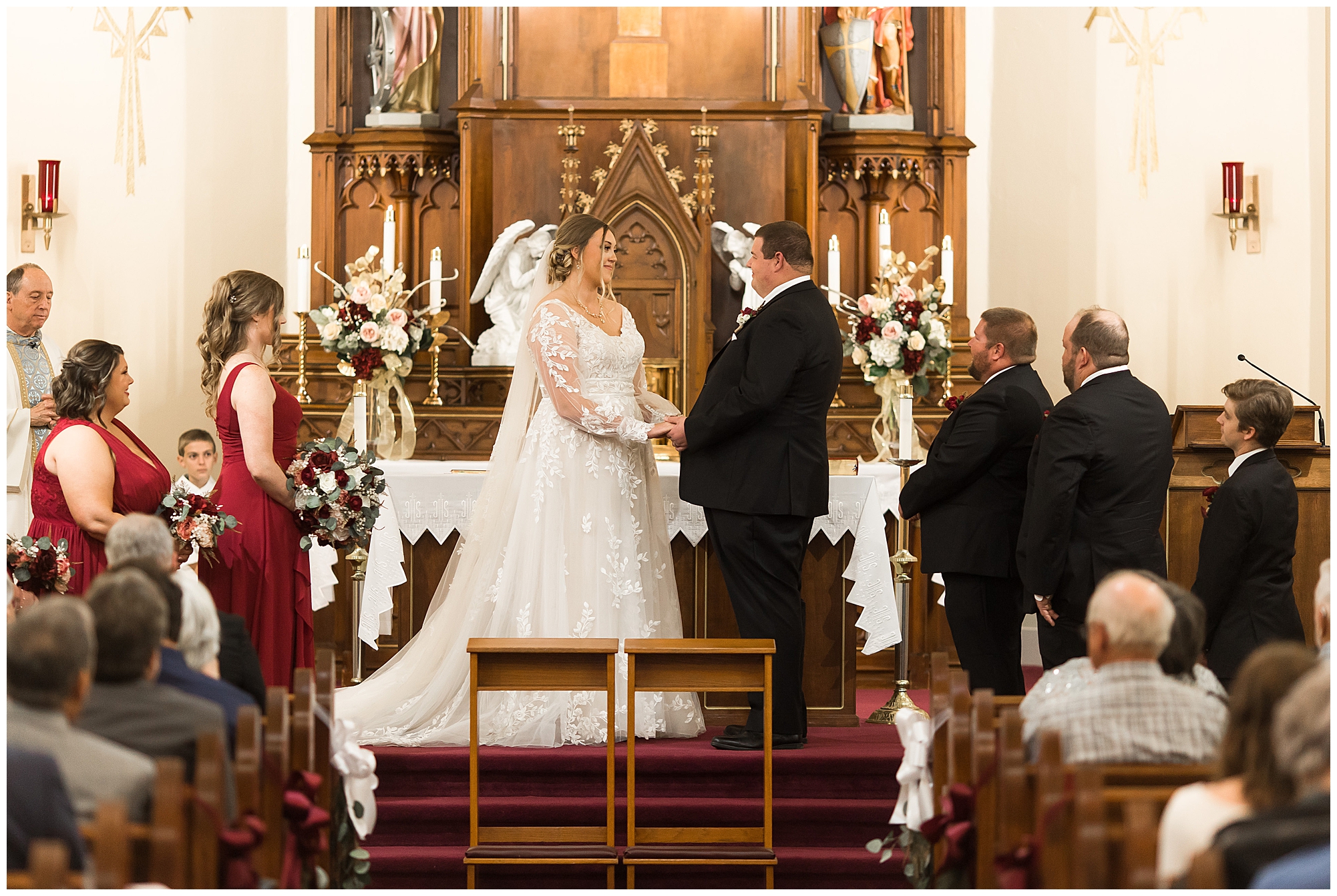 Meg and Clark were joined by their bridal party, who brought the fun despite the cold temps. The bridesmaids were in burgundy and draped with a black fur stole, while Meg had her own white fur to keep her warm. There were nothing but laughs throughout photo time with this crew. Clark had been in a wedding I photograph a couple years ago (Kim’s wedding, who was a beautiful bridesmaid on this day). And many of the groomsmen I recognized from Kim and Logan’s wedding as well as another LWP Couple, Erin and Jake, who made their appearance at the reception. I love getting to see past couples of mine at other weddings! After the bridal party photos were done it was time for Meg and Clark’s portraits. I know they were freezing, but this sweet couple were troopers and pushed through to get amazing photos under the one tree outside of the church that still had some fall colors! Then before we knew it the ceremony time was upon us.