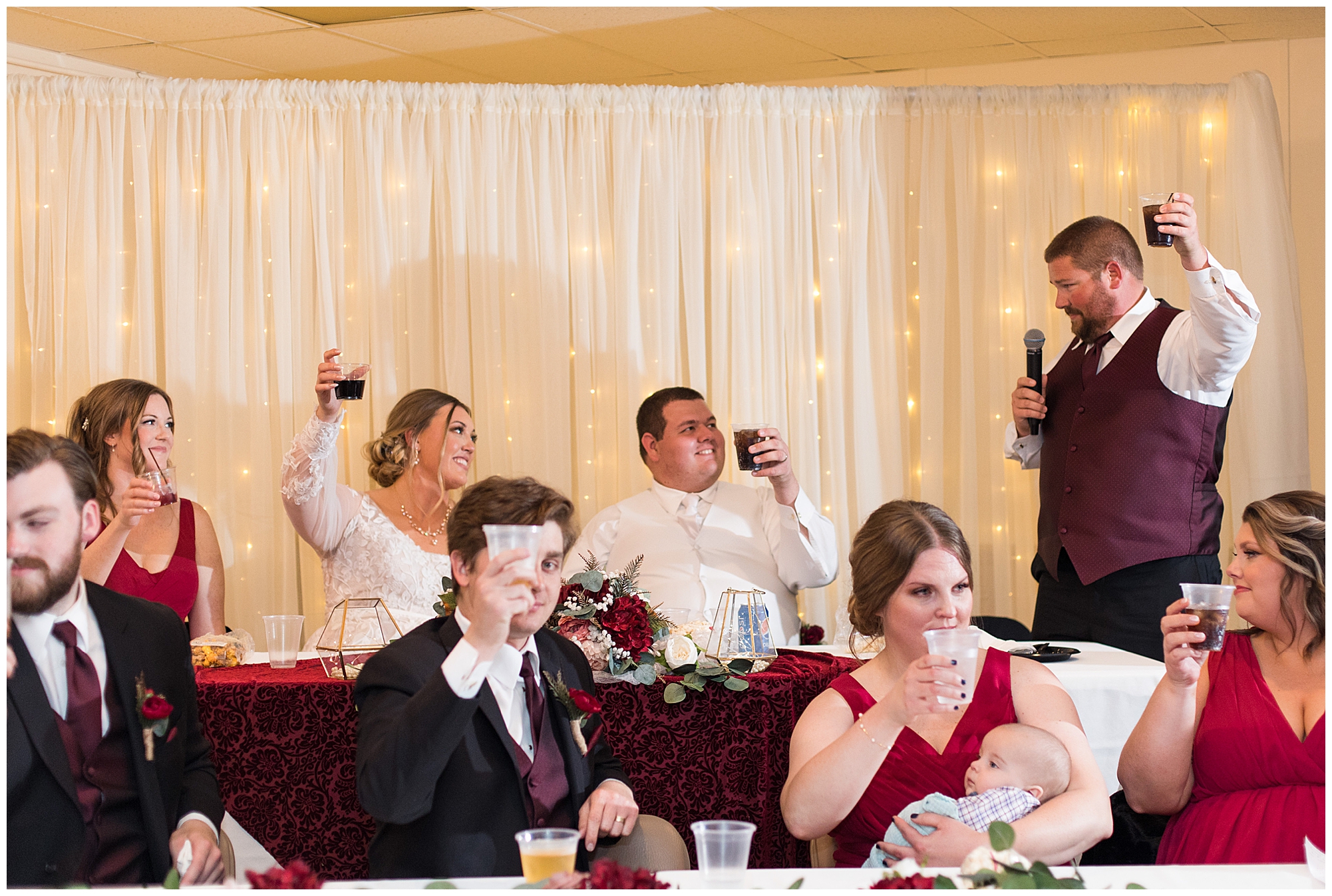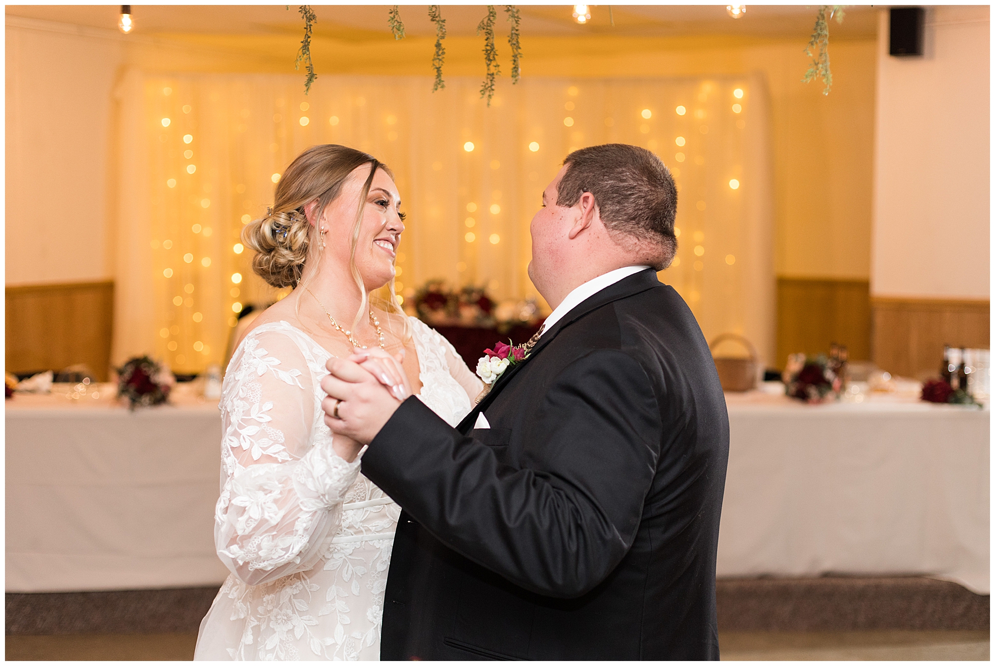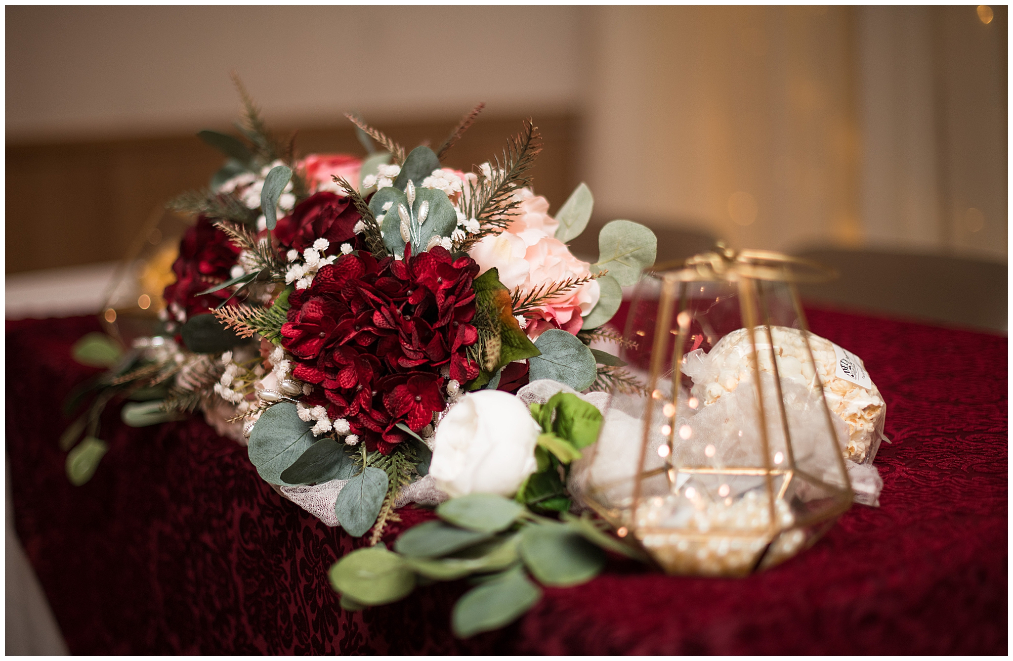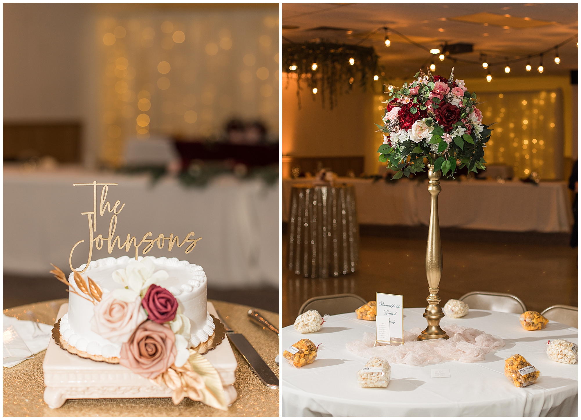 The reception hall was decorated beautifully with gold accents, burgundy and white flowers, and mesmerizing twinkle lights! They even had delightful greenery floating over the dance floor! Quite magical if you ask me! The couple was toasted, shared dances, and mingled with all of their guests. Then it was party time! The floor stayed packed for the night in celebration of this amazing couple! Cheers for many blessing to the new Mr. & Mrs. Johnson!