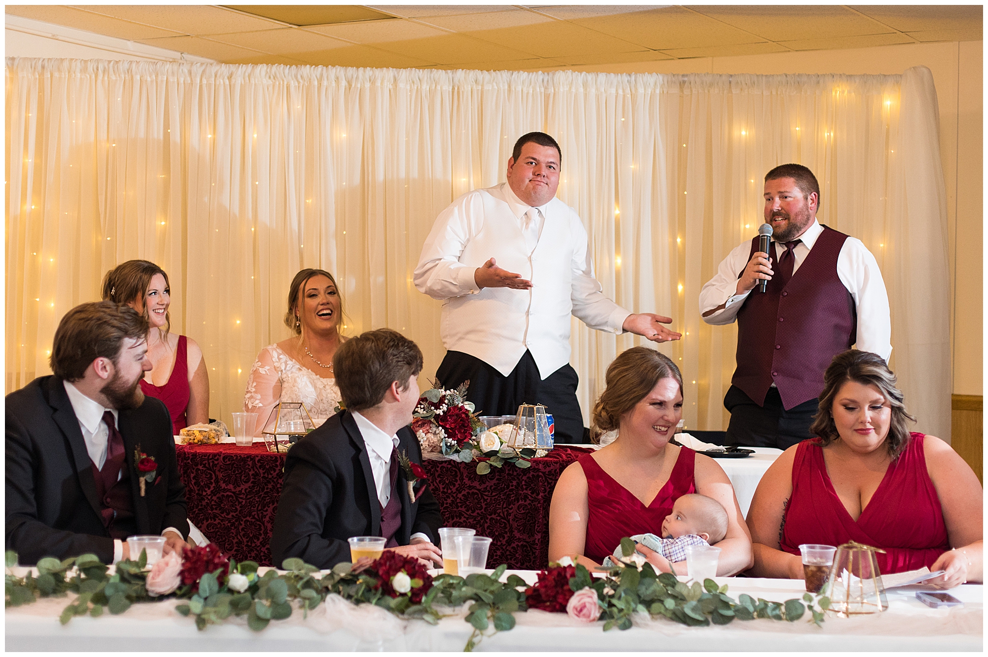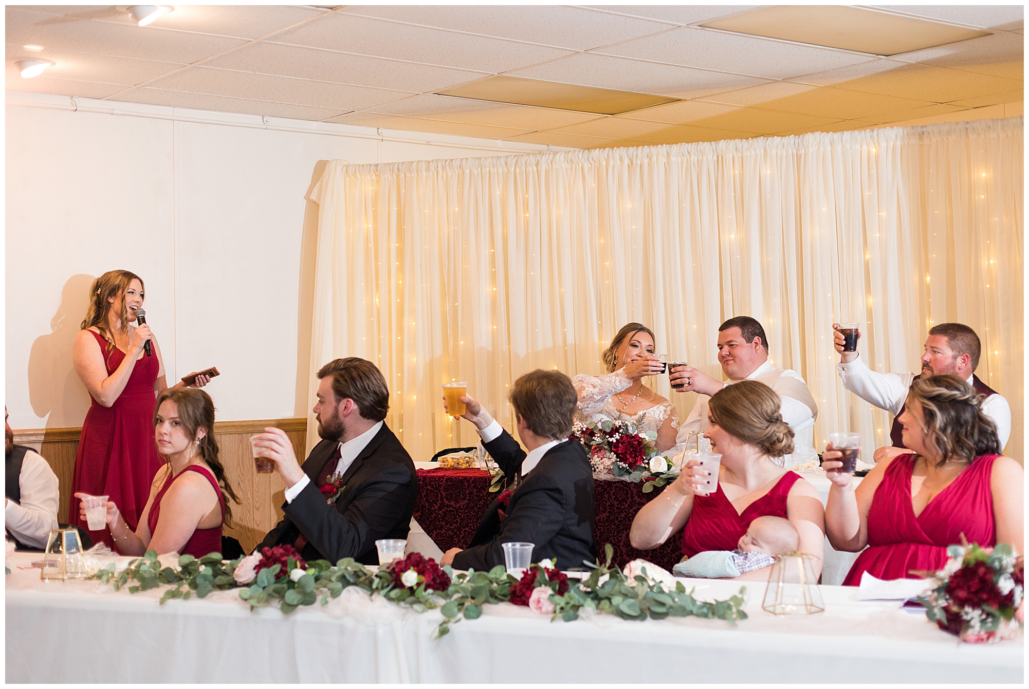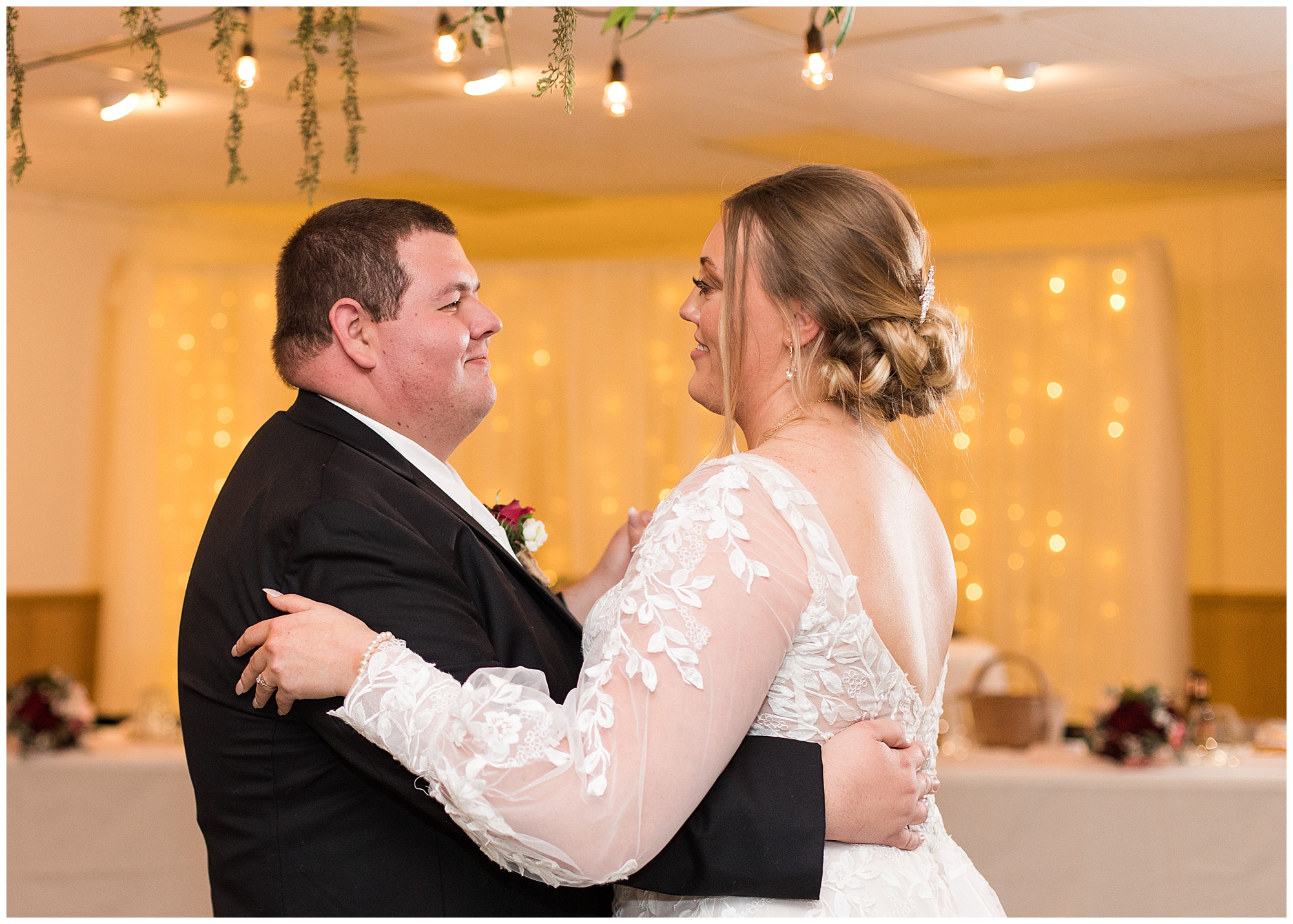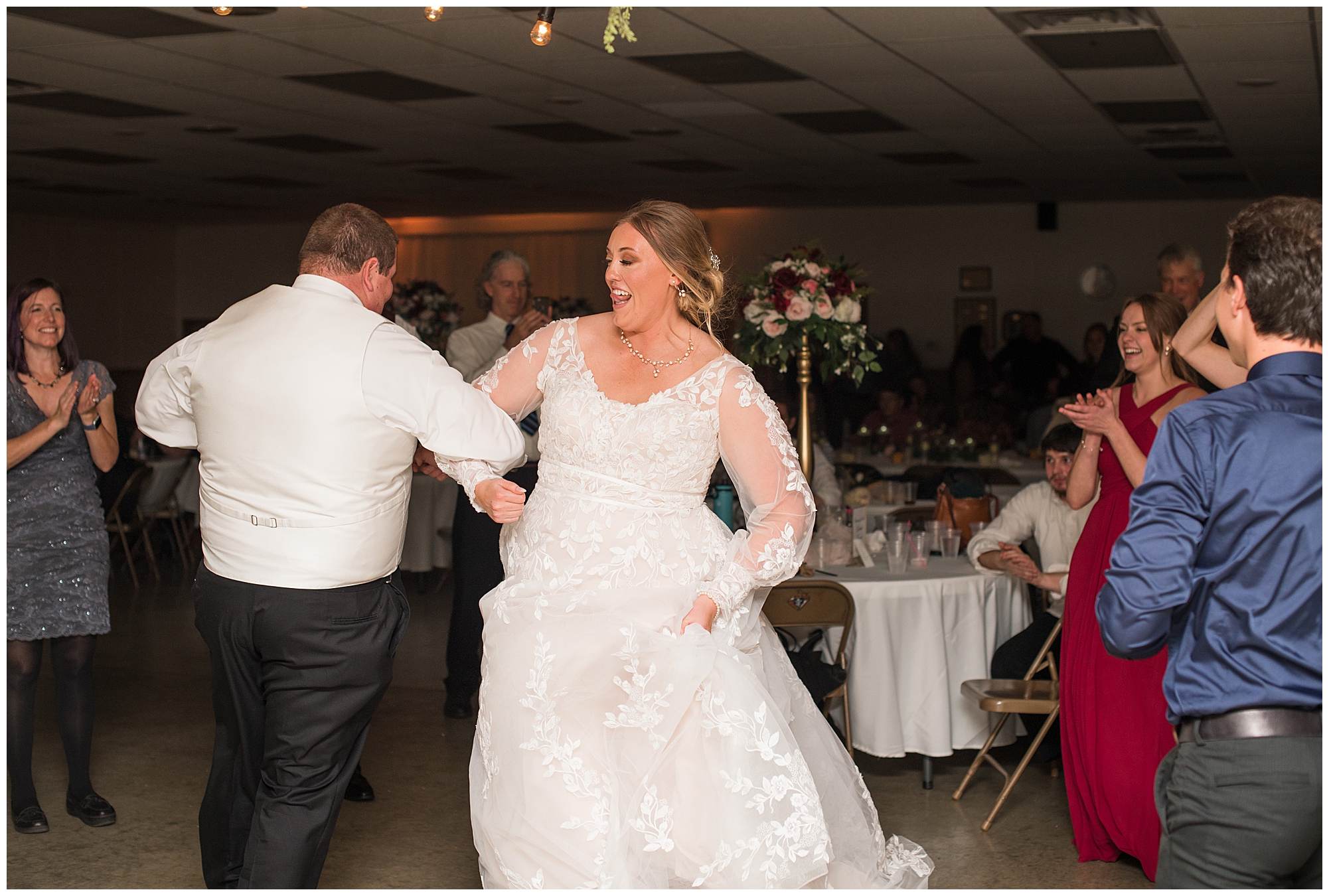 The reception hall was decorated beautifully with gold accents, burgundy and white flowers, and mesmerizing twinkle lights! They even had delightful greenery floating over the dance floor! Quite magical if you ask me! The couple was toasted, shared dances, and mingled with all of their guests. Then it was party time! The floor stayed packed for the night in celebration of this amazing couple! Cheers for many blessing to the new Mr. & Mrs. Johnson!