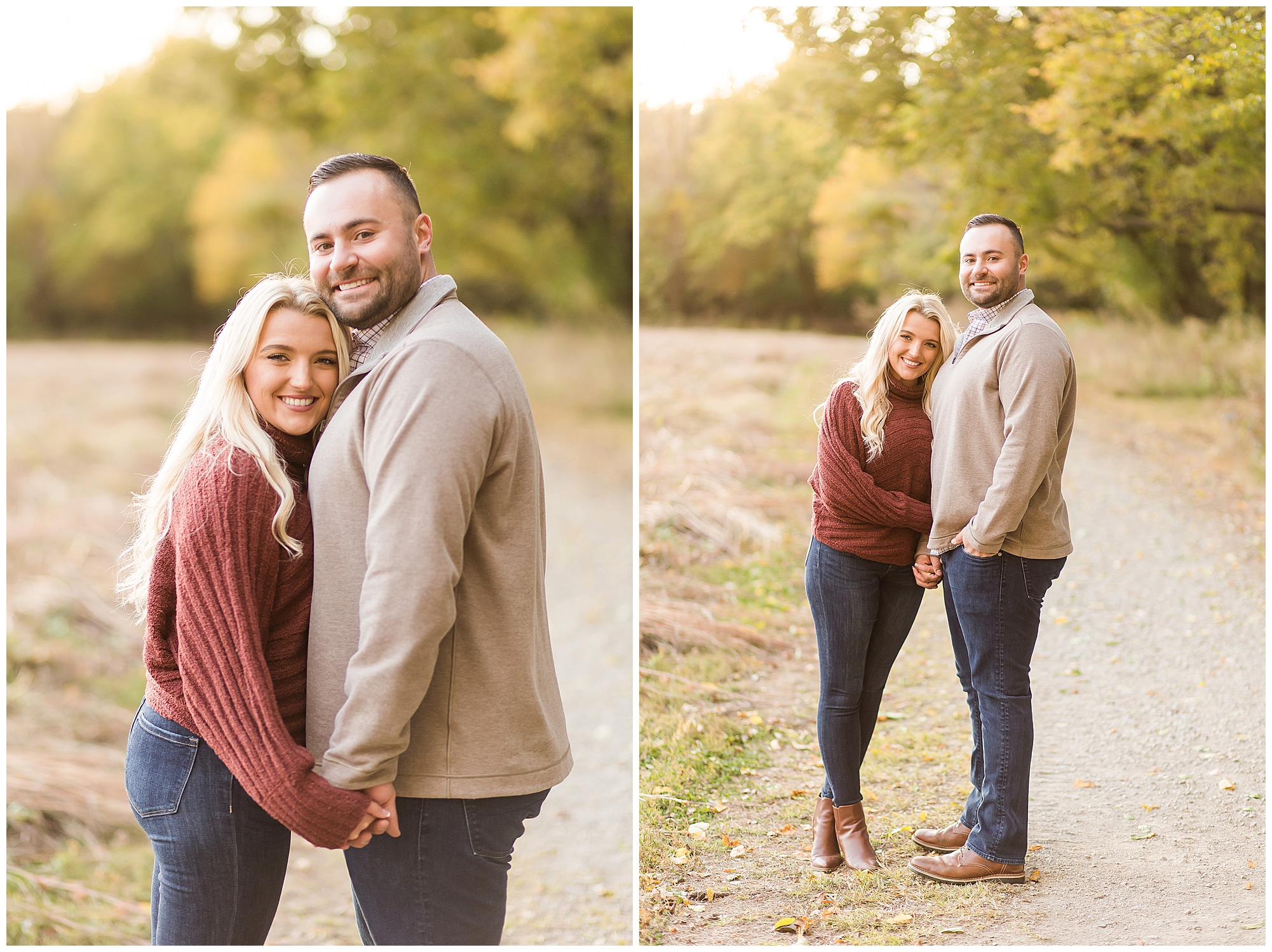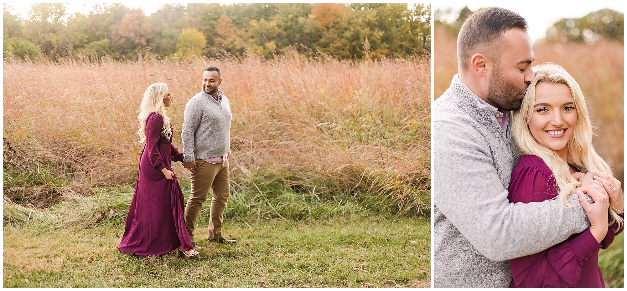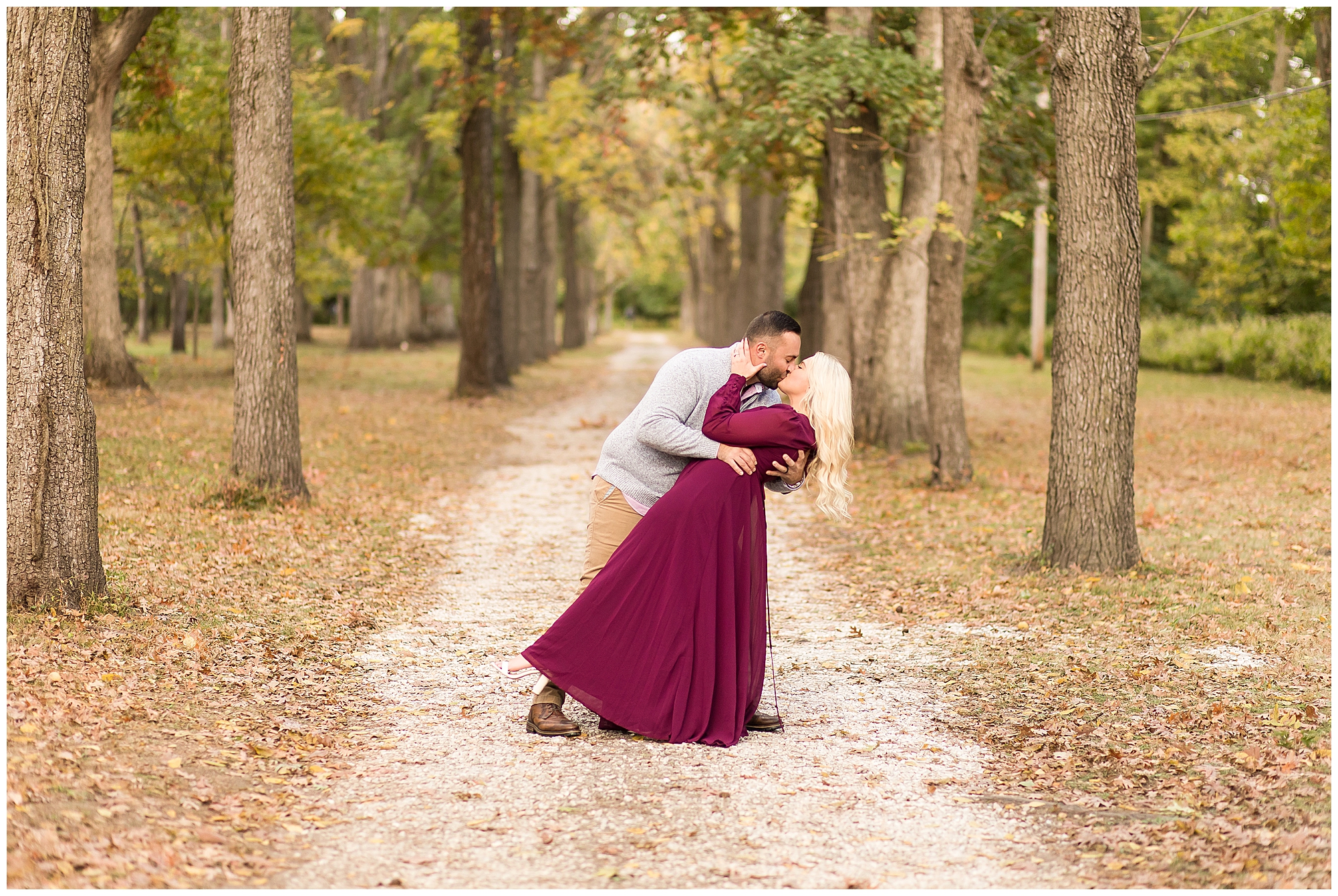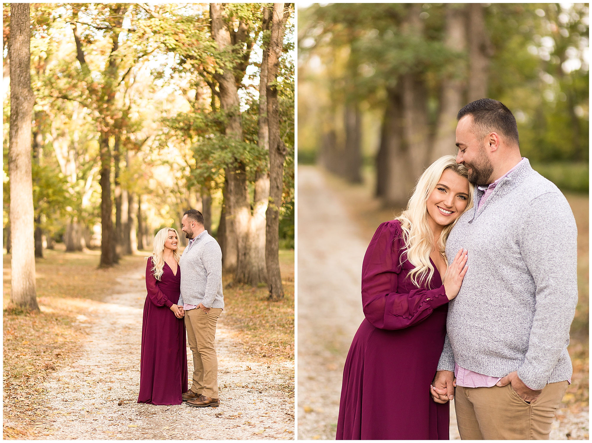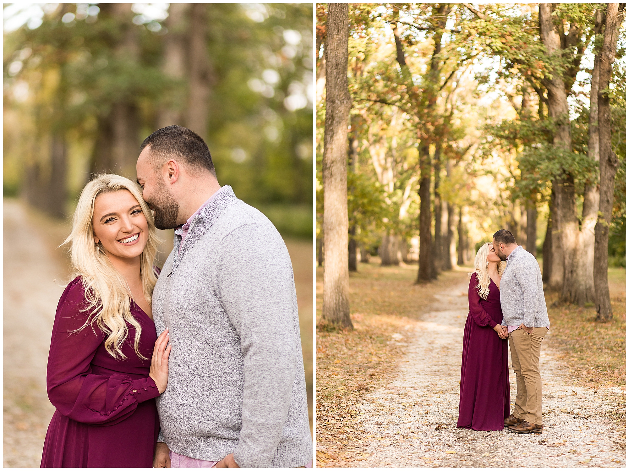 Ellie started off the session in an elegant wine colored dress, which complimented Reed’s neutral gray sweater. Her dress was perfect for plenty of twirls and dips around the tree lined grounds. This pair is so incredibly delightful and I enjoyed every second of our time together! Ellie is a teacher and Reed works for a local technology company. They both have kind hearts and spent the whole session with big smiles on their faces and snuggling as much as possible together as the chill of the fall came upon us when the sun began to set. We made sure to have plenty of time for an outfit change and switched up spots at the gardens. Ellie and Reed went for a more relaxed second outfit and we found a perfect spot for sunset. Before the sun dropped below the tree line, they grabbed a few more smooches and I grabbed a few more silhouettes! A perfect way to end their engagement session! I’m looking forward to being a part of Ellie and Reed’s big day!