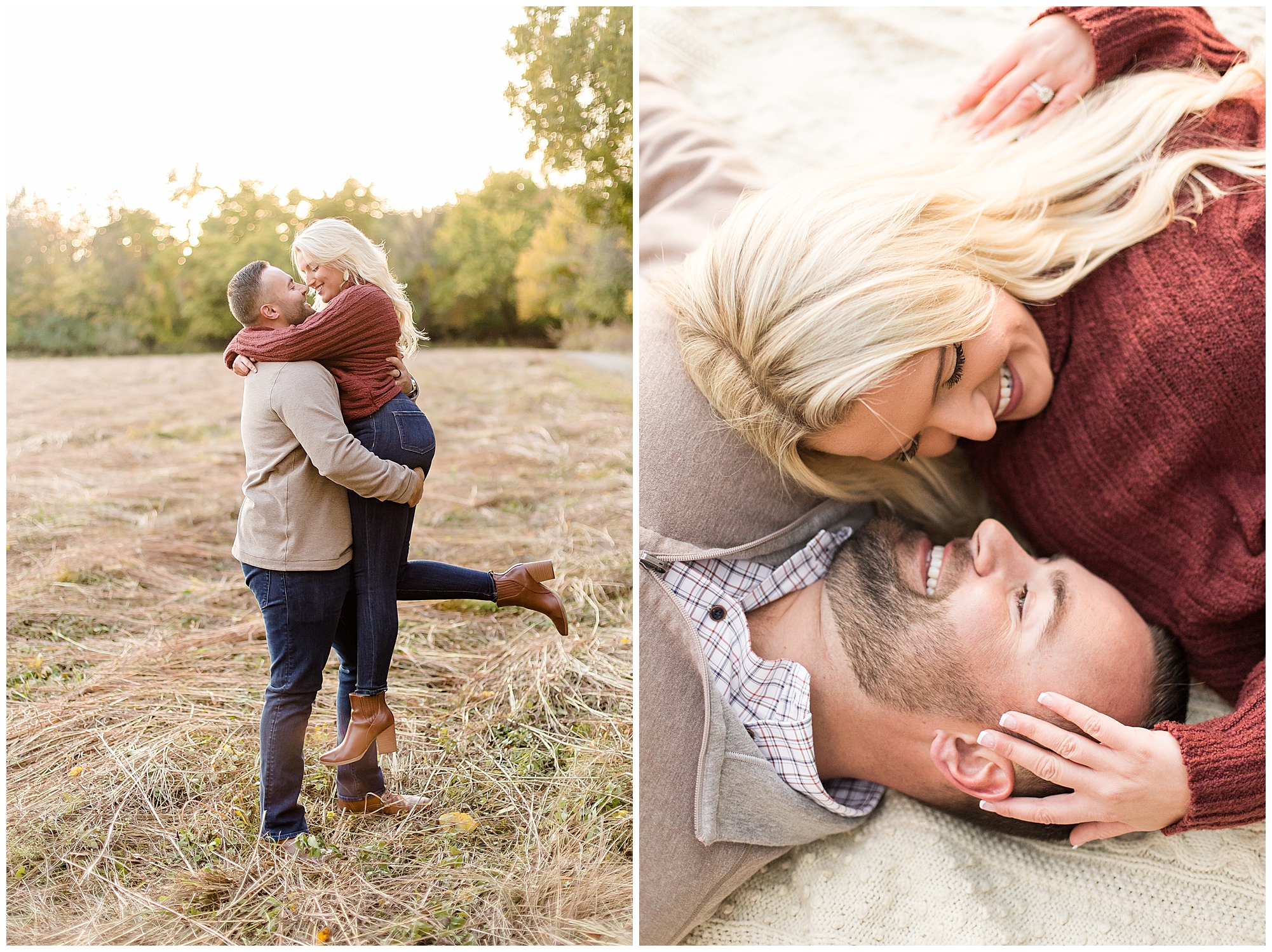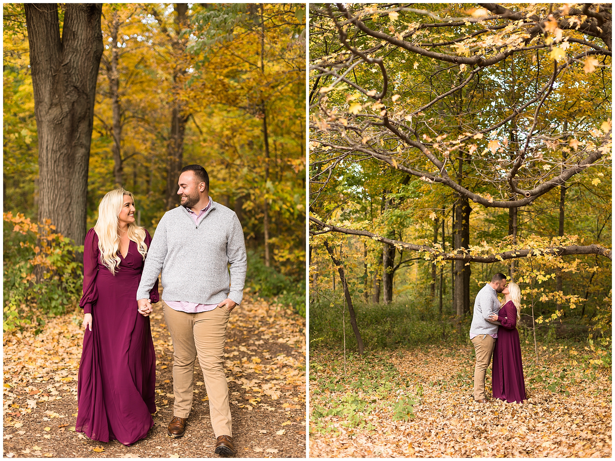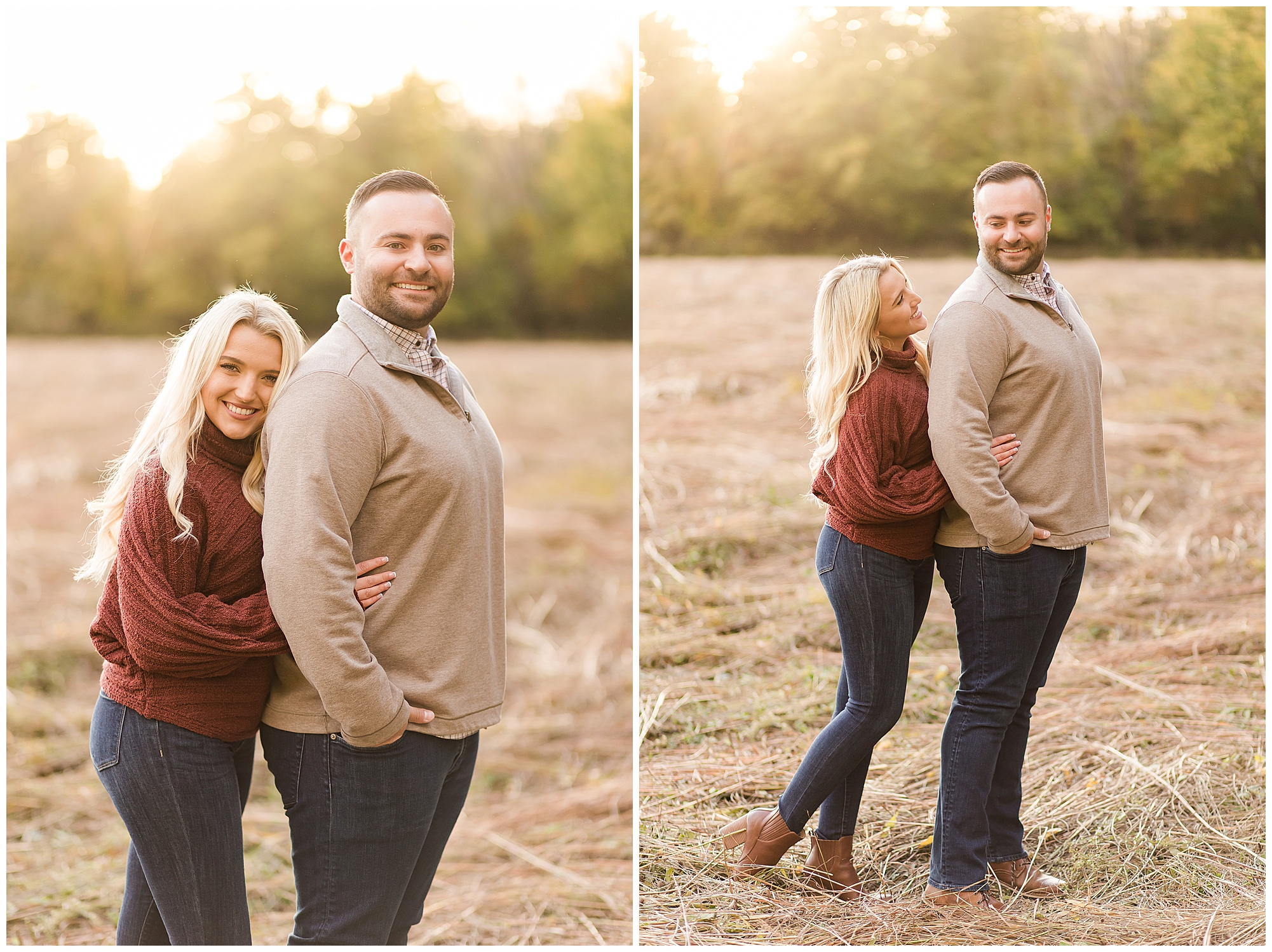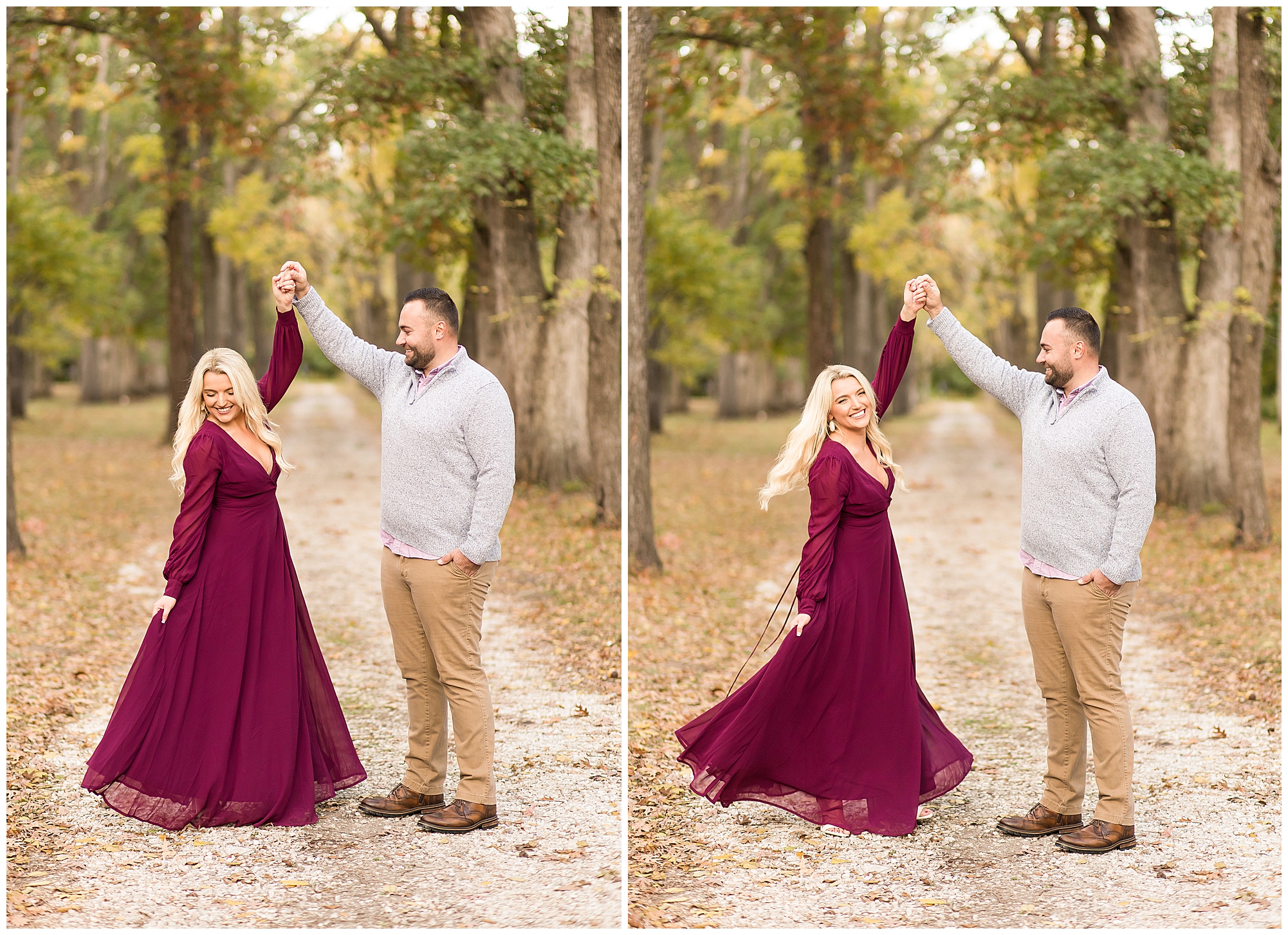 Ellie started off the session in an elegant wine colored dress, which complimented Reed’s neutral gray sweater. Her dress was perfect for plenty of twirls and dips around the tree lined grounds. This pair is so incredibly delightful and I enjoyed every second of our time together! Ellie is a teacher and Reed works for a local technology company. They both have kind hearts and spent the whole session with big smiles on their faces and snuggling as much as possible together as the chill of the fall came upon us when the sun began to set. We made sure to have plenty of time for an outfit change and switched up spots at the gardens. Ellie and Reed went for a more relaxed second outfit and we found a perfect spot for sunset. Before the sun dropped below the tree line, they grabbed a few more smooches and I grabbed a few more silhouettes! A perfect way to end their engagement session! I’m looking forward to being a part of Ellie and Reed’s big day!