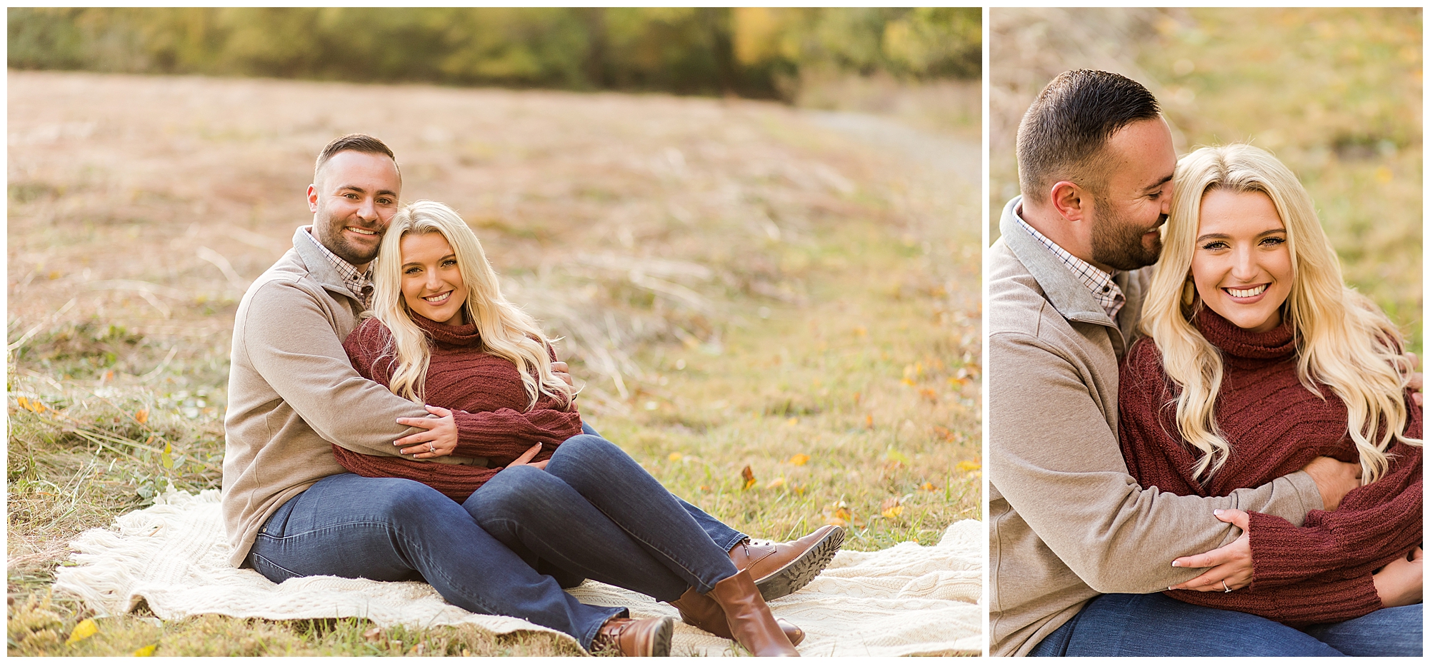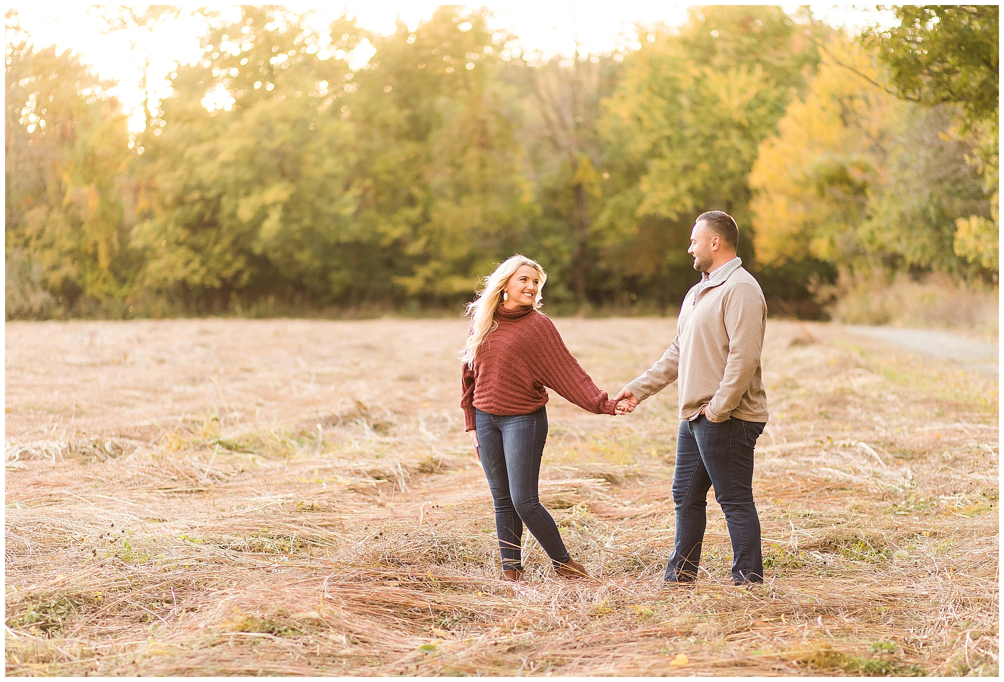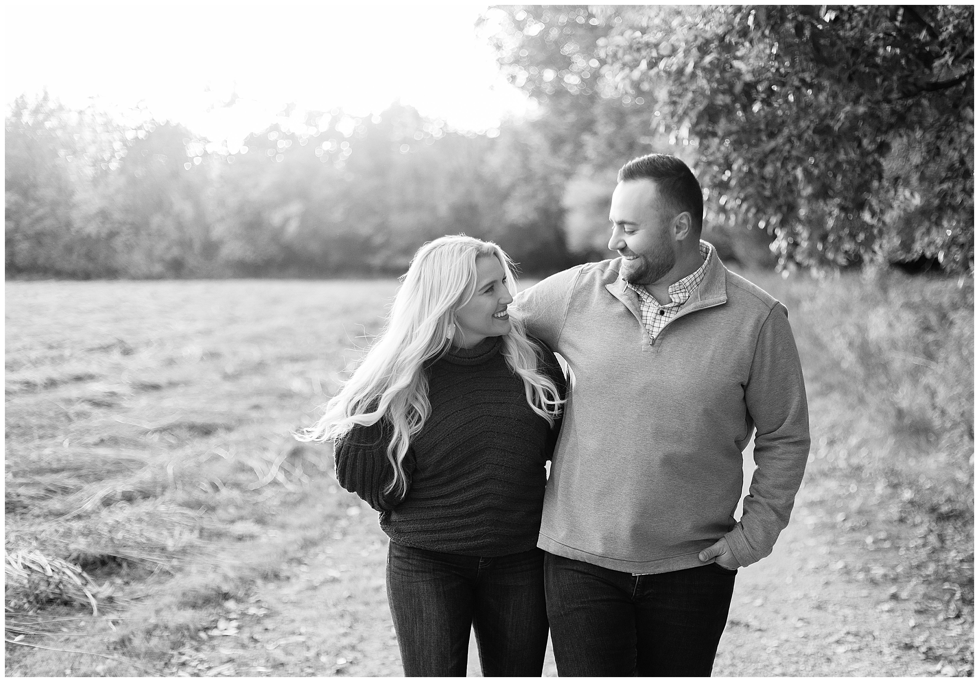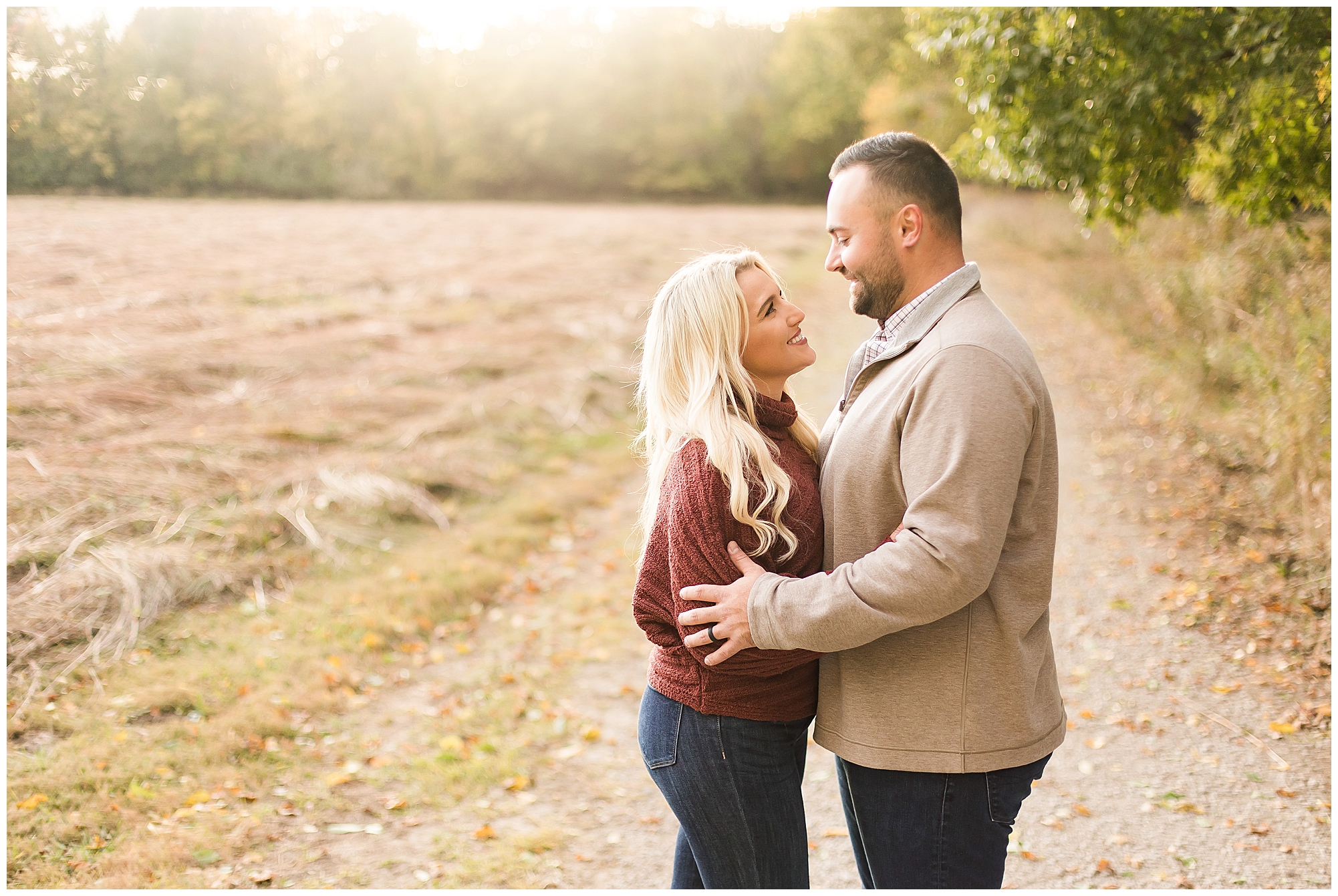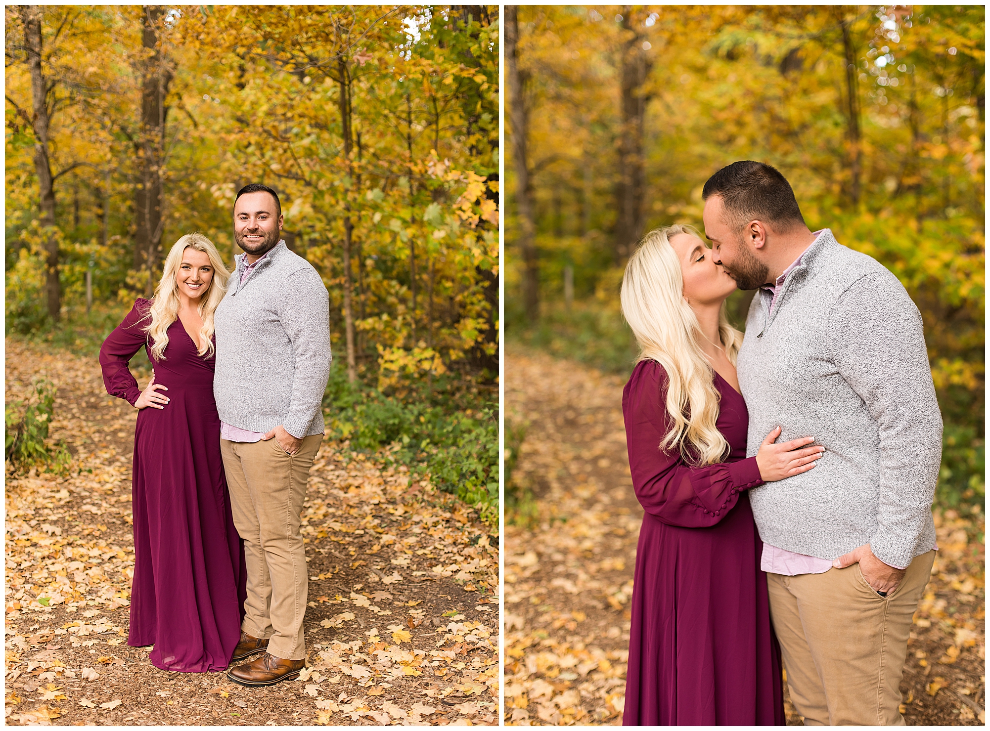 Ellie started off the session in an elegant wine colored dress, which complimented Reed’s neutral gray sweater. Her dress was perfect for plenty of twirls and dips around the tree lined grounds. This pair is so incredibly delightful and I enjoyed every second of our time together! Ellie is a teacher and Reed works for a local technology company. They both have kind hearts and spent the whole session with big smiles on their faces and snuggling as much as possible together as the chill of the fall came upon us when the sun began to set. We made sure to have plenty of time for an outfit change and switched up spots at the gardens. Ellie and Reed went for a more relaxed second outfit and we found a perfect spot for sunset. Before the sun dropped below the tree line, they grabbed a few more smooches and I grabbed a few more silhouettes! A perfect way to end their engagement session! I’m looking forward to being a part of Ellie and Reed’s big day!