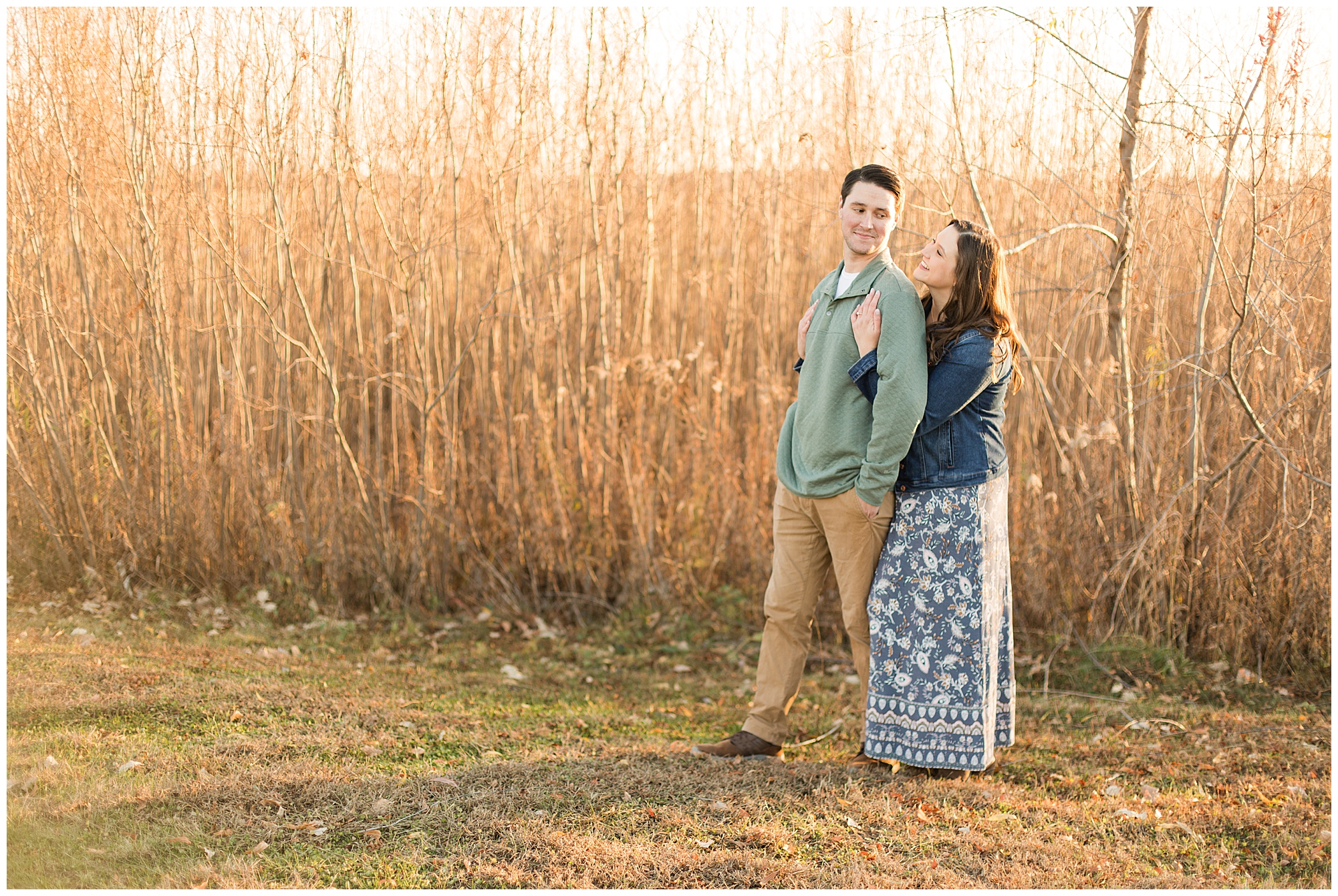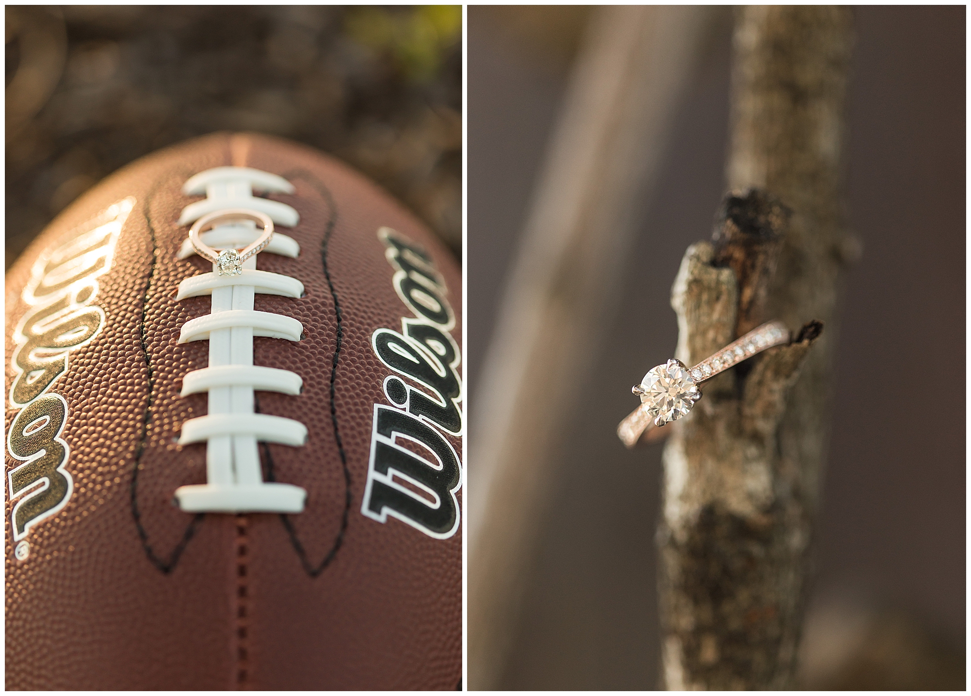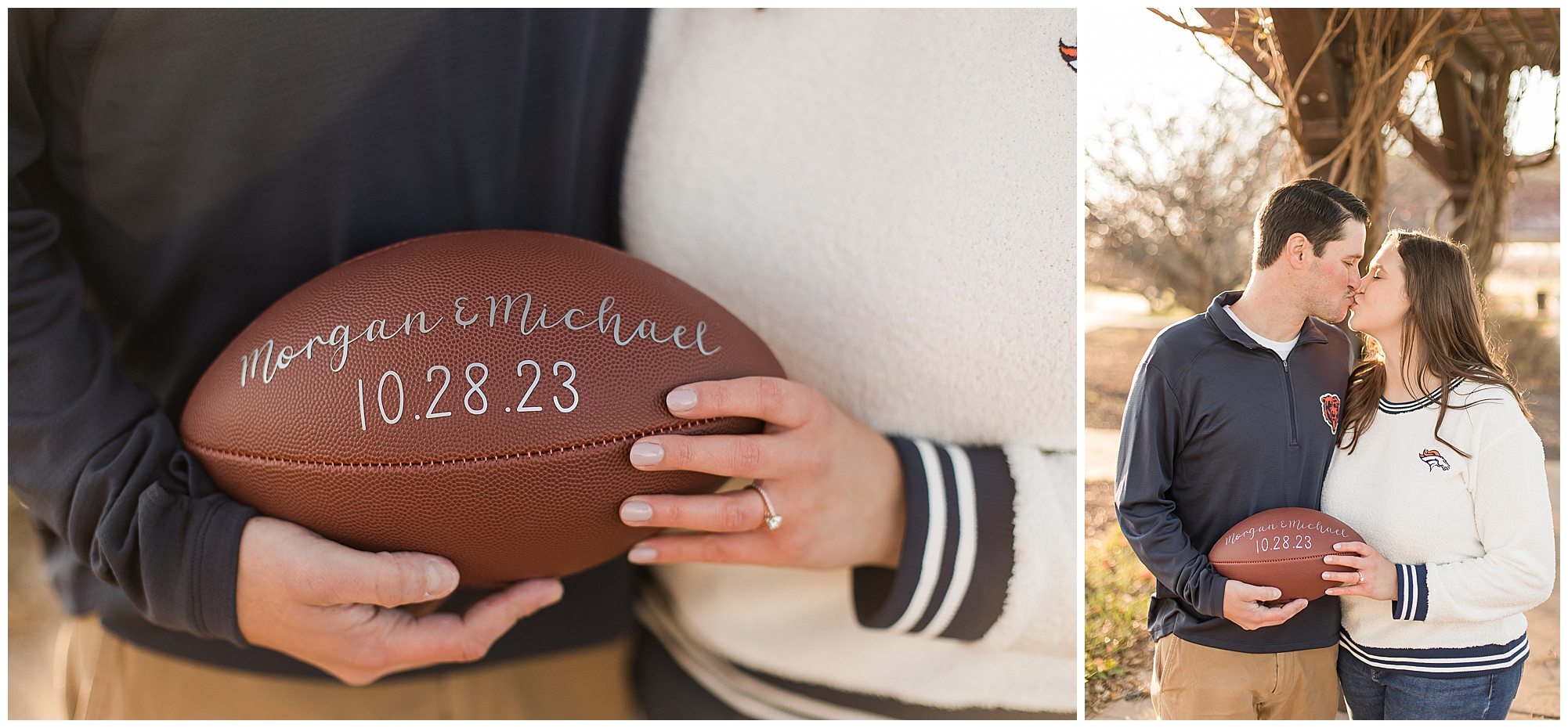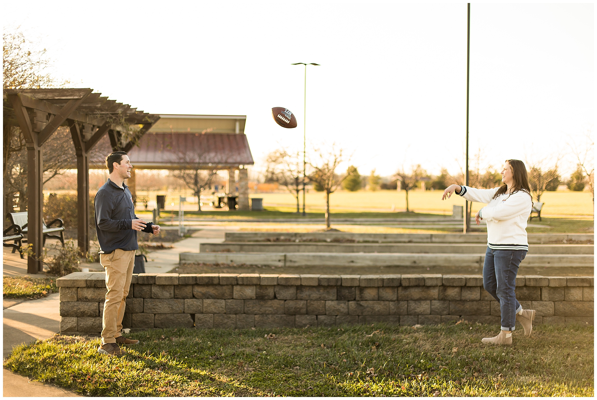 We headed over to the spot where that infamous question was popped on an adorable little bridge at the back of the park. The sun and warm fall evening was simply perfect for this lovely couple. Morgan and Michael are very laid back, kind, and loved taking in every second with one another. So spending time getting to know them better on a wonderful fall night was amazing. We hit up a couple other spots around the park including the treehouse. But, this couple was after my own heart with their mutual love of football, which they wanted to show off for their photos! Their team choices are a little questionable as Bears and Broncos fans in my opinion (Fly Eagles Fly), however it was a fun moment to capture them tossing the ball around handmade by a friend with their names and wedding date on it. And of course we had to finish by the pond at sunset. Southwinds Park rarely disappoints with some beautiful golden glow as the sun drops below the horizon! Especially with a delightful couple like Morgan and Michael snuggling in close on a gorgeous autumn evening. I cannot wait to be a part of their fall wedding this year!
