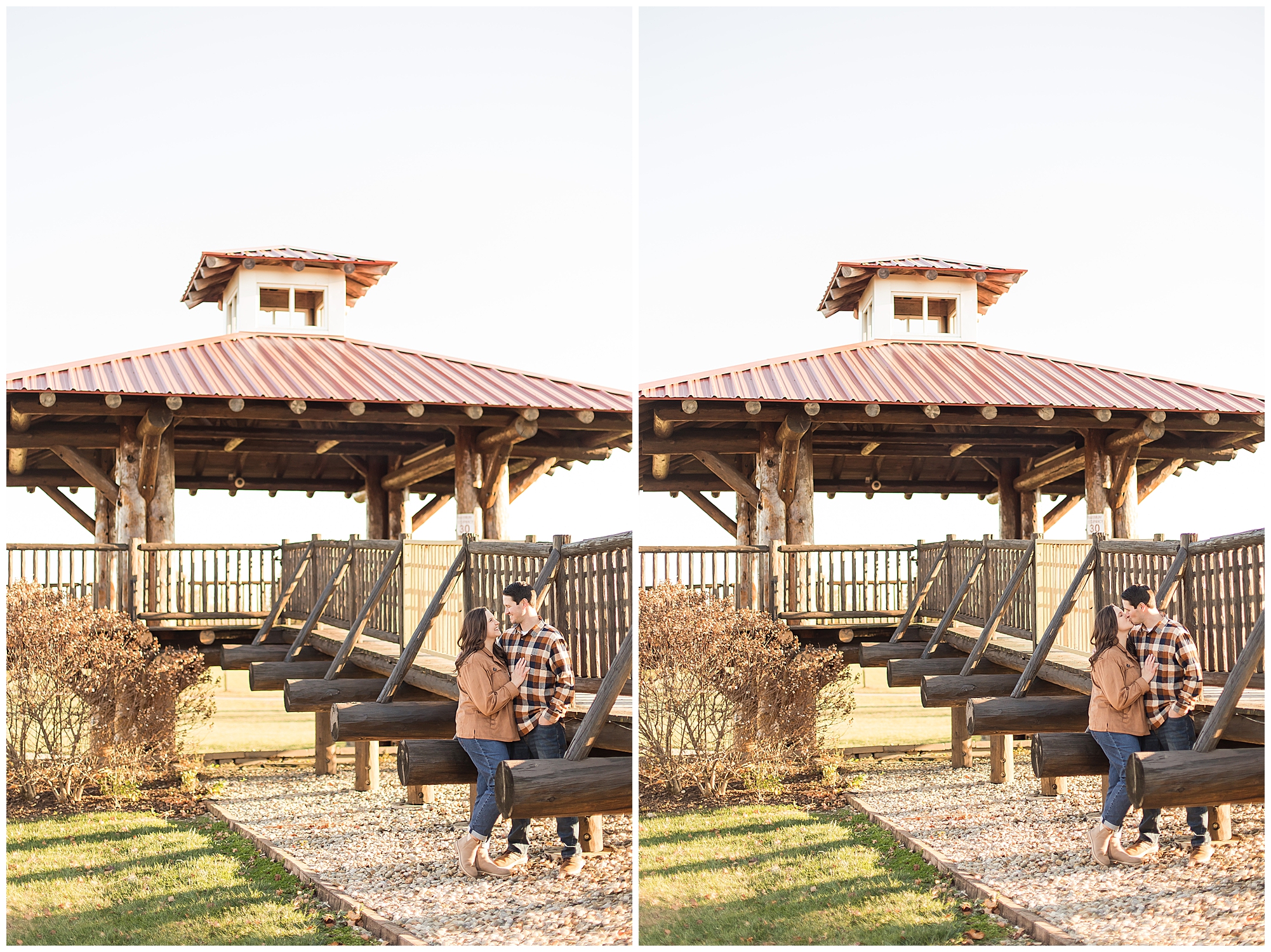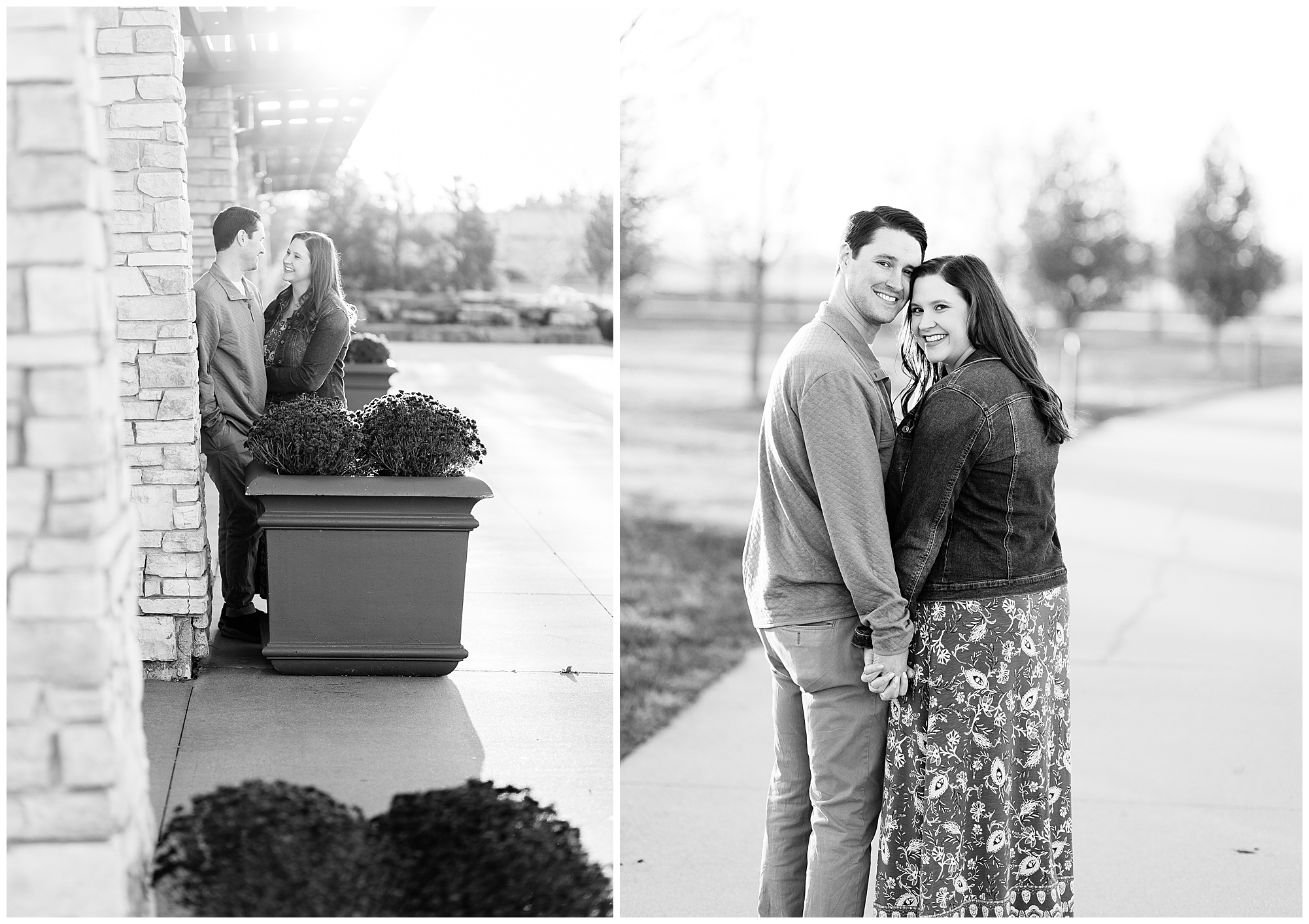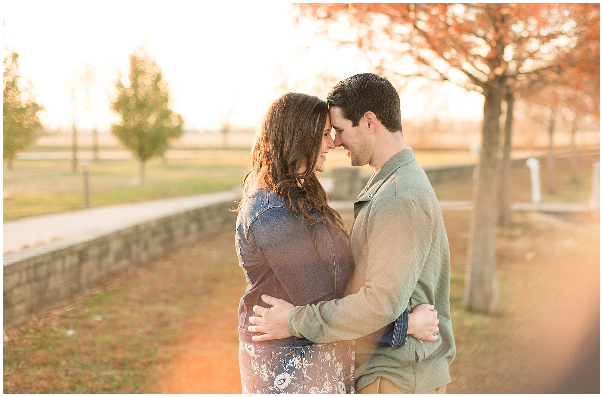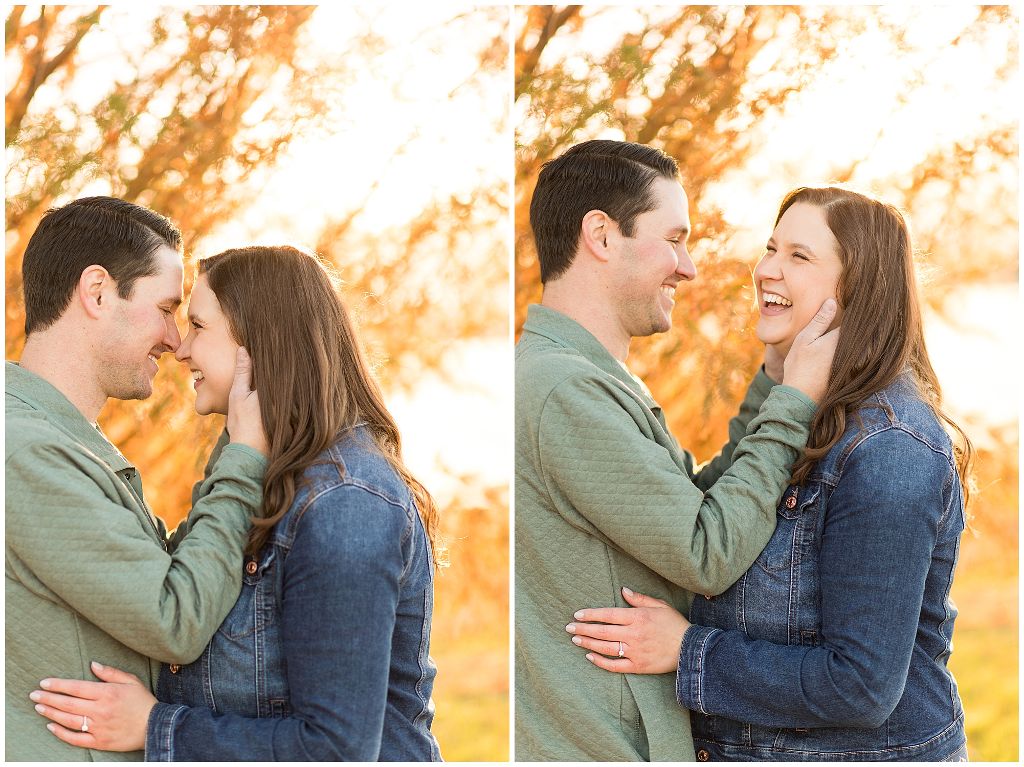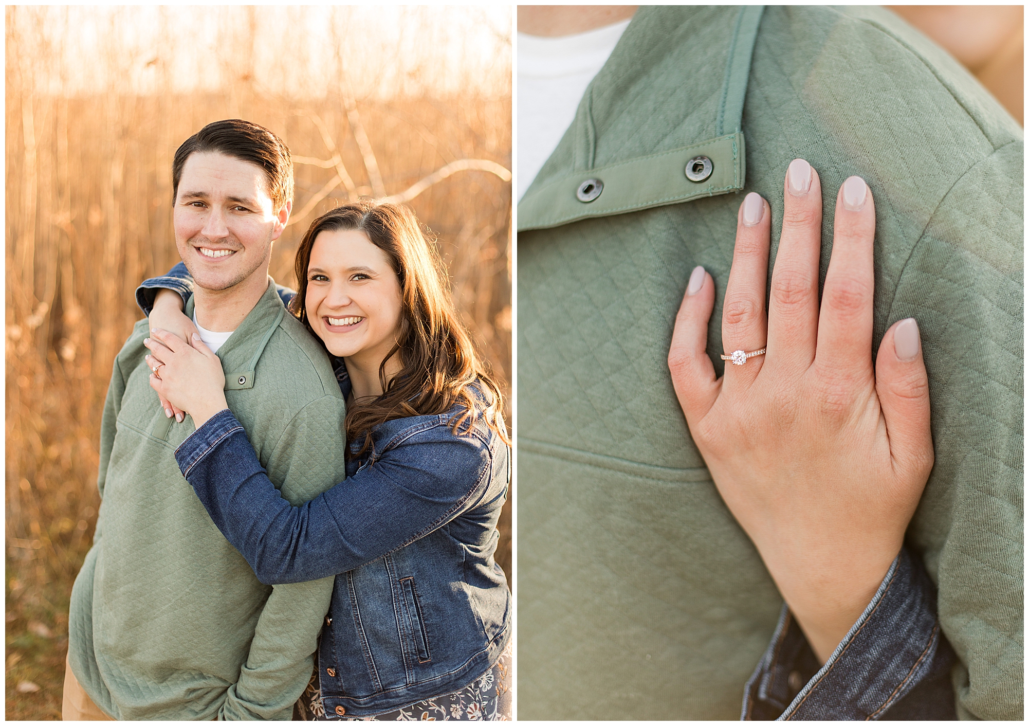 We headed over to the spot where that infamous question was popped on an adorable little bridge at the back of the park. The sun and warm fall evening was simply perfect for this lovely couple. Morgan and Michael are very laid back, kind, and loved taking in every second with one another. So spending time getting to know them better on a wonderful fall night was amazing. We hit up a couple other spots around the park including the treehouse. But, this couple was after my own heart with their mutual love of football, which they wanted to show off for their photos! Their team choices are a little questionable as Bears and Broncos fans in my opinion (Fly Eagles Fly), however it was a fun moment to capture them tossing the ball around handmade by a friend with their names and wedding date on it. And of course we had to finish by the pond at sunset. Southwinds Park rarely disappoints with some beautiful golden glow as the sun drops below the horizon! Especially with a delightful couple like Morgan and Michael snuggling in close on a gorgeous autumn evening. I cannot wait to be a part of their fall wedding this year!