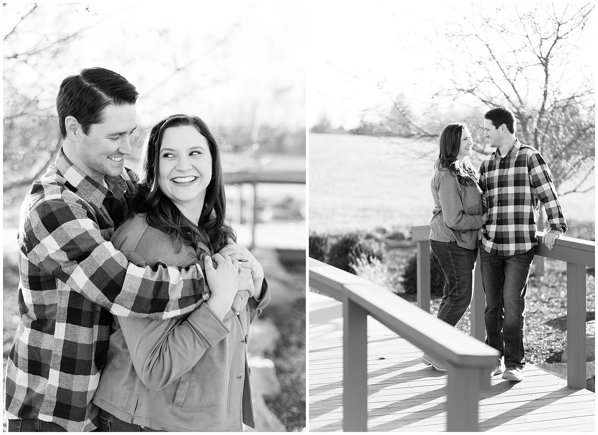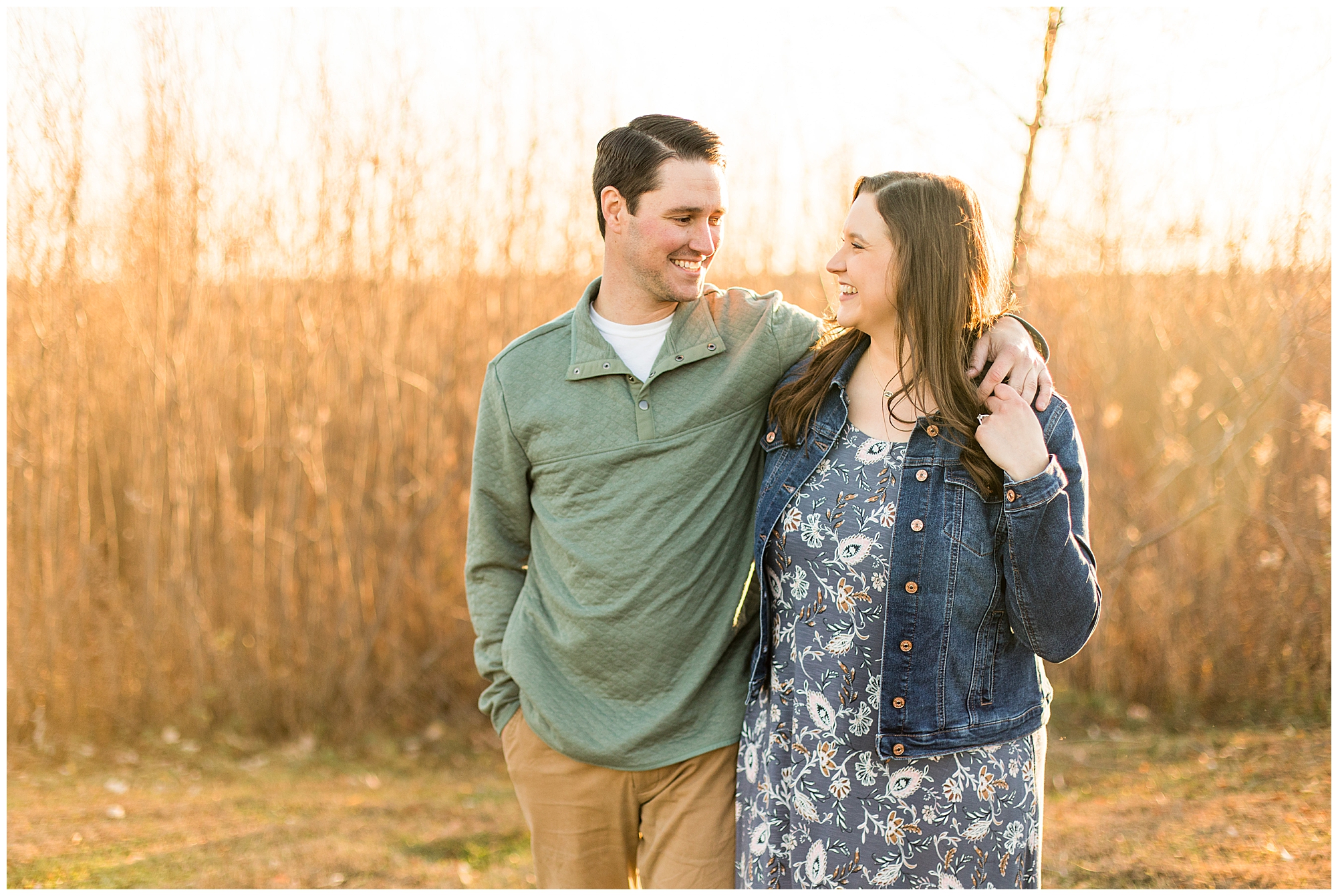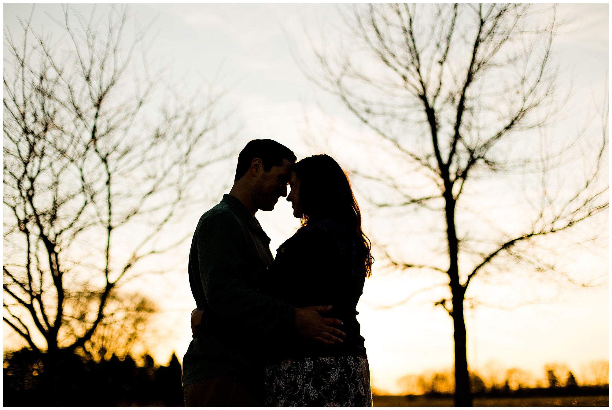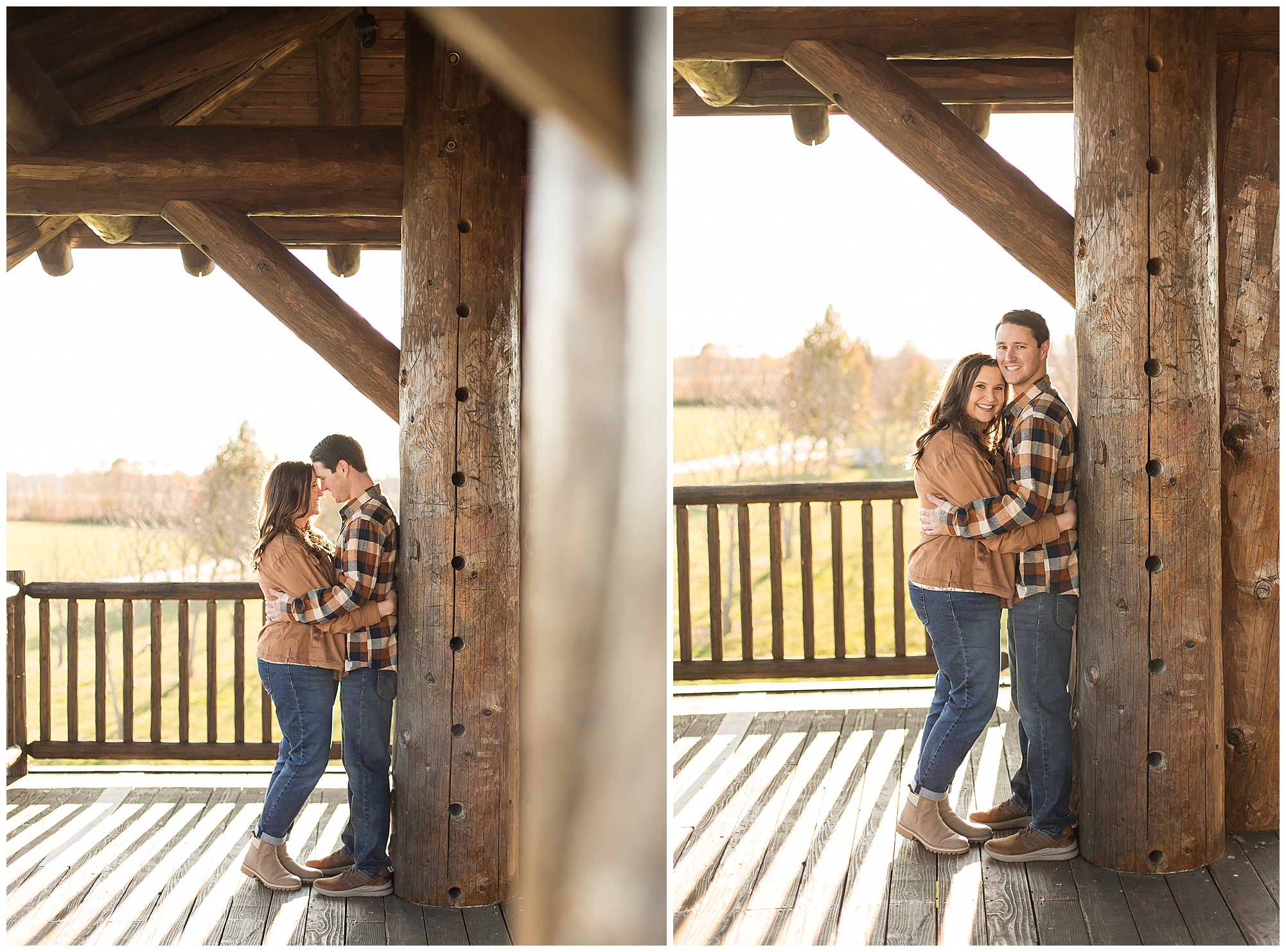 We headed over to the spot where that infamous question was popped on an adorable little bridge at the back of the park. The sun and warm fall evening was simply perfect for this lovely couple. Morgan and Michael are very laid back, kind, and loved taking in every second with one another. So spending time getting to know them better on a wonderful fall night was amazing. We hit up a couple other spots around the park including the treehouse. But, this couple was after my own heart with their mutual love of football, which they wanted to show off for their photos! Their team choices are a little questionable as Bears and Broncos fans in my opinion (Fly Eagles Fly), however it was a fun moment to capture them tossing the ball around handmade by a friend with their names and wedding date on it. And of course we had to finish by the pond at sunset. Southwinds Park rarely disappoints with some beautiful golden glow as the sun drops below the horizon! Especially with a delightful couple like Morgan and Michael snuggling in close on a gorgeous autumn evening. I cannot wait to be a part of their fall wedding this year!