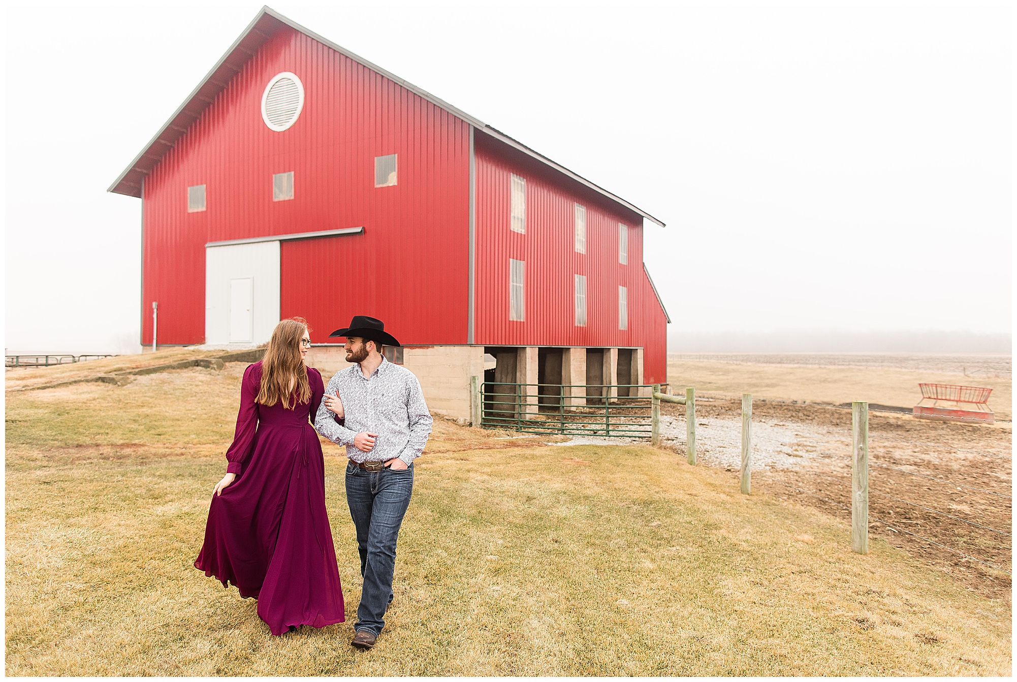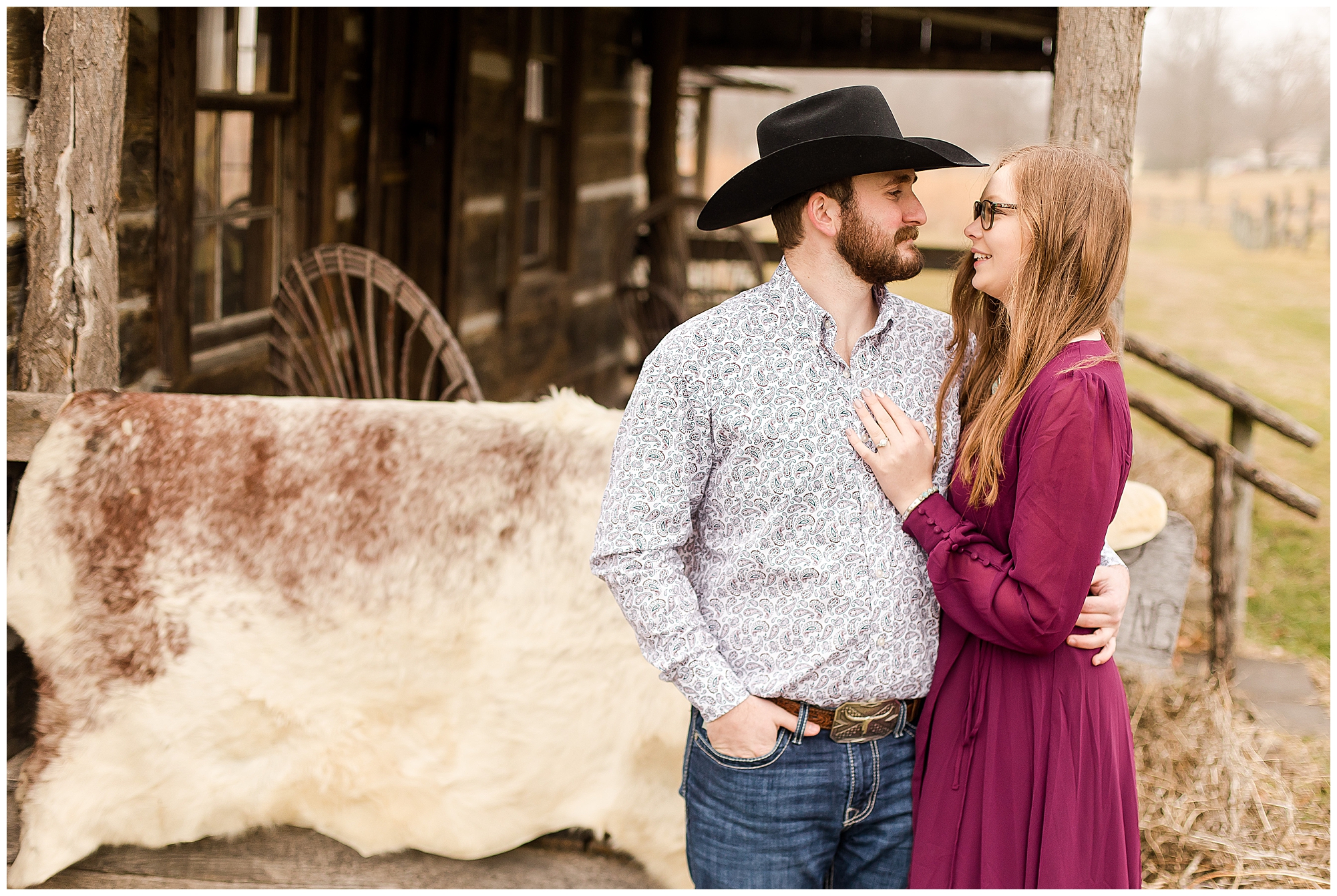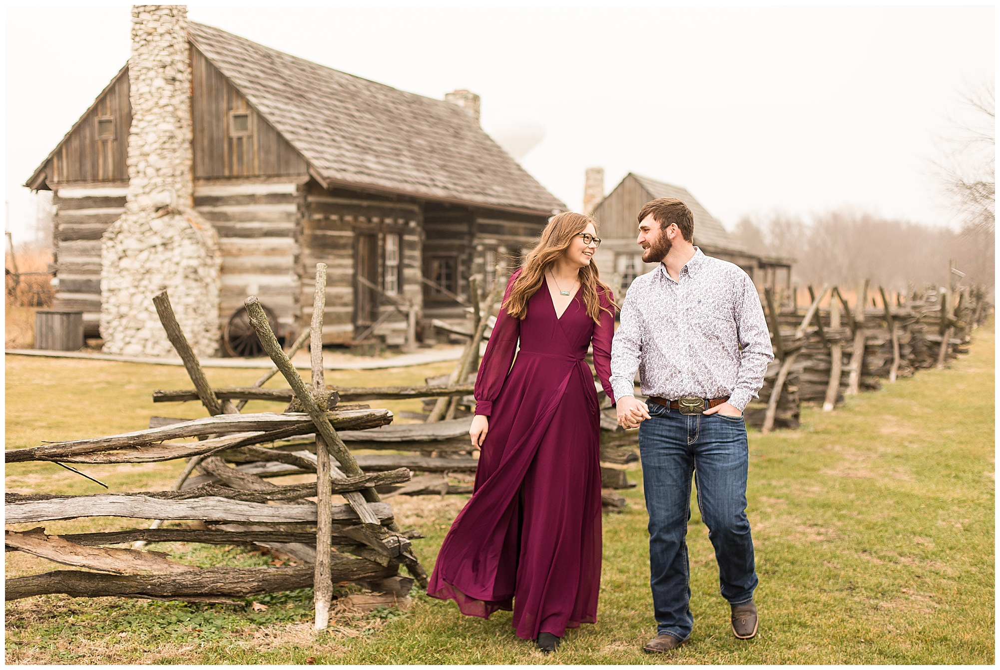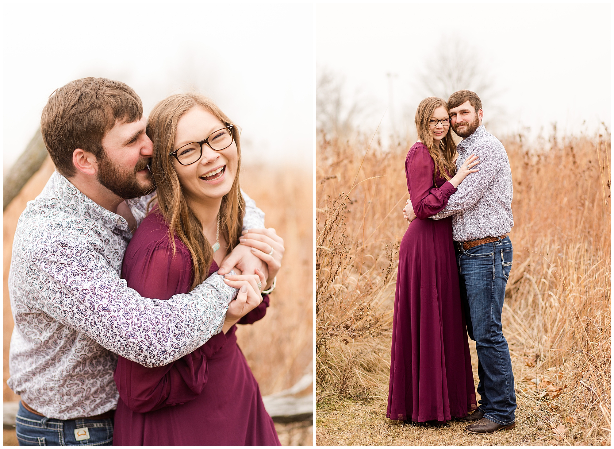 I met up with Rebecca and Trace on a mild January day in Virginia, Illinois for their engagement session. We had been planning their photo shoot for awhile and we were hoping that the sun would come out on this winter day. Rebecca and I had met before as she was a bridesmaid in her brother’s wedding I photographed a couple years back out at their family’s farm. Before we headed to the farm, we started in an area of Virginia with some beautiful log cabins for a little rustic touch. Rebecca looked gorgeous in her maroon dress and Trace brought the fun with a paisley button down shirt and his trusty jeans. These two are so sweet with each other and took in every second in one another’s arms!