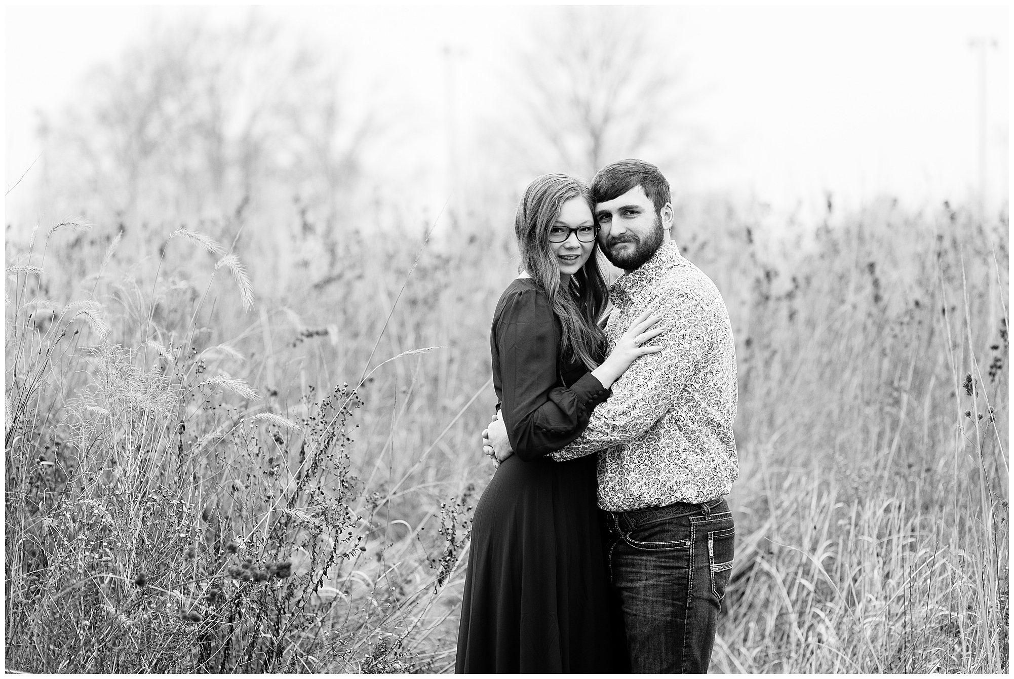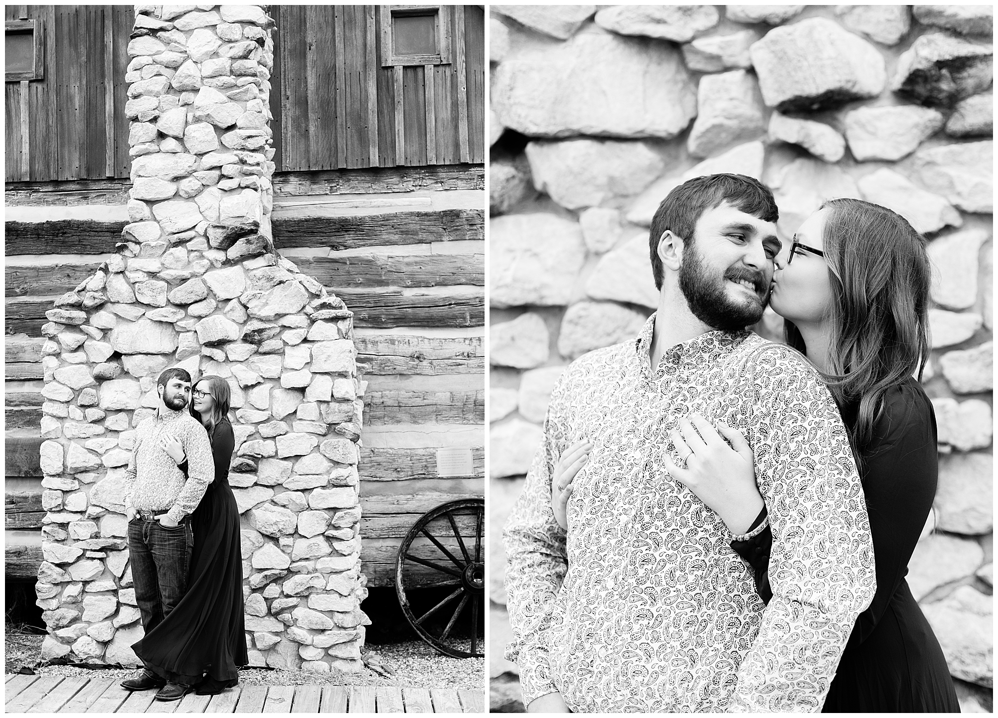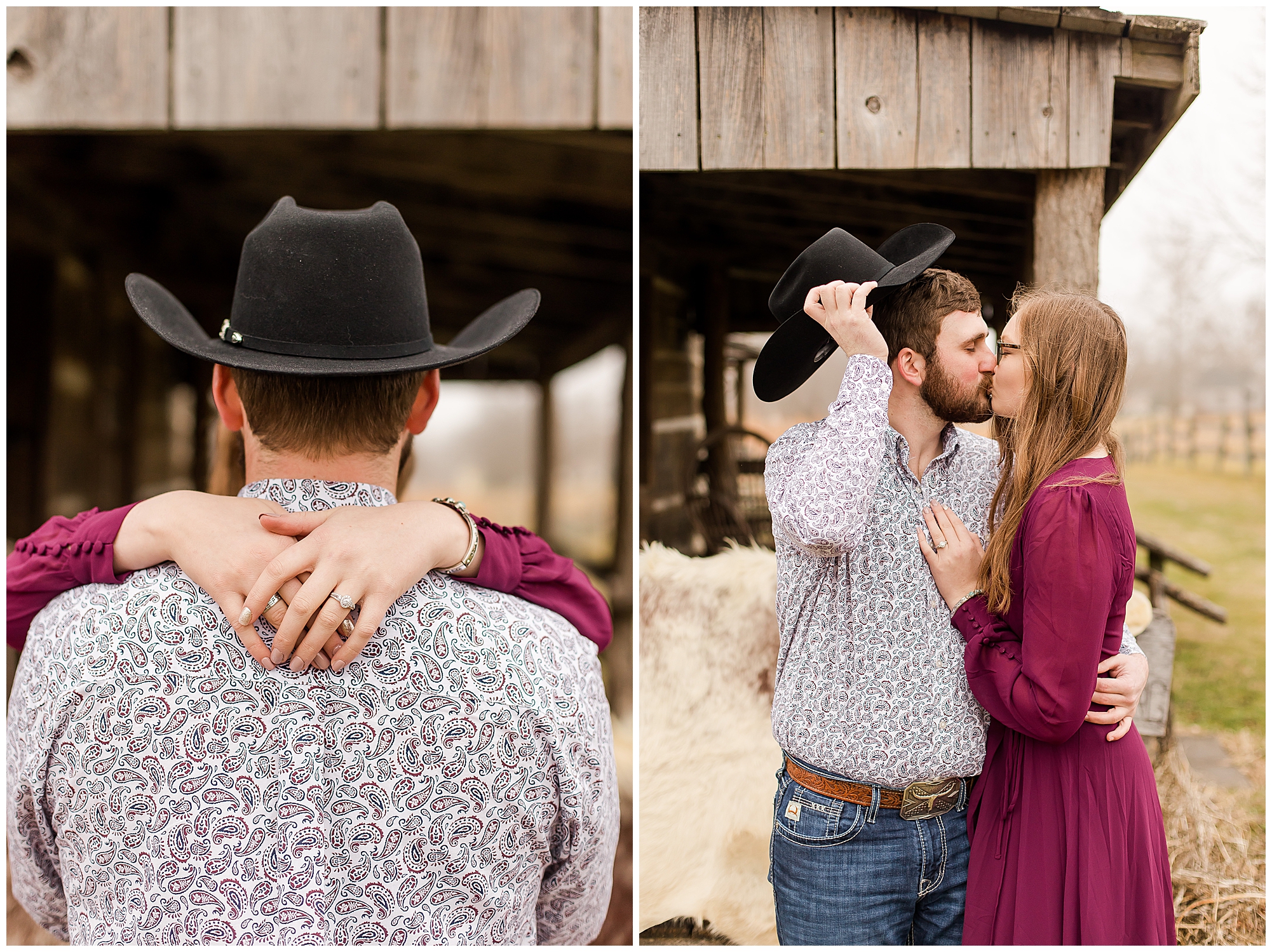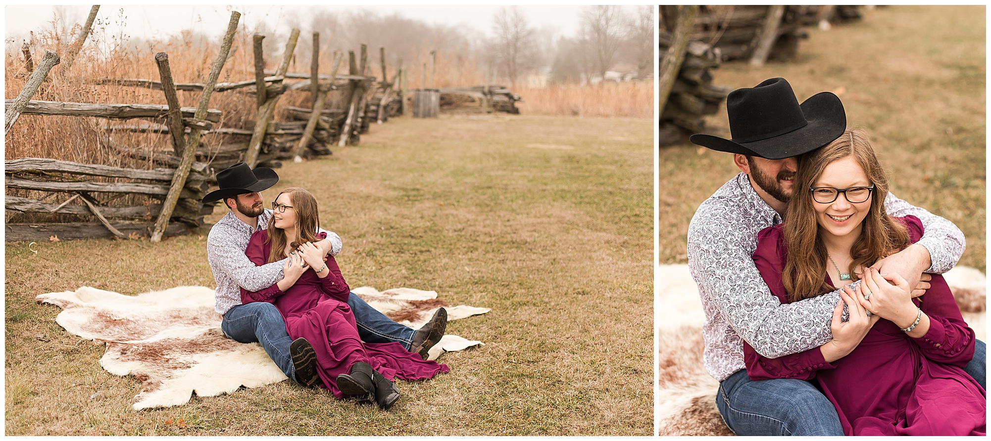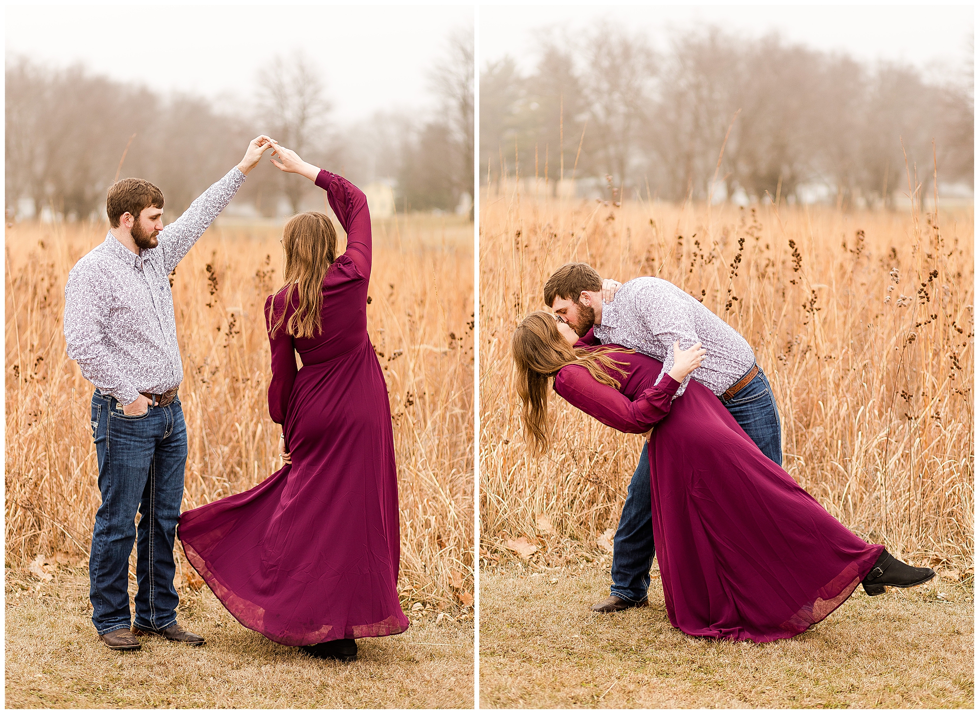 I met up with Rebecca and Trace on a mild January day in Virginia, Illinois for their engagement session. We had been planning their photo shoot for awhile and we were hoping that the sun would come out on this winter day. Rebecca and I had met before as she was a bridesmaid in her brother’s wedding I photographed a couple years back out at their family’s farm. Before we headed to the farm, we started in an area of Virginia with some beautiful log cabins for a little rustic touch. Rebecca looked gorgeous in her maroon dress and Trace brought the fun with a paisley button down shirt and his trusty jeans. These two are so sweet with each other and took in every second in one another’s arms!