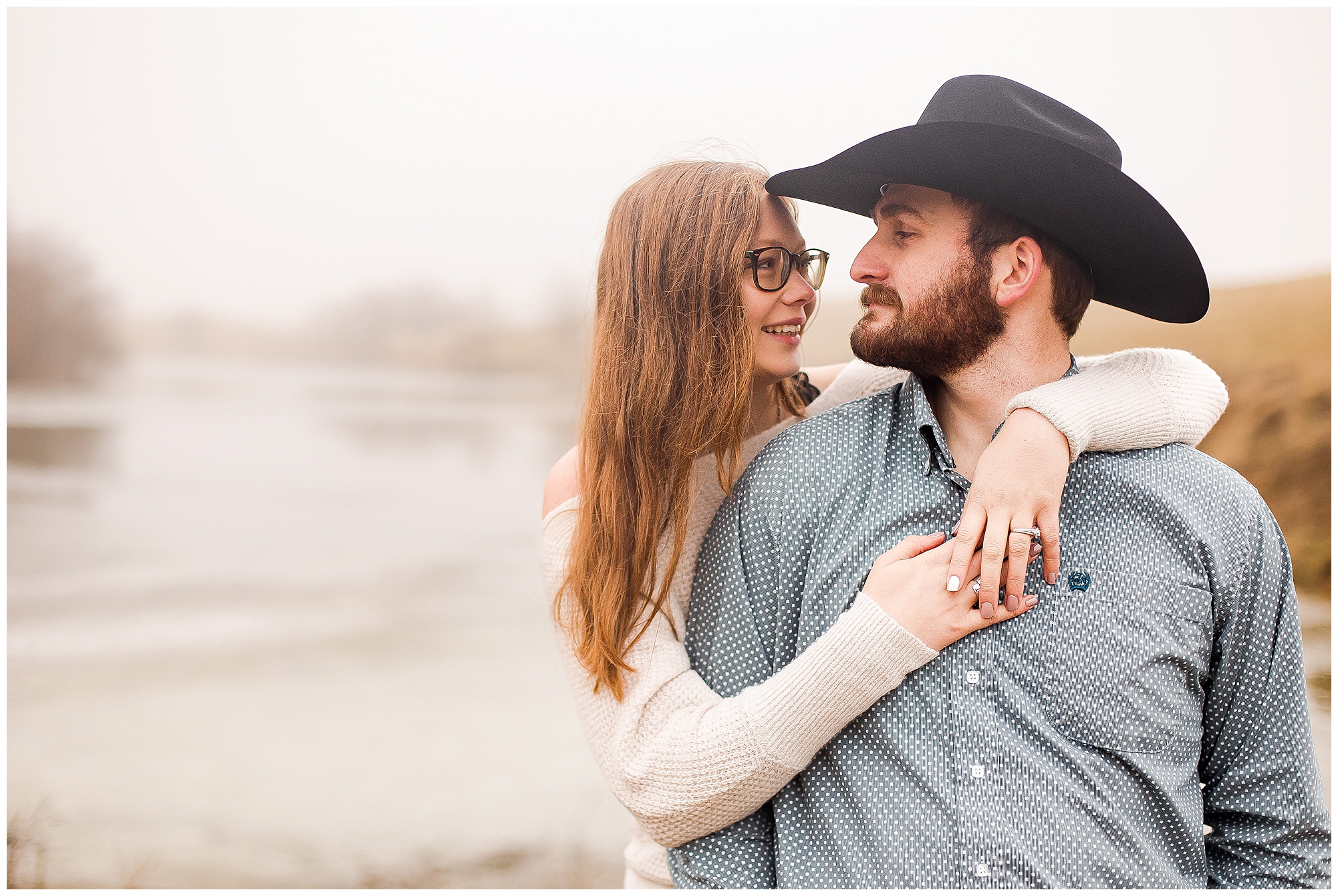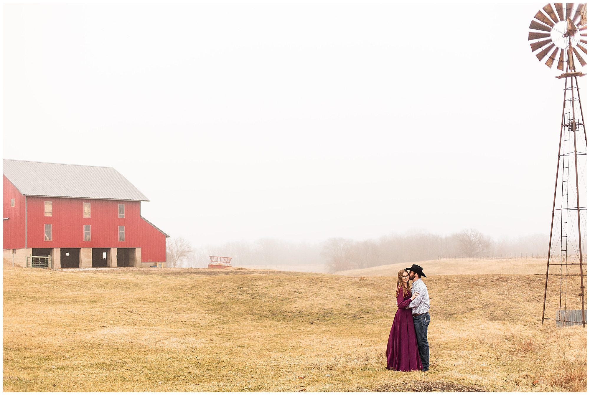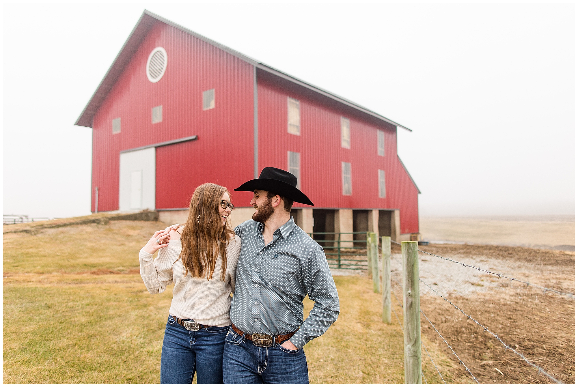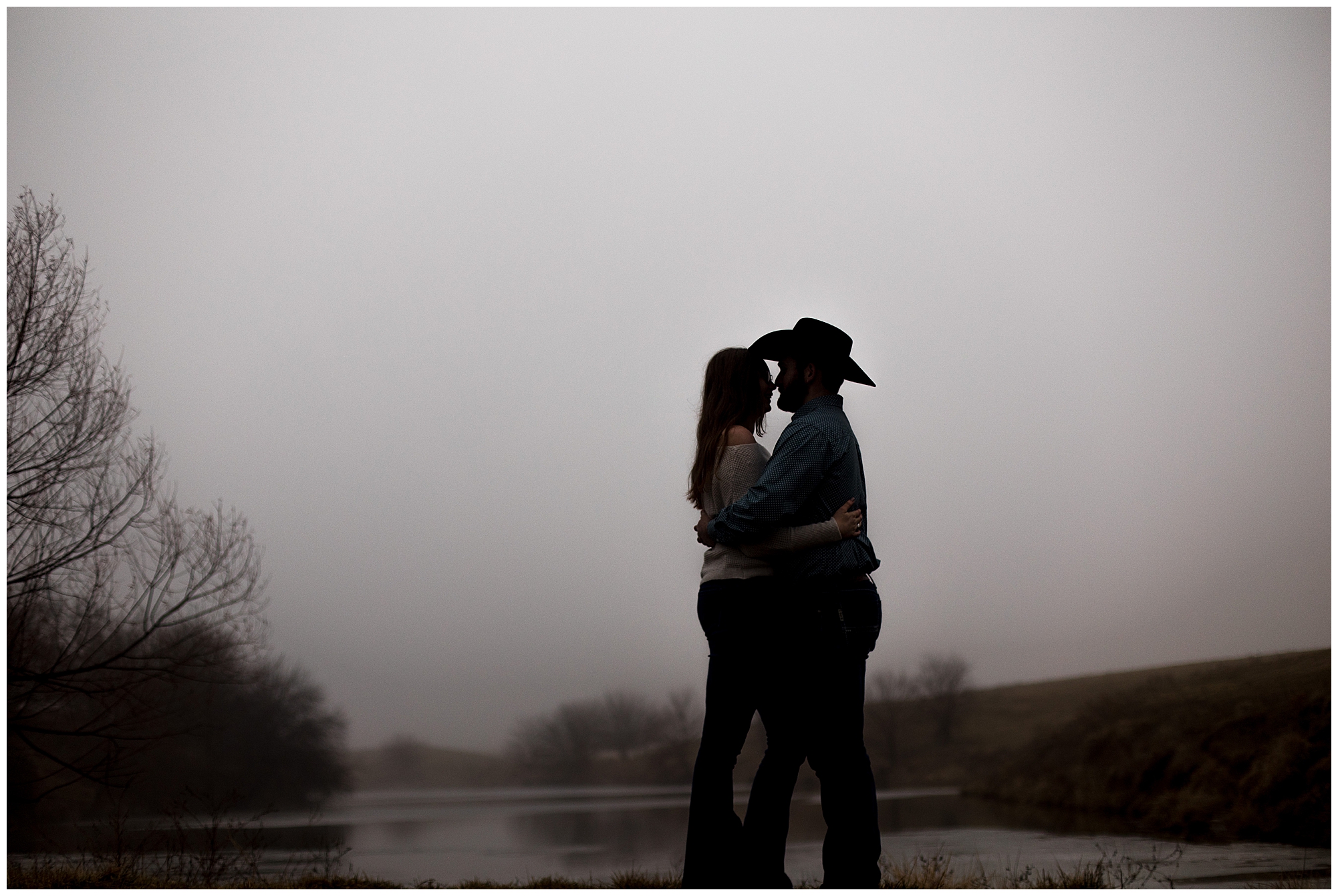 Once we finished up at the cabins, we headed to a familiar place…The amazing red barn! At this point in the evening, some fog had rolled in making for a unique background. I grabbed a few photos of this lovely couple in front of the barn before they changed into more laid back outfits. They even threw in an awesome cowhide, which was perfect! Rebecca and Trace are homegrown farm kids and share a special bond with one another. We decided to end our time together up by a pretty pond in one of the cow pastures. The foggy weather really put the focus on this adorable couple and made them pop in all the best ways! I’m thrilled to be a part of Rebecca and Trace’s big day coming up later this year!