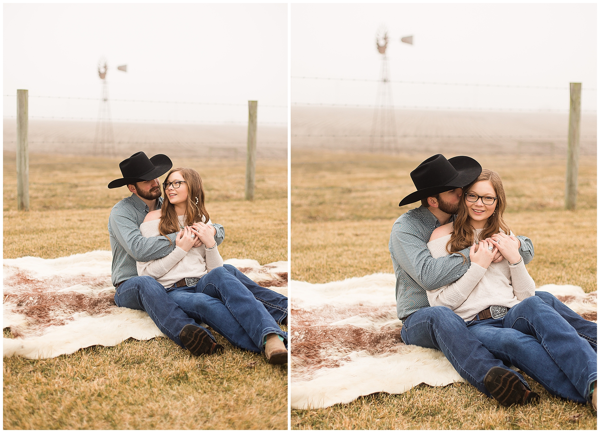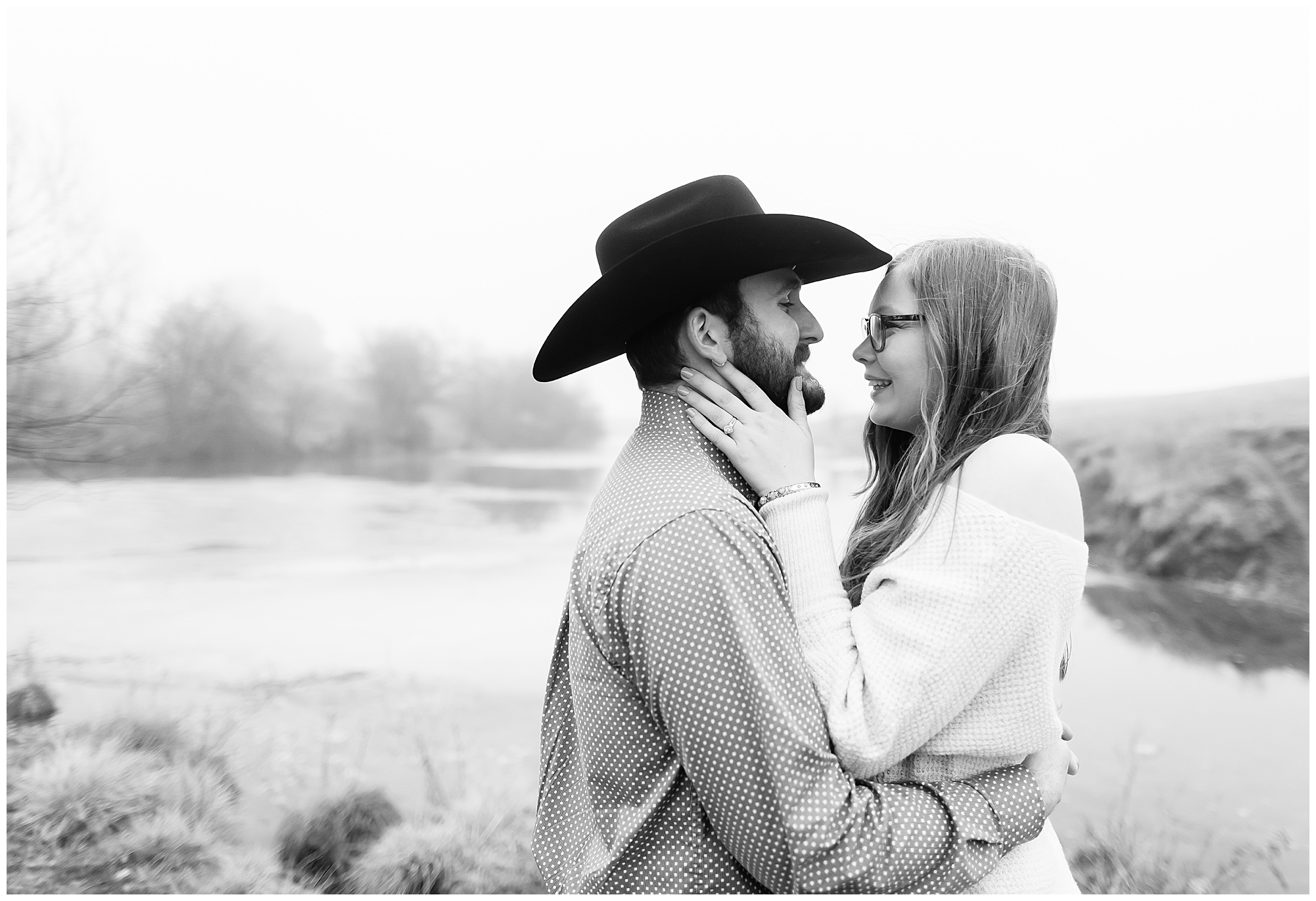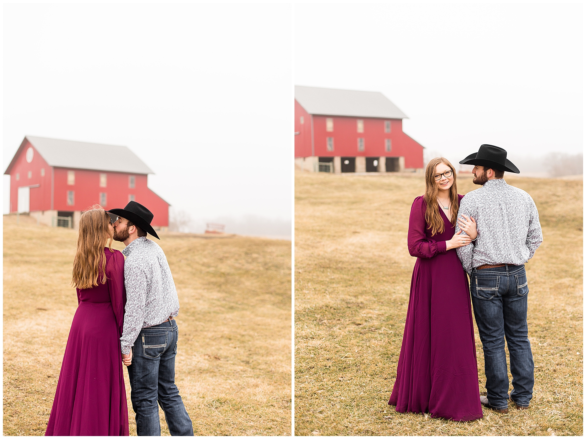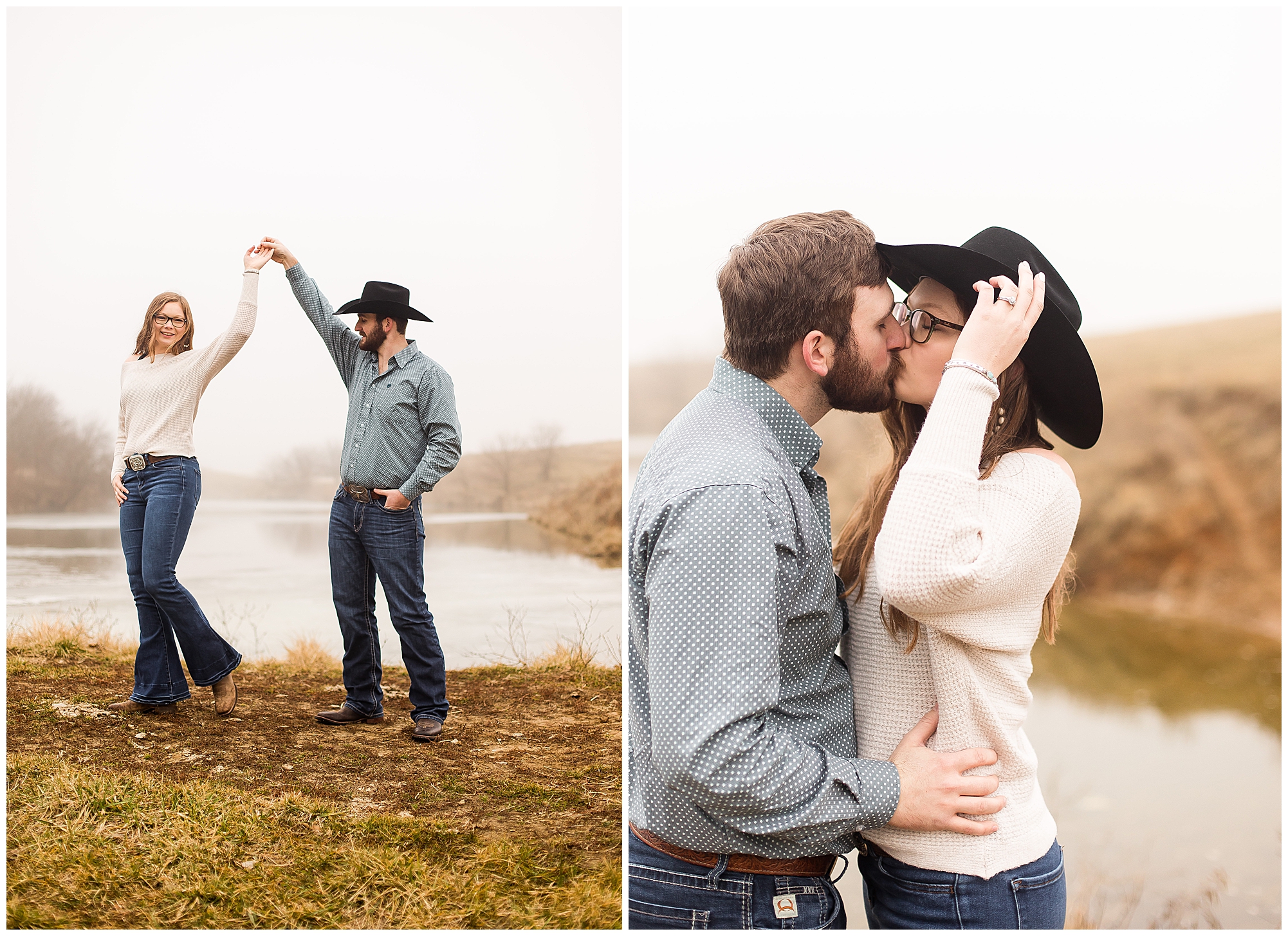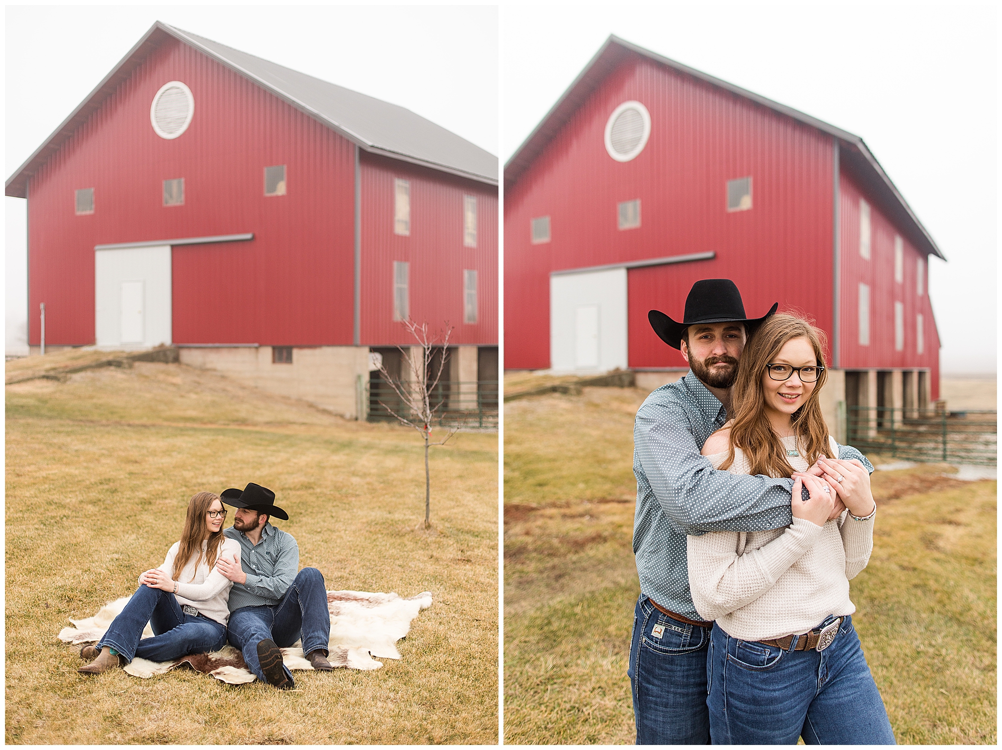 Once we finished up at the cabins, we headed to a familiar place…The amazing red barn! At this point in the evening, some fog had rolled in making for a unique background. I grabbed a few photos of this lovely couple in front of the barn before they changed into more laid back outfits. They even threw in an awesome cowhide, which was perfect! Rebecca and Trace are homegrown farm kids and share a special bond with one another. We decided to end our time together up by a pretty pond in one of the cow pastures. The foggy weather really put the focus on this adorable couple and made them pop in all the best ways! I’m thrilled to be a part of Rebecca and Trace’s big day coming up later this year!