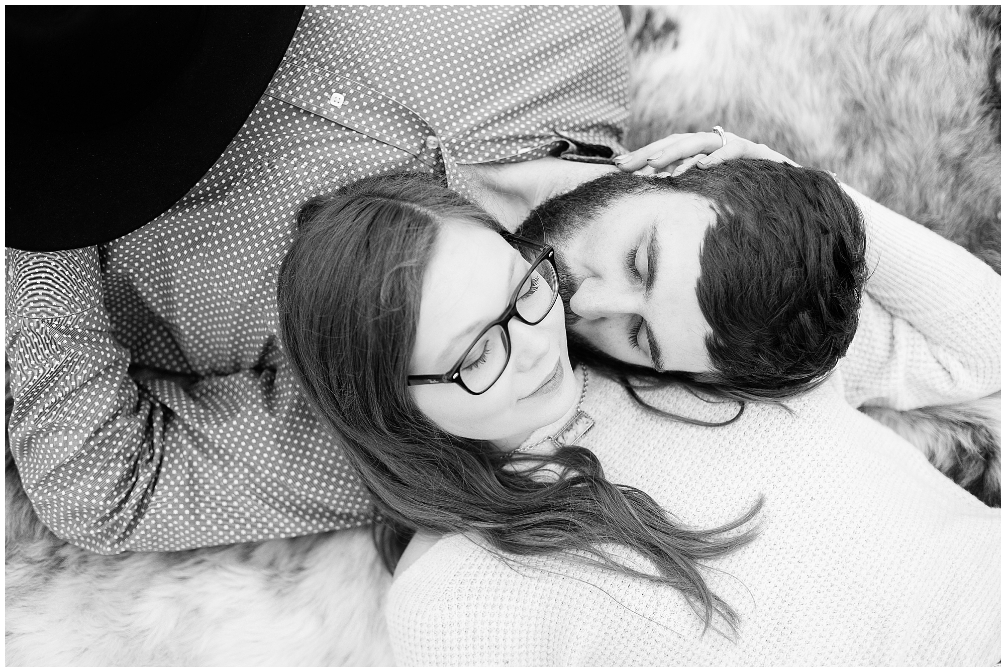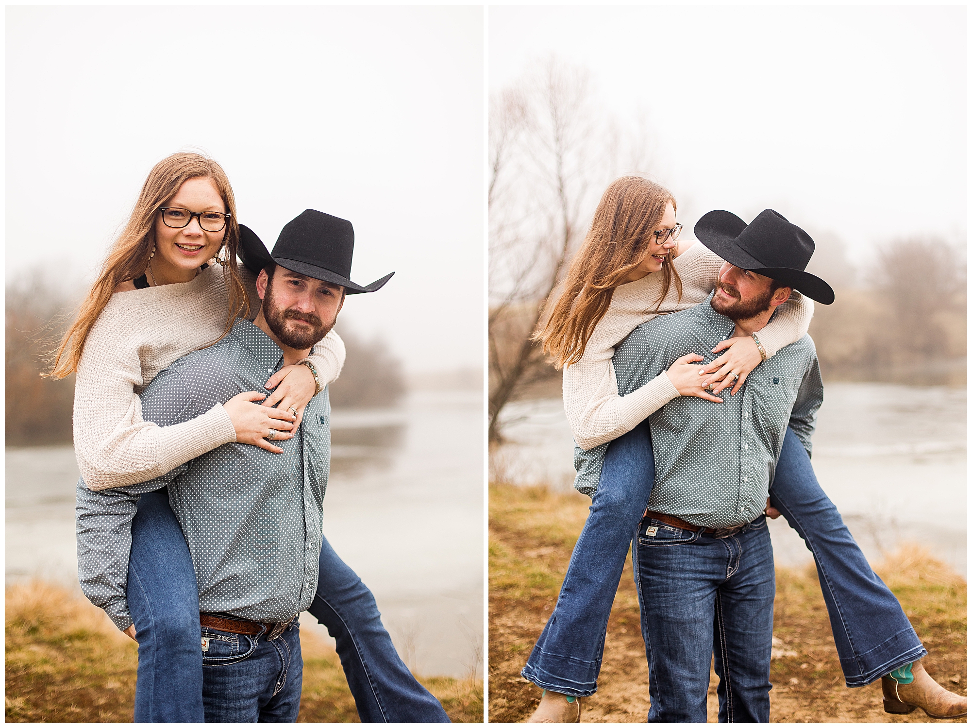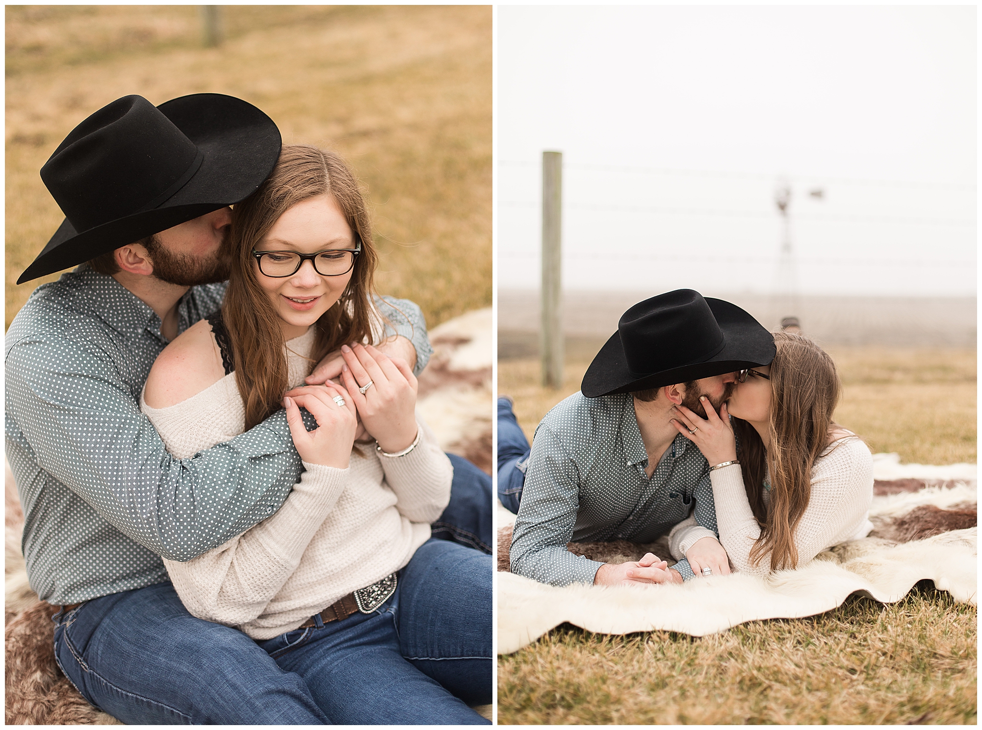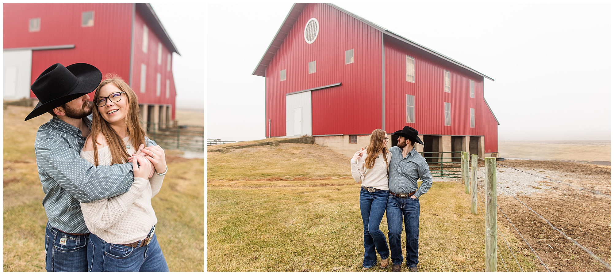 Once we finished up at the cabins, we headed to a familiar place…The amazing red barn! At this point in the evening, some fog had rolled in making for a unique background. I grabbed a few photos of this lovely couple in front of the barn before they changed into more laid back outfits. They even threw in an awesome cowhide, which was perfect! Rebecca and Trace are homegrown farm kids and share a special bond with one another. We decided to end our time together up by a pretty pond in one of the cow pastures. The foggy weather really put the focus on this adorable couple and made them pop in all the best ways! I’m thrilled to be a part of Rebecca and Trace’s big day coming up later this year!