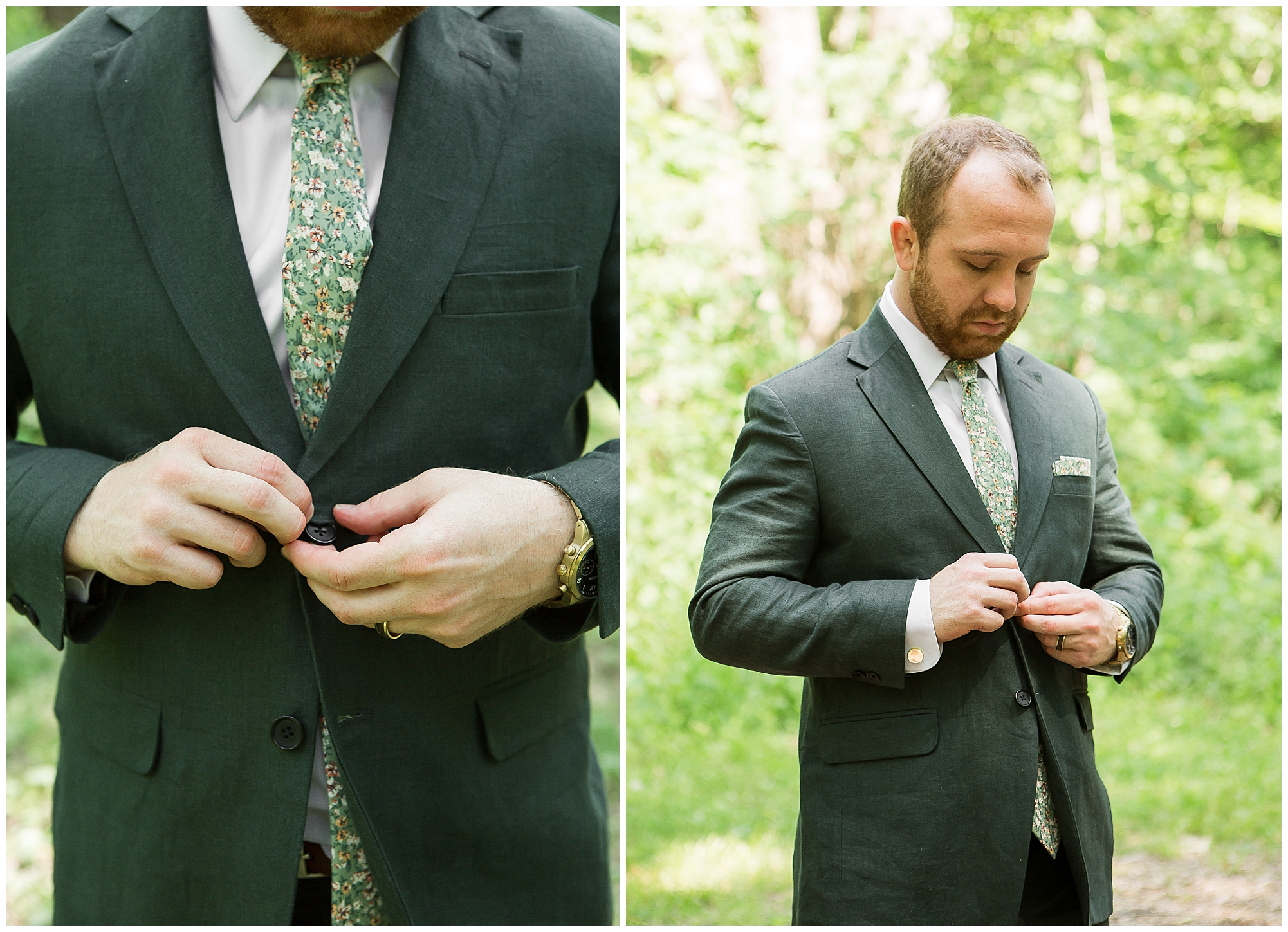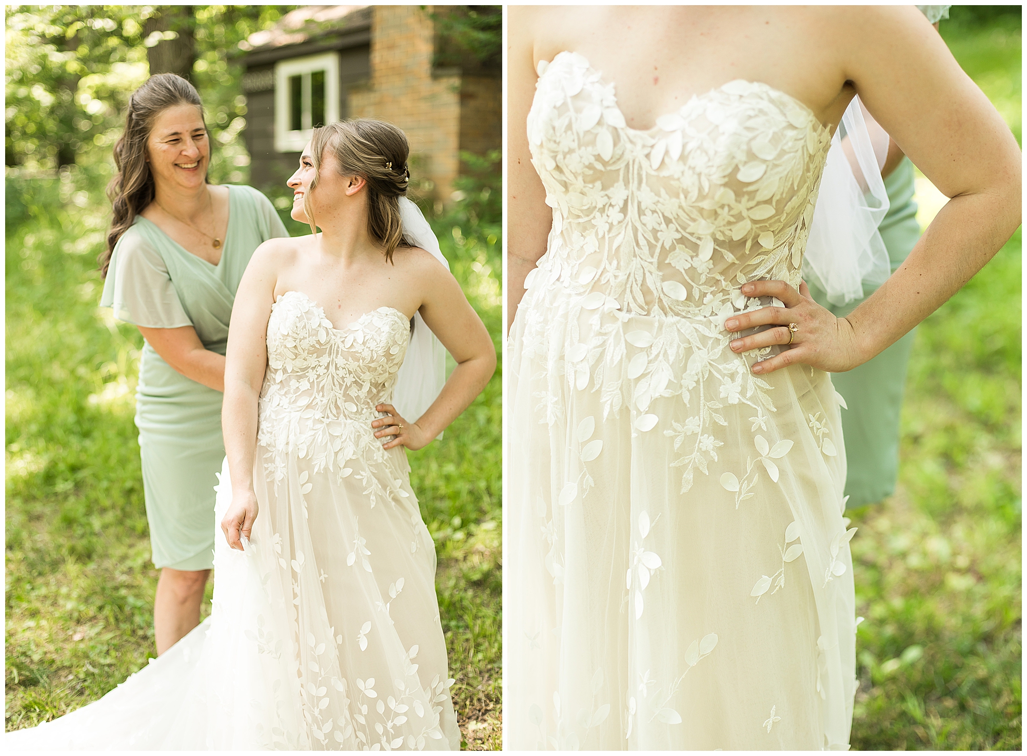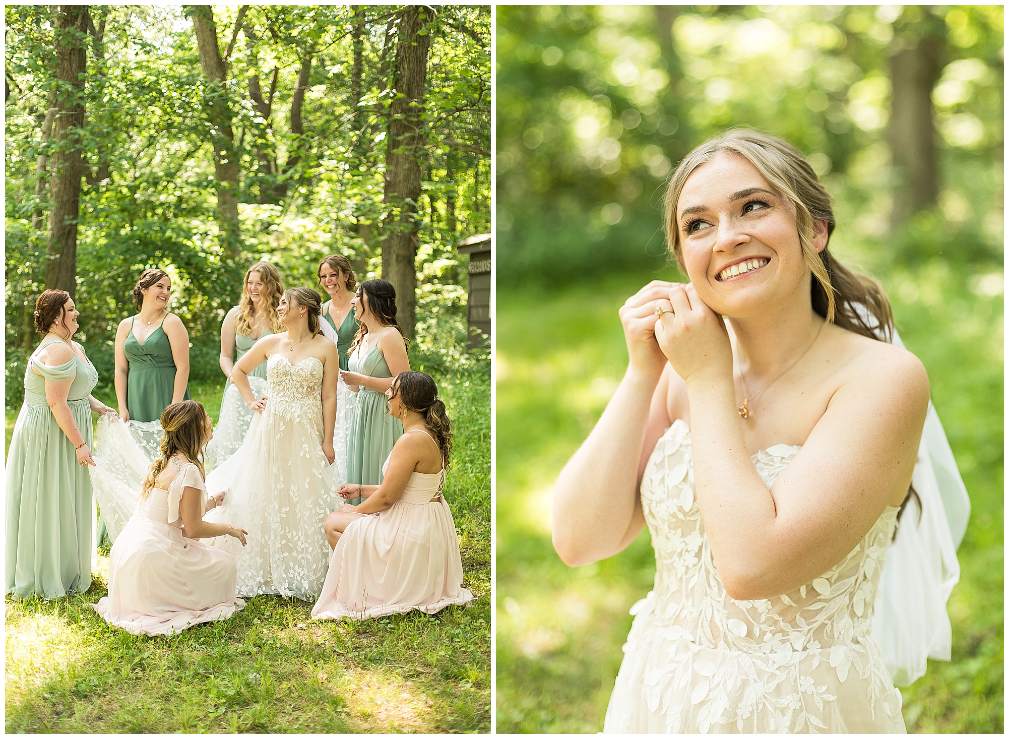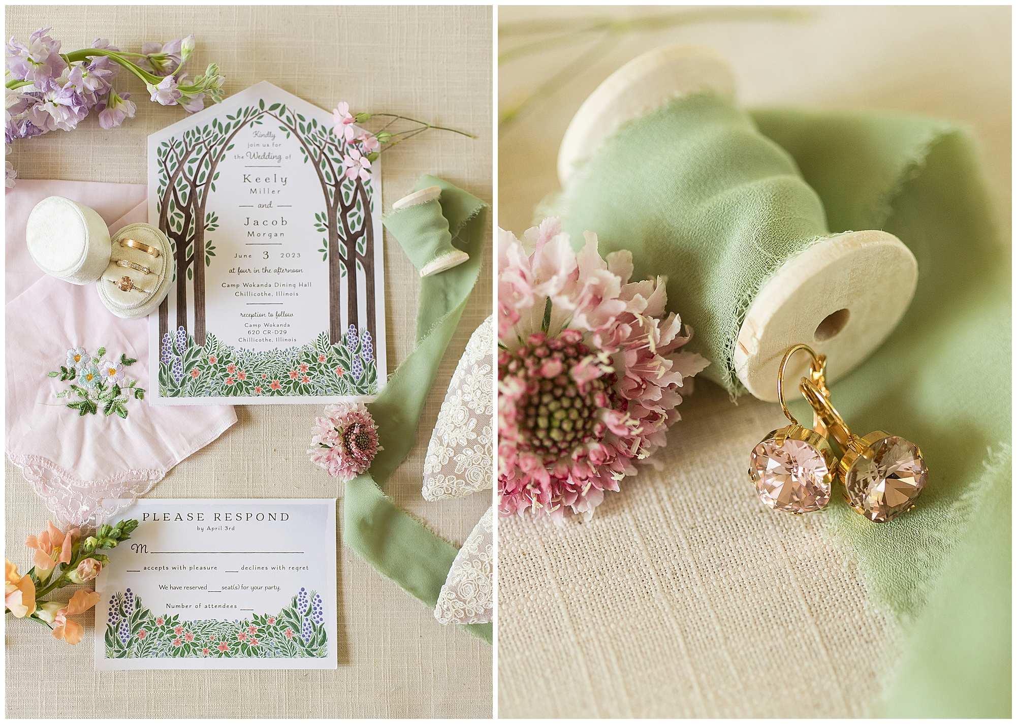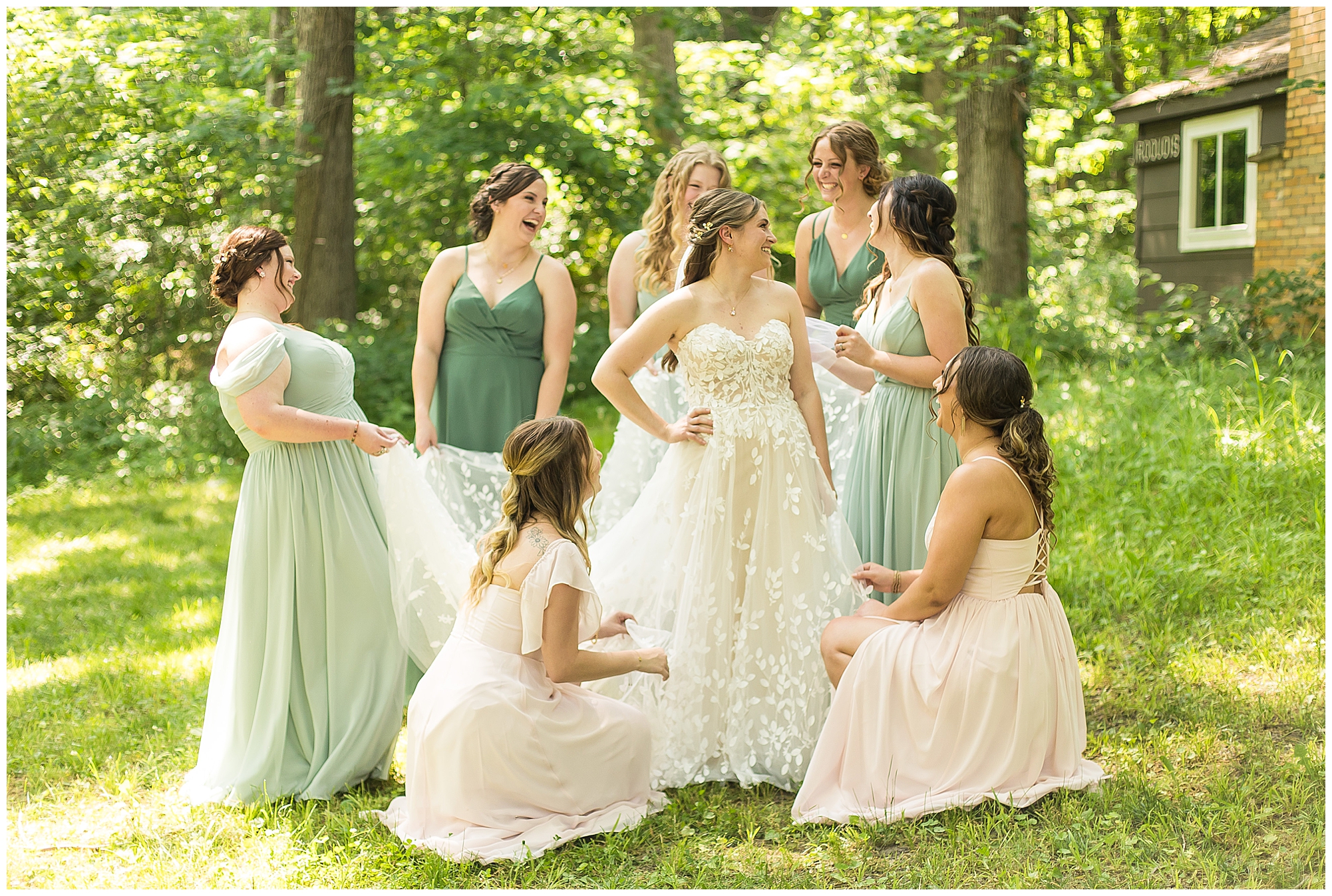 The day was finally here! It felt like such a long time since I last saw Keely and Jake at their engagement session. Now their summer wedding day in the Peoria, Illinois area was here and I couldn’t be more excited! I met up with Keely and the girls at the home she and Jake share for a morning of hair, makeup, and lots of laughter. I already saw a few friendly faces as I photographed Keely’s sister, Mackenzie’s wedding a couple of years ago as well as some other lovely bridesmaids from past weddings. It makes my heart so happy to work with families many times over. Keely’s details were absolutely gorgeous and the amazing textures and colors of her flowers were impeccable! The bridesmaids wore different shades of greens and pinks to go along with the enchanted forest theme. Before we knew it, we made our way to the beautiful Camp Wokanda venue to get Keely dressed. She was glowing as she stepped into her tulle dress with delicate leaf appliqués which flowed when she moved. Absolutely stunning! Jake brought the style as well dressed in a deep emerald linen suit and a floral green and cream tie with matching pocket square. What a statement!