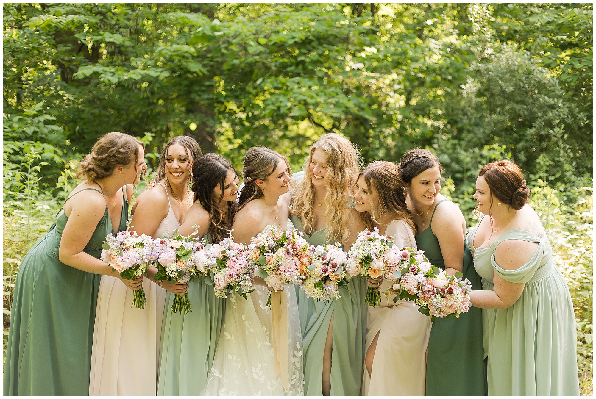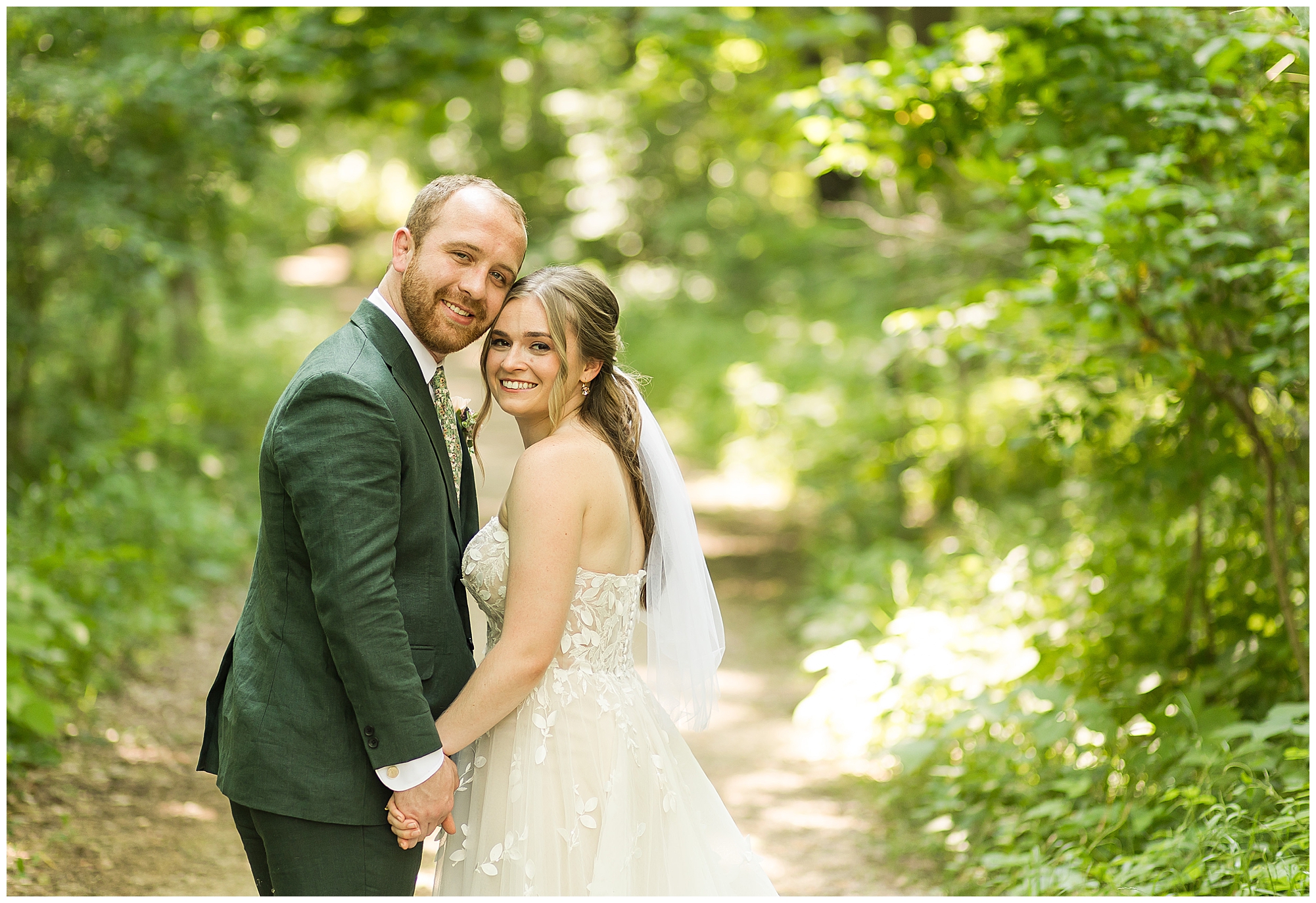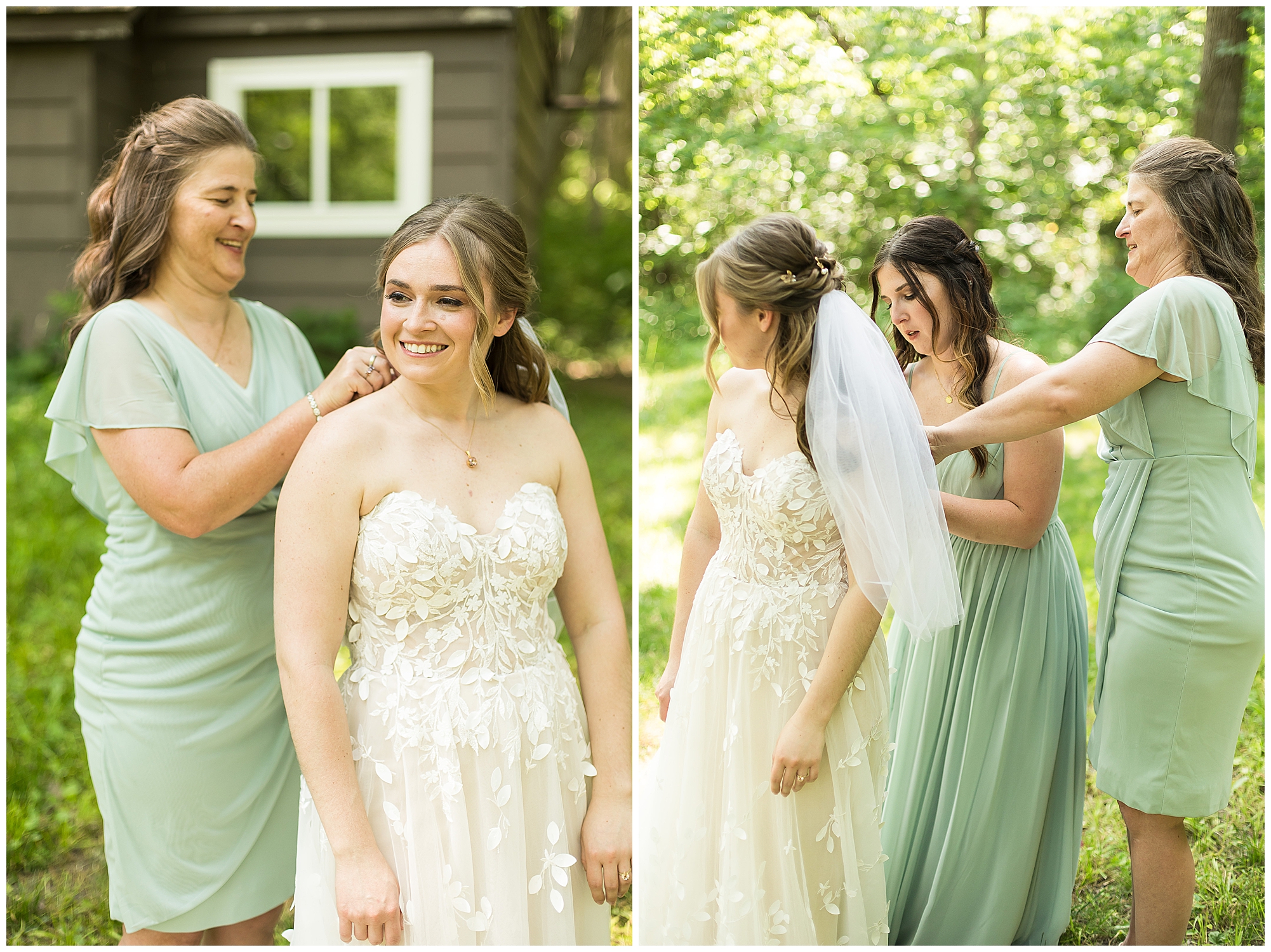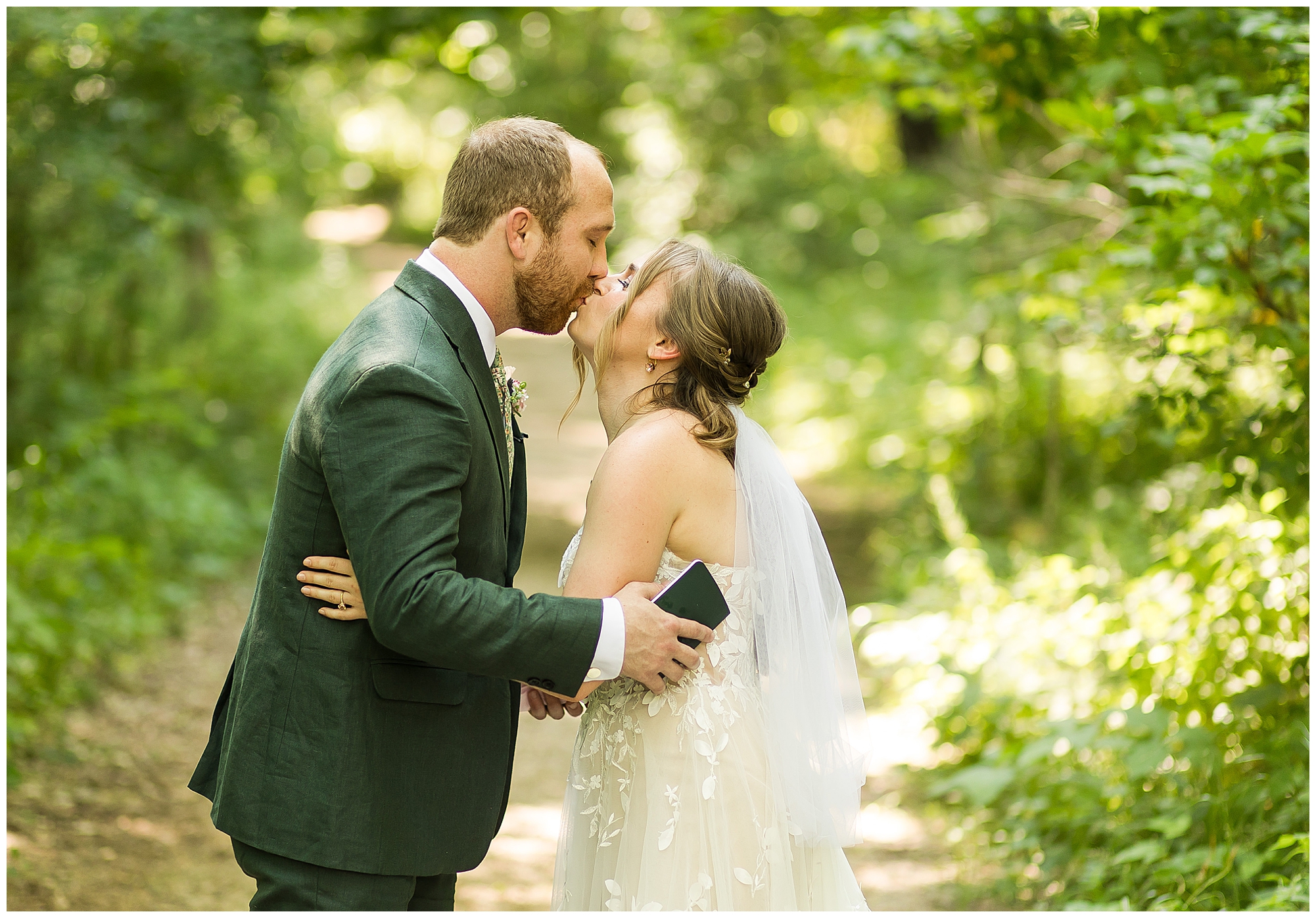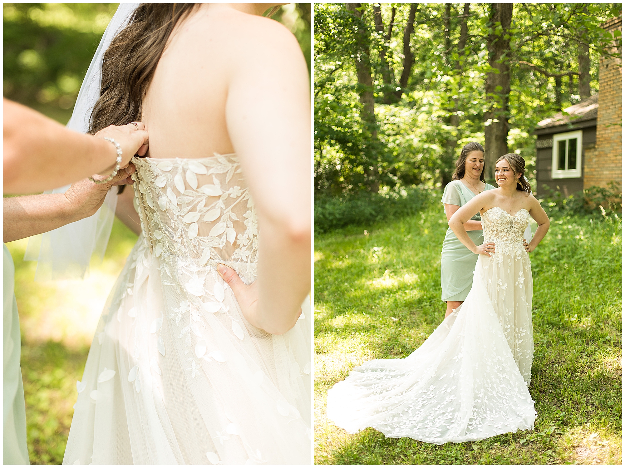 The day was finally here! It felt like such a long time since I last saw Keely and Jake at their engagement session. Now their summer wedding day in the Peoria, Illinois area was here and I couldn’t be more excited! I met up with Keely and the girls at the home she and Jake share for a morning of hair, makeup, and lots of laughter. I already saw a few friendly faces as I photographed Keely’s sister, Mackenzie’s wedding a couple of years ago as well as some other lovely bridesmaids from past weddings. It makes my heart so happy to work with families many times over. Keely’s details were absolutely gorgeous and the amazing textures and colors of her flowers were impeccable! The bridesmaids wore different shades of greens and pinks to go along with the enchanted forest theme. Before we knew it, we made our way to the beautiful Camp Wokanda venue to get Keely dressed. She was glowing as she stepped into her tulle dress with delicate leaf appliqués which flowed when she moved. Absolutely stunning! Jake brought the style as well dressed in a deep emerald linen suit and a floral green and cream tie with matching pocket square. What a statement!