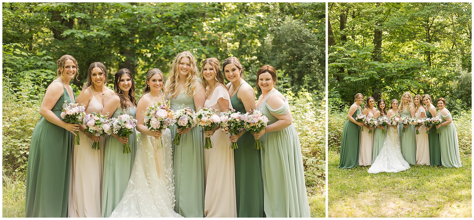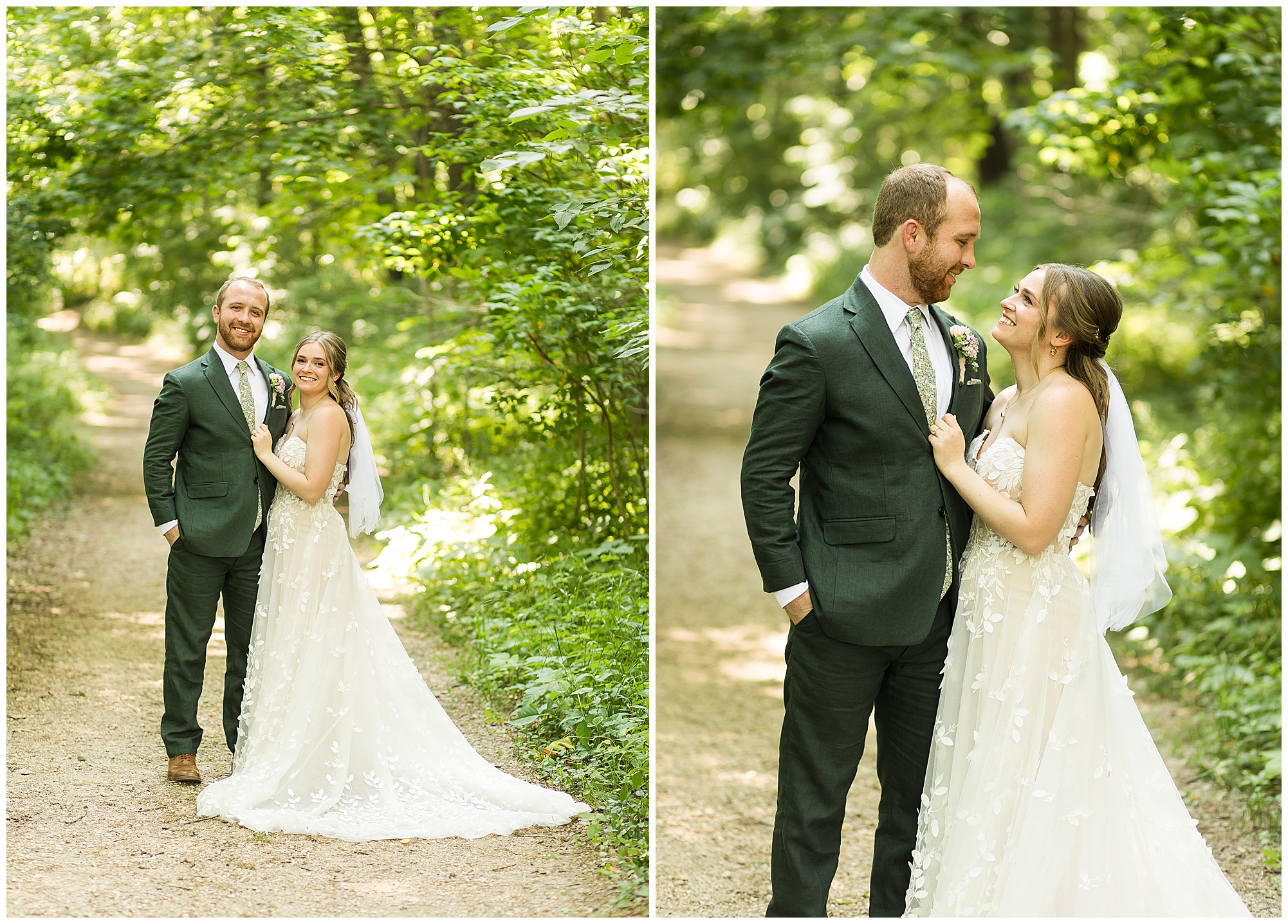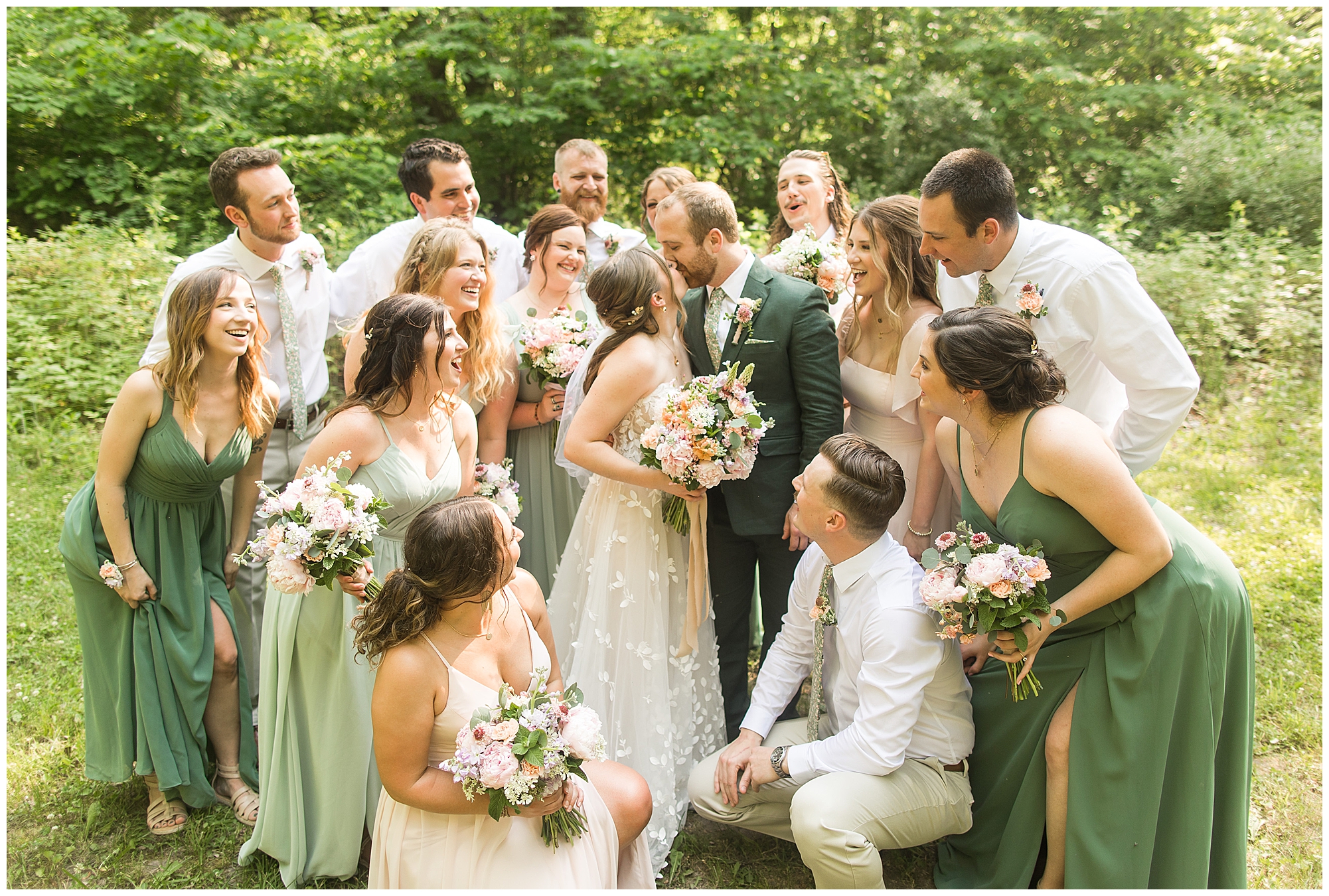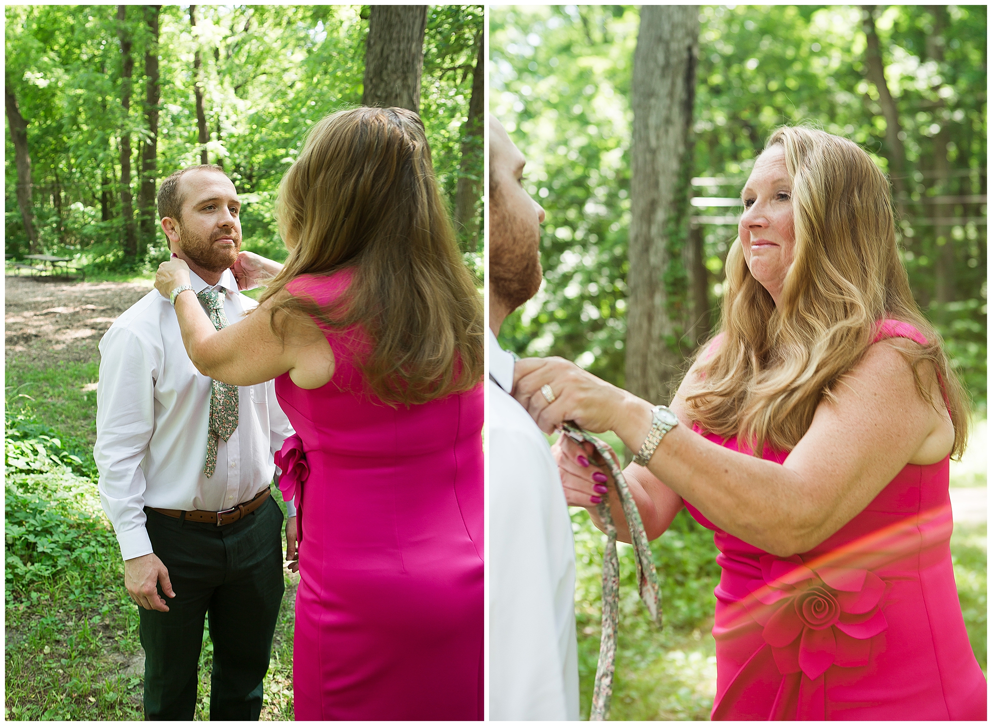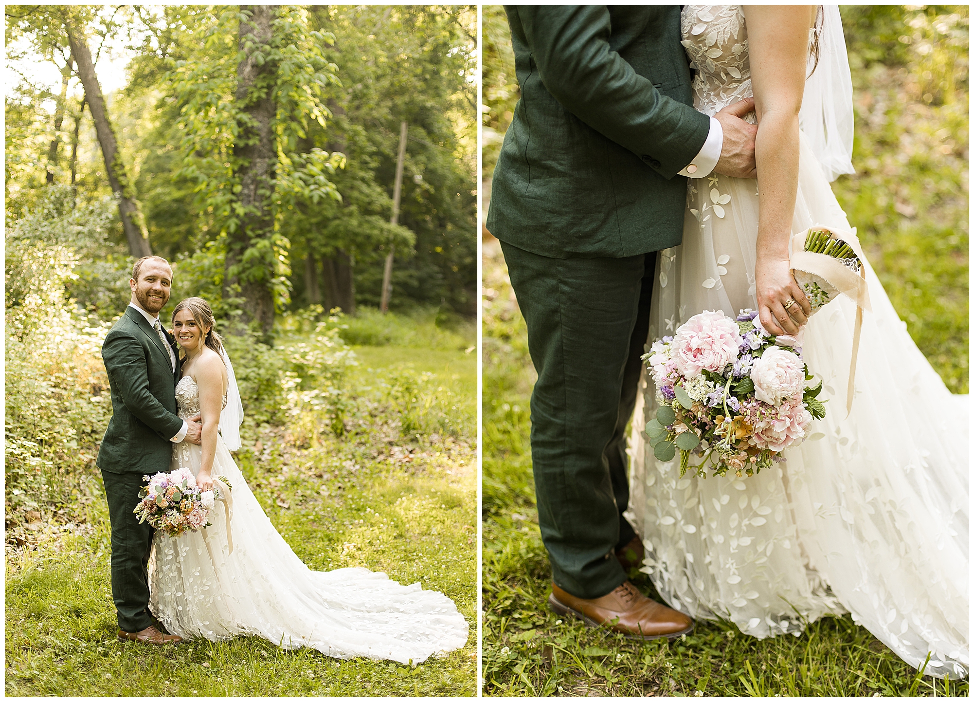 The day was finally here! It felt like such a long time since I last saw Keely and Jake at their engagement session. Now their summer wedding day in the Peoria, Illinois area was here and I couldn’t be more excited! I met up with Keely and the girls at the home she and Jake share for a morning of hair, makeup, and lots of laughter. I already saw a few friendly faces as I photographed Keely’s sister, Mackenzie’s wedding a couple of years ago as well as some other lovely bridesmaids from past weddings. It makes my heart so happy to work with families many times over. Keely’s details were absolutely gorgeous and the amazing textures and colors of her flowers were impeccable! The bridesmaids wore different shades of greens and pinks to go along with the enchanted forest theme. Before we knew it, we made our way to the beautiful Camp Wokanda venue to get Keely dressed. She was glowing as she stepped into her tulle dress with delicate leaf appliqués which flowed when she moved. Absolutely stunning! Jake brought the style as well dressed in a deep emerald linen suit and a floral green and cream tie with matching pocket square. What a statement!