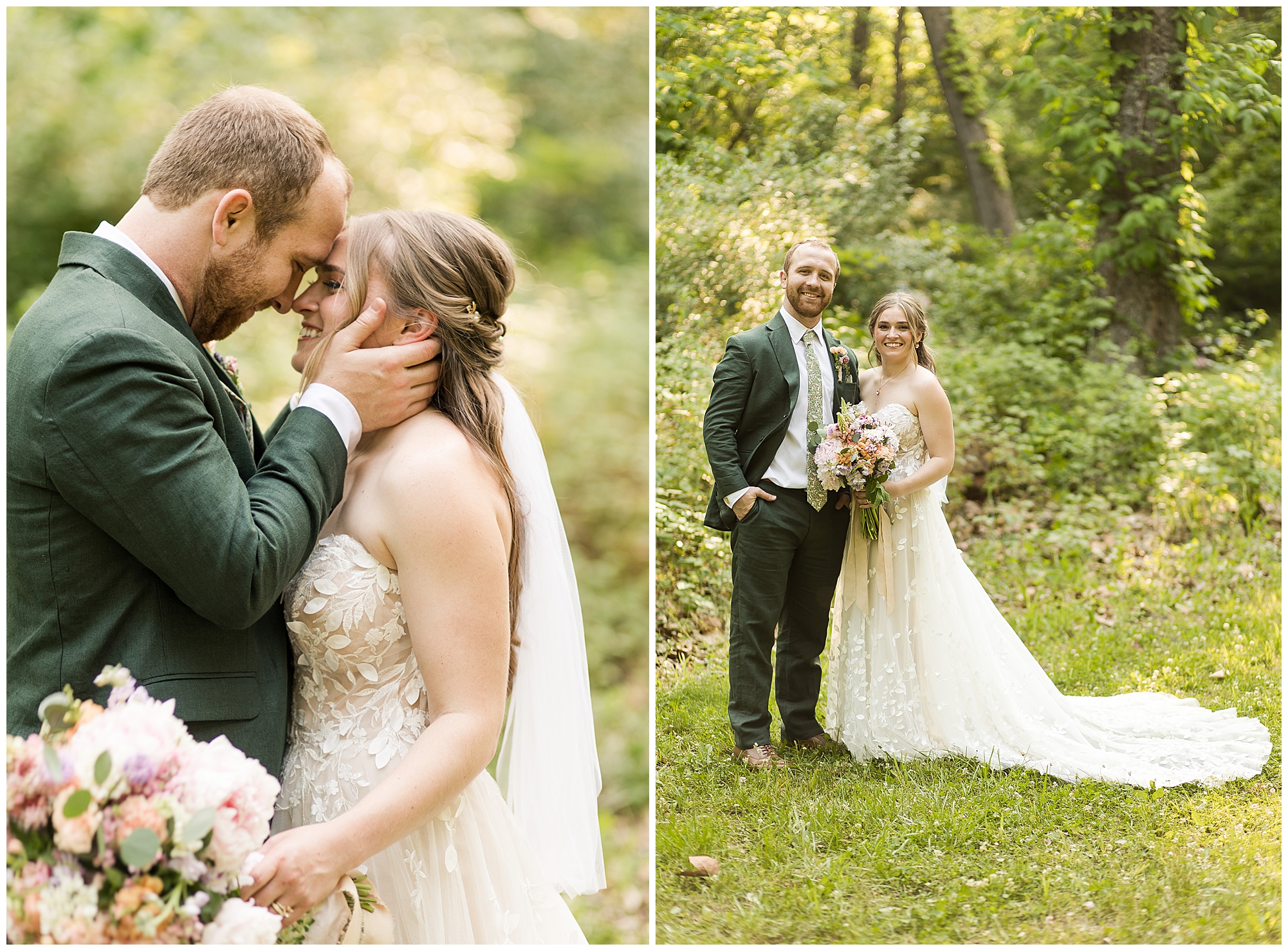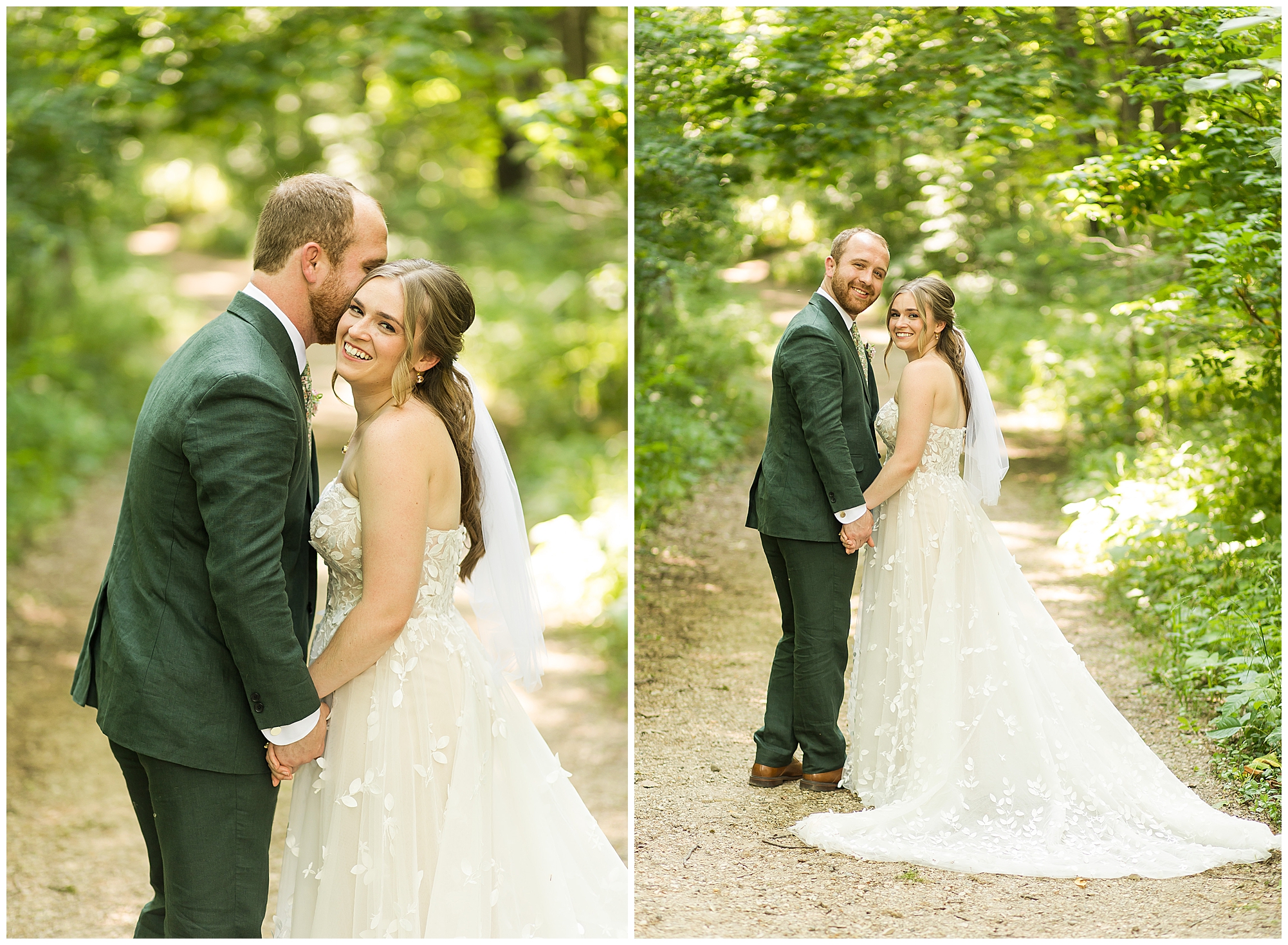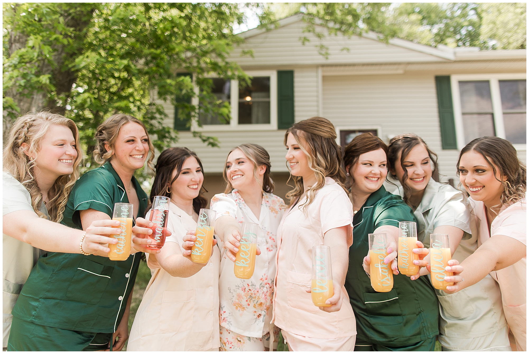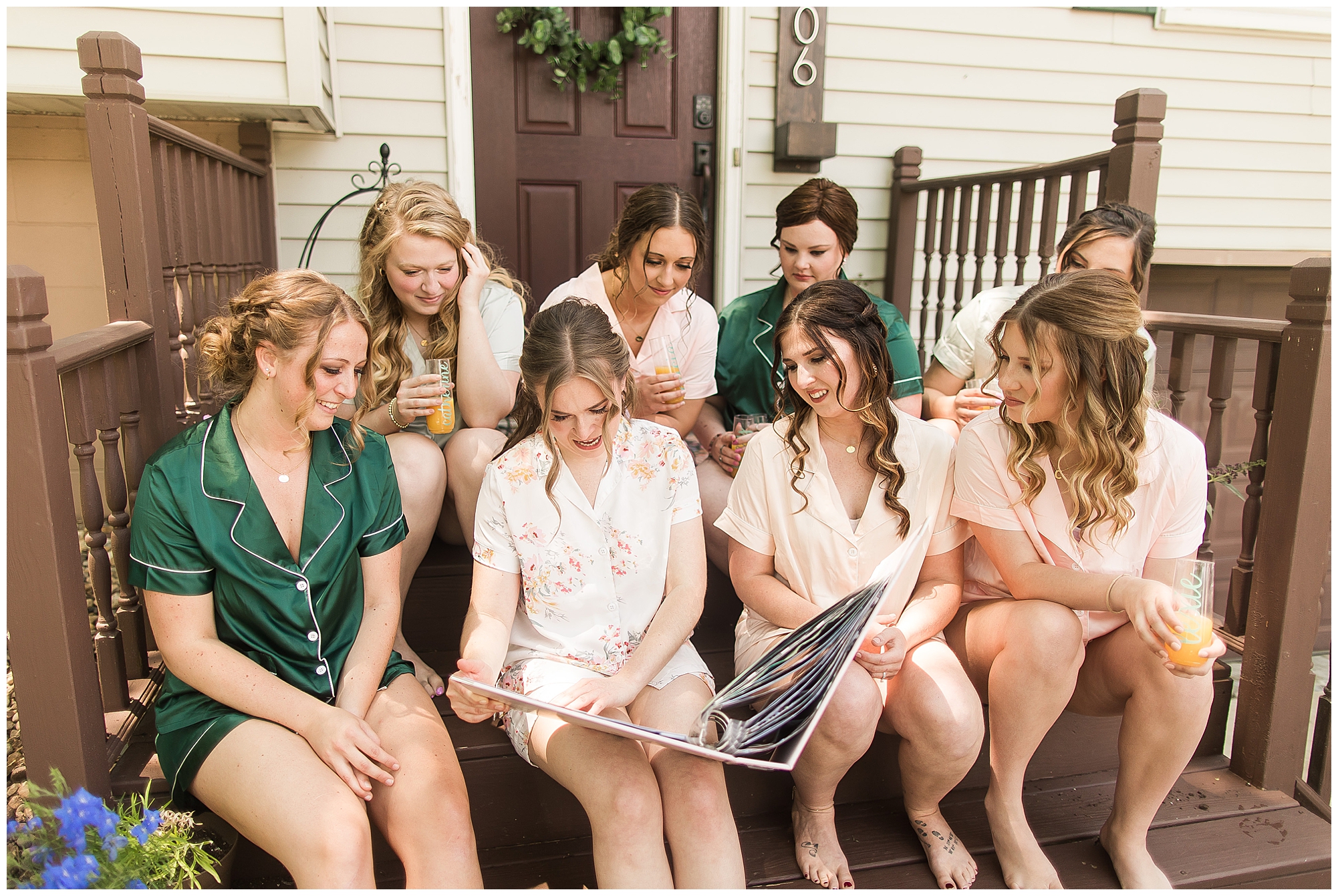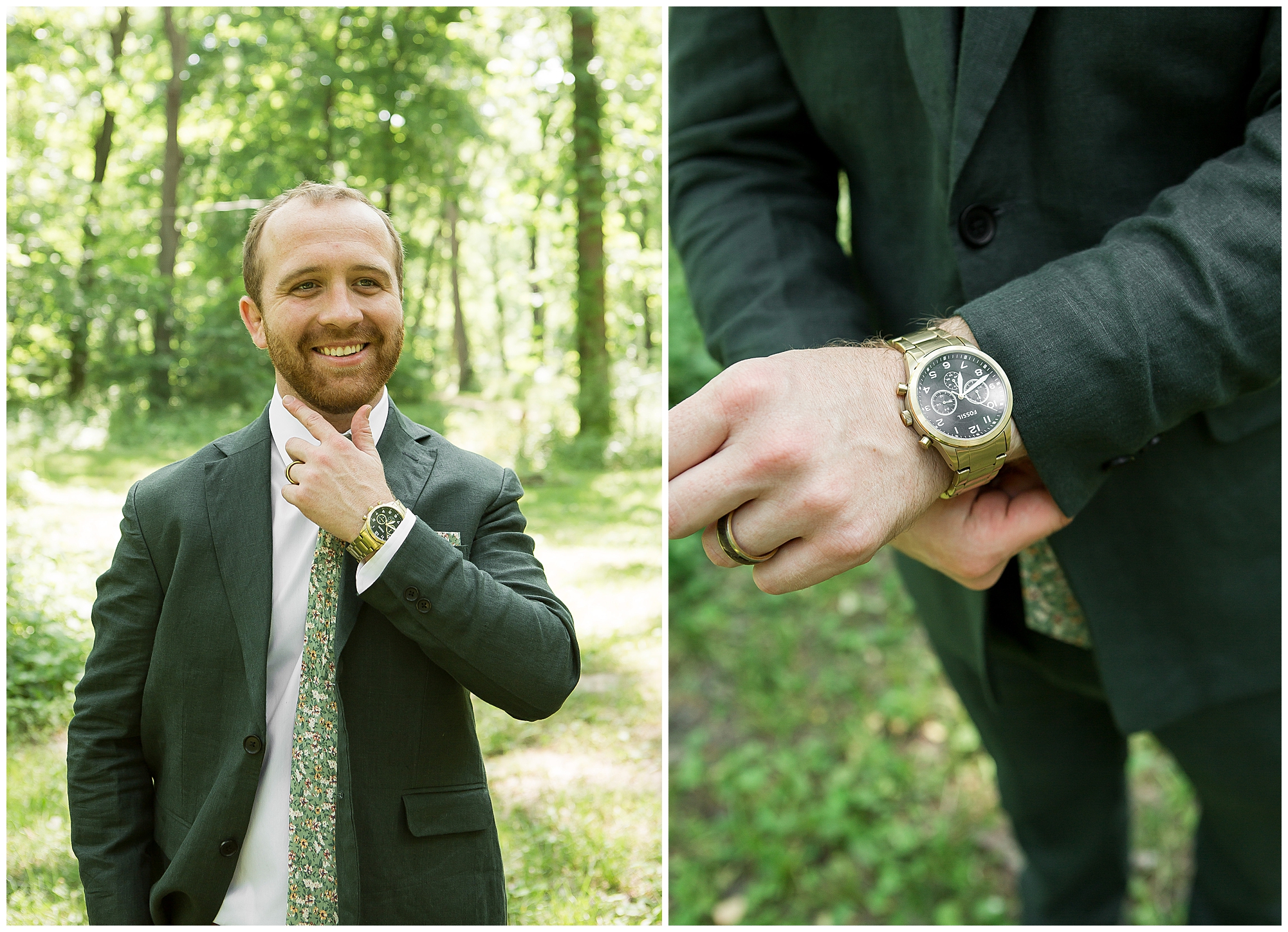 The day was finally here! It felt like such a long time since I last saw Keely and Jake at their engagement session. Now their summer wedding day in the Peoria, Illinois area was here and I couldn’t be more excited! I met up with Keely and the girls at the home she and Jake share for a morning of hair, makeup, and lots of laughter. I already saw a few friendly faces as I photographed Keely’s sister, Mackenzie’s wedding a couple of years ago as well as some other lovely bridesmaids from past weddings. It makes my heart so happy to work with families many times over. Keely’s details were absolutely gorgeous and the amazing textures and colors of her flowers were impeccable! The bridesmaids wore different shades of greens and pinks to go along with the enchanted forest theme. Before we knew it, we made our way to the beautiful Camp Wokanda venue to get Keely dressed. She was glowing as she stepped into her tulle dress with delicate leaf appliqués which flowed when she moved. Absolutely stunning! Jake brought the style as well dressed in a deep emerald linen suit and a floral green and cream tie with matching pocket square. What a statement!