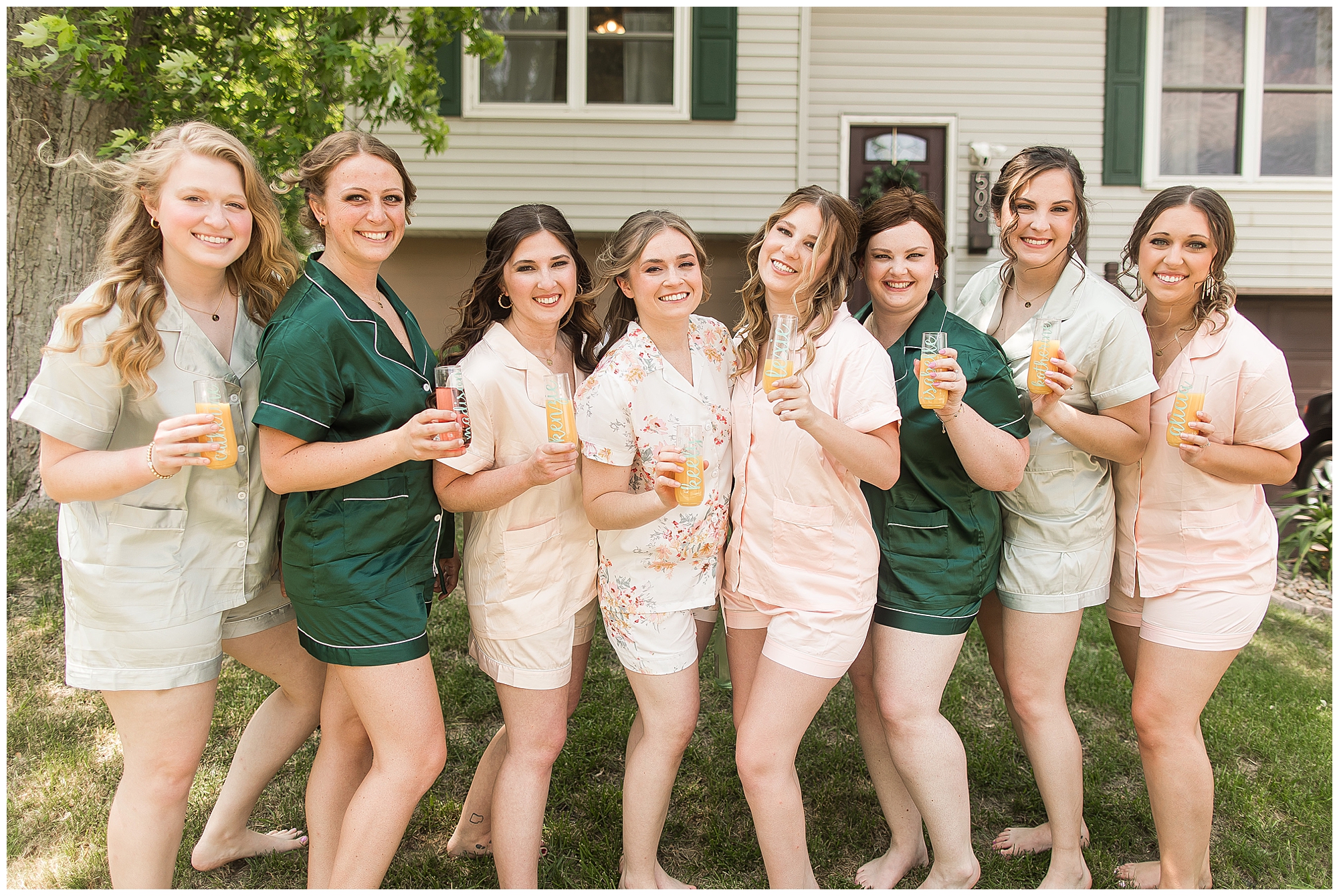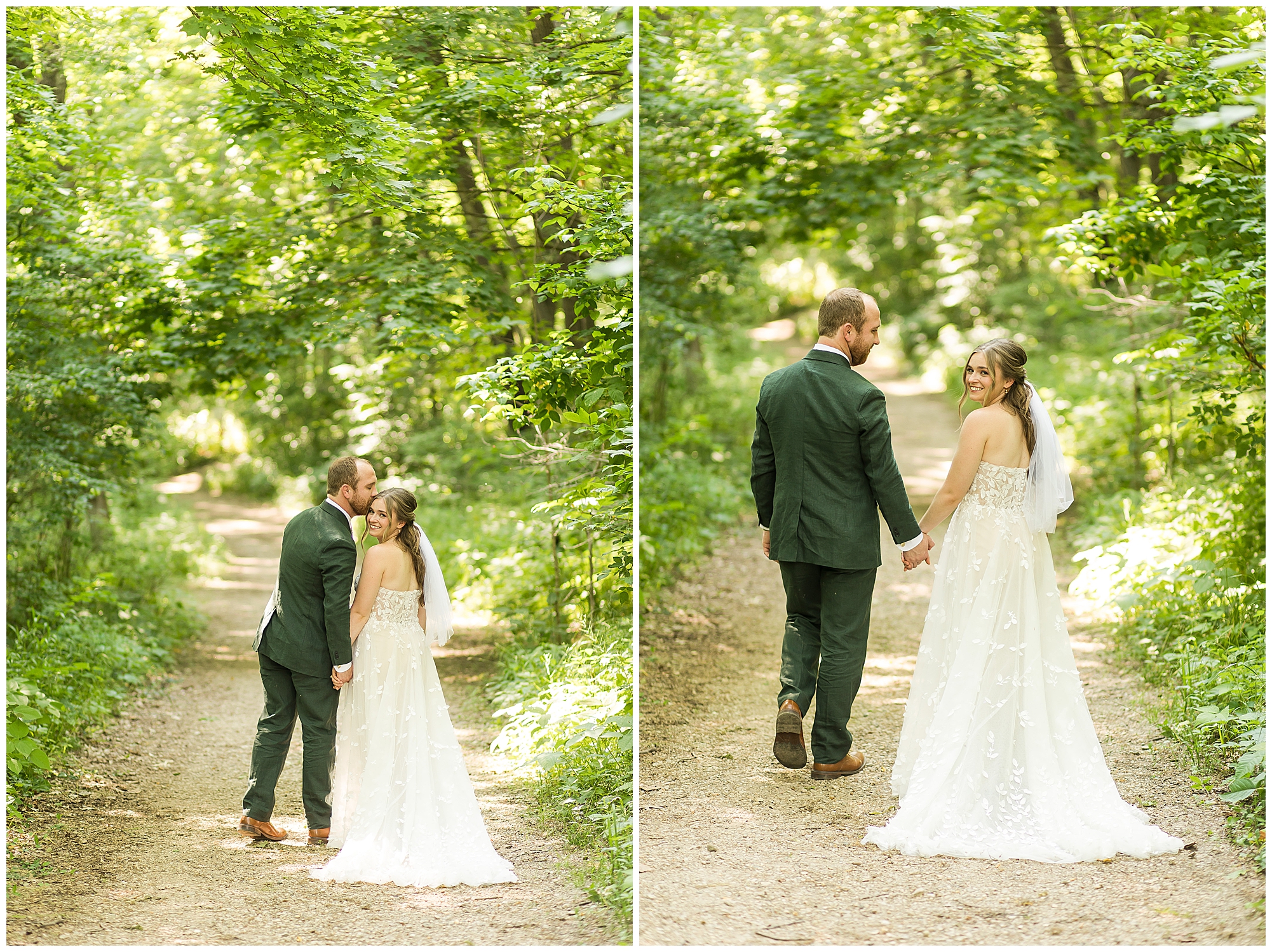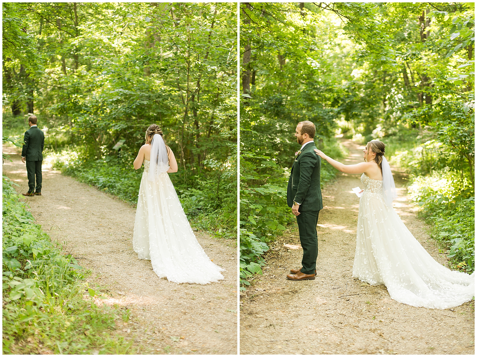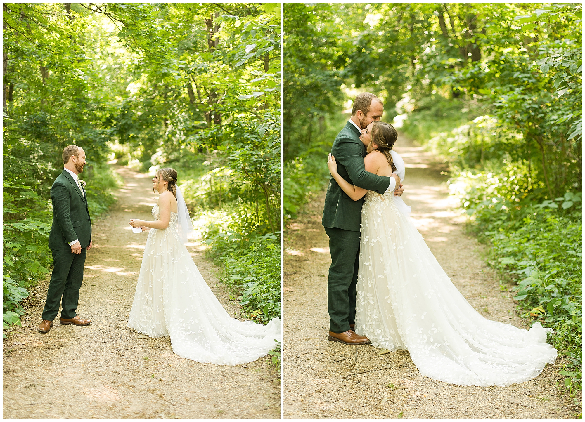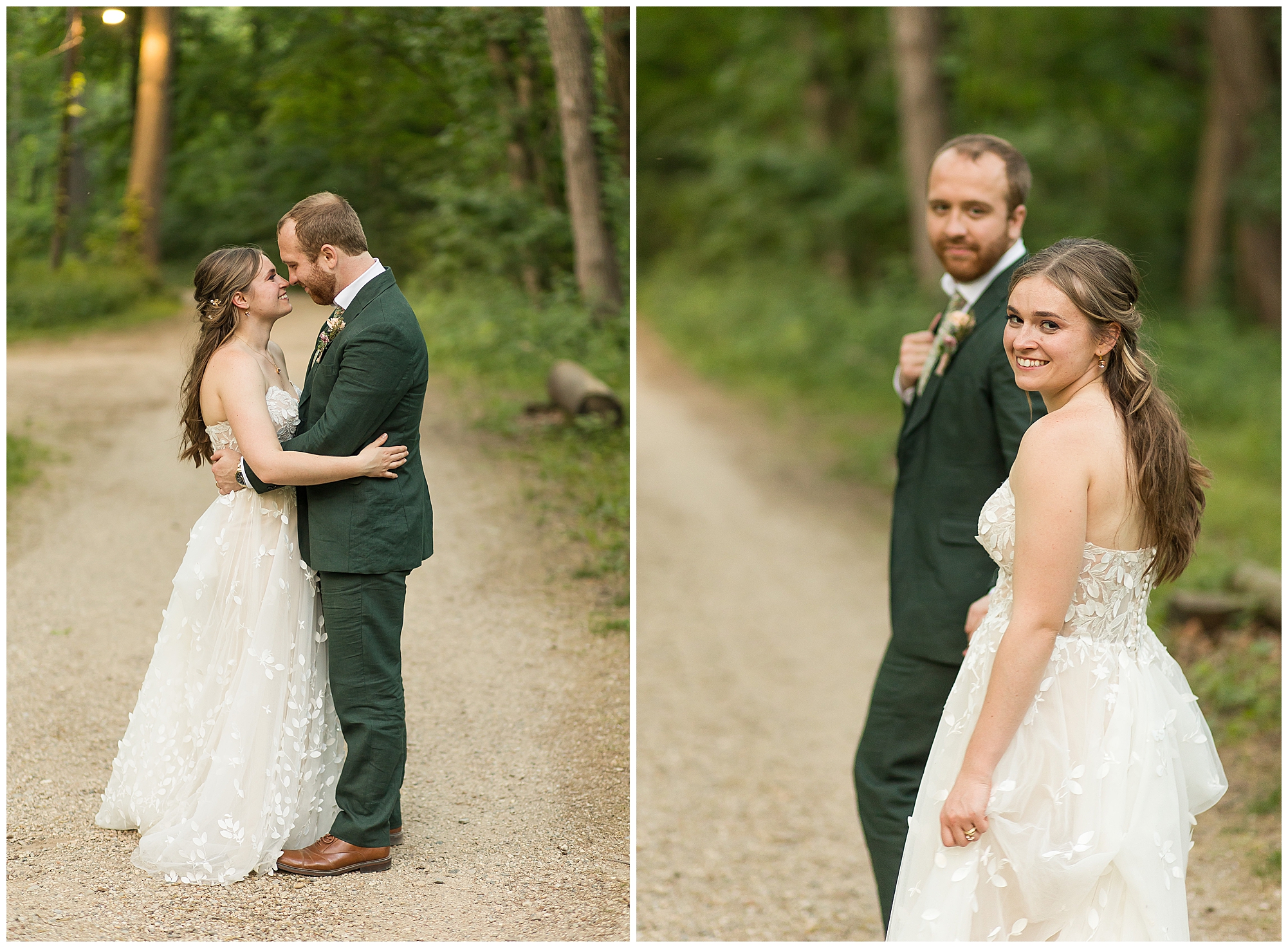 The day was finally here! It felt like such a long time since I last saw Keely and Jake at their engagement session. Now their summer wedding day in the Peoria, Illinois area was here and I couldn’t be more excited! I met up with Keely and the girls at the home she and Jake share for a morning of hair, makeup, and lots of laughter. I already saw a few friendly faces as I photographed Keely’s sister, Mackenzie’s wedding a couple of years ago as well as some other lovely bridesmaids from past weddings. It makes my heart so happy to work with families many times over. Keely’s details were absolutely gorgeous and the amazing textures and colors of her flowers were impeccable! The bridesmaids wore different shades of greens and pinks to go along with the enchanted forest theme. Before we knew it, we made our way to the beautiful Camp Wokanda venue to get Keely dressed. She was glowing as she stepped into her tulle dress with delicate leaf appliqués which flowed when she moved. Absolutely stunning! Jake brought the style as well dressed in a deep emerald linen suit and a floral green and cream tie with matching pocket square. What a statement!