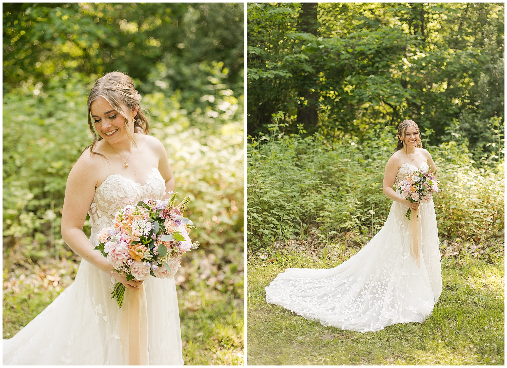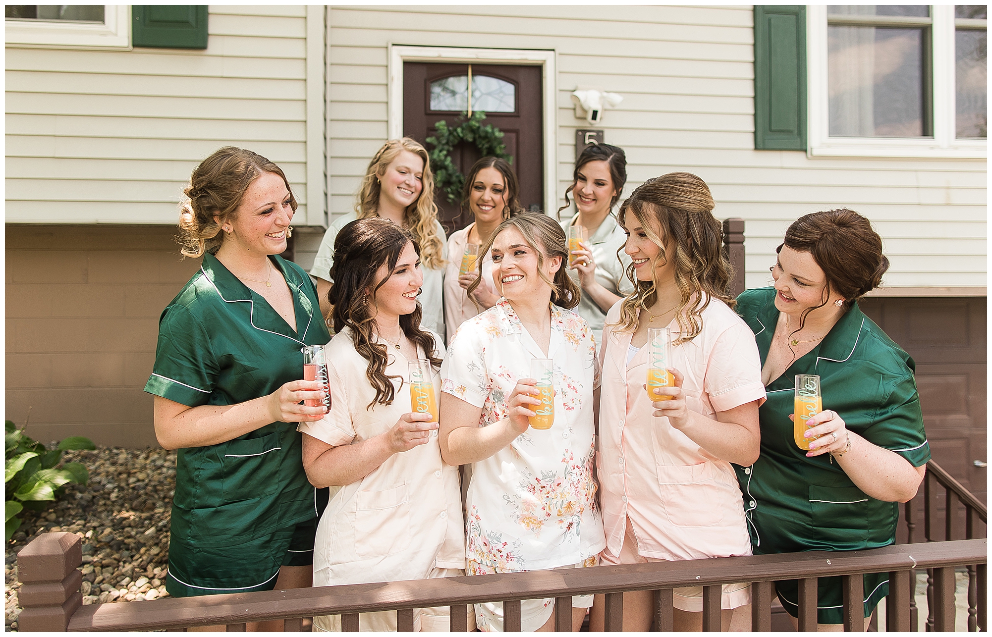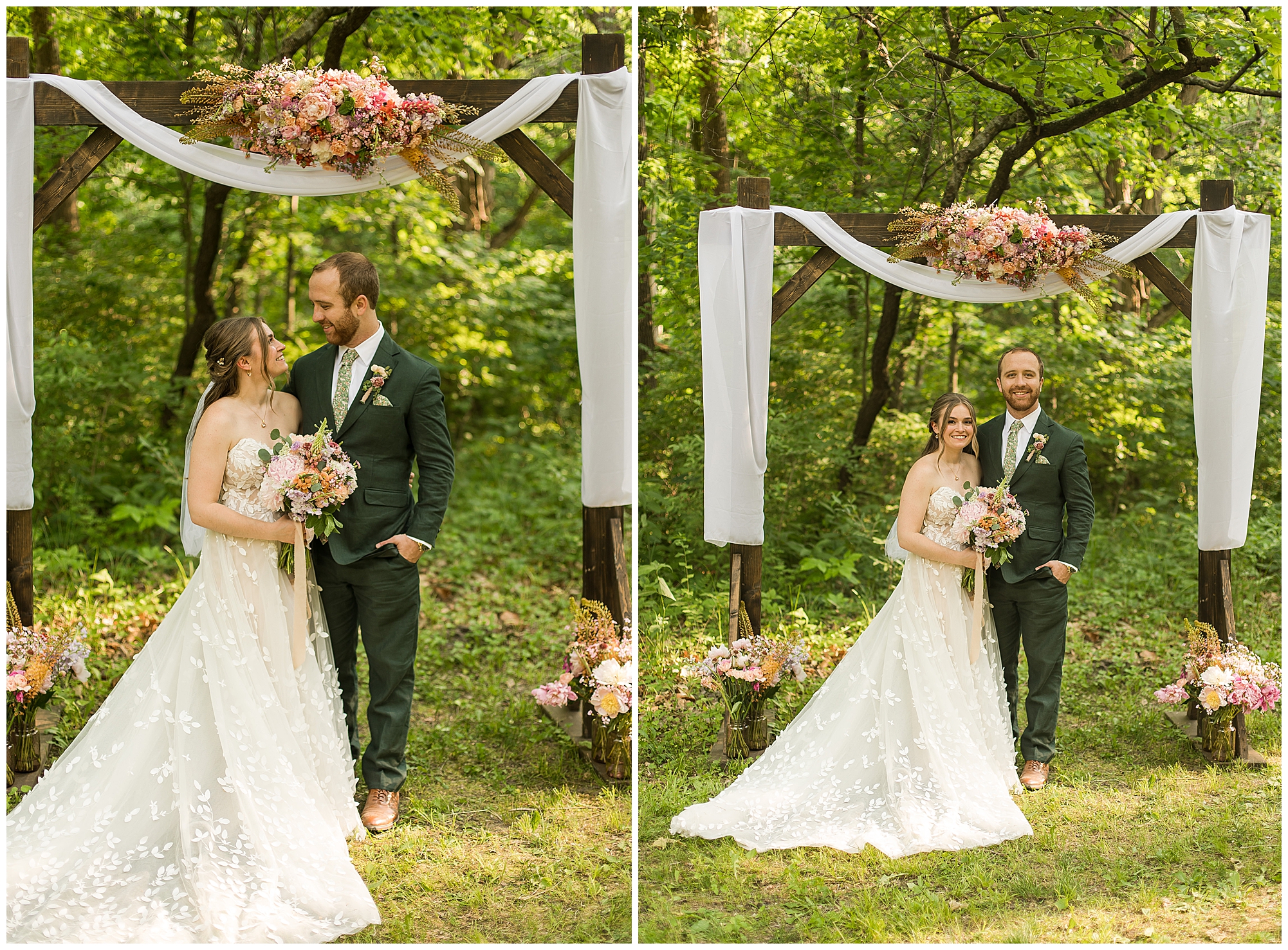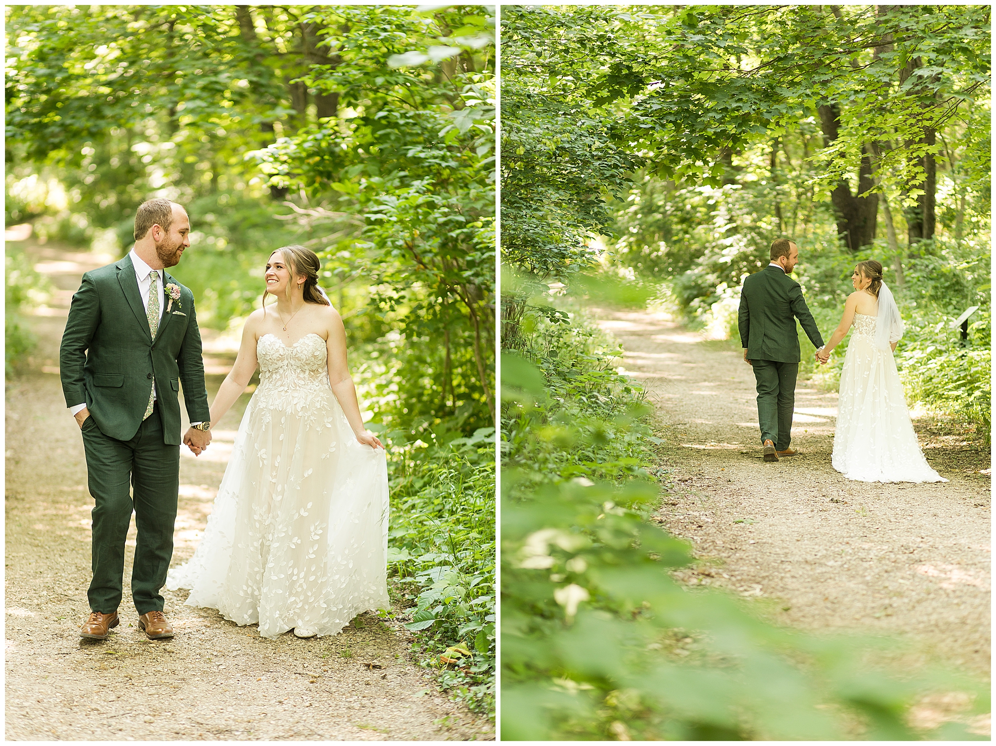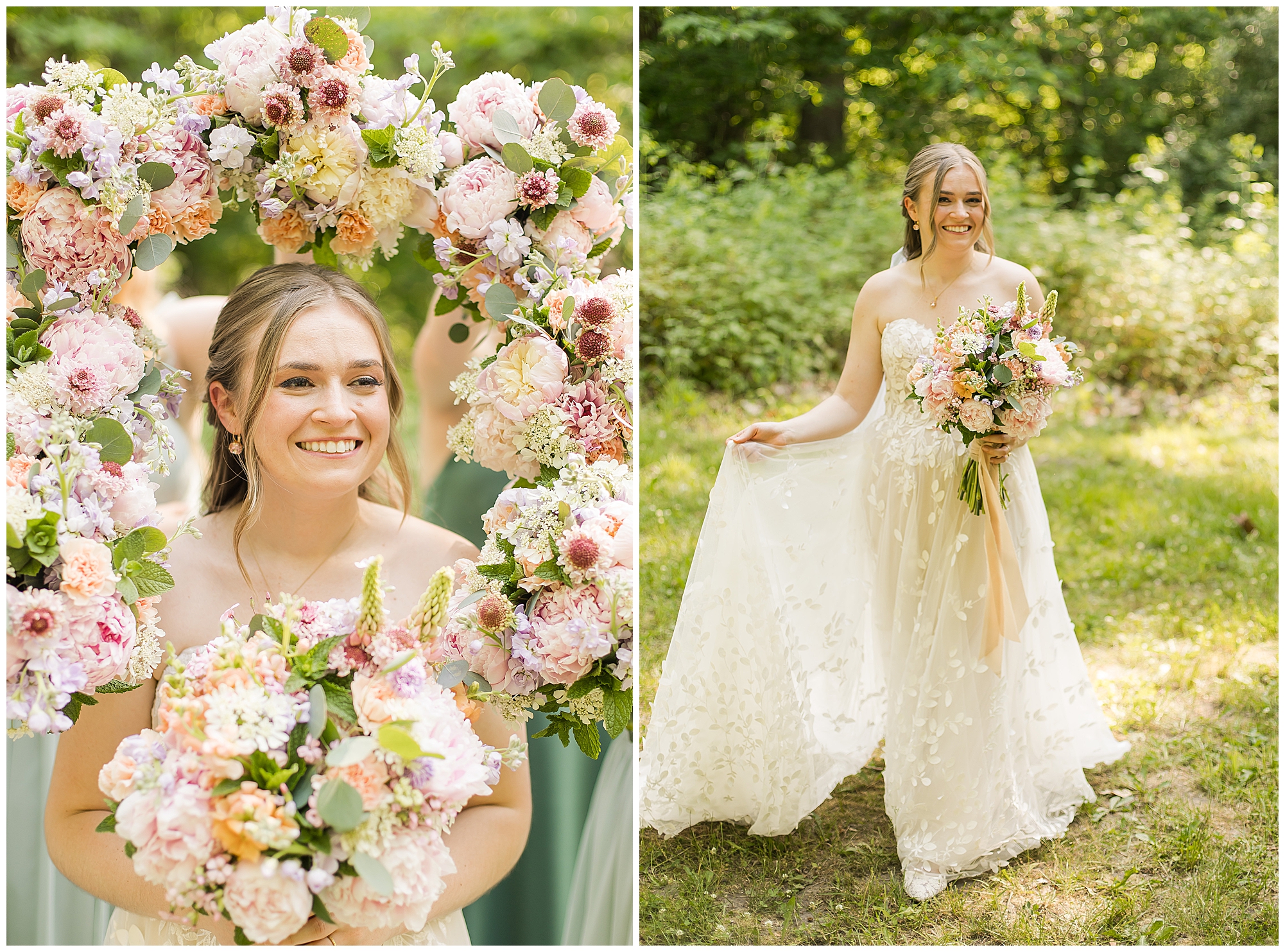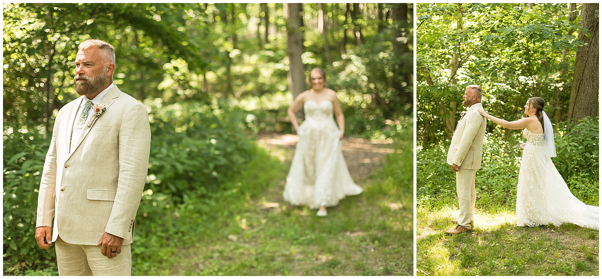 The day was finally here! It felt like such a long time since I last saw Keely and Jake at their engagement session. Now their summer wedding day in the Peoria, Illinois area was here and I couldn’t be more excited! I met up with Keely and the girls at the home she and Jake share for a morning of hair, makeup, and lots of laughter. I already saw a few friendly faces as I photographed Keely’s sister, Mackenzie’s wedding a couple of years ago as well as some other lovely bridesmaids from past weddings. It makes my heart so happy to work with families many times over. Keely’s details were absolutely gorgeous and the amazing textures and colors of her flowers were impeccable! The bridesmaids wore different shades of greens and pinks to go along with the enchanted forest theme. Before we knew it, we made our way to the beautiful Camp Wokanda venue to get Keely dressed. She was glowing as she stepped into her tulle dress with delicate leaf appliqués which flowed when she moved. Absolutely stunning! Jake brought the style as well dressed in a deep emerald linen suit and a floral green and cream tie with matching pocket square. What a statement!