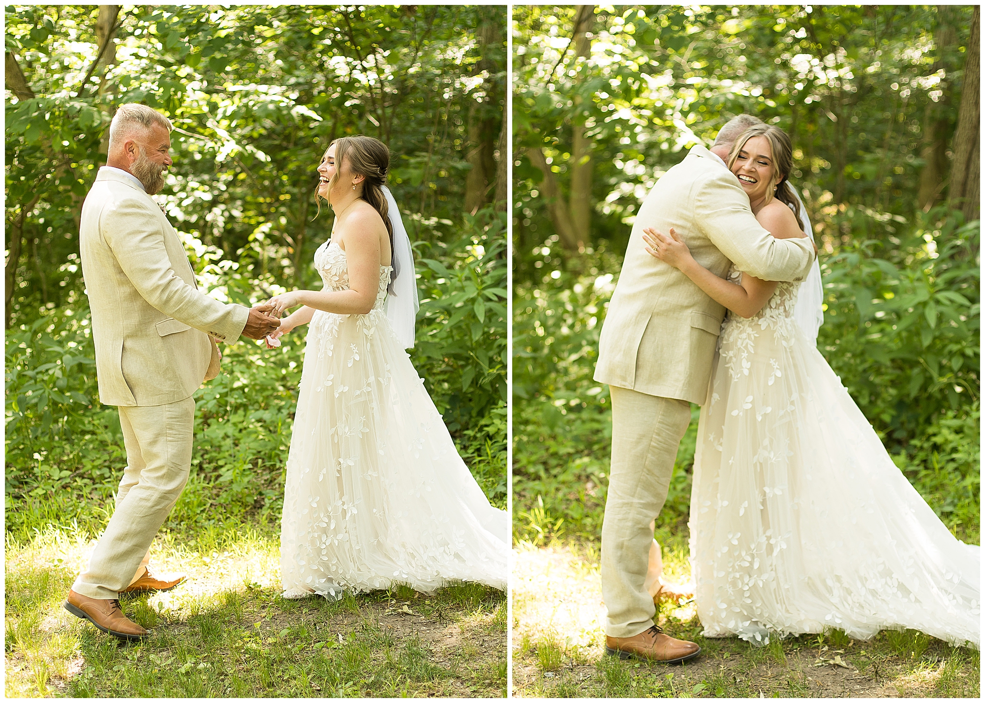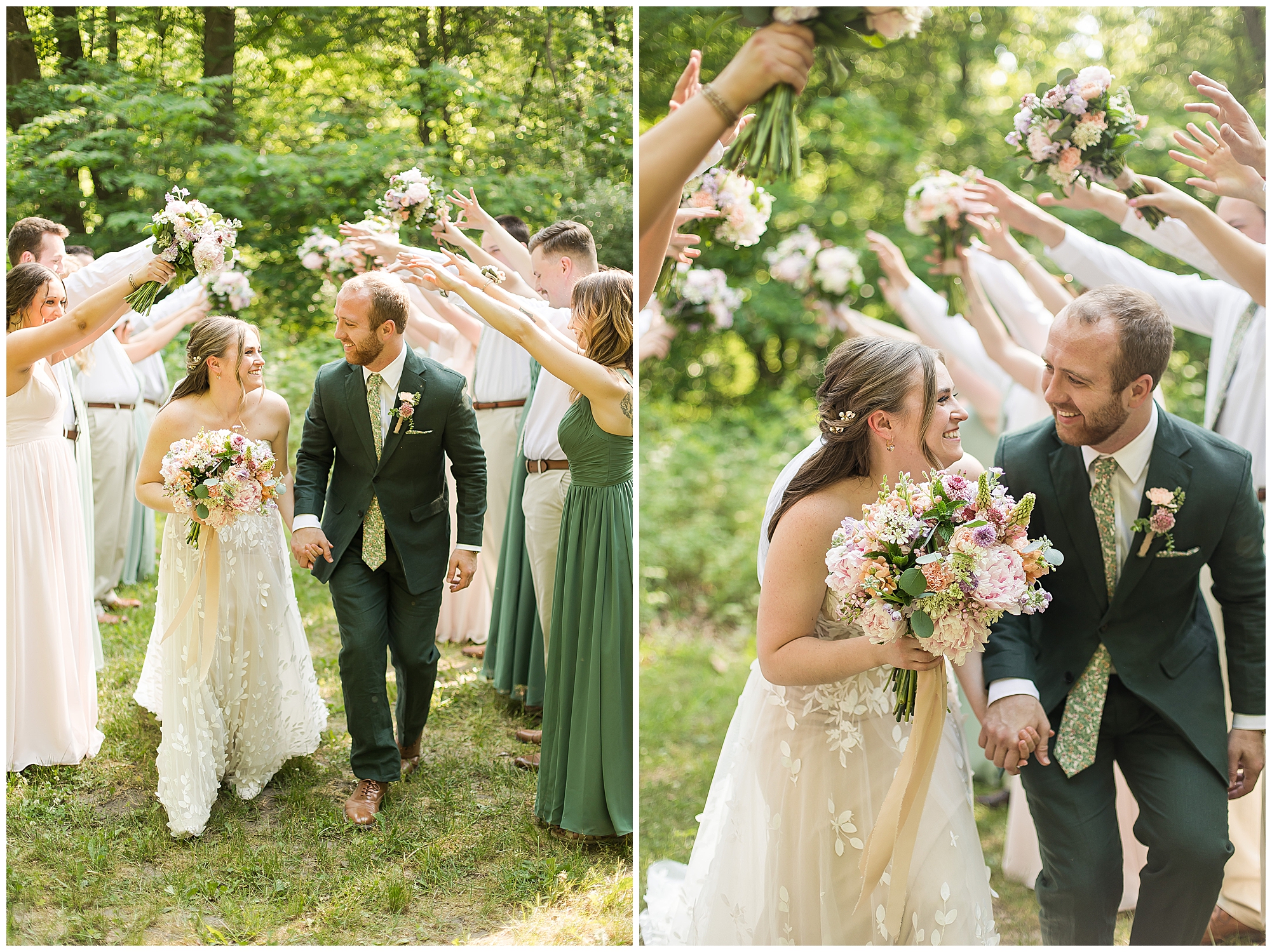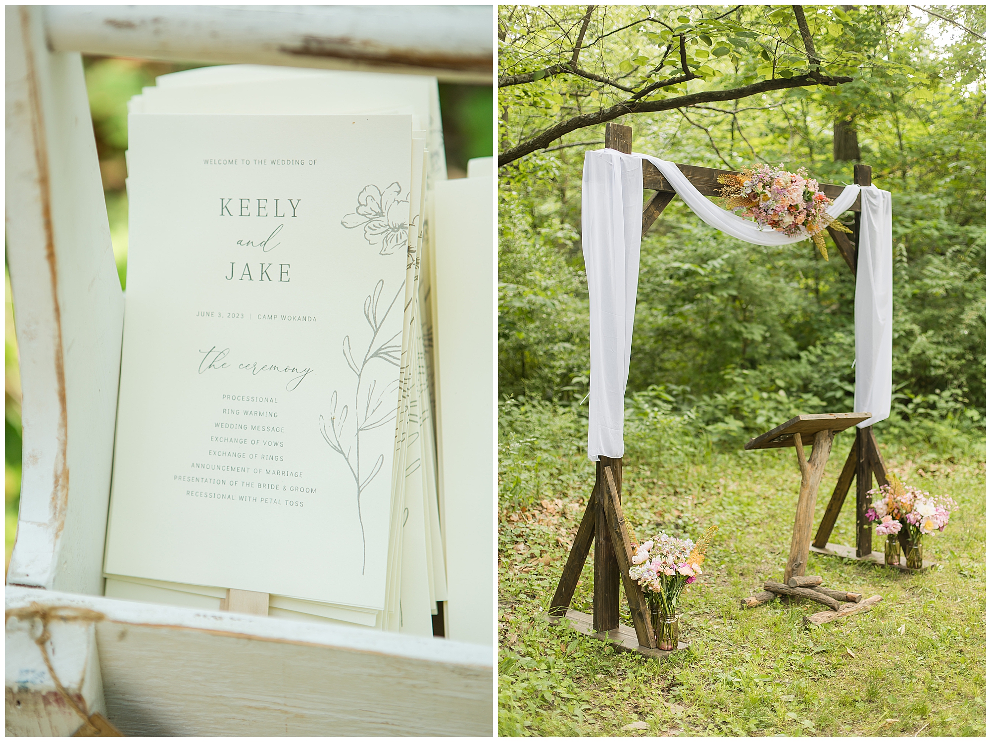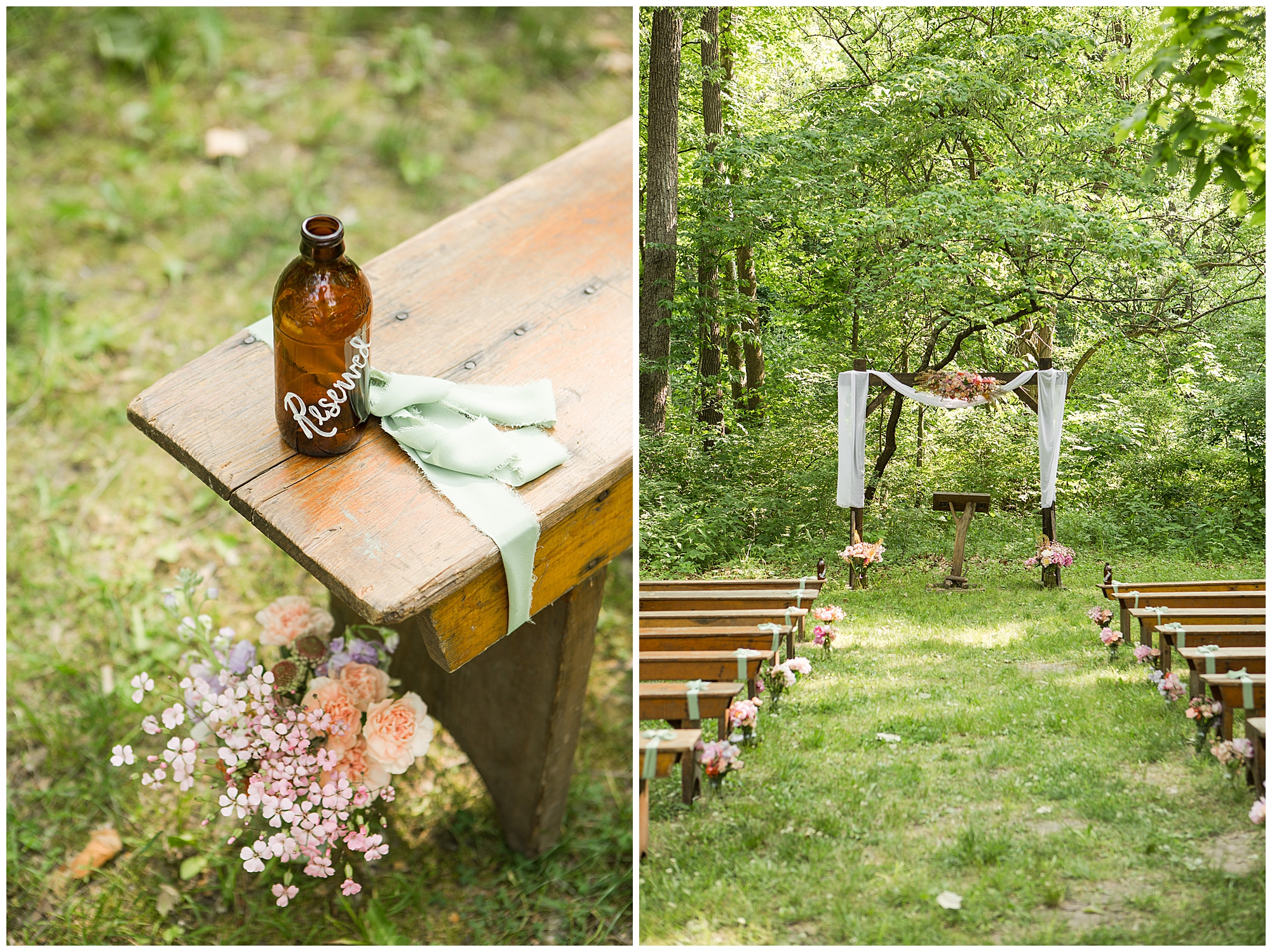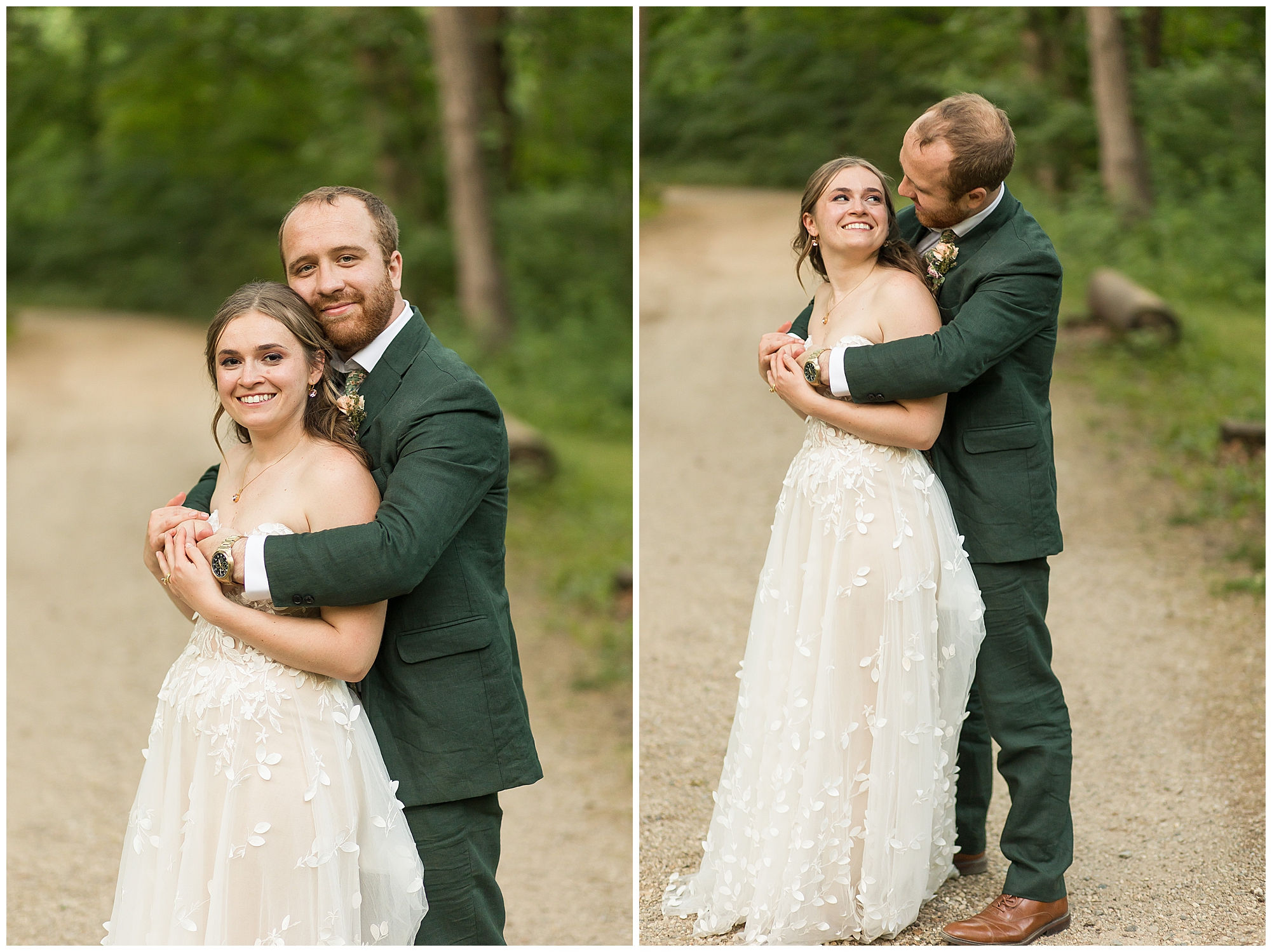 The day was finally here! It felt like such a long time since I last saw Keely and Jake at their engagement session. Now their summer wedding day in the Peoria, Illinois area was here and I couldn’t be more excited! I met up with Keely and the girls at the home she and Jake share for a morning of hair, makeup, and lots of laughter. I already saw a few friendly faces as I photographed Keely’s sister, Mackenzie’s wedding a couple of years ago as well as some other lovely bridesmaids from past weddings. It makes my heart so happy to work with families many times over. Keely’s details were absolutely gorgeous and the amazing textures and colors of her flowers were impeccable! The bridesmaids wore different shades of greens and pinks to go along with the enchanted forest theme. Before we knew it, we made our way to the beautiful Camp Wokanda venue to get Keely dressed. She was glowing as she stepped into her tulle dress with delicate leaf appliqués which flowed when she moved. Absolutely stunning! Jake brought the style as well dressed in a deep emerald linen suit and a floral green and cream tie with matching pocket square. What a statement!