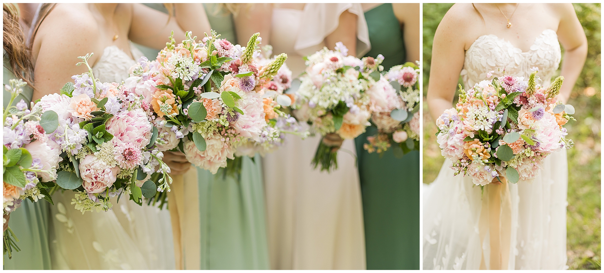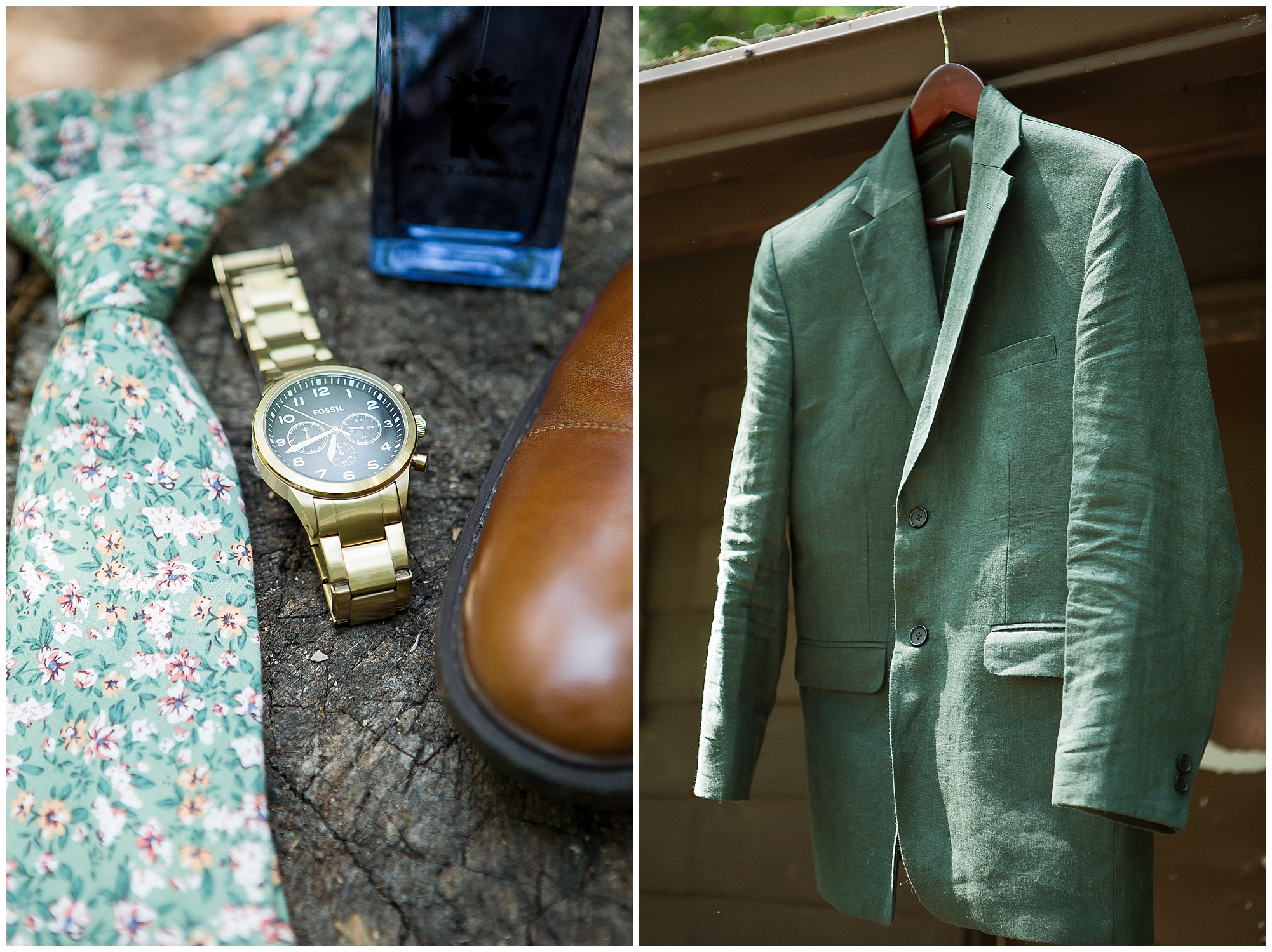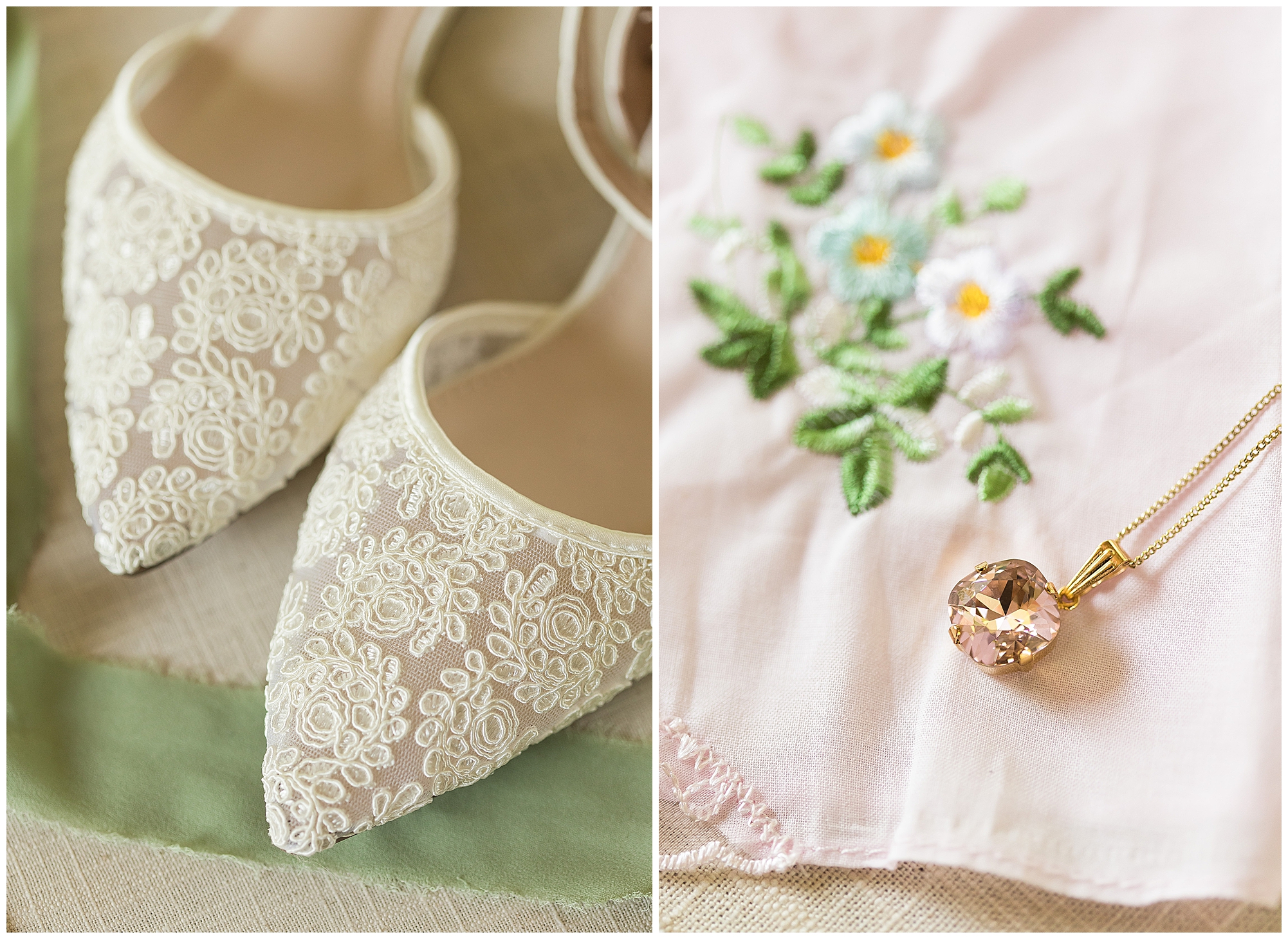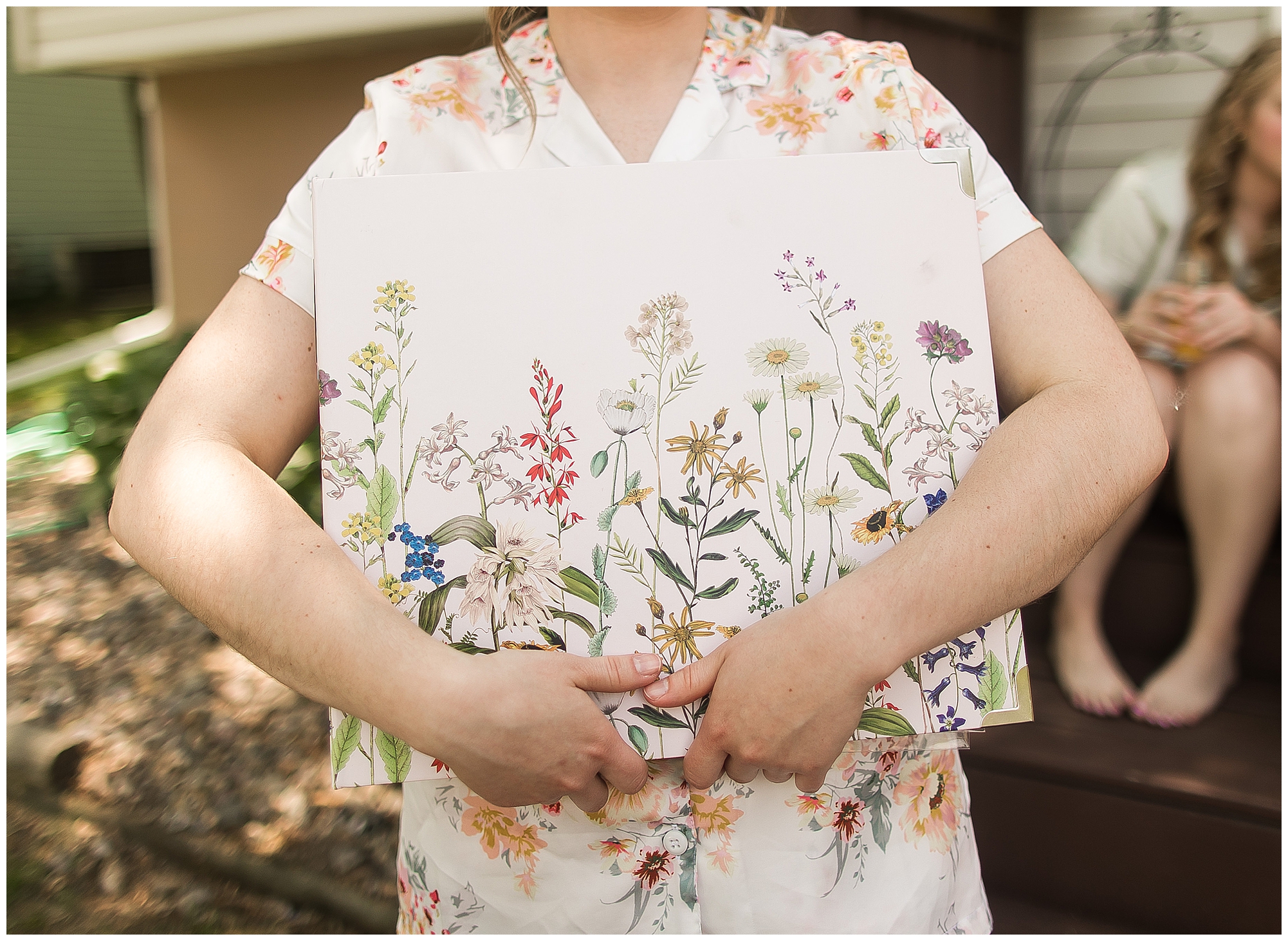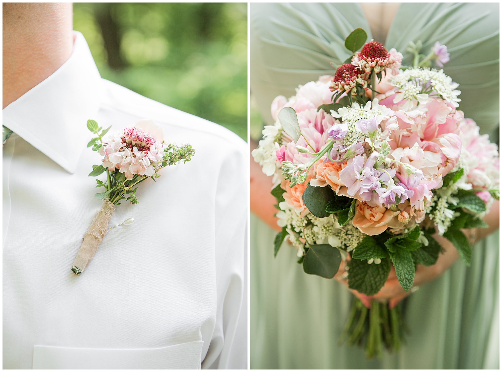 The day was finally here! It felt like such a long time since I last saw Keely and Jake at their engagement session. Now their summer wedding day in the Peoria, Illinois area was here and I couldn’t be more excited! I met up with Keely and the girls at the home she and Jake share for a morning of hair, makeup, and lots of laughter. I already saw a few friendly faces as I photographed Keely’s sister, Mackenzie’s wedding a couple of years ago as well as some other lovely bridesmaids from past weddings. It makes my heart so happy to work with families many times over. Keely’s details were absolutely gorgeous and the amazing textures and colors of her flowers were impeccable! The bridesmaids wore different shades of greens and pinks to go along with the enchanted forest theme. Before we knew it, we made our way to the beautiful Camp Wokanda venue to get Keely dressed. She was glowing as she stepped into her tulle dress with delicate leaf appliqués which flowed when she moved. Absolutely stunning! Jake brought the style as well dressed in a deep emerald linen suit and a floral green and cream tie with matching pocket square. What a statement!