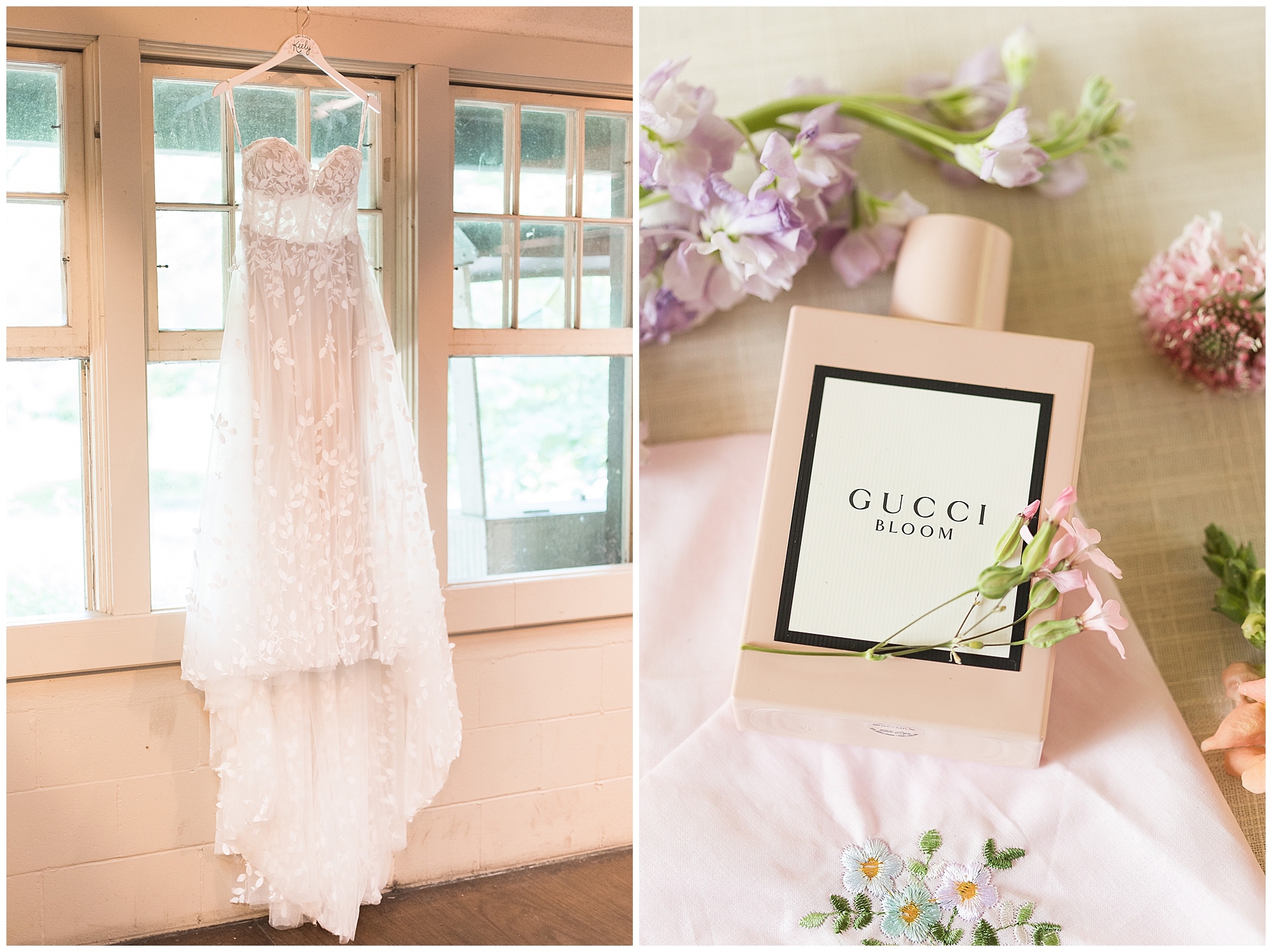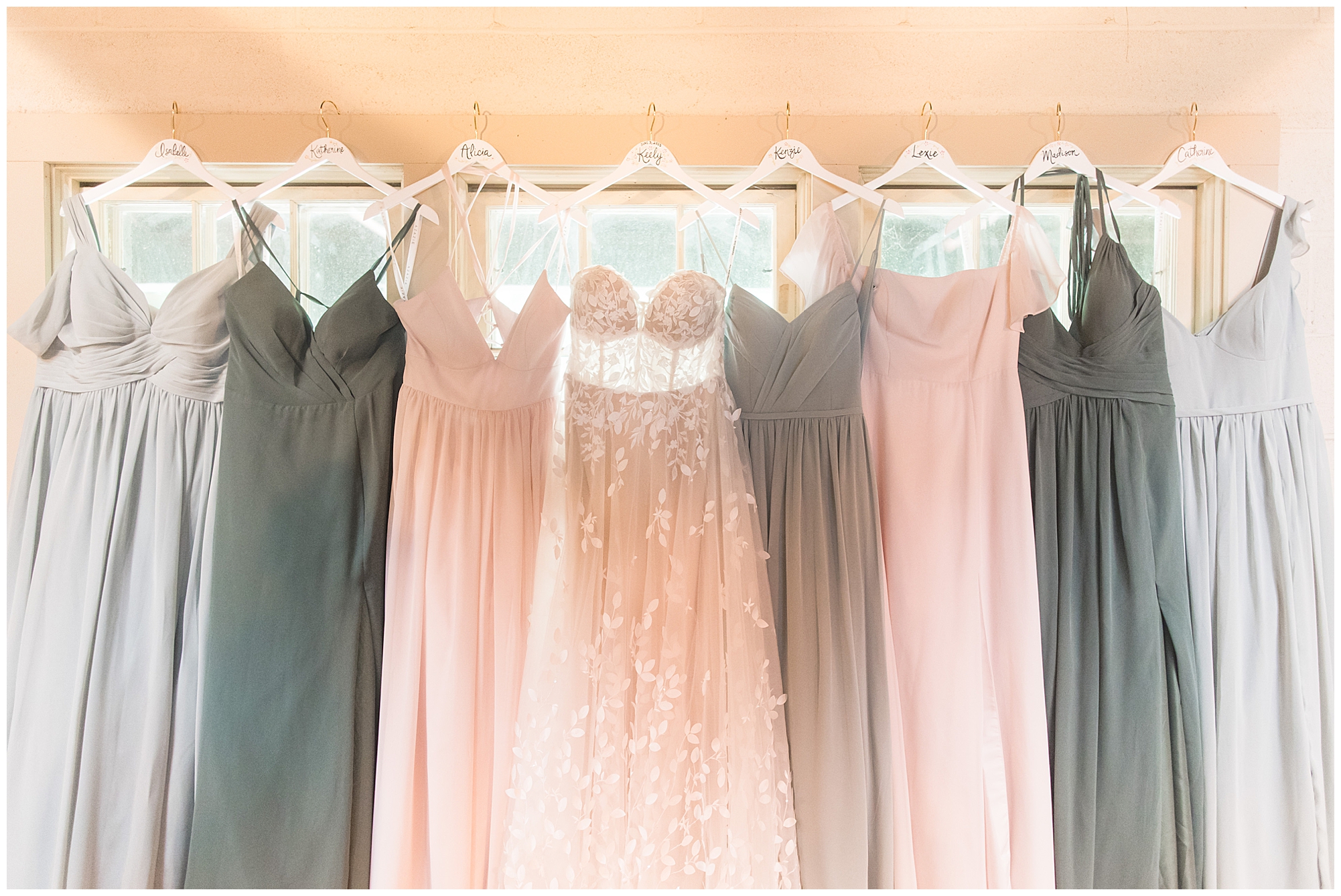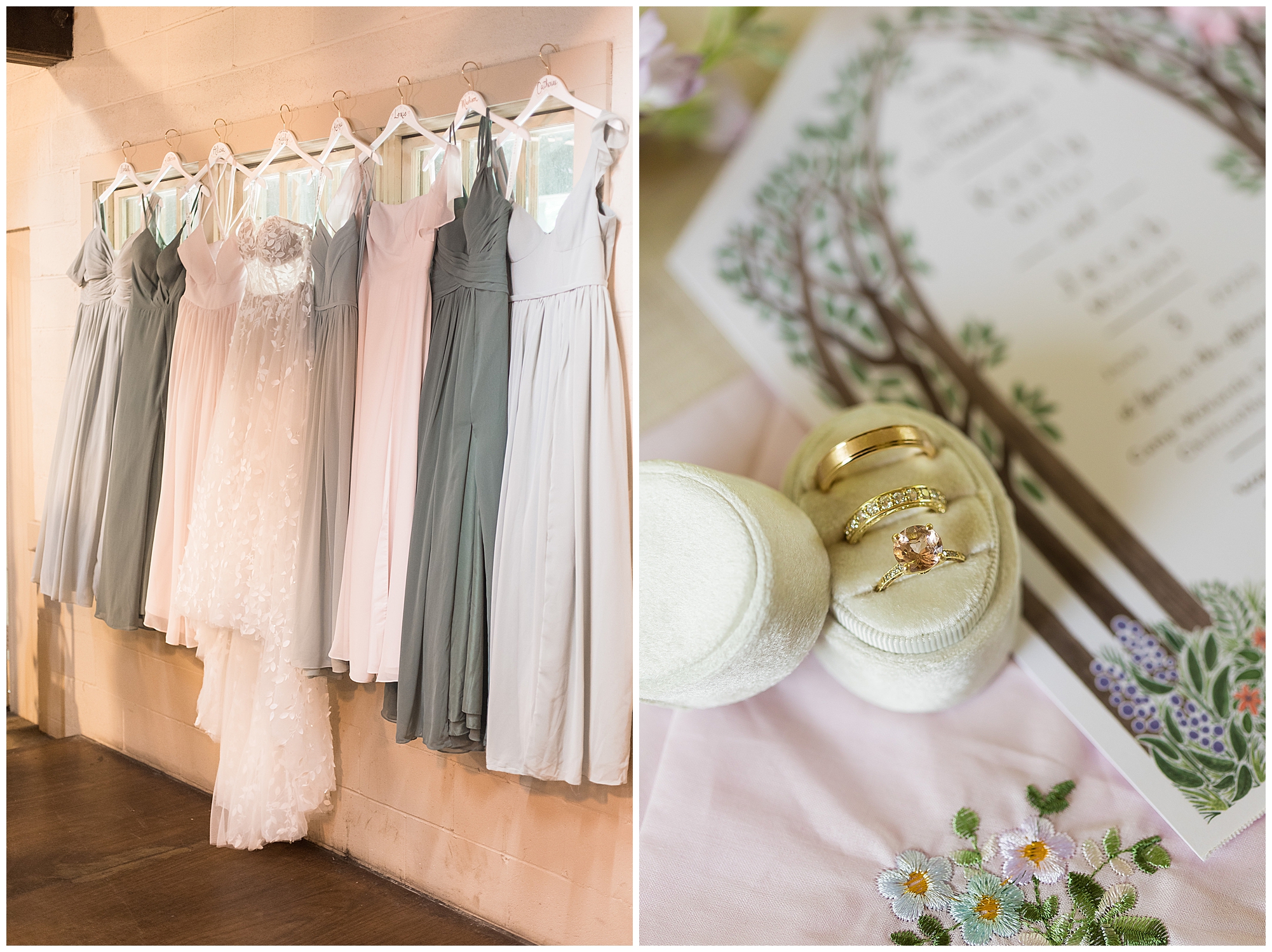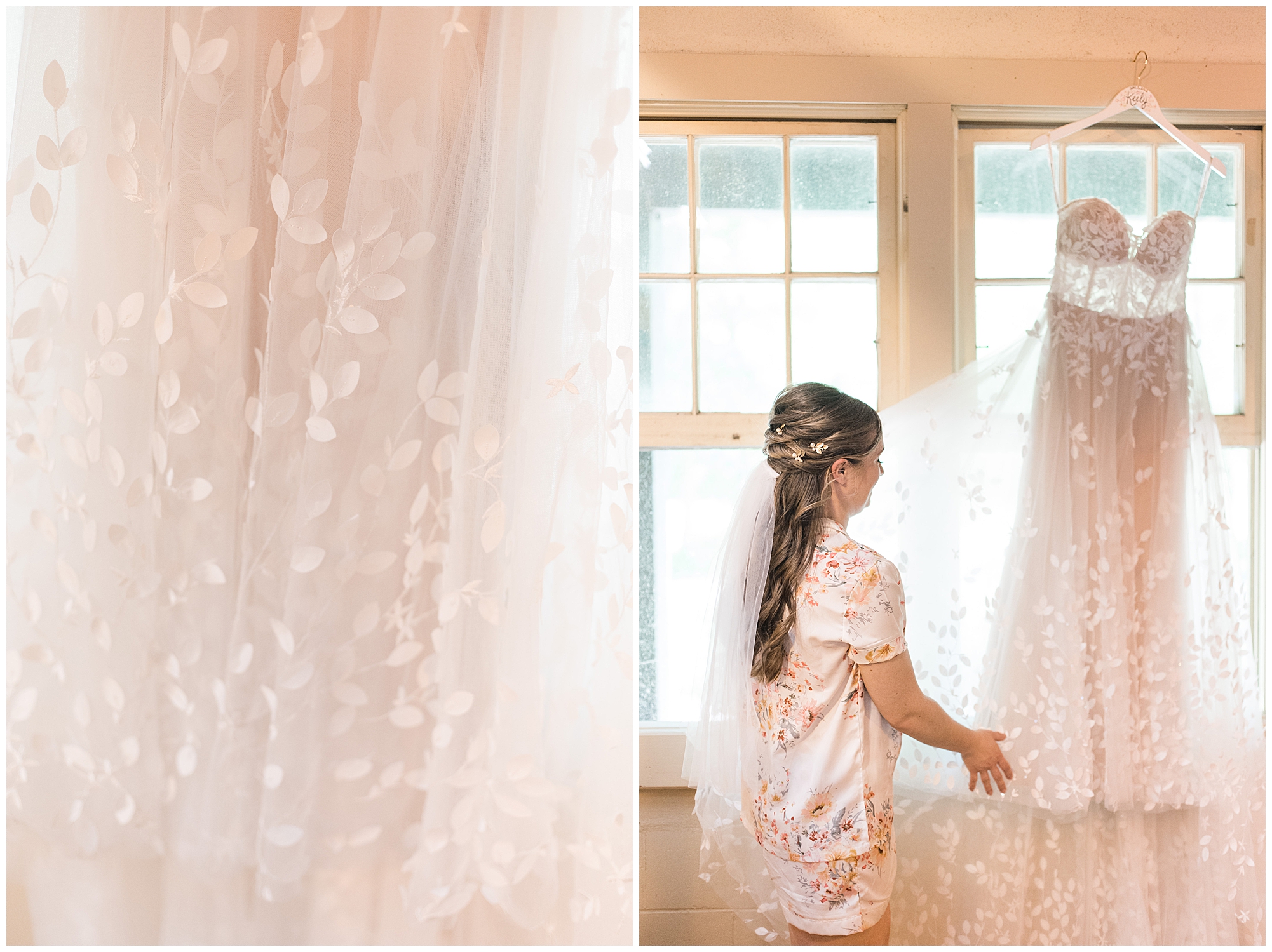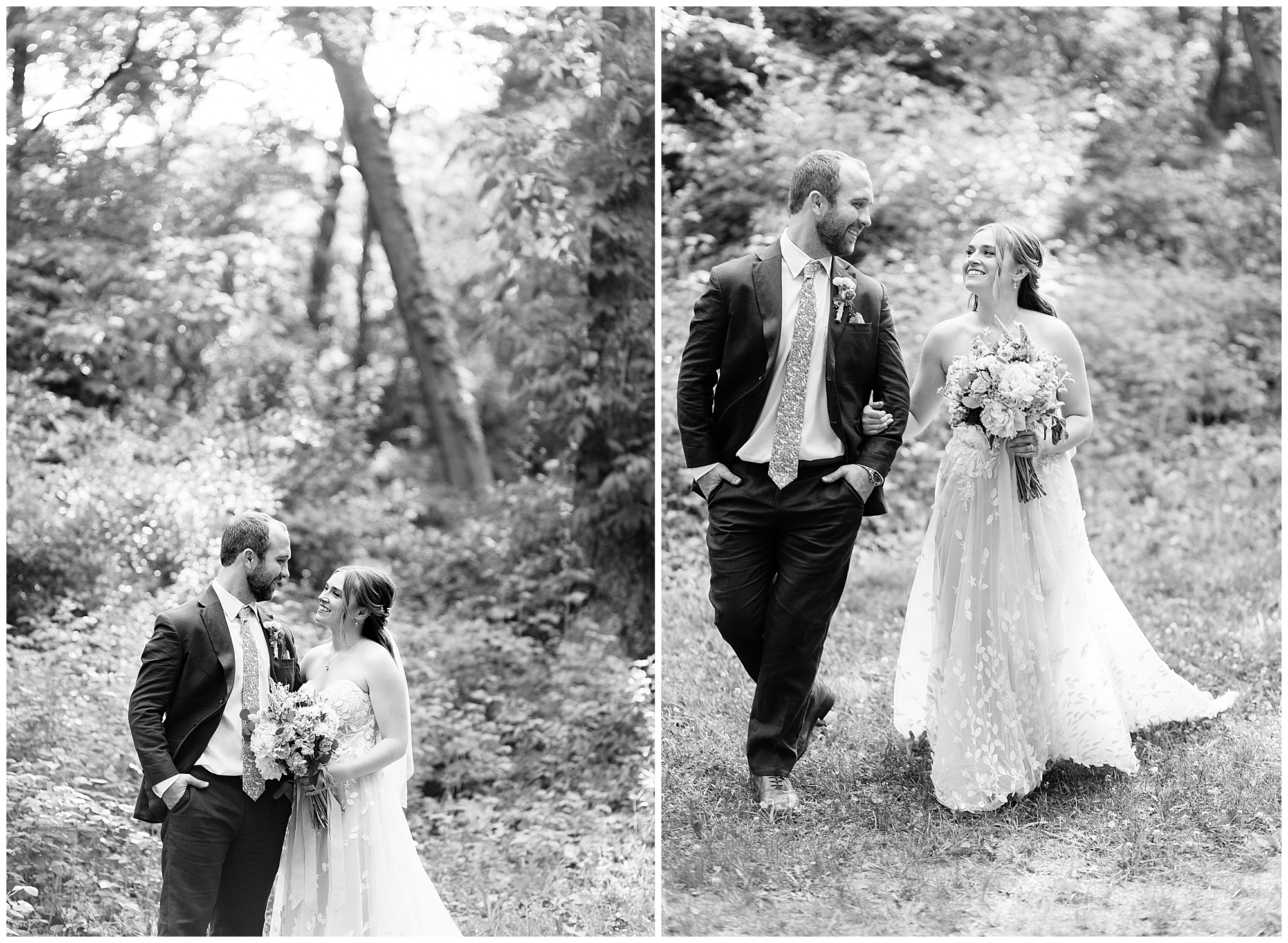 The day was finally here! It felt like such a long time since I last saw Keely and Jake at their engagement session. Now their summer wedding day in the Peoria, Illinois area was here and I couldn’t be more excited! I met up with Keely and the girls at the home she and Jake share for a morning of hair, makeup, and lots of laughter. I already saw a few friendly faces as I photographed Keely’s sister, Mackenzie’s wedding a couple of years ago as well as some other lovely bridesmaids from past weddings. It makes my heart so happy to work with families many times over. Keely’s details were absolutely gorgeous and the amazing textures and colors of her flowers were impeccable! The bridesmaids wore different shades of greens and pinks to go along with the enchanted forest theme. Before we knew it, we made our way to the beautiful Camp Wokanda venue to get Keely dressed. She was glowing as she stepped into her tulle dress with delicate leaf appliqués which flowed when she moved. Absolutely stunning! Jake brought the style as well dressed in a deep emerald linen suit and a floral green and cream tie with matching pocket square. What a statement!