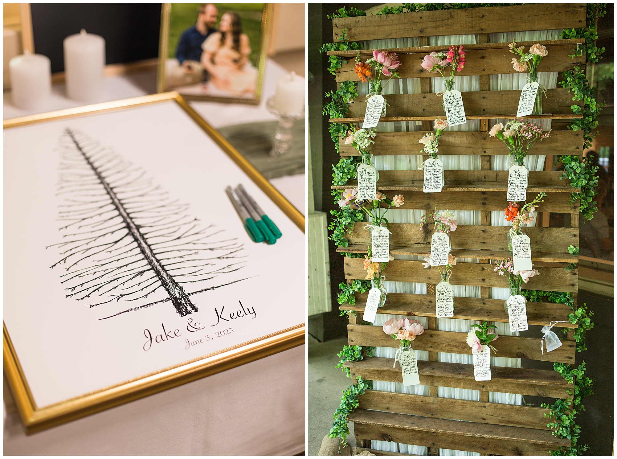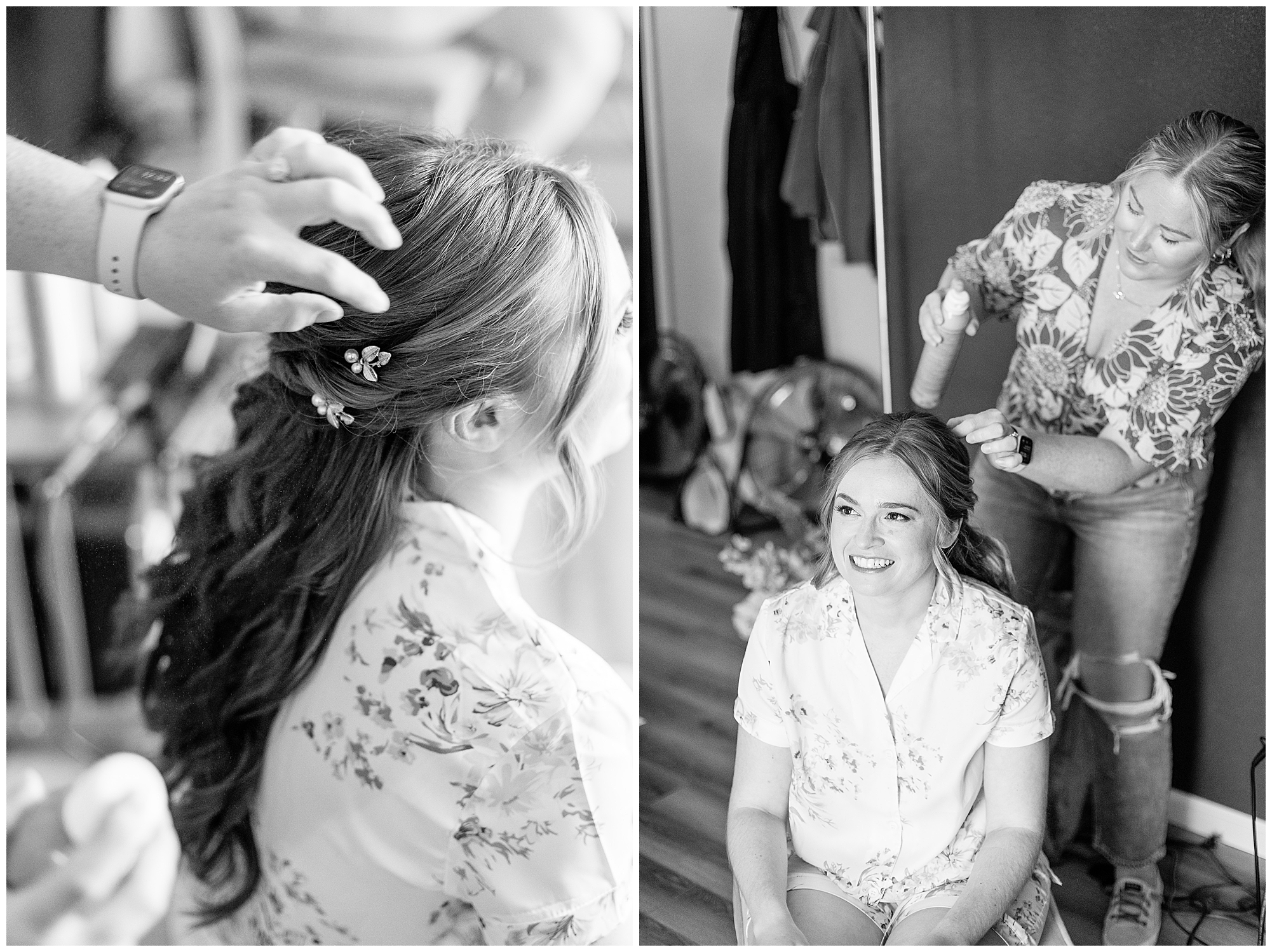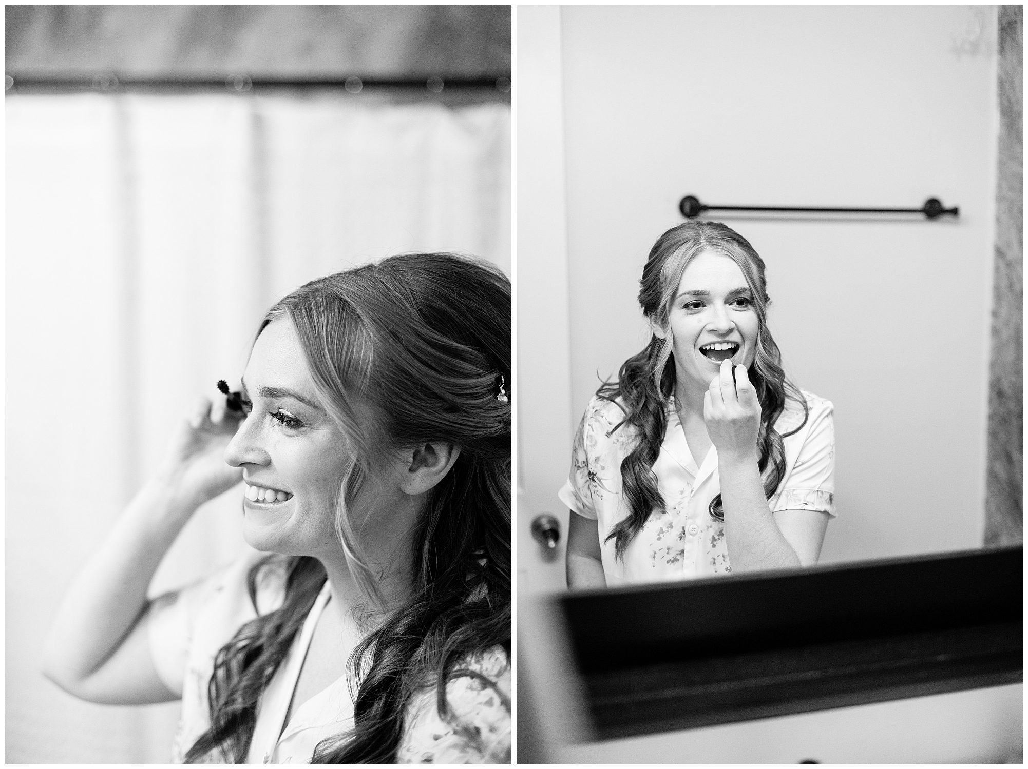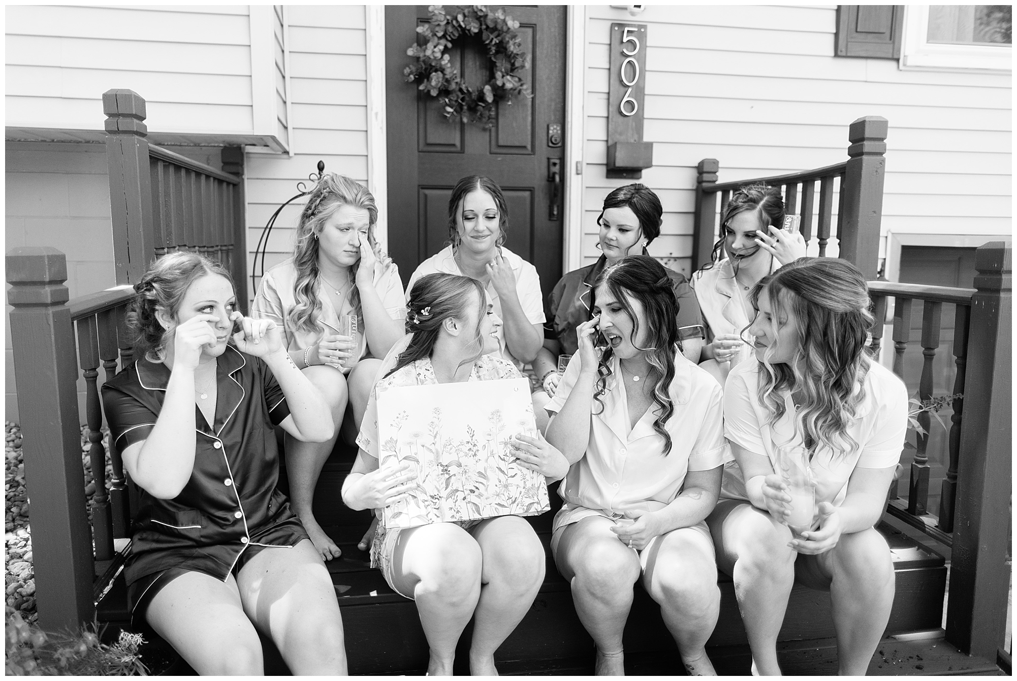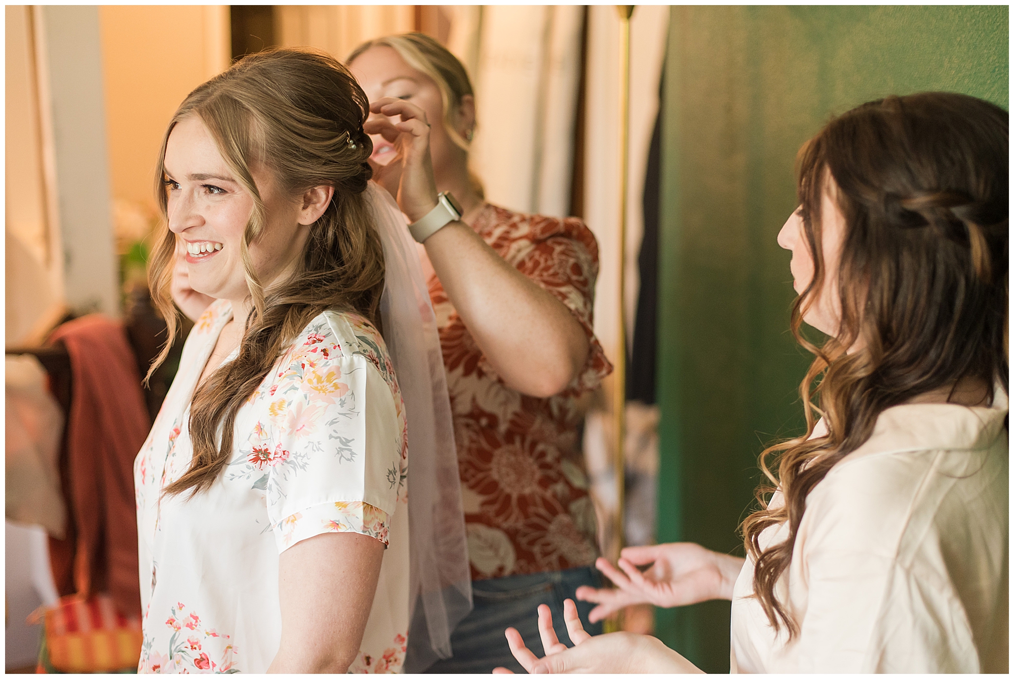 The day was finally here! It felt like such a long time since I last saw Keely and Jake at their engagement session. Now their summer wedding day in the Peoria, Illinois area was here and I couldn’t be more excited! I met up with Keely and the girls at the home she and Jake share for a morning of hair, makeup, and lots of laughter. I already saw a few friendly faces as I photographed Keely’s sister, Mackenzie’s wedding a couple of years ago as well as some other lovely bridesmaids from past weddings. It makes my heart so happy to work with families many times over. Keely’s details were absolutely gorgeous and the amazing textures and colors of her flowers were impeccable! The bridesmaids wore different shades of greens and pinks to go along with the enchanted forest theme. Before we knew it, we made our way to the beautiful Camp Wokanda venue to get Keely dressed. She was glowing as she stepped into her tulle dress with delicate leaf appliqués which flowed when she moved. Absolutely stunning! Jake brought the style as well dressed in a deep emerald linen suit and a floral green and cream tie with matching pocket square. What a statement!