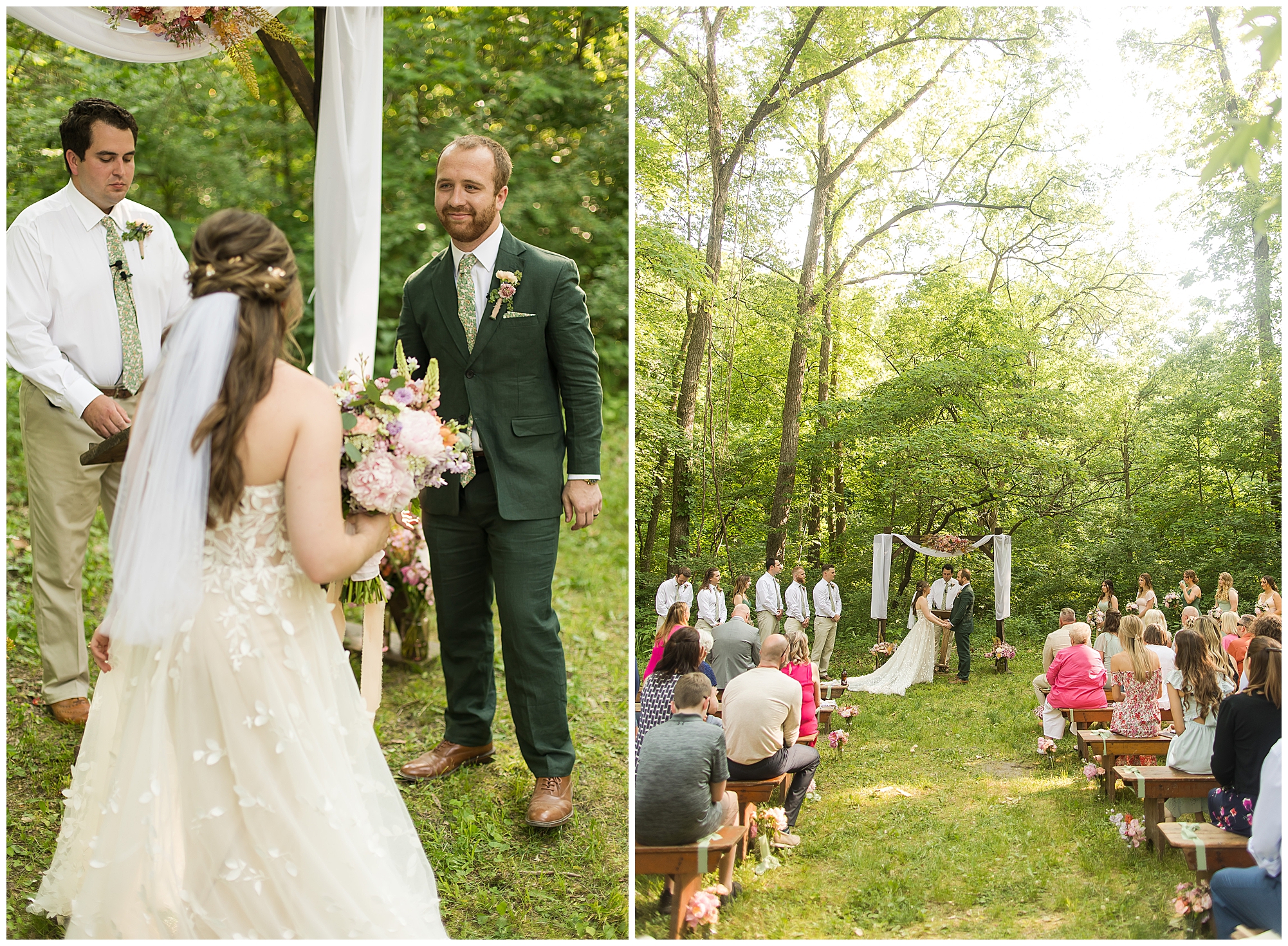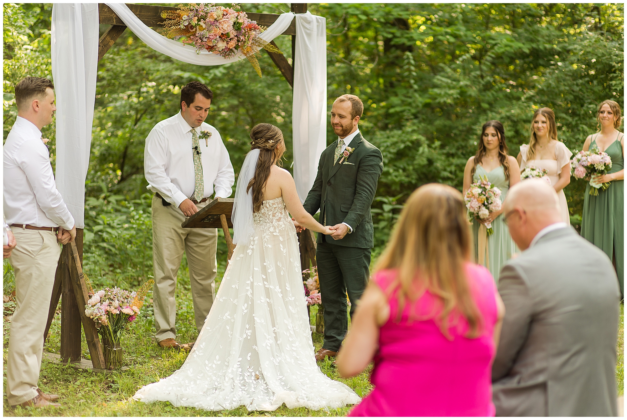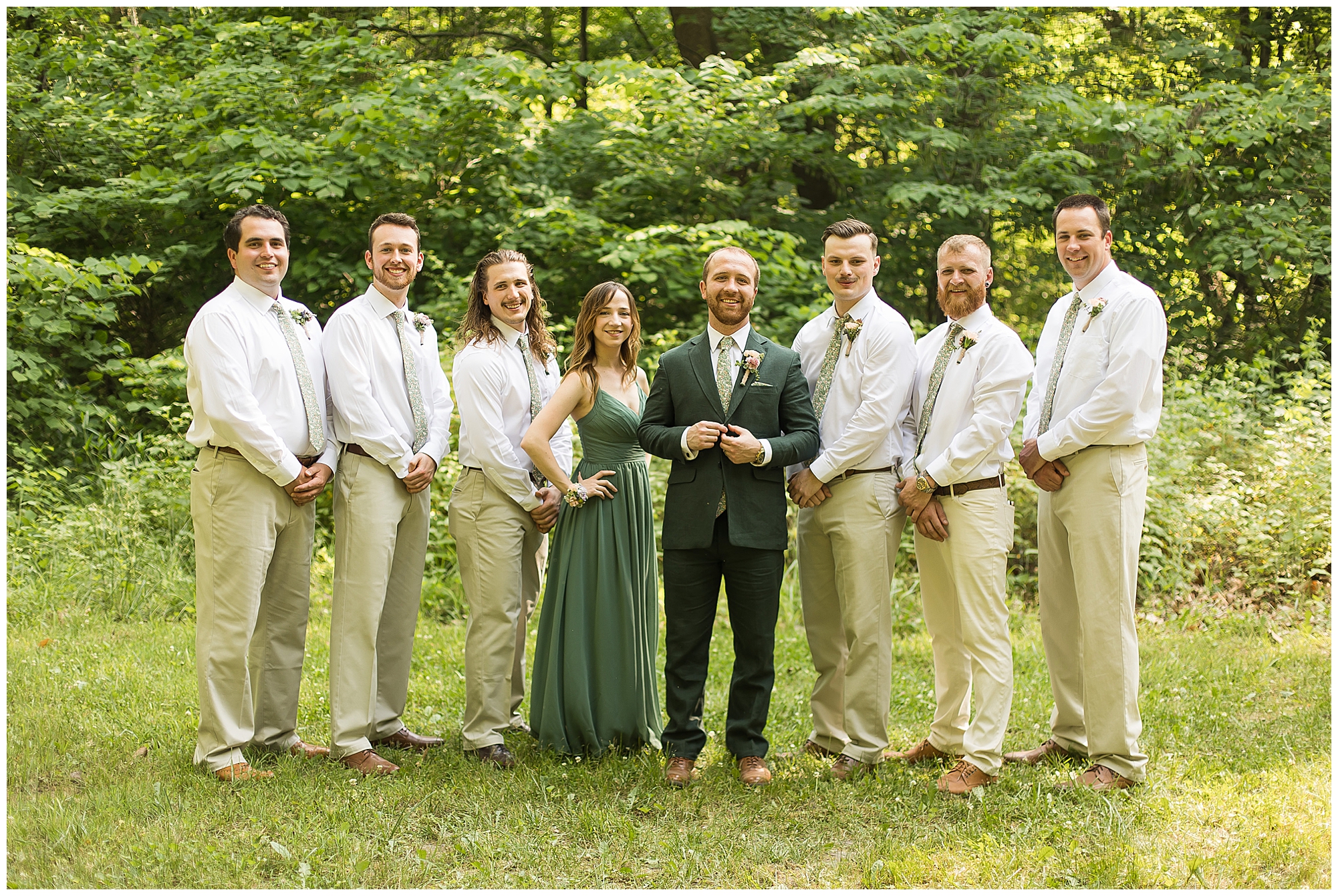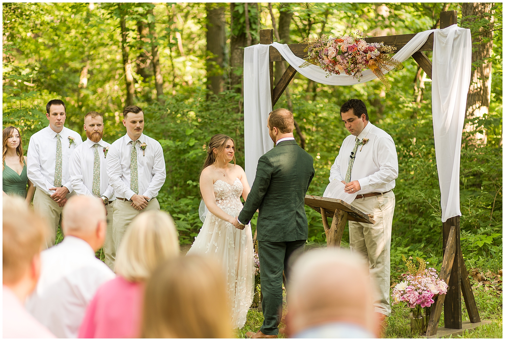 It then came time for Keely and Jake’s first look! We found a little path in the woods tucked away for these two to have a private moment. You couldn’t have wiped off the smile from Jake’s face if you tried after he saw his bride to be. They decided to read their private vows to one another and their heartfelt words were emotional, touching, with a little dash of humor. So sweet! Then it was time to get the whole bridal party together for some fun. This crew was a blast to work with and were so helpful throughout the day. Jake’s crew wore timeless button-down white shirts and the same floral green and cream ties with khakis. And his groomswoman looked awesome and wore a lovely green dress similar to the bridesmaids. Once the enjoyment was done with the bridal party, it was time for these two to say, “I Do”!
