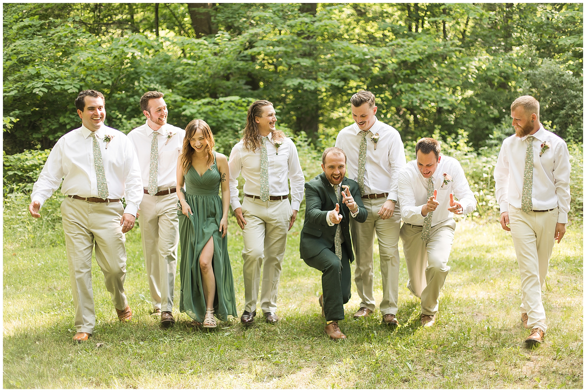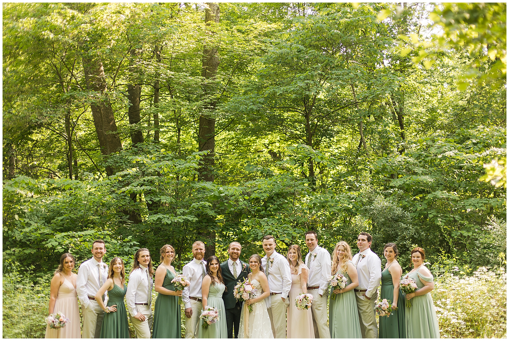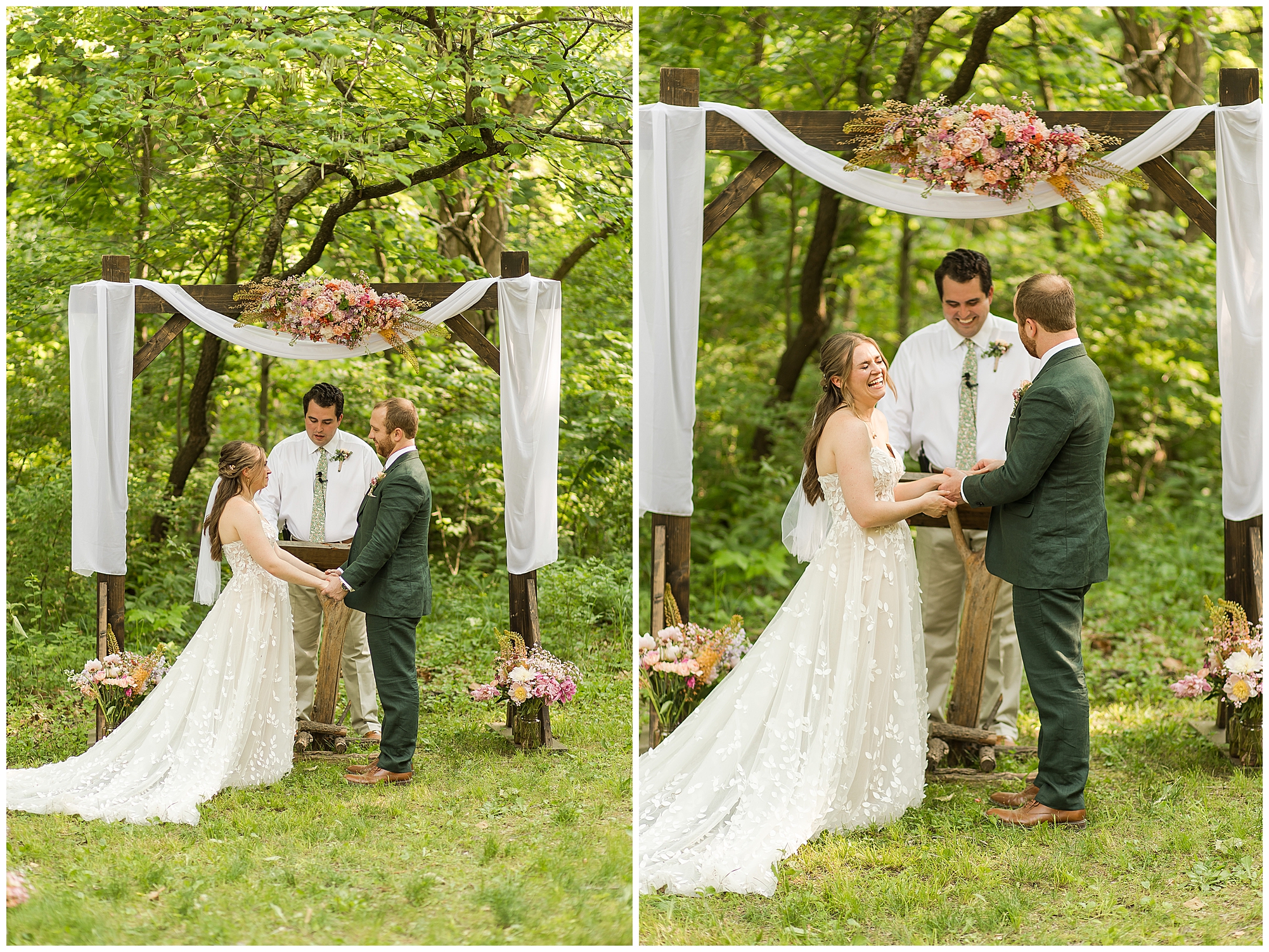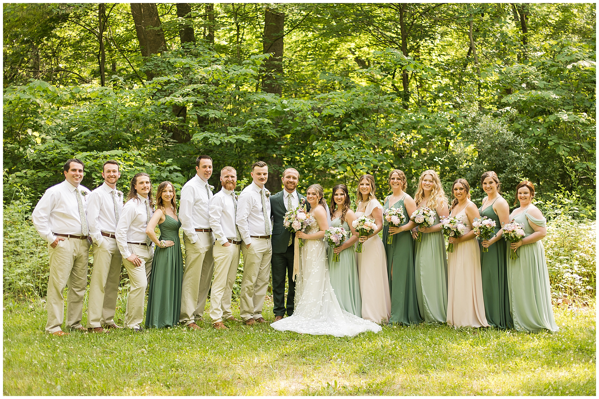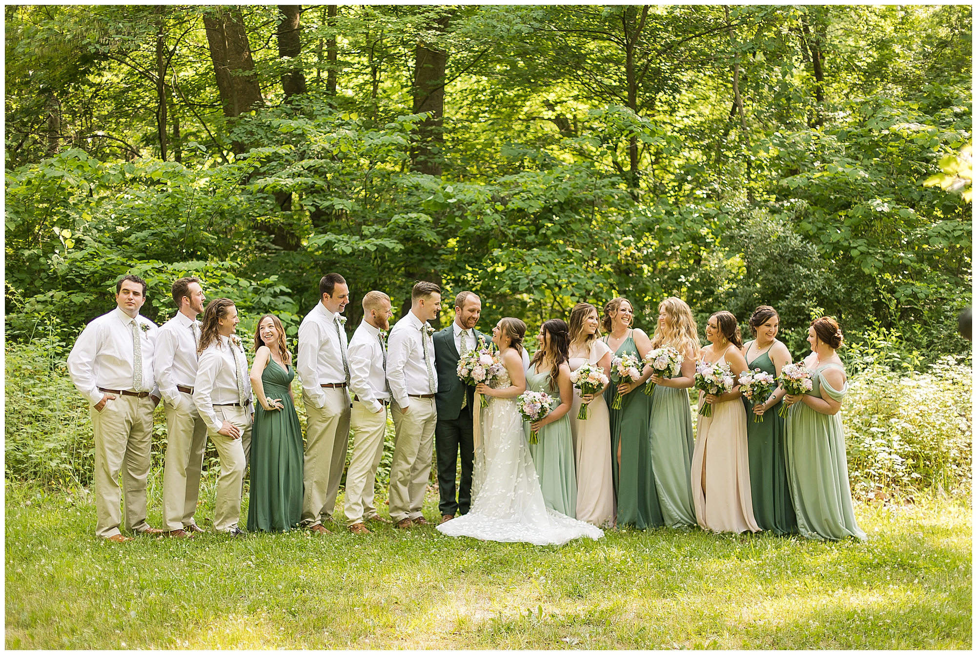 It then came time for Keely and Jake’s first look! We found a little path in the woods tucked away for these two to have a private moment. You couldn’t have wiped off the smile from Jake’s face if you tried after he saw his bride to be. They decided to read their private vows to one another and their heartfelt words were emotional, touching, with a little dash of humor. So sweet! Then it was time to get the whole bridal party together for some fun. This crew was a blast to work with and were so helpful throughout the day. Jake’s crew wore timeless button-down white shirts and the same floral green and cream ties with khakis. And his groomswoman looked awesome and wore a lovely green dress similar to the bridesmaids. Once the enjoyment was done with the bridal party, it was time for these two to say, “I Do”!