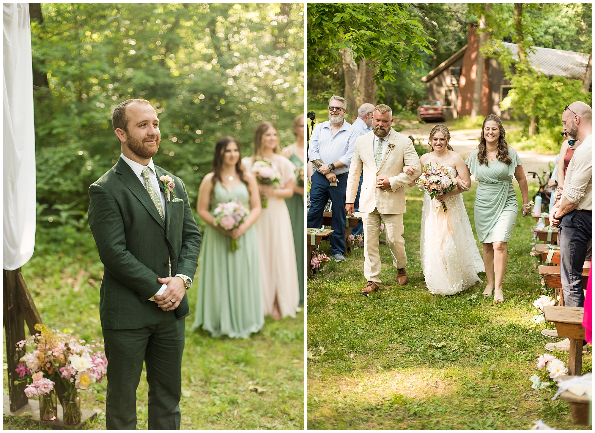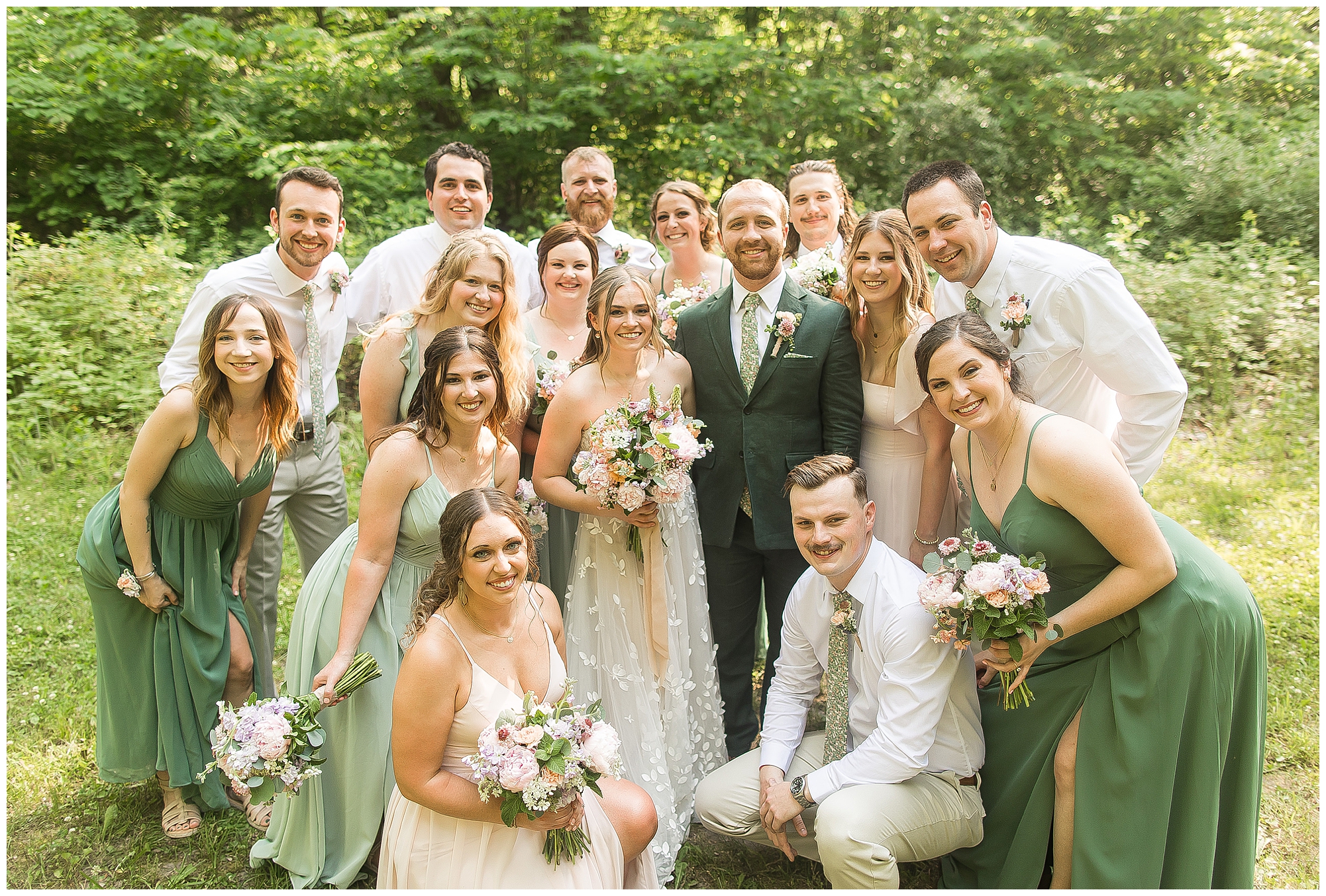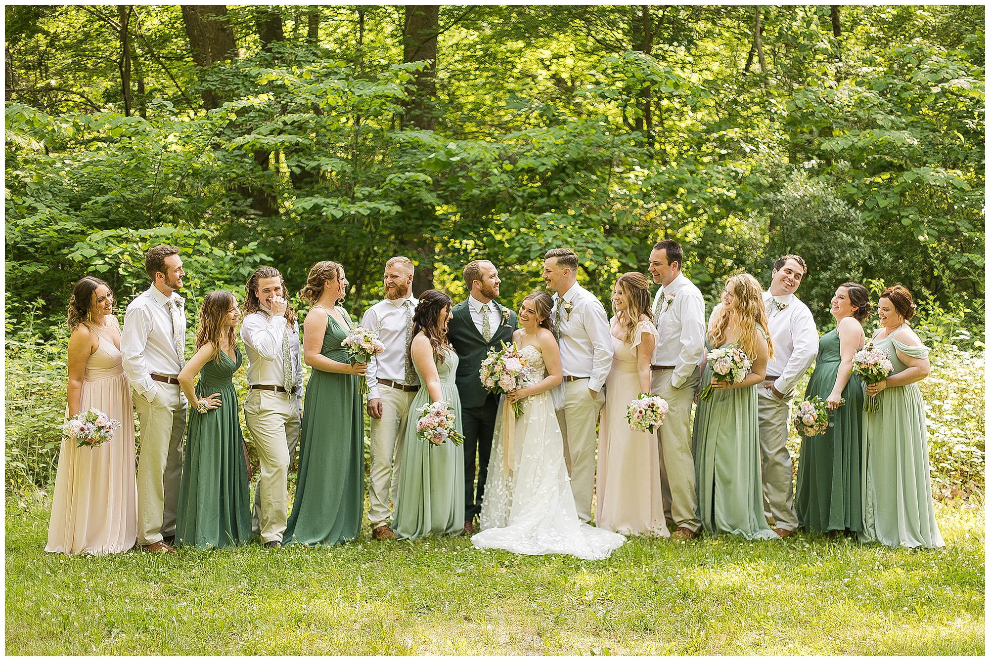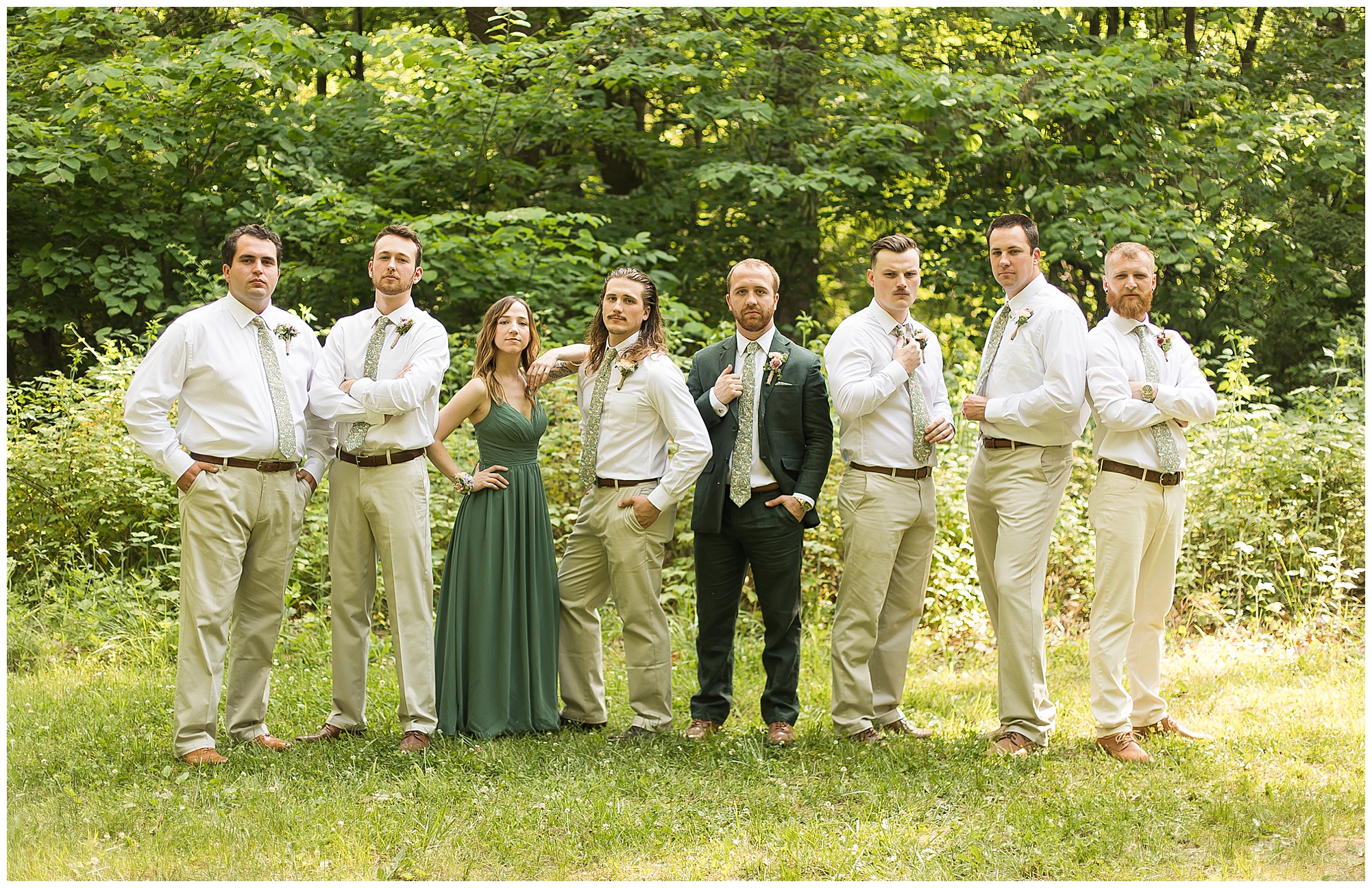 It then came time for Keely and Jake’s first look! We found a little path in the woods tucked away for these two to have a private moment. You couldn’t have wiped off the smile from Jake’s face if you tried after he saw his bride to be. They decided to read their private vows to one another and their heartfelt words were emotional, touching, with a little dash of humor. So sweet! Then it was time to get the whole bridal party together for some fun. This crew was a blast to work with and were so helpful throughout the day. Jake’s crew wore timeless button-down white shirts and the same floral green and cream ties with khakis. And his groomswoman looked awesome and wore a lovely green dress similar to the bridesmaids. Once the enjoyment was done with the bridal party, it was time for these two to say, “I Do”!