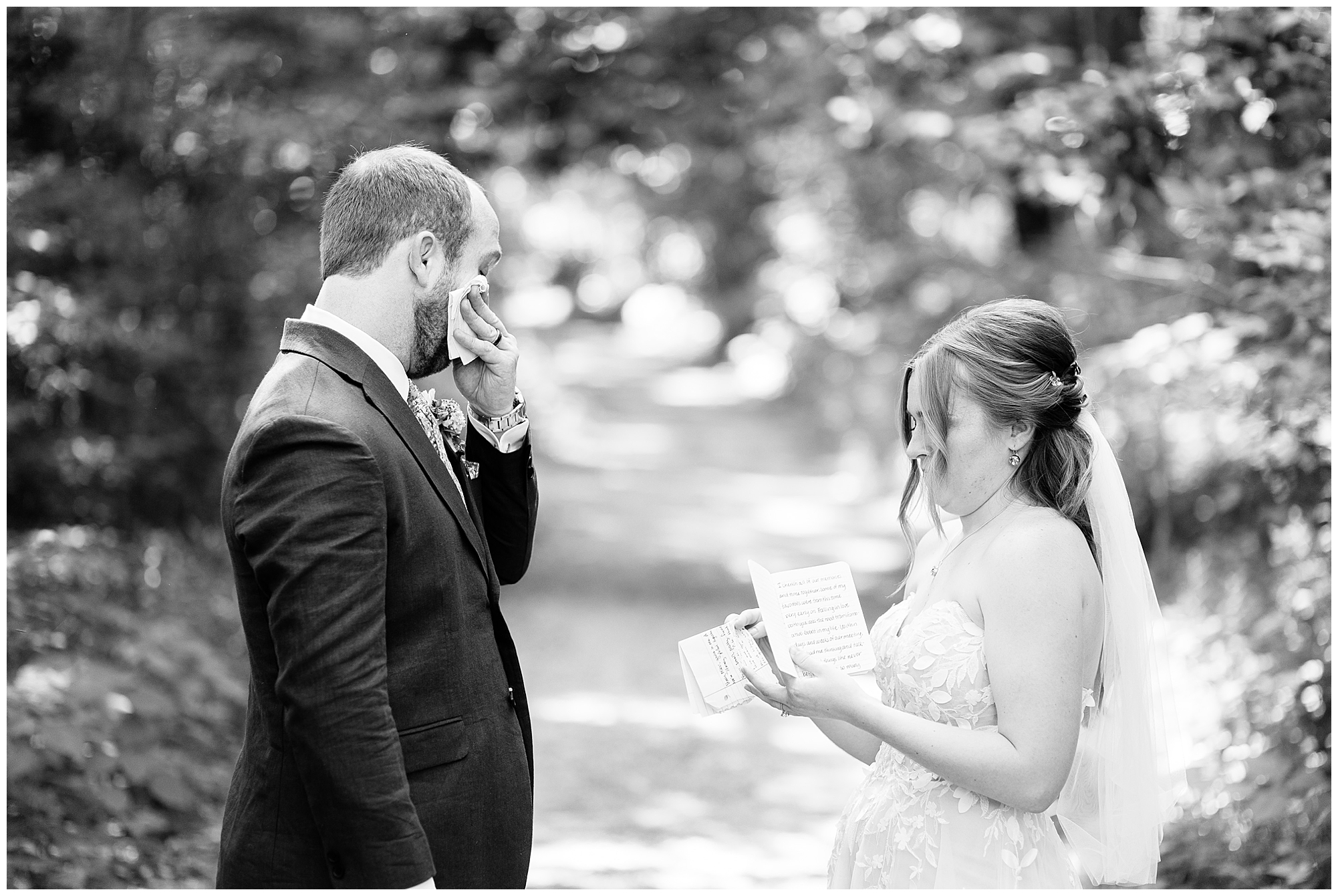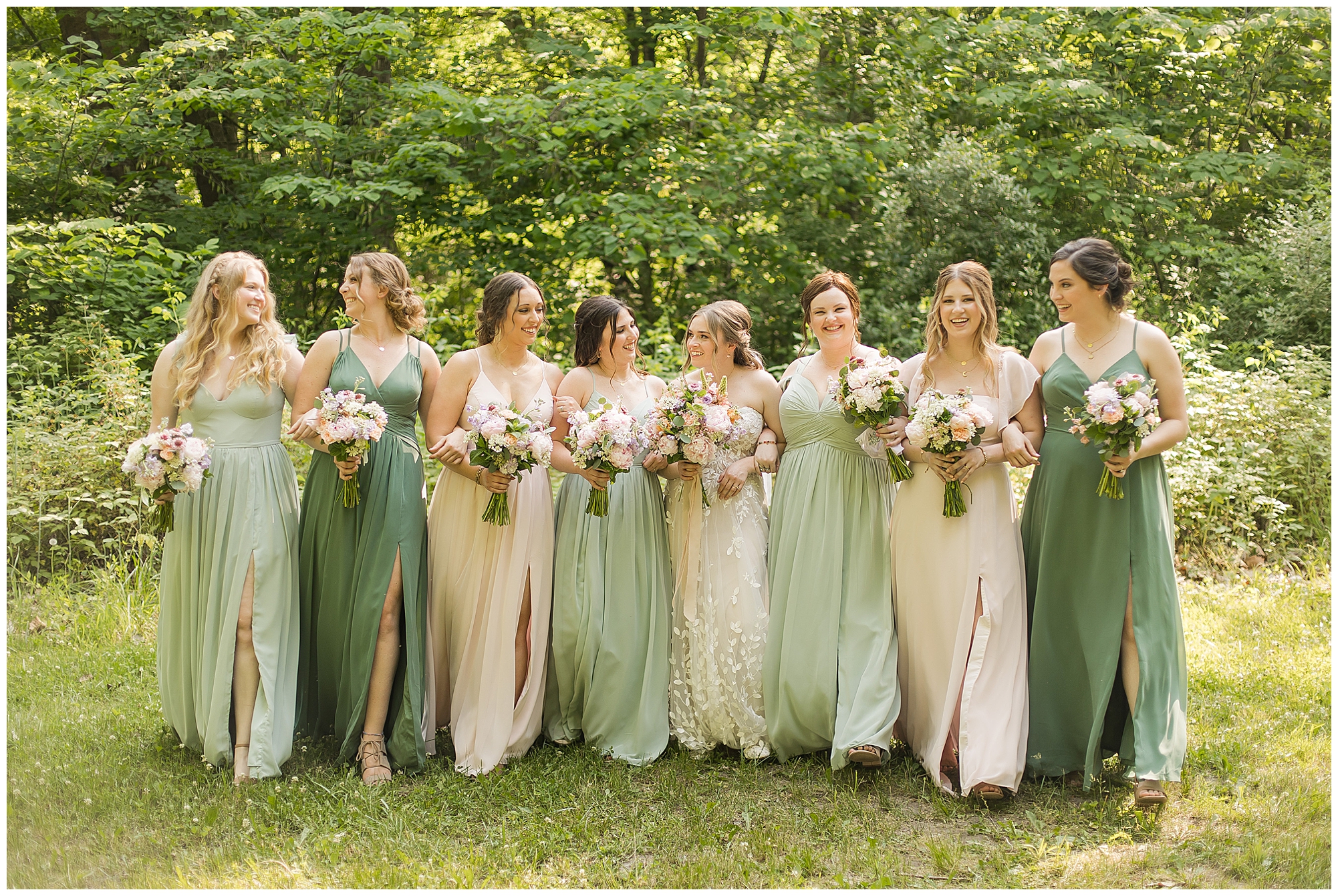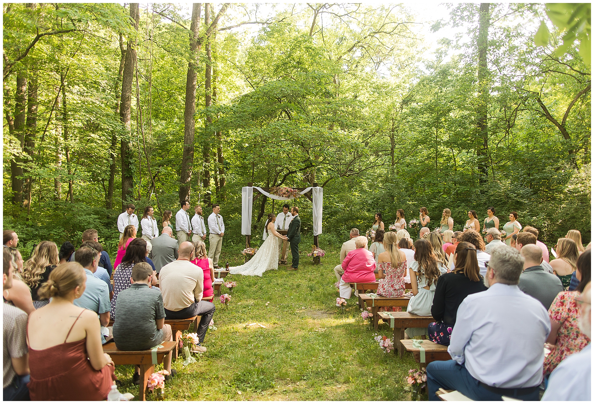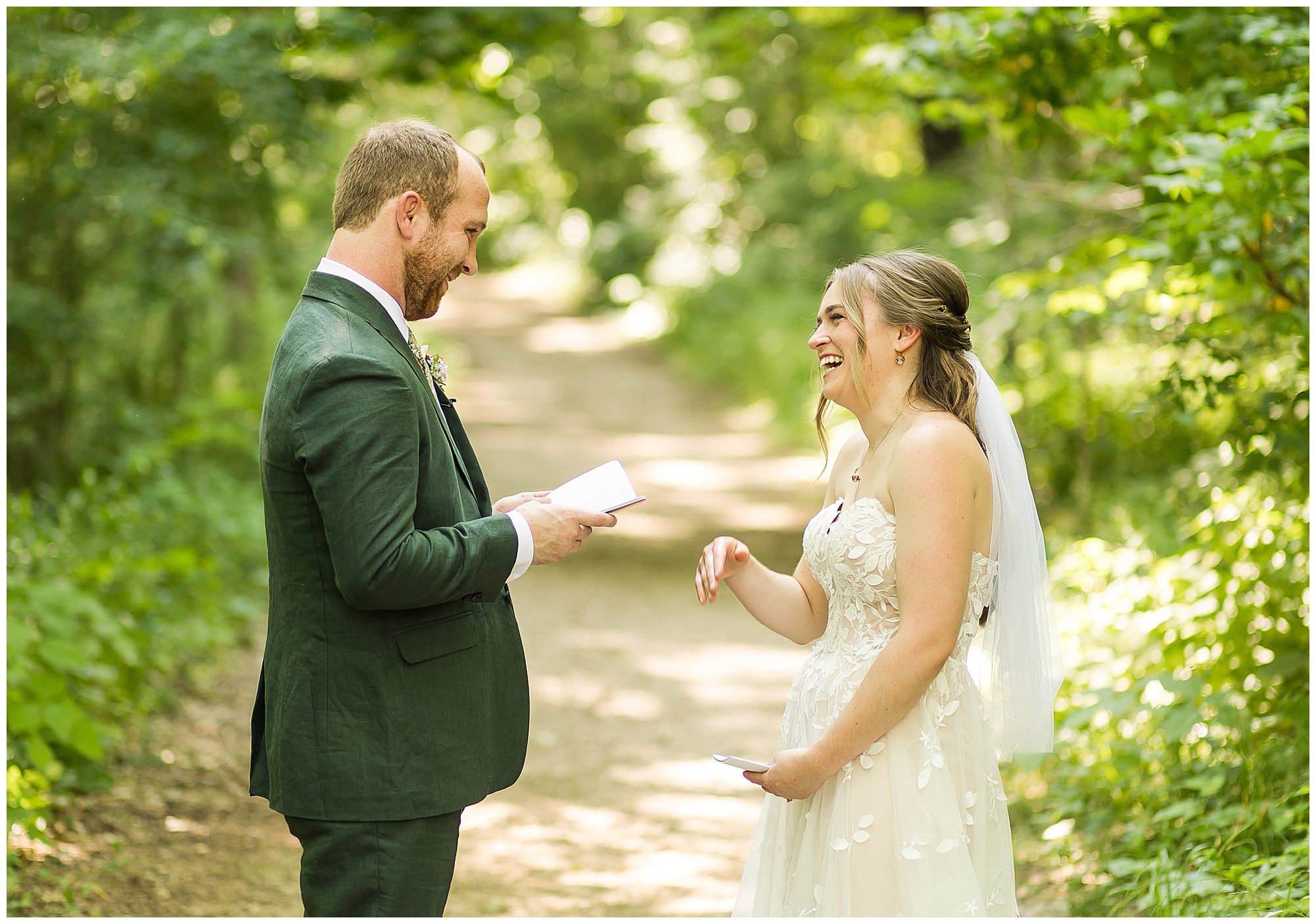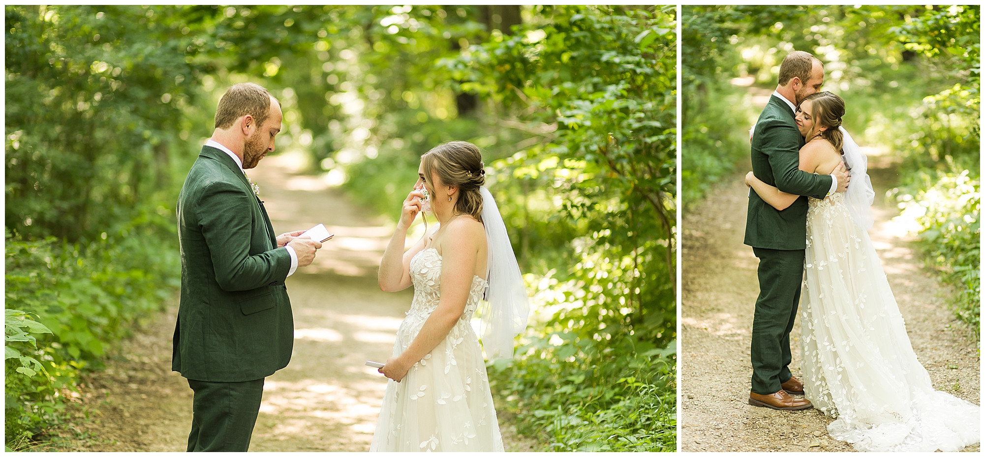 It then came time for Keely and Jake’s first look! We found a little path in the woods tucked away for these two to have a private moment. You couldn’t have wiped off the smile from Jake’s face if you tried after he saw his bride to be. They decided to read their private vows to one another and their heartfelt words were emotional, touching, with a little dash of humor. So sweet! Then it was time to get the whole bridal party together for some fun. This crew was a blast to work with and were so helpful throughout the day. Jake’s crew wore timeless button-down white shirts and the same floral green and cream ties with khakis. And his groomswoman looked awesome and wore a lovely green dress similar to the bridesmaids. Once the enjoyment was done with the bridal party, it was time for these two to say, “I Do”!